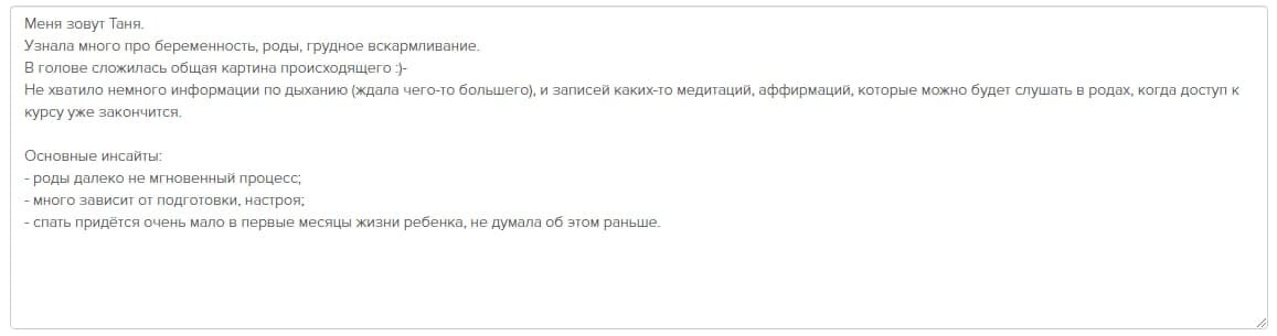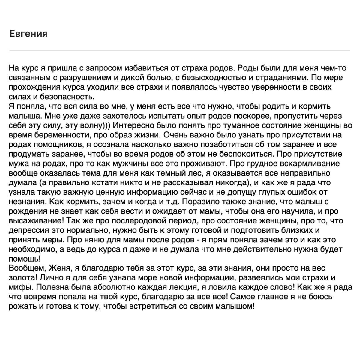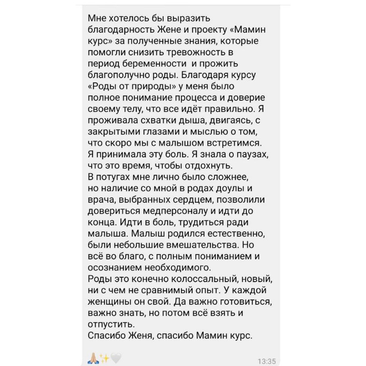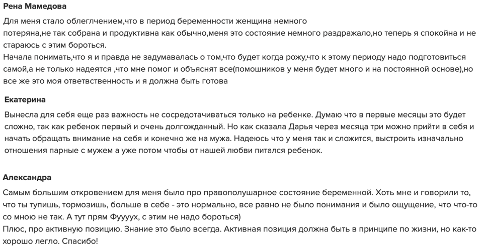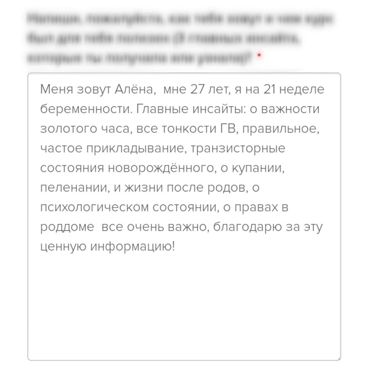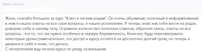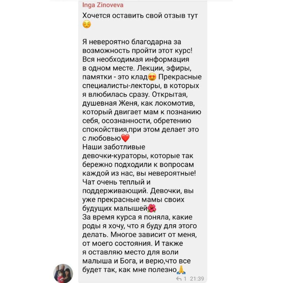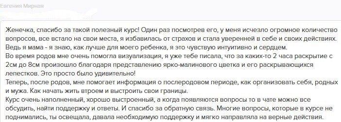 Самый главный итог курса — превращение из беспокойной мамы в маму осознанную. Я научилась слушать себя, своё тело, доверять ему, доверять своему малышу. Этот навык подарил мне небывалое спокойствие и сменил тревогу на радость в ожидании встречи с малышом. Также важно понимание, что роды — это не зловещее медицинское окружение, это только о нас с малышом. Этот процесс полностью зависит от меня, моего подхода и поведения, я могу сама влиять на ситуацию и поворачивать ее в благоприятное русло. Кроме того, особенность курса в ненавязывании. Участникам предлагается огромный объём информации, но ни одной инструкции к действию, никакого давления. Чтобы принять решение, необходимо пропустить полученную информацию через призму собственных установок, мировоззрения и убеждений. Это о критическом мышлении, которое важно в любых аспектах жизни. И последнее, самое уютное и тёплое, — окружение, которое приобретаешь после курса. Это и поддержка Жени, других участниц, и огромное сообщество мамочек-выпускниц, которые с радостью поделятся опытом и окажут поддержку. Думаю, не каждой удавалось найти такую масштабную поддержку на протяжении всей жизни.