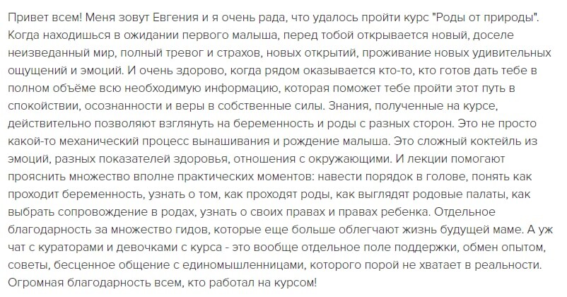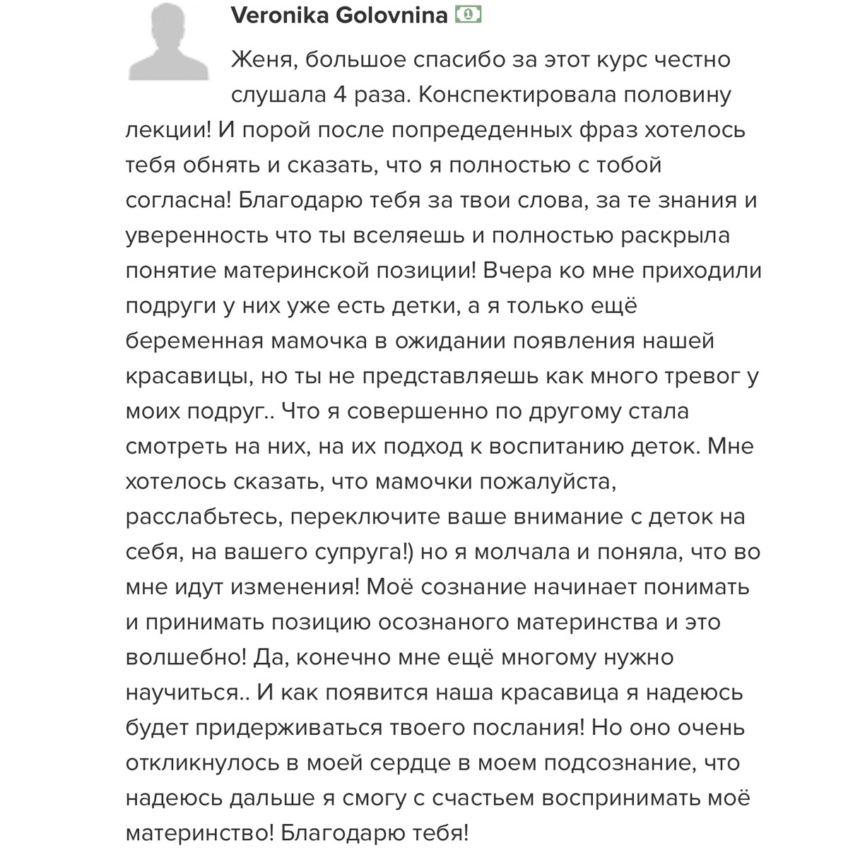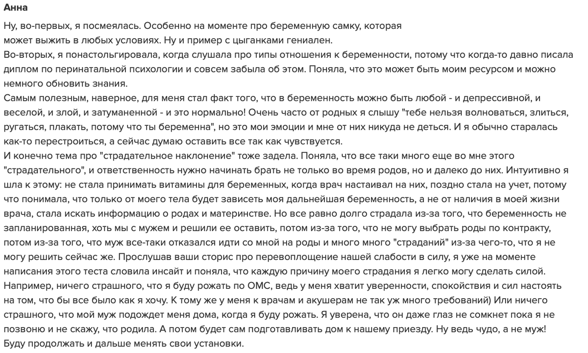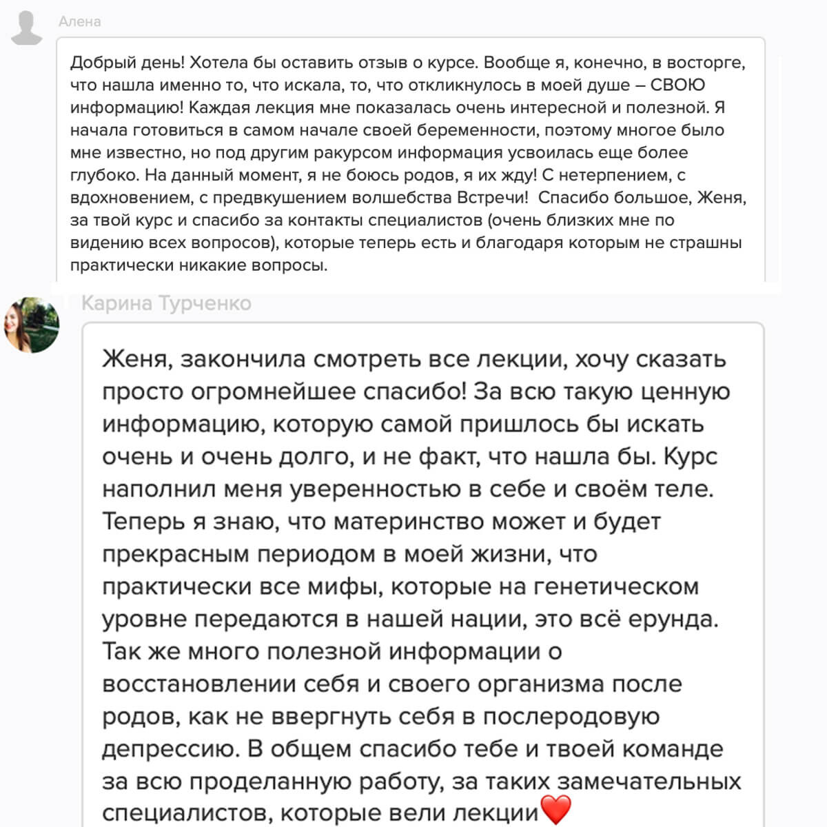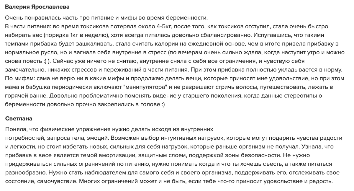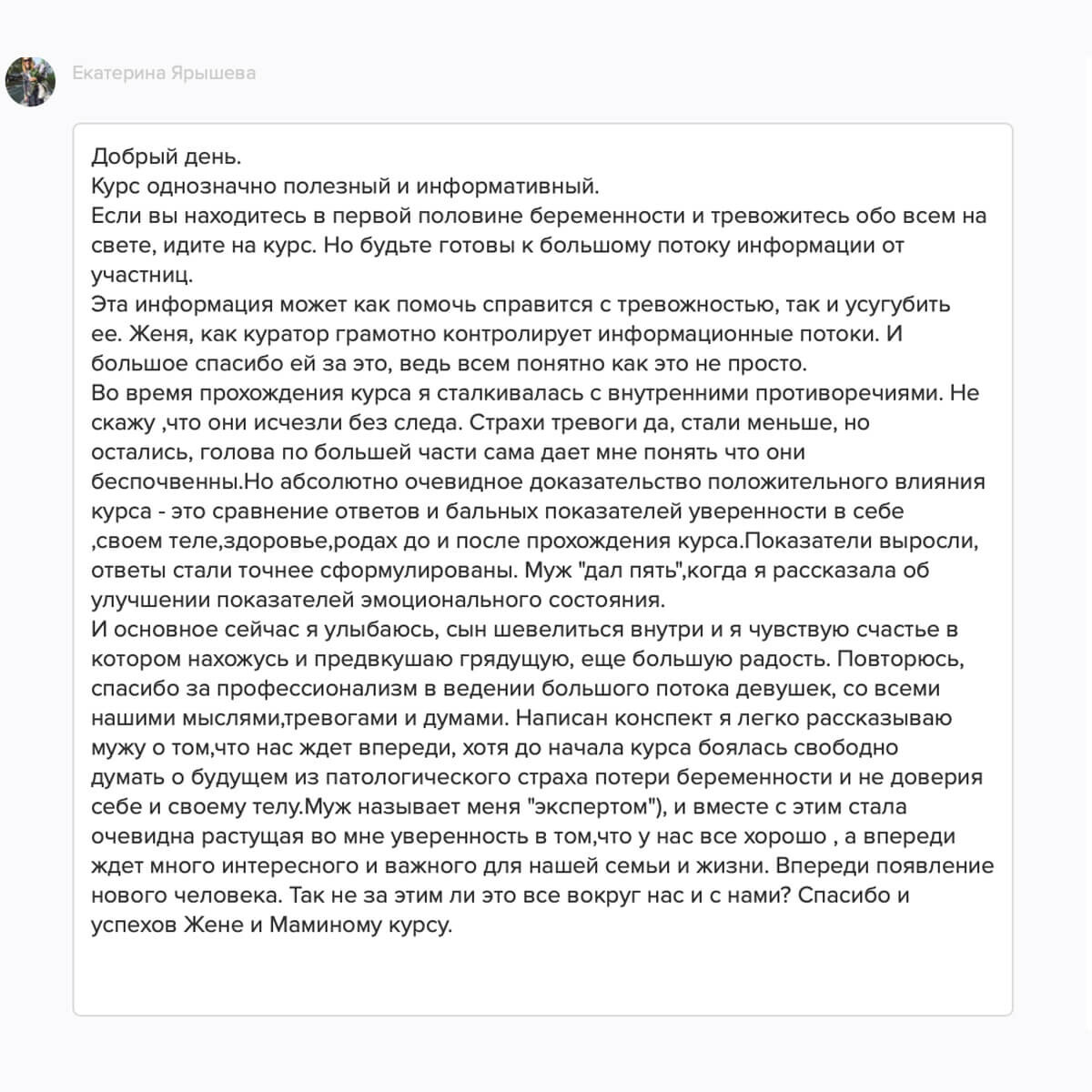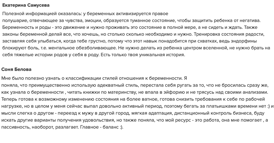Самый главный итог курса — превращение из беспокойной мамы в маму осознанную. Я научилась слушать себя, своё тело, доверять ему, доверять своему малышу. Этот навык подарил мне небывалое спокойствие и сменил тревогу на радость в ожидании встречи с малышом. Также важно понимание, что роды — это не зловещее медицинское окружение, это только о нас с малышом. Этот процесс полностью зависит от меня, моего подхода и поведения, я могу сама влиять на ситуацию и поворачивать ее в благоприятное русло. Кроме того, особенность курса в ненавязывании. Участникам предлагается огромный объём информации, но ни одной инструкции к действию, никакого давления. Чтобы принять решение, необходимо пропустить полученную информацию через призму собственных установок, мировоззрения и убеждений. Это о критическом мышлении, которое важно в любых аспектах жизни. И последнее, самое уютное и тёплое, — окружение, которое приобретаешь после курса. Это и поддержка Жени, других участниц, и огромное сообщество мамочек-выпускниц, которые с радостью поделятся опытом и окажут поддержку. Думаю, не каждой удавалось найти такую масштабную поддержку на протяжении всей жизни.