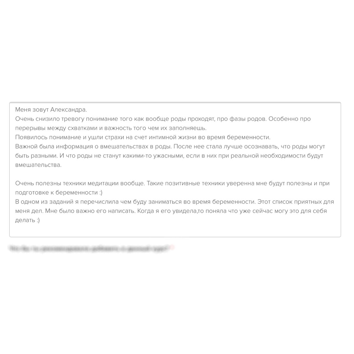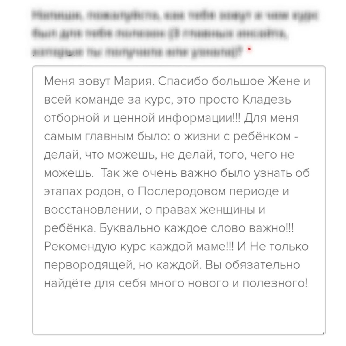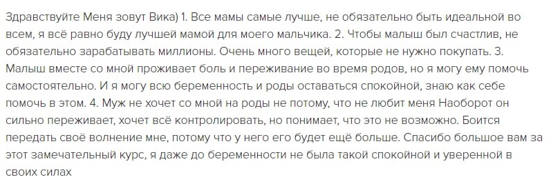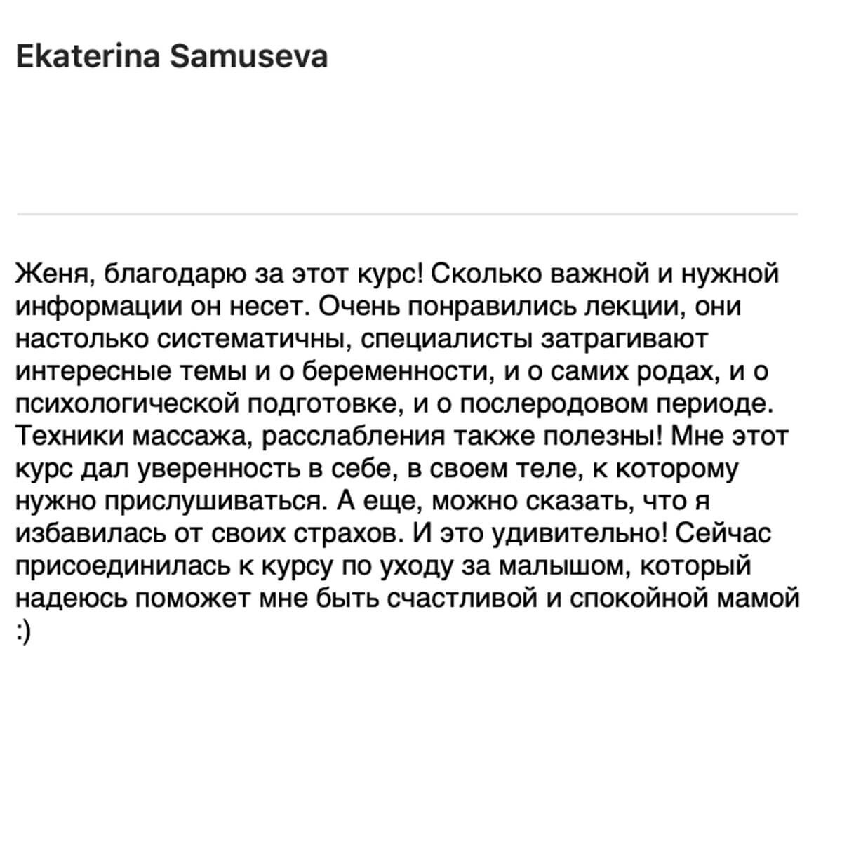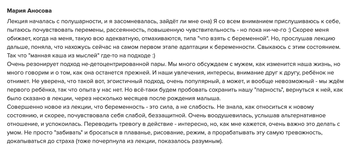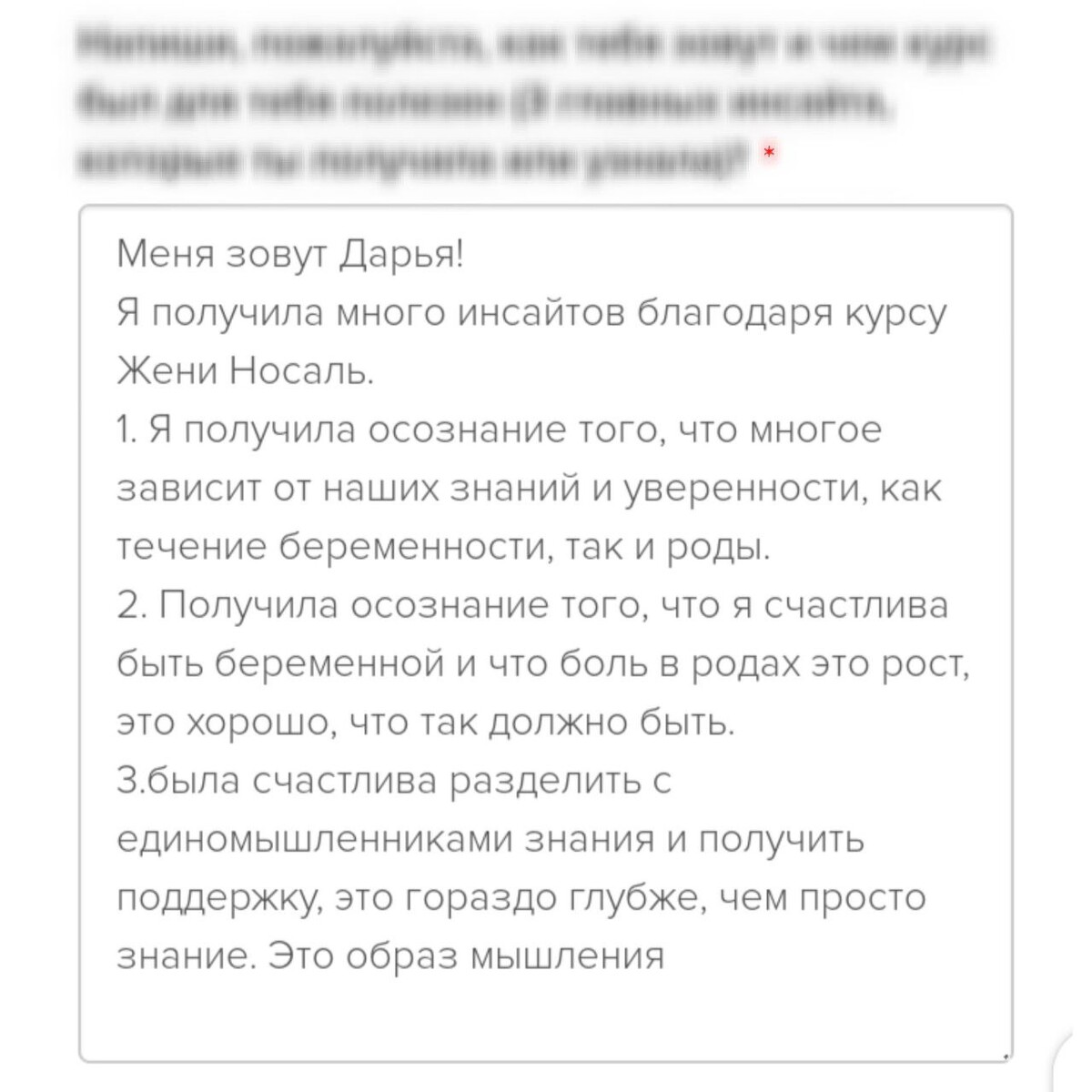 Самый главный итог курса — превращение из беспокойной мамы в маму осознанную. Я научилась слушать себя, своё тело, доверять ему, доверять своему малышу. Этот навык подарил мне небывалое спокойствие и сменил тревогу на радость в ожидании встречи с малышом. Также важно понимание, что роды — это не зловещее медицинское окружение, это только о нас с малышом. Этот процесс полностью зависит от меня, моего подхода и поведения, я могу сама влиять на ситуацию и поворачивать ее в благоприятное русло. Кроме того, особенность курса в ненавязывании. Участникам предлагается огромный объём информации, но ни одной инструкции к действию, никакого давления. Чтобы принять решение, необходимо пропустить полученную информацию через призму собственных установок, мировоззрения и убеждений. Это о критическом мышлении, которое важно в любых аспектах жизни. И последнее, самое уютное и тёплое, — окружение, которое приобретаешь после курса. Это и поддержка Жени, других участниц, и огромное сообщество мамочек-выпускниц, которые с радостью поделятся опытом и окажут поддержку. Думаю, не каждой удавалось найти такую масштабную поддержку на протяжении всей жизни.