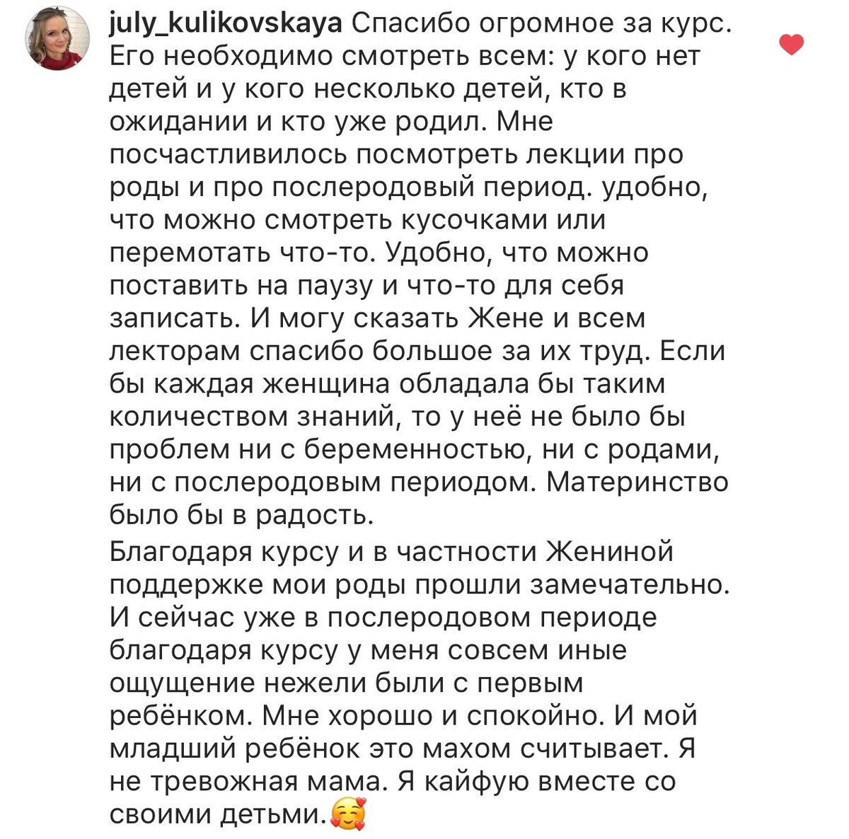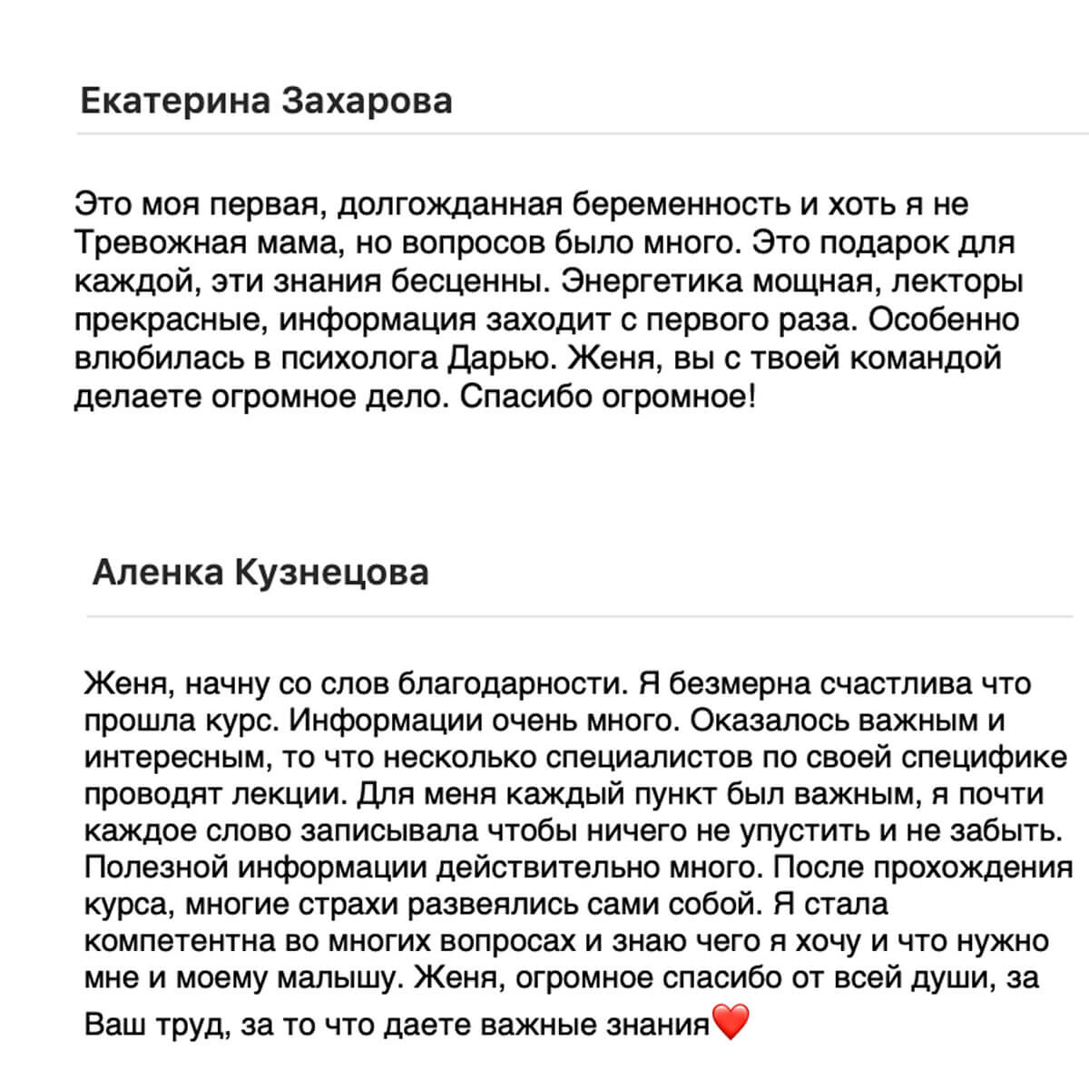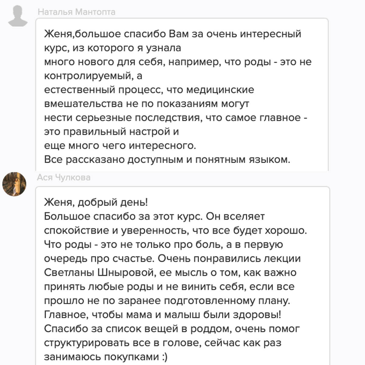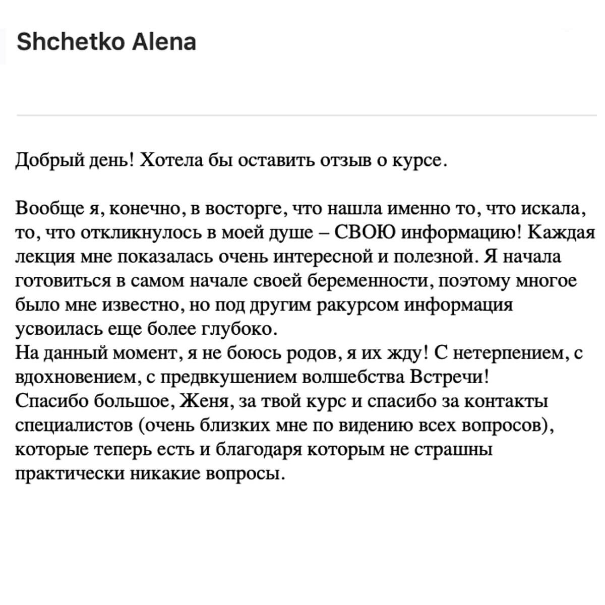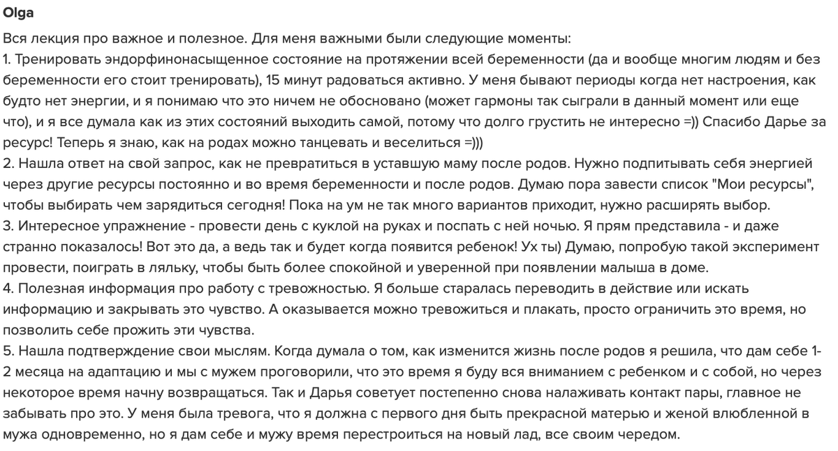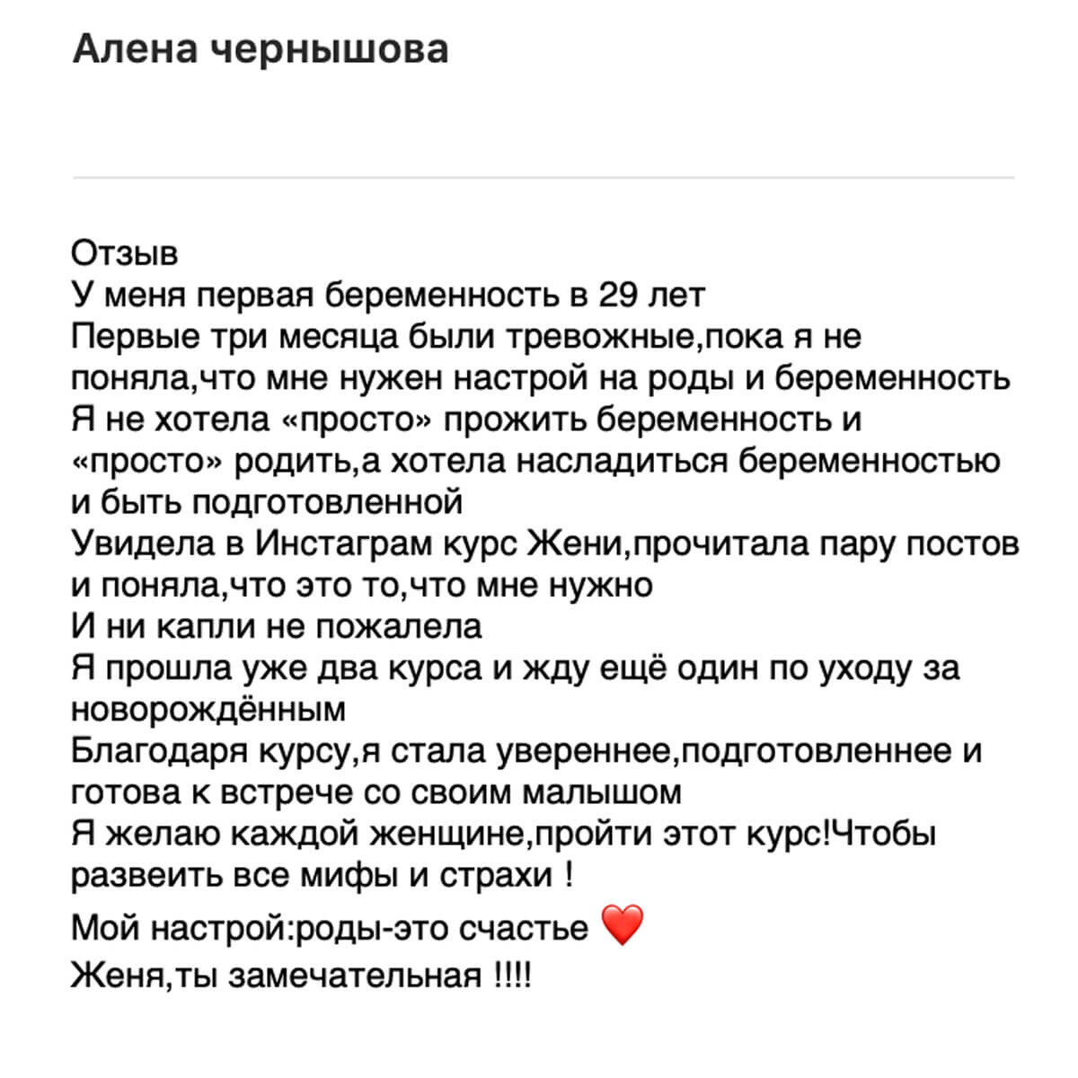 Самый главный итог курса — превращение из беспокойной мамы в маму осознанную. Я научилась слушать себя, своё тело, доверять ему, доверять своему малышу. Этот навык подарил мне небывалое спокойствие и сменил тревогу на радость в ожидании встречи с малышом. Также важно понимание, что роды — это не зловещее медицинское окружение, это только о нас с малышом. Этот процесс полностью зависит от меня, моего подхода и поведения, я могу сама влиять на ситуацию и поворачивать ее в благоприятное русло. Кроме того, особенность курса в ненавязывании. Участникам предлагается огромный объём информации, но ни одной инструкции к действию, никакого давления. Чтобы принять решение, необходимо пропустить полученную информацию через призму собственных установок, мировоззрения и убеждений. Это о критическом мышлении, которое важно в любых аспектах жизни. И последнее, самое уютное и тёплое, — окружение, которое приобретаешь после курса. Это и поддержка Жени, других участниц, и огромное сообщество мамочек-выпускниц, которые с радостью поделятся опытом и окажут поддержку. Думаю, не каждой удавалось найти такую масштабную поддержку на протяжении всей жизни.