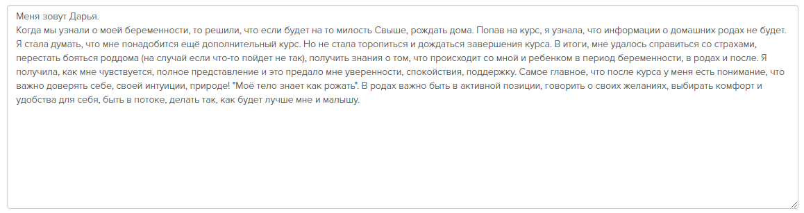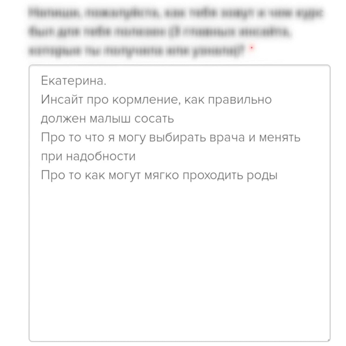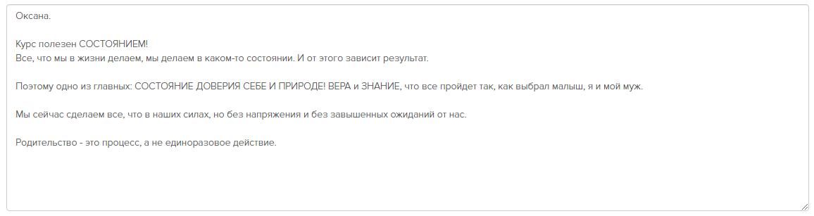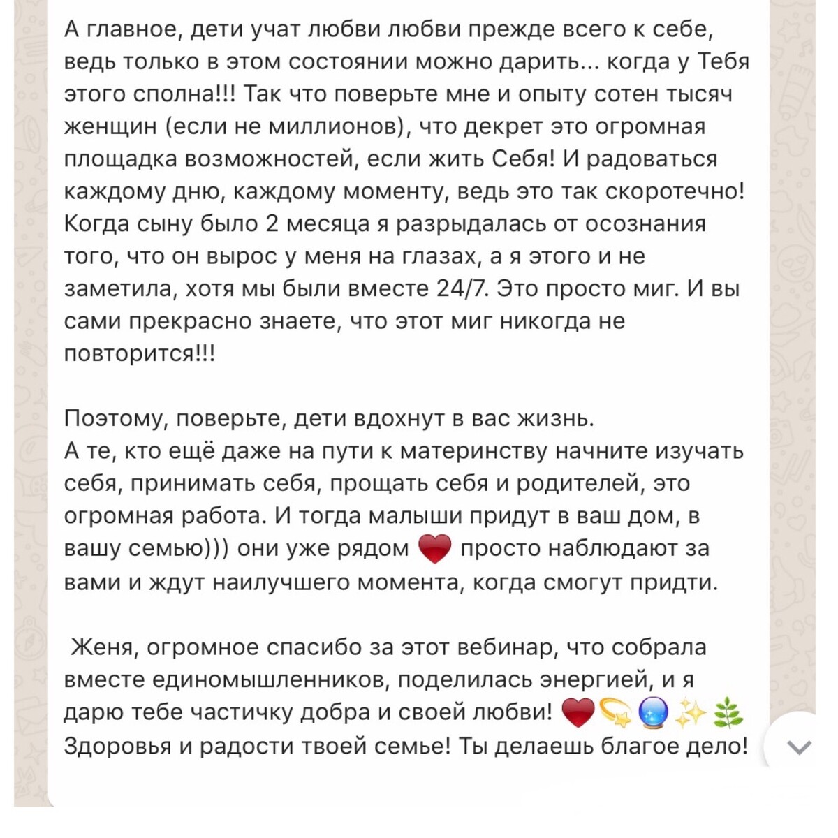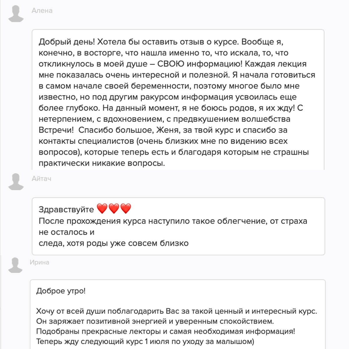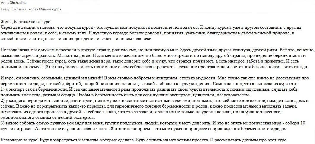 Самый главный итог курса — превращение из беспокойной мамы в маму осознанную. Я научилась слушать себя, своё тело, доверять ему, доверять своему малышу. Этот навык подарил мне небывалое спокойствие и сменил тревогу на радость в ожидании встречи с малышом. Также важно понимание, что роды — это не зловещее медицинское окружение, это только о нас с малышом. Этот процесс полностью зависит от меня, моего подхода и поведения, я могу сама влиять на ситуацию и поворачивать ее в благоприятное русло. Кроме того, особенность курса в ненавязывании. Участникам предлагается огромный объём информации, но ни одной инструкции к действию, никакого давления. Чтобы принять решение, необходимо пропустить полученную информацию через призму собственных установок, мировоззрения и убеждений. Это о критическом мышлении, которое важно в любых аспектах жизни. И последнее, самое уютное и тёплое, — окружение, которое приобретаешь после курса. Это и поддержка Жени, других участниц, и огромное сообщество мамочек-выпускниц, которые с радостью поделятся опытом и окажут поддержку. Думаю, не каждой удавалось найти такую масштабную поддержку на протяжении всей жизни.