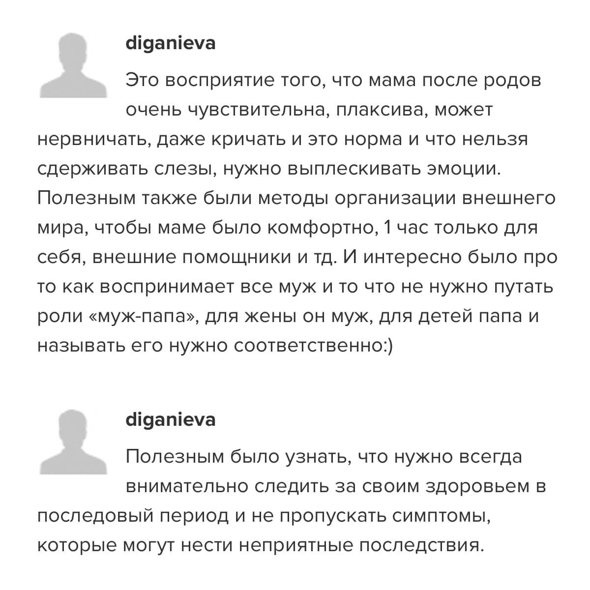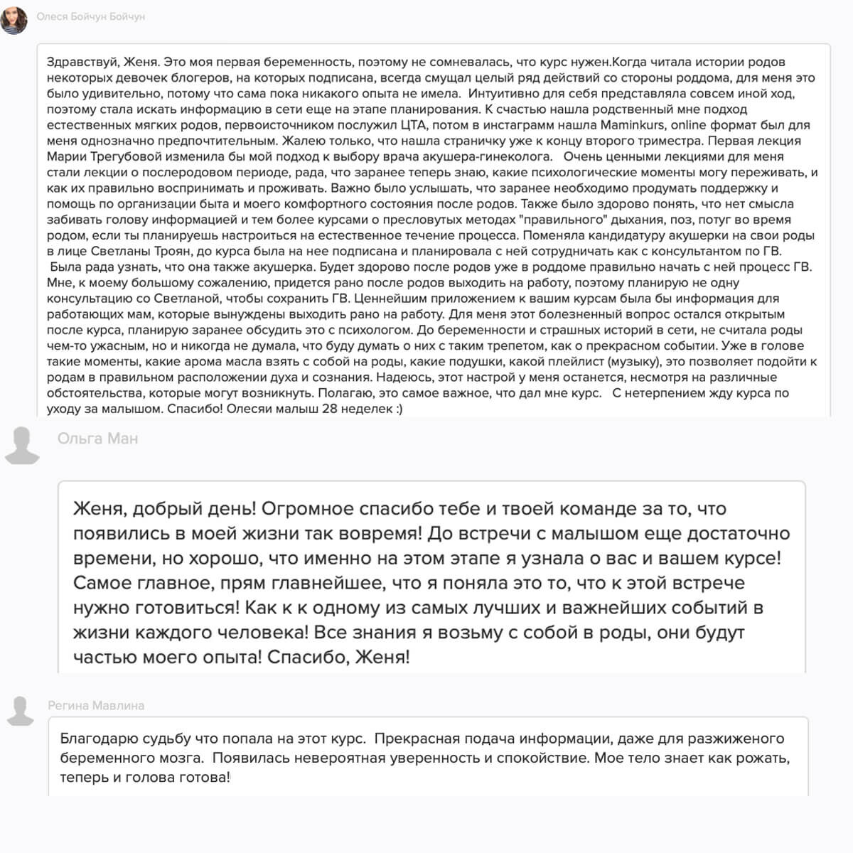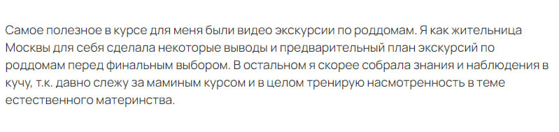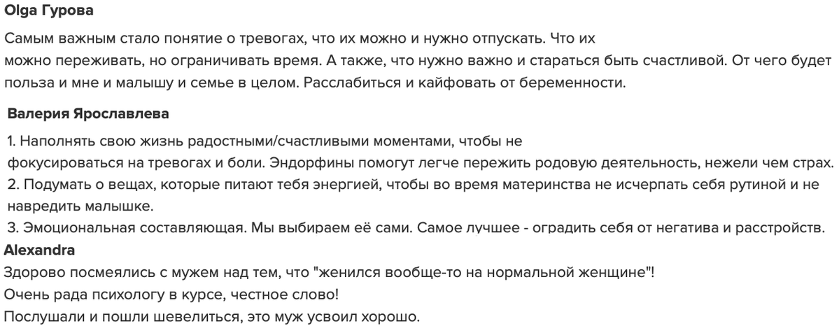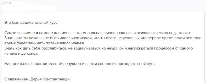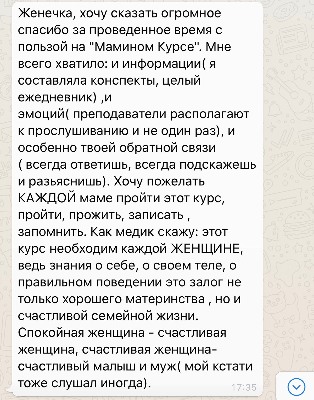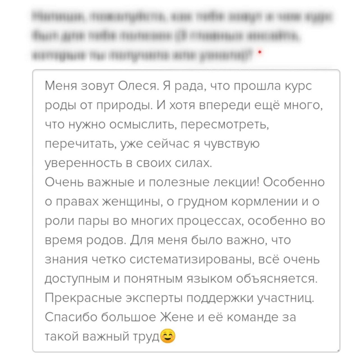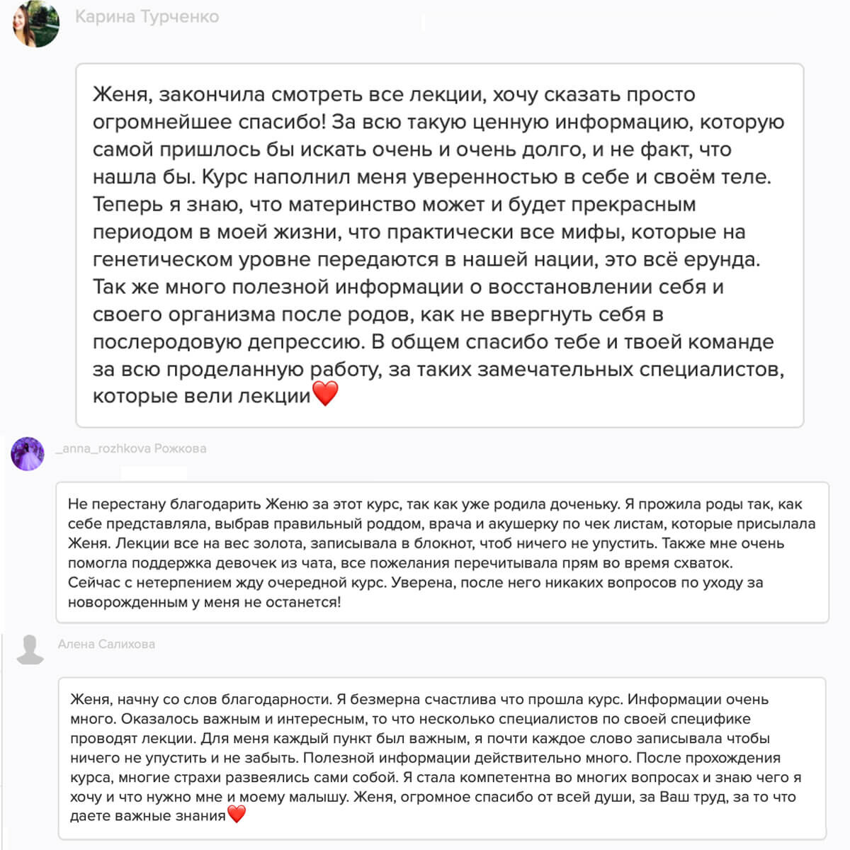 Самый главный итог курса — превращение из беспокойной мамы в маму осознанную. Я научилась слушать себя, своё тело, доверять ему, доверять своему малышу. Этот навык подарил мне небывалое спокойствие и сменил тревогу на радость в ожидании встречи с малышом. Также важно понимание, что роды — это не зловещее медицинское окружение, это только о нас с малышом. Этот процесс полностью зависит от меня, моего подхода и поведения, я могу сама влиять на ситуацию и поворачивать ее в благоприятное русло. Кроме того, особенность курса в ненавязывании. Участникам предлагается огромный объём информации, но ни одной инструкции к действию, никакого давления. Чтобы принять решение, необходимо пропустить полученную информацию через призму собственных установок, мировоззрения и убеждений. Это о критическом мышлении, которое важно в любых аспектах жизни. И последнее, самое уютное и тёплое, — окружение, которое приобретаешь после курса. Это и поддержка Жени, других участниц, и огромное сообщество мамочек-выпускниц, которые с радостью поделятся опытом и окажут поддержку. Думаю, не каждой удавалось найти такую масштабную поддержку на протяжении всей жизни.