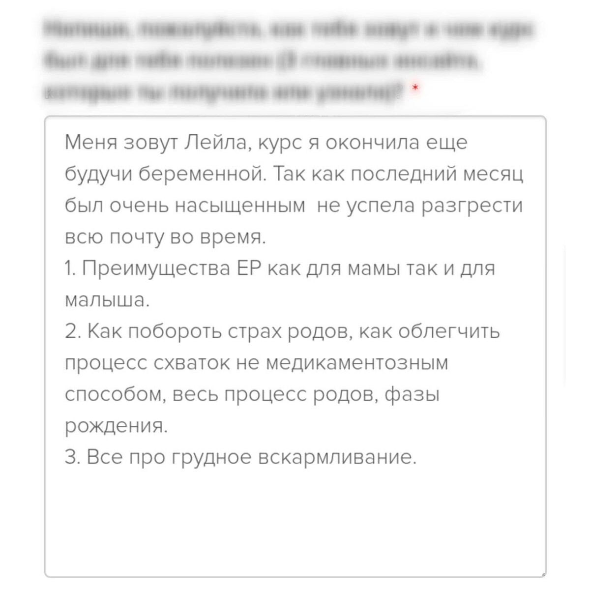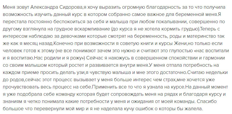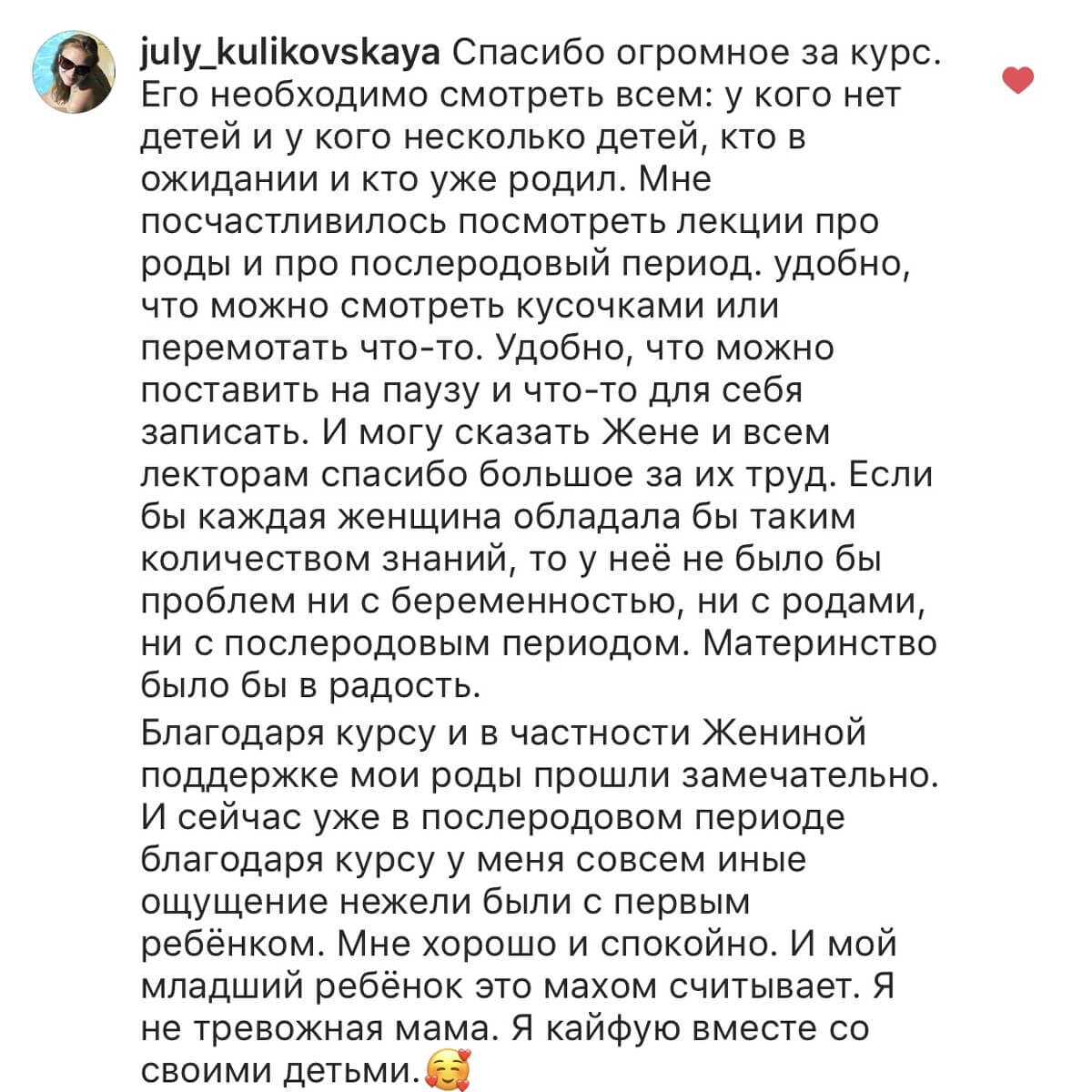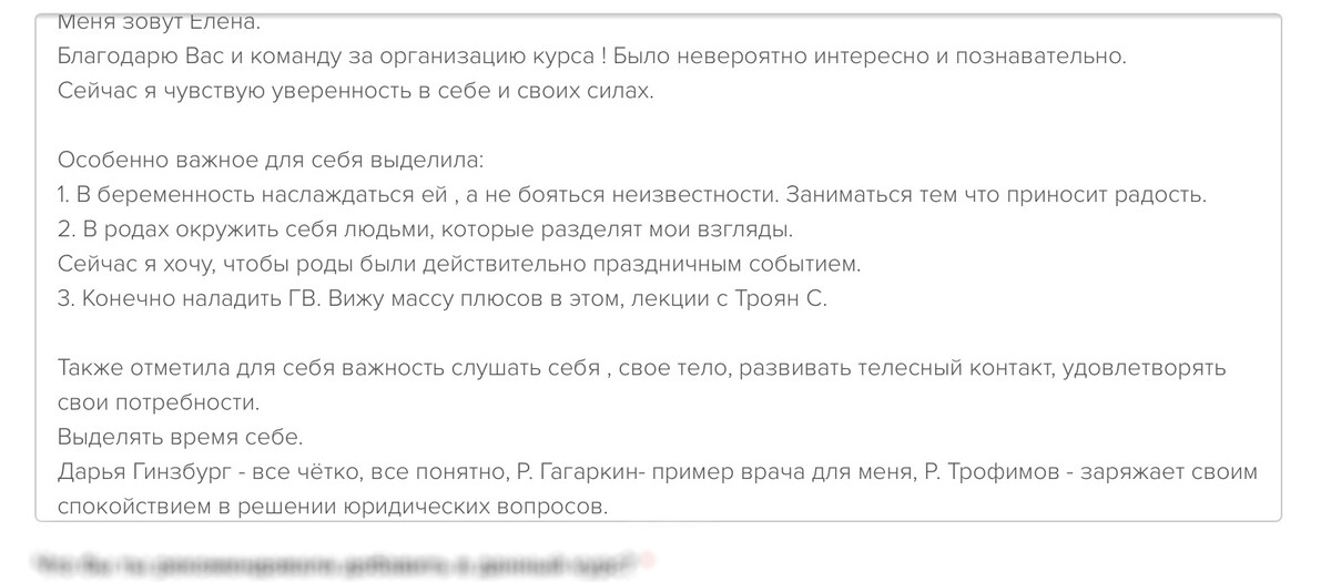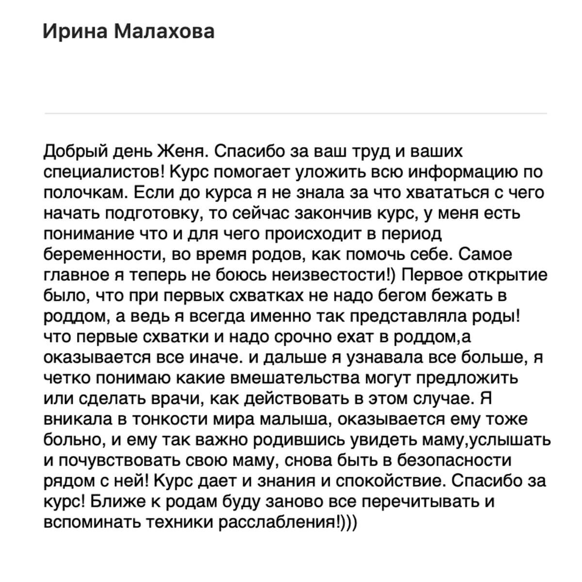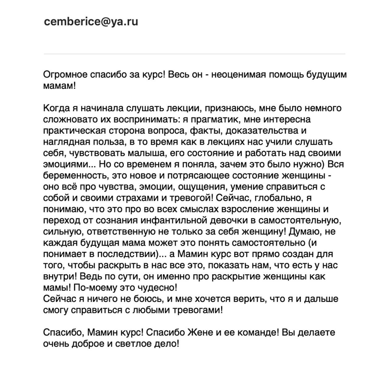 Самый главный итог курса — превращение из беспокойной мамы в маму осознанную. Я научилась слушать себя, своё тело, доверять ему, доверять своему малышу. Этот навык подарил мне небывалое спокойствие и сменил тревогу на радость в ожидании встречи с малышом. Также важно понимание, что роды — это не зловещее медицинское окружение, это только о нас с малышом. Этот процесс полностью зависит от меня, моего подхода и поведения, я могу сама влиять на ситуацию и поворачивать ее в благоприятное русло. Кроме того, особенность курса в ненавязывании. Участникам предлагается огромный объём информации, но ни одной инструкции к действию, никакого давления. Чтобы принять решение, необходимо пропустить полученную информацию через призму собственных установок, мировоззрения и убеждений. Это о критическом мышлении, которое важно в любых аспектах жизни. И последнее, самое уютное и тёплое, — окружение, которое приобретаешь после курса. Это и поддержка Жени, других участниц, и огромное сообщество мамочек-выпускниц, которые с радостью поделятся опытом и окажут поддержку. Думаю, не каждой удавалось найти такую масштабную поддержку на протяжении всей жизни.