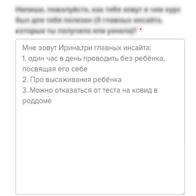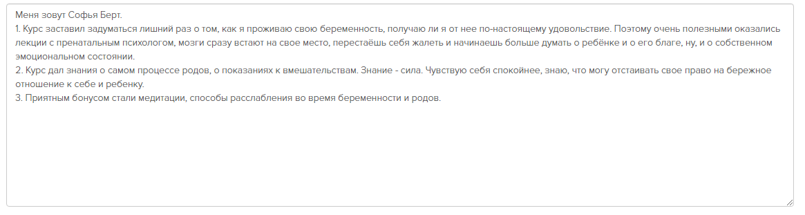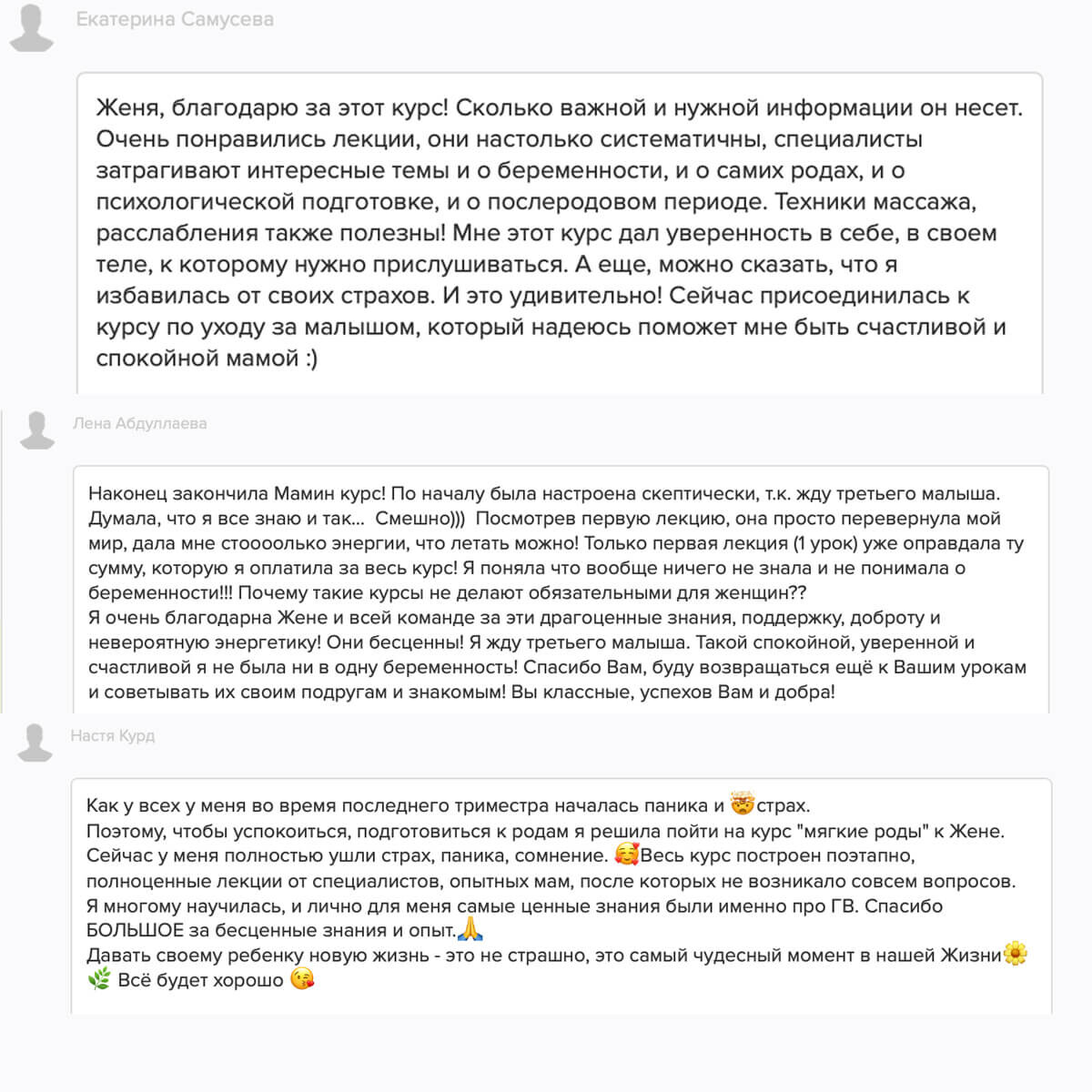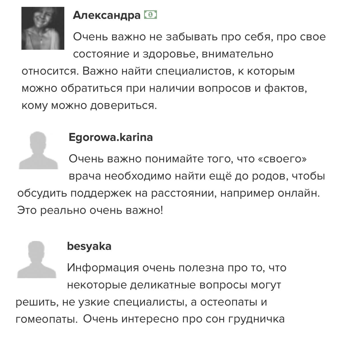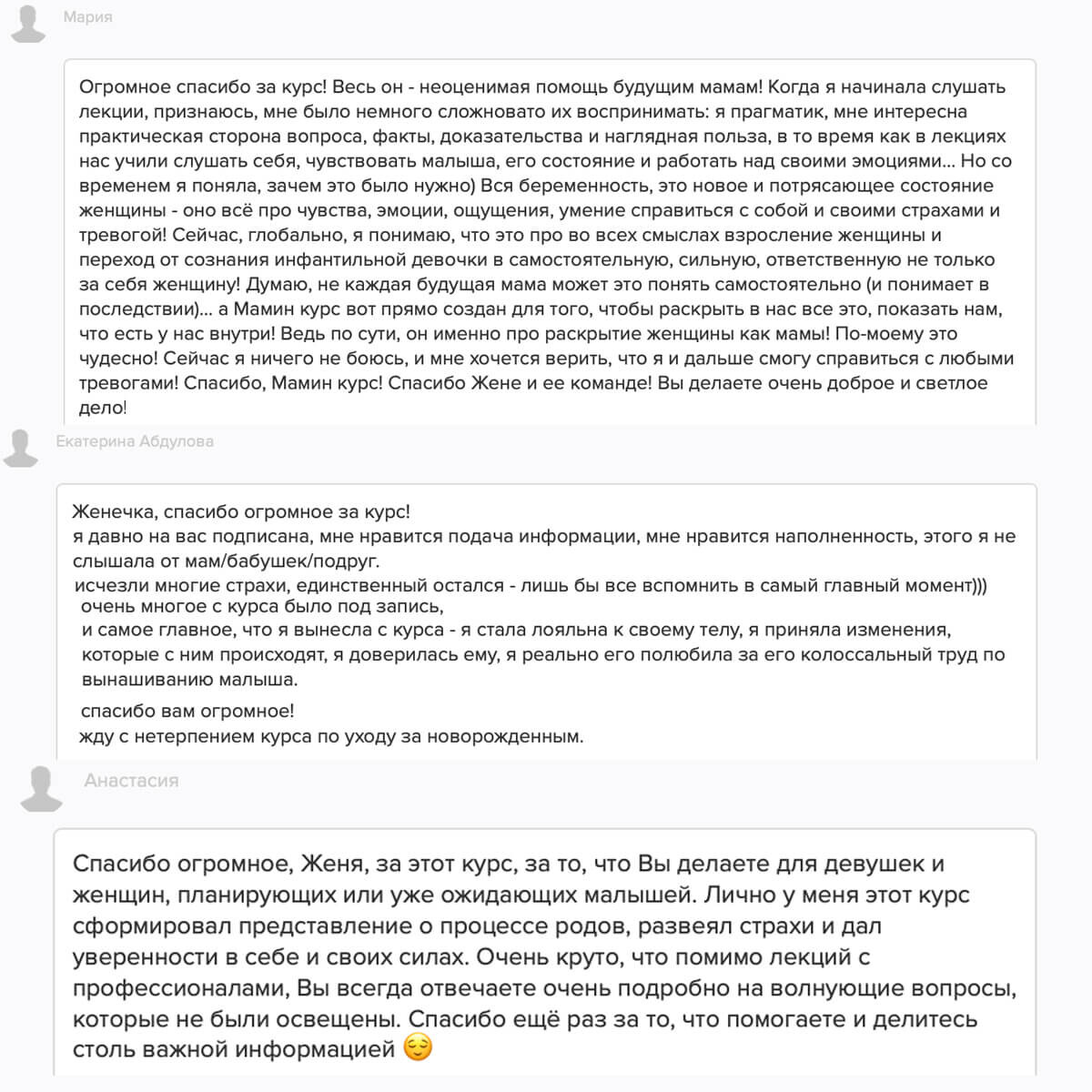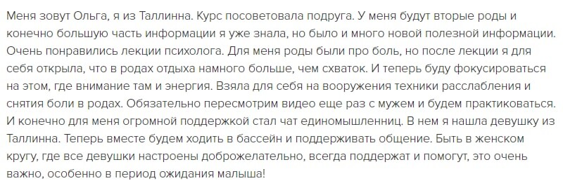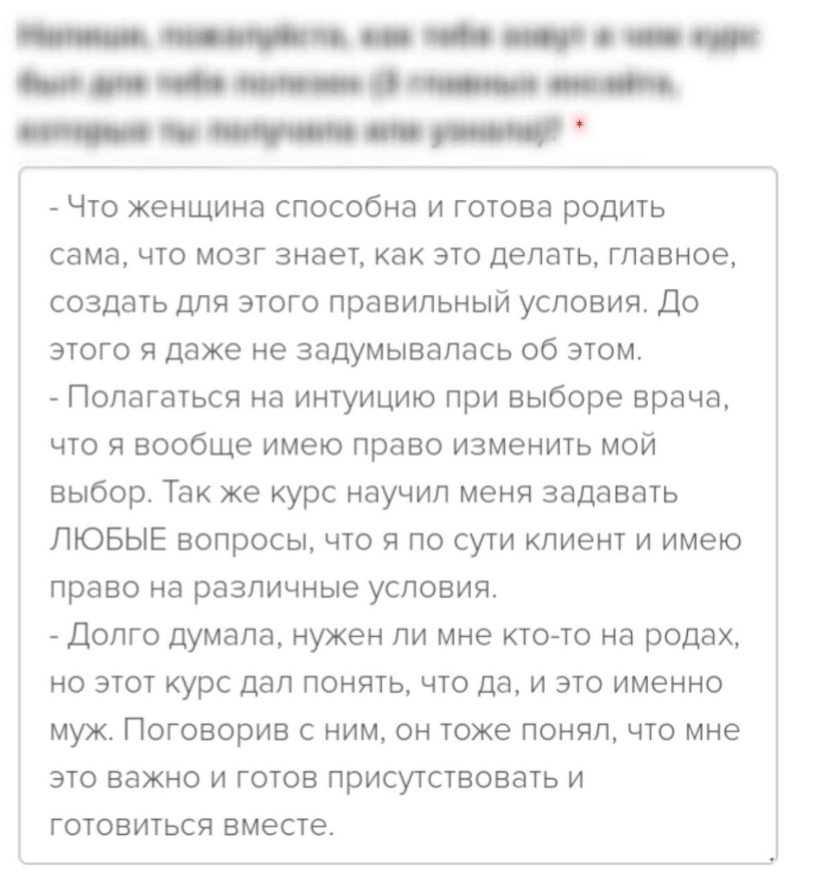 Самый главный итог курса — превращение из беспокойной мамы в маму осознанную. Я научилась слушать себя, своё тело, доверять ему, доверять своему малышу. Этот навык подарил мне небывалое спокойствие и сменил тревогу на радость в ожидании встречи с малышом. Также важно понимание, что роды — это не зловещее медицинское окружение, это только о нас с малышом. Этот процесс полностью зависит от меня, моего подхода и поведения, я могу сама влиять на ситуацию и поворачивать ее в благоприятное русло. Кроме того, особенность курса в ненавязывании. Участникам предлагается огромный объём информации, но ни одной инструкции к действию, никакого давления. Чтобы принять решение, необходимо пропустить полученную информацию через призму собственных установок, мировоззрения и убеждений. Это о критическом мышлении, которое важно в любых аспектах жизни. И последнее, самое уютное и тёплое, — окружение, которое приобретаешь после курса. Это и поддержка Жени, других участниц, и огромное сообщество мамочек-выпускниц, которые с радостью поделятся опытом и окажут поддержку. Думаю, не каждой удавалось найти такую масштабную поддержку на протяжении всей жизни.