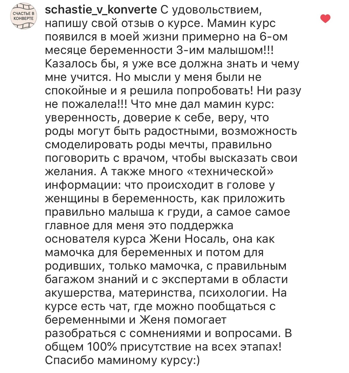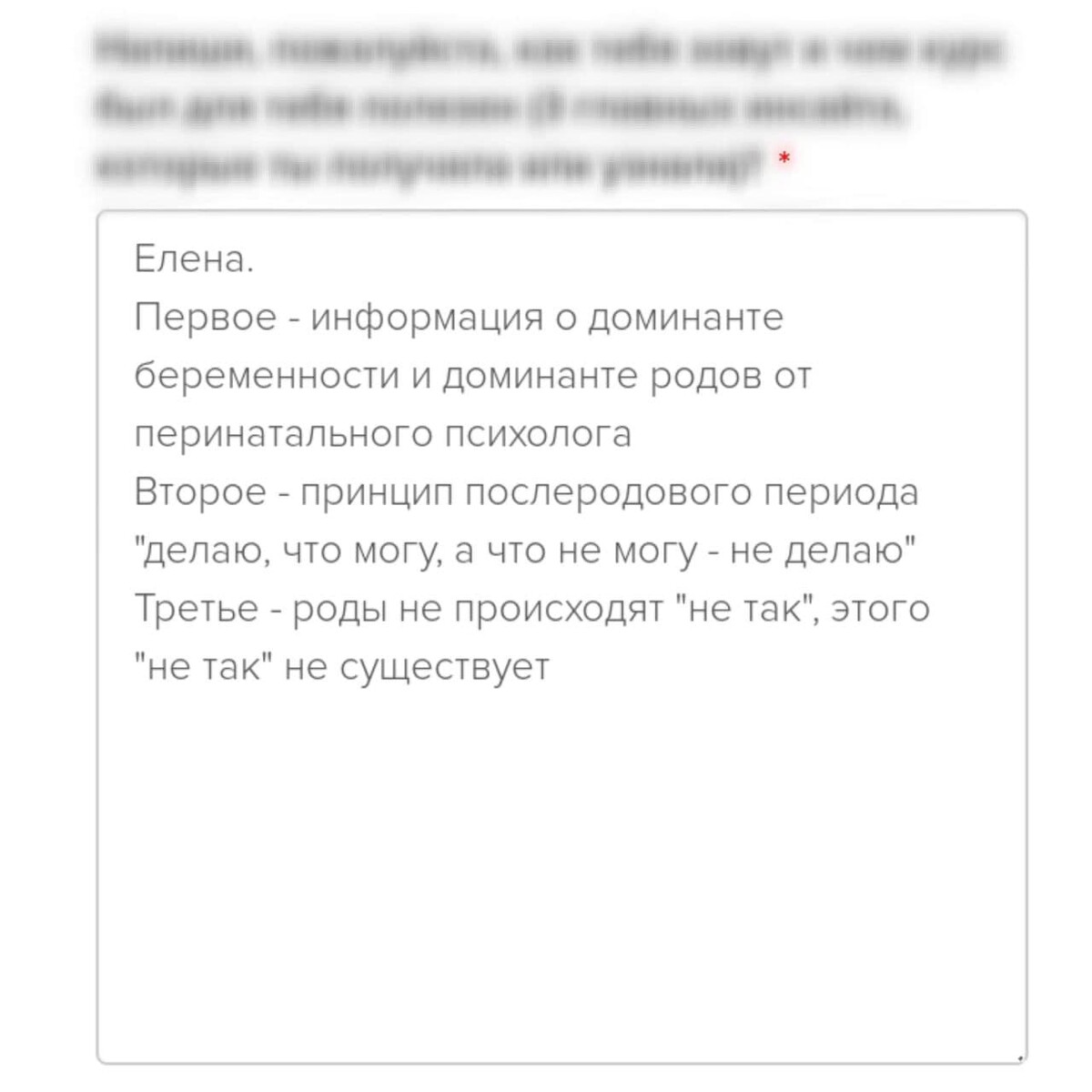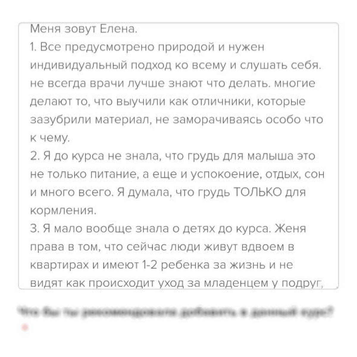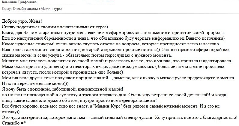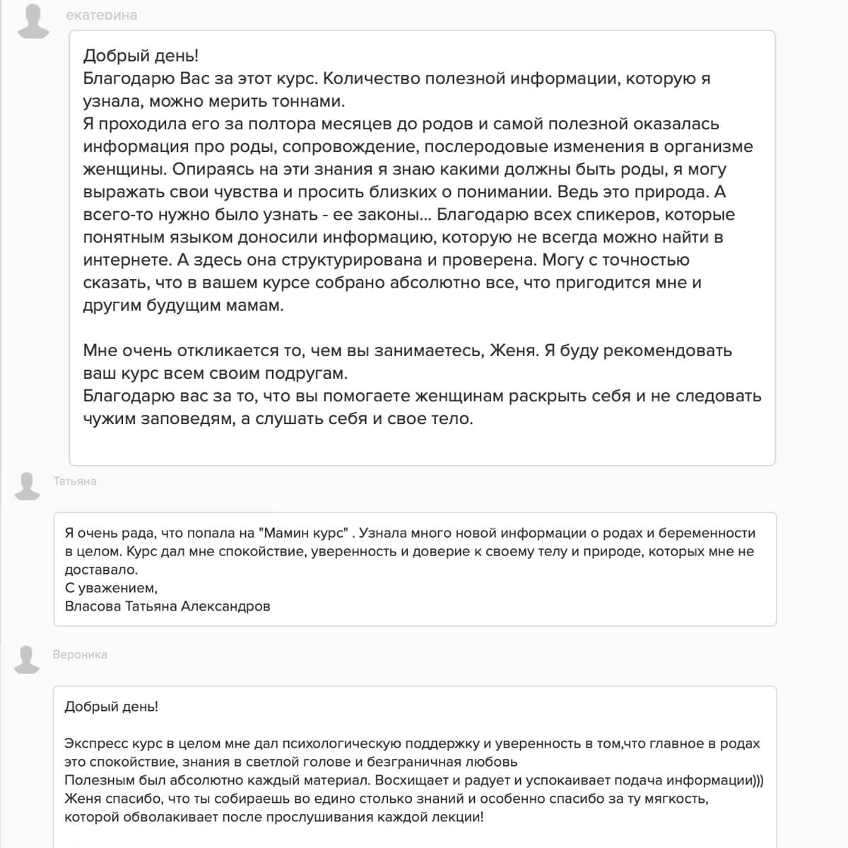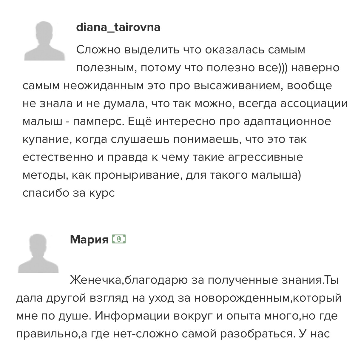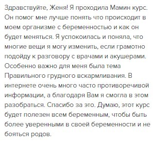 Самый главный итог курса — превращение из беспокойной мамы в маму осознанную. Я научилась слушать себя, своё тело, доверять ему, доверять своему малышу. Этот навык подарил мне небывалое спокойствие и сменил тревогу на радость в ожидании встречи с малышом. Также важно понимание, что роды — это не зловещее медицинское окружение, это только о нас с малышом. Этот процесс полностью зависит от меня, моего подхода и поведения, я могу сама влиять на ситуацию и поворачивать ее в благоприятное русло. Кроме того, особенность курса в ненавязывании. Участникам предлагается огромный объём информации, но ни одной инструкции к действию, никакого давления. Чтобы принять решение, необходимо пропустить полученную информацию через призму собственных установок, мировоззрения и убеждений. Это о критическом мышлении, которое важно в любых аспектах жизни. И последнее, самое уютное и тёплое, — окружение, которое приобретаешь после курса. Это и поддержка Жени, других участниц, и огромное сообщество мамочек-выпускниц, которые с радостью поделятся опытом и окажут поддержку. Думаю, не каждой удавалось найти такую масштабную поддержку на протяжении всей жизни.