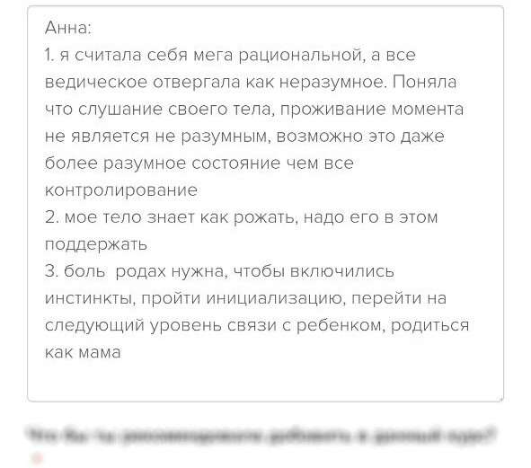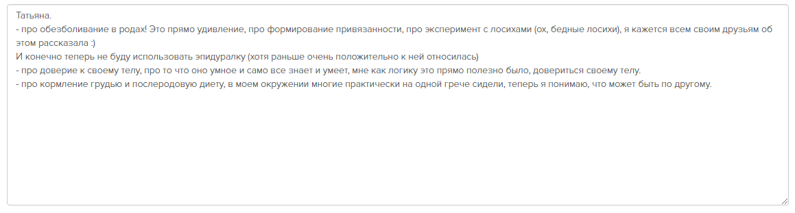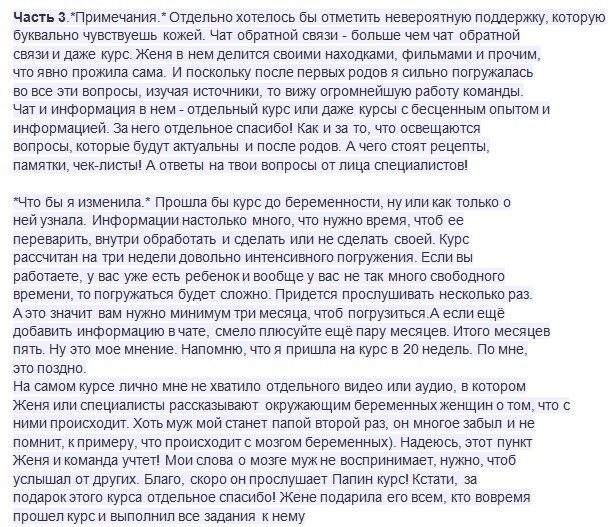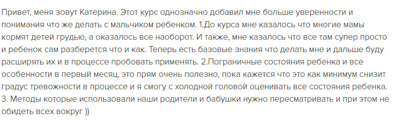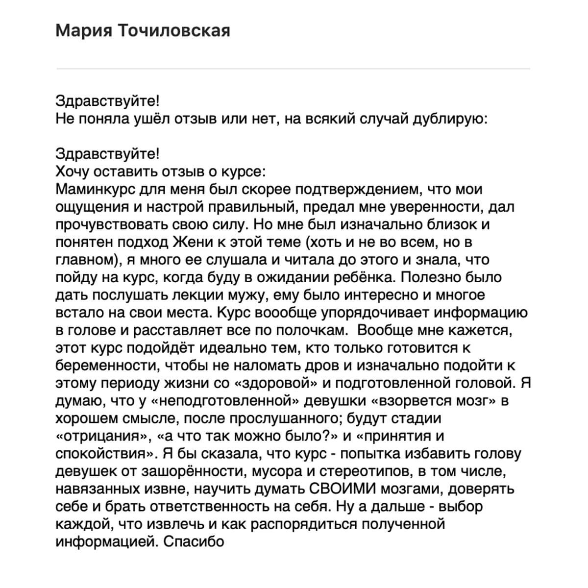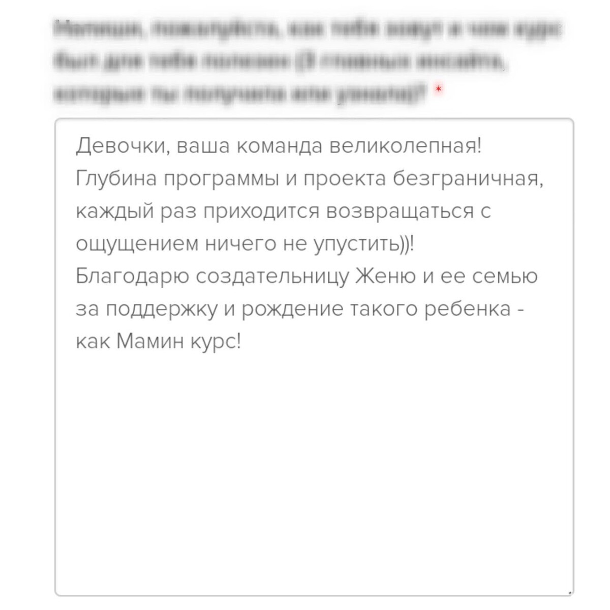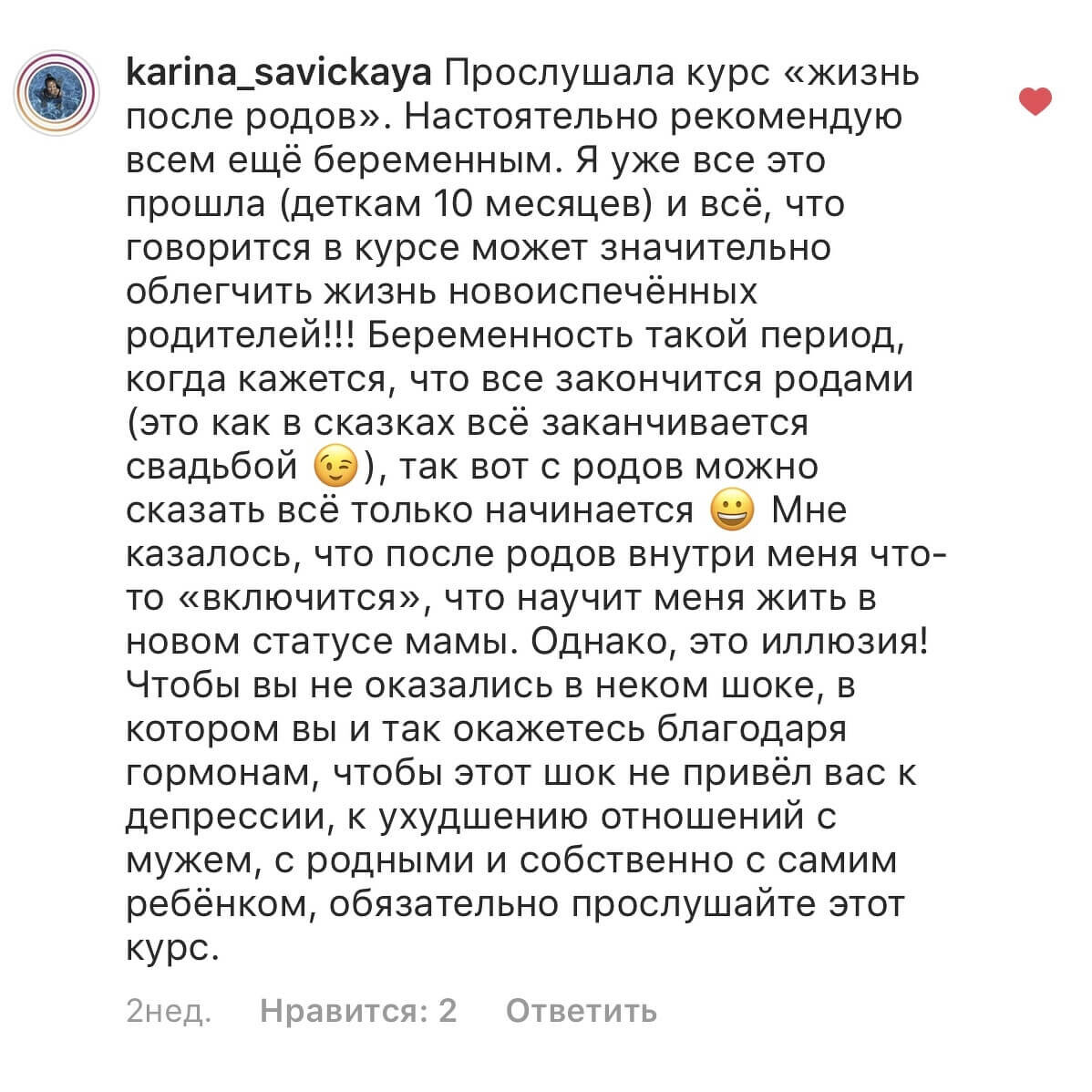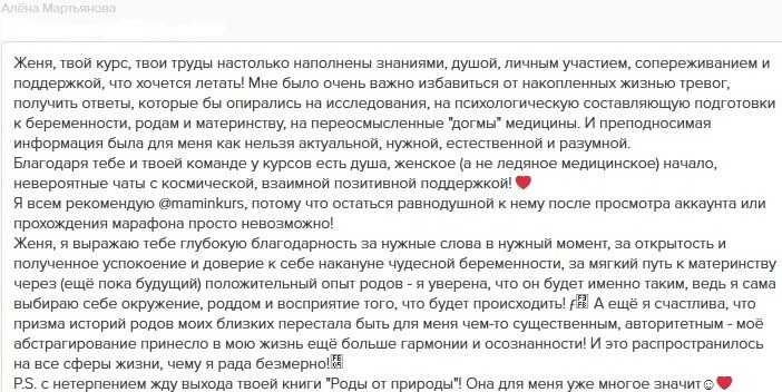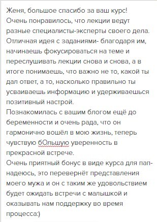 Самый главный итог курса — превращение из беспокойной мамы в маму осознанную. Я научилась слушать себя, своё тело, доверять ему, доверять своему малышу. Этот навык подарил мне небывалое спокойствие и сменил тревогу на радость в ожидании встречи с малышом. Также важно понимание, что роды — это не зловещее медицинское окружение, это только о нас с малышом. Этот процесс полностью зависит от меня, моего подхода и поведения, я могу сама влиять на ситуацию и поворачивать ее в благоприятное русло. Кроме того, особенность курса в ненавязывании. Участникам предлагается огромный объём информации, но ни одной инструкции к действию, никакого давления. Чтобы принять решение, необходимо пропустить полученную информацию через призму собственных установок, мировоззрения и убеждений. Это о критическом мышлении, которое важно в любых аспектах жизни. И последнее, самое уютное и тёплое, — окружение, которое приобретаешь после курса. Это и поддержка Жени, других участниц, и огромное сообщество мамочек-выпускниц, которые с радостью поделятся опытом и окажут поддержку. Думаю, не каждой удавалось найти такую масштабную поддержку на протяжении всей жизни.