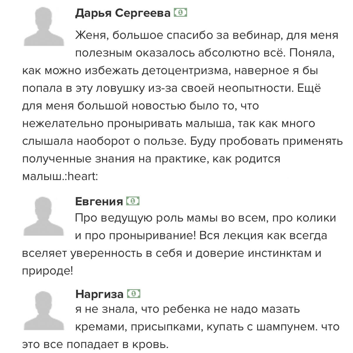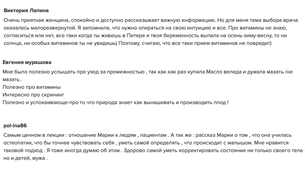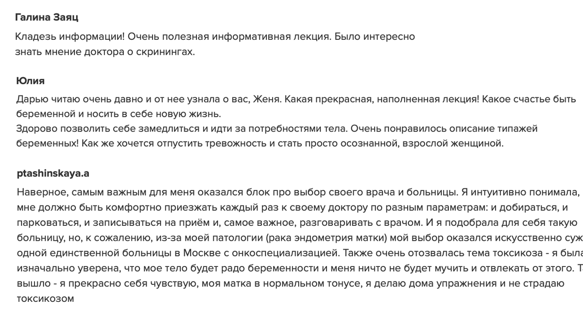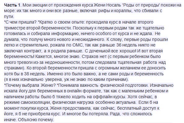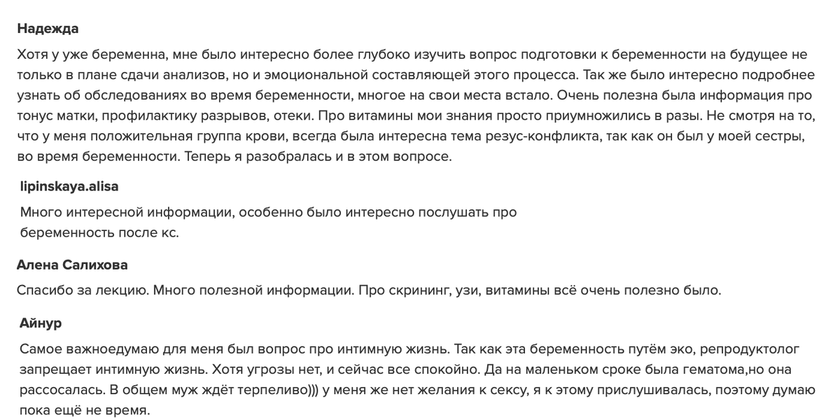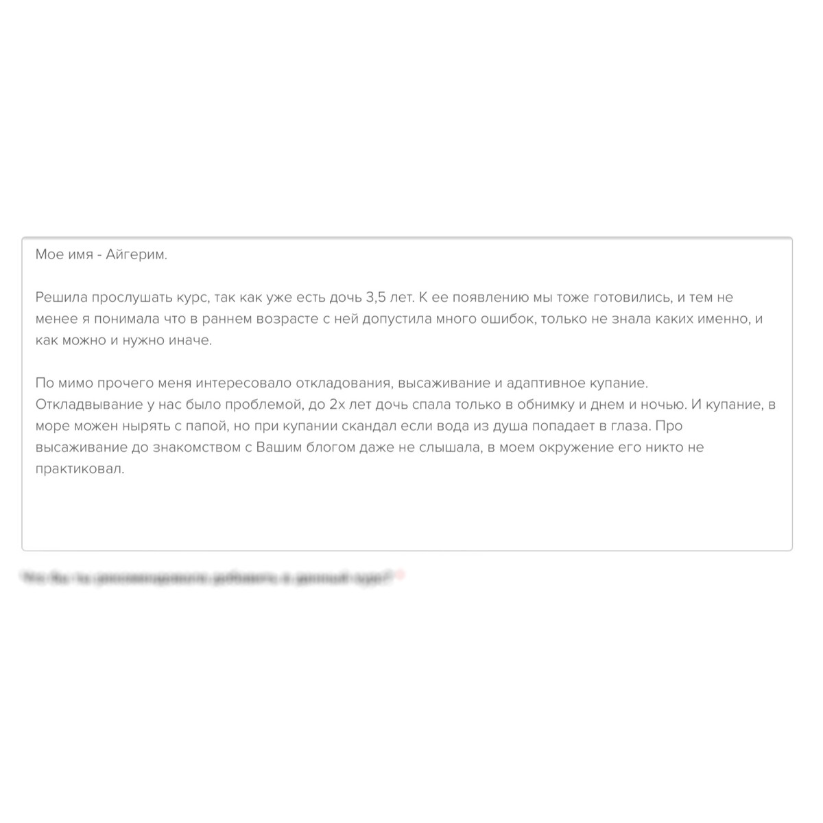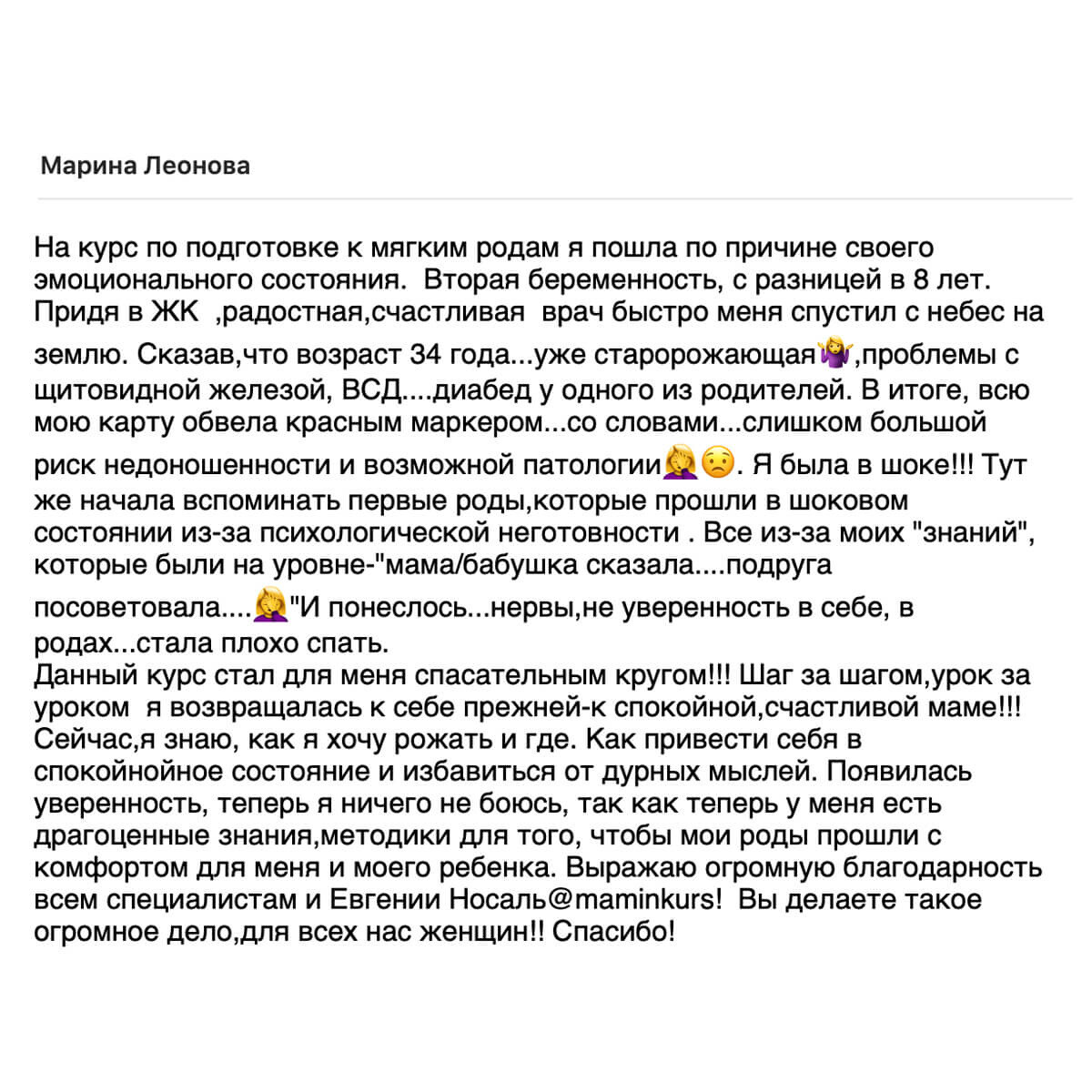 Самый главный итог курса — превращение из беспокойной мамы в маму осознанную. Я научилась слушать себя, своё тело, доверять ему, доверять своему малышу. Этот навык подарил мне небывалое спокойствие и сменил тревогу на радость в ожидании встречи с малышом. Также важно понимание, что роды — это не зловещее медицинское окружение, это только о нас с малышом. Этот процесс полностью зависит от меня, моего подхода и поведения, я могу сама влиять на ситуацию и поворачивать ее в благоприятное русло. Кроме того, особенность курса в ненавязывании. Участникам предлагается огромный объём информации, но ни одной инструкции к действию, никакого давления. Чтобы принять решение, необходимо пропустить полученную информацию через призму собственных установок, мировоззрения и убеждений. Это о критическом мышлении, которое важно в любых аспектах жизни. И последнее, самое уютное и тёплое, — окружение, которое приобретаешь после курса. Это и поддержка Жени, других участниц, и огромное сообщество мамочек-выпускниц, которые с радостью поделятся опытом и окажут поддержку. Думаю, не каждой удавалось найти такую масштабную поддержку на протяжении всей жизни.