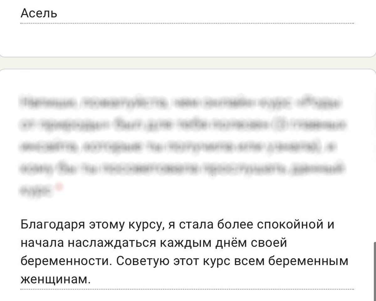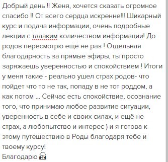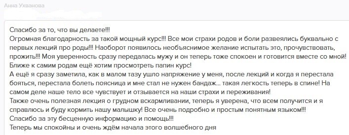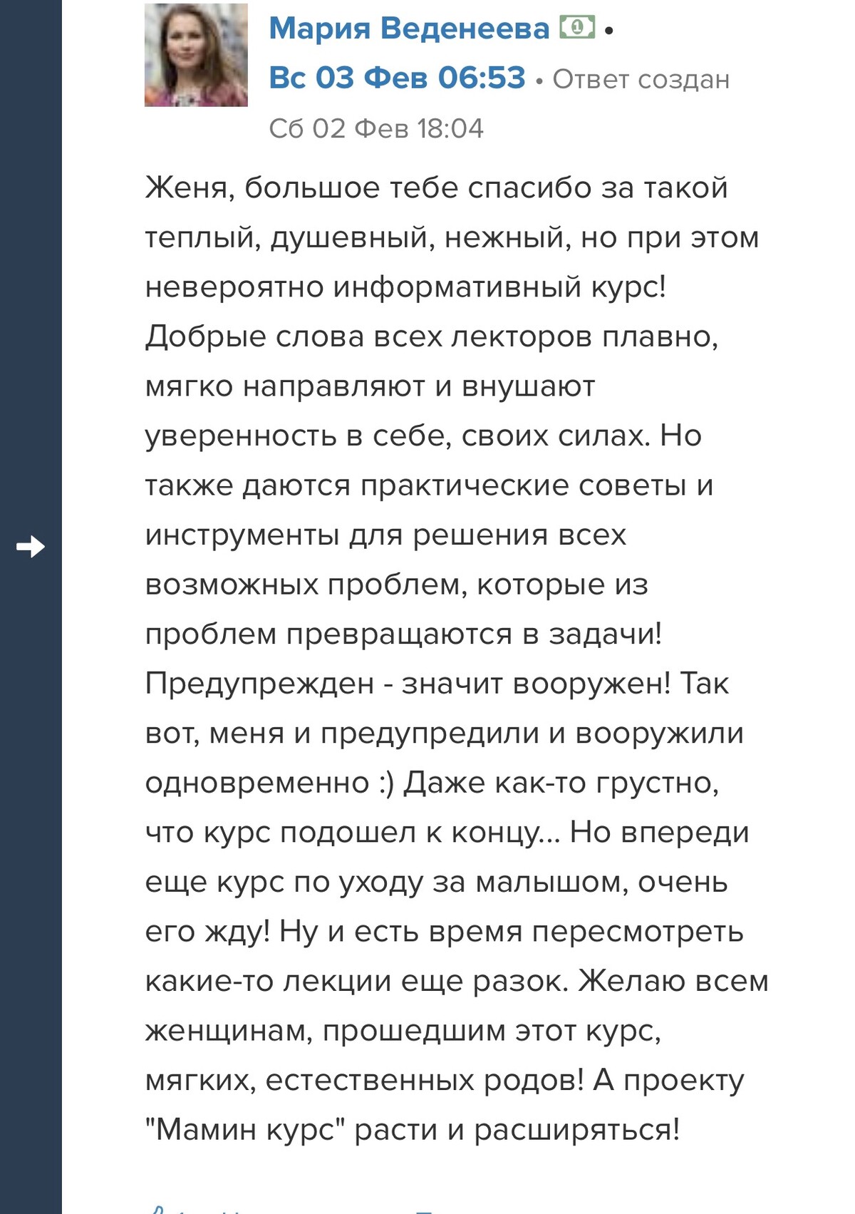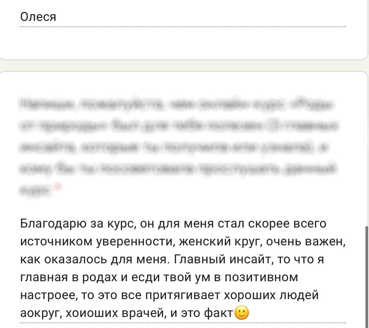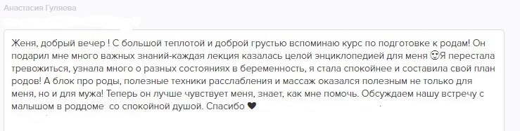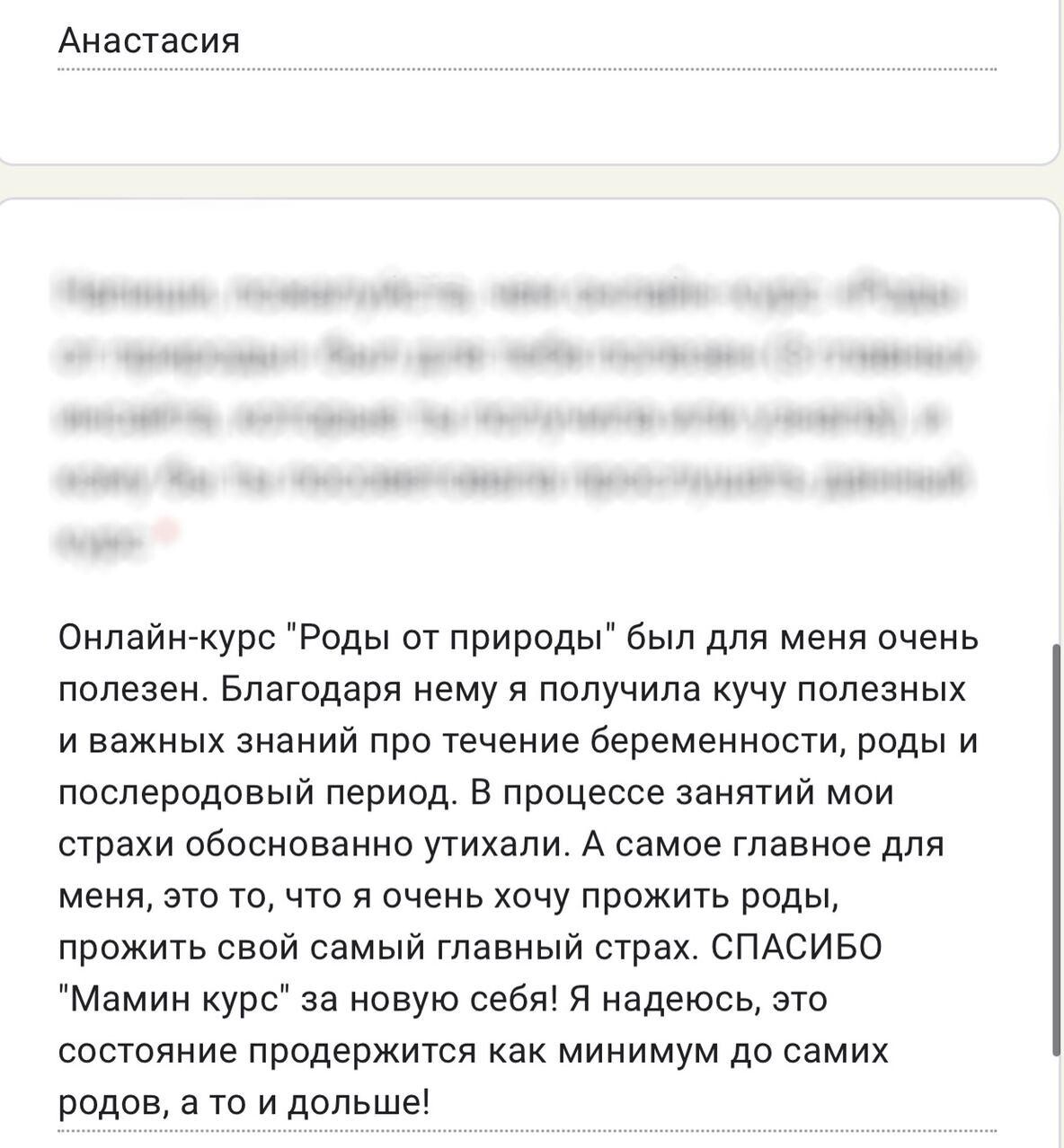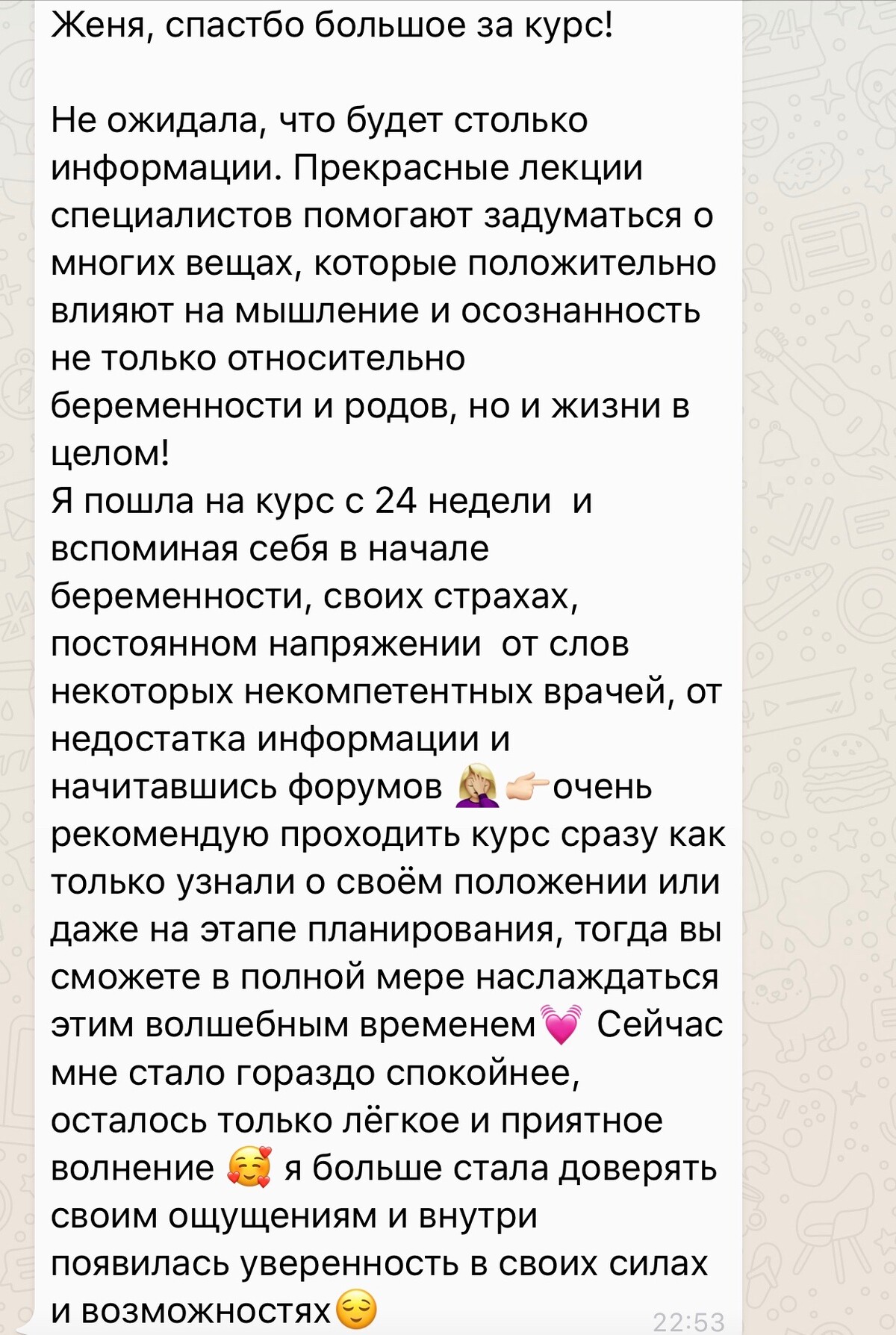Шикарный курс и подача информации, очень подробные лекции с таааким количеством информации! Отдельная благодарность за прямые эфиры, ты просто заряжаешь уверенностью и спокойствием! Итоги у меня такие - реально ушел страх родов - что пойдет что то не так, попаду в не тот роддом, а как потом? Сейчас есть спокойствие, осознание того, что принимаю любое развитие ситуации, уверенность в себе и своих силах, и ещё не страх, а любопытство и интерес, и я готова к этому путешествию в Роды благодаря тебе и твоему курсу!