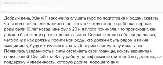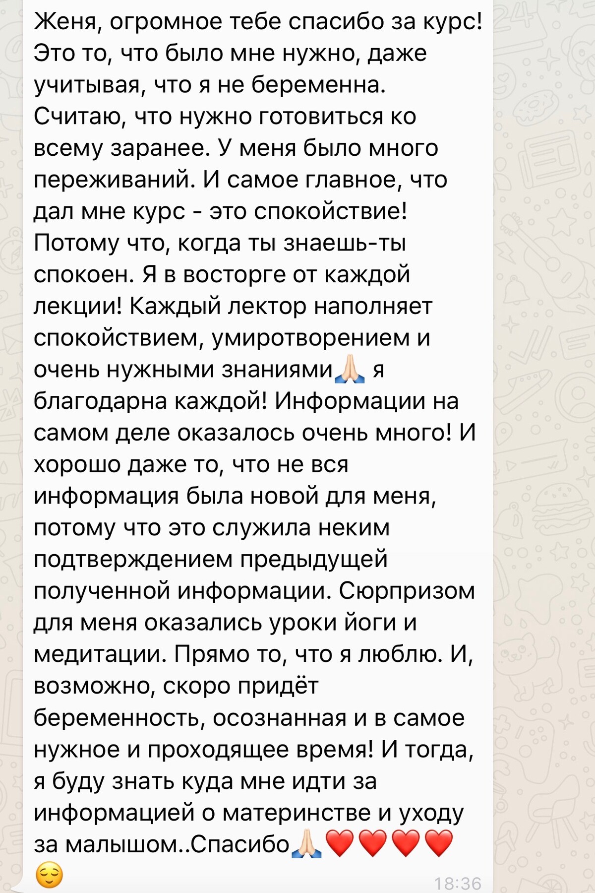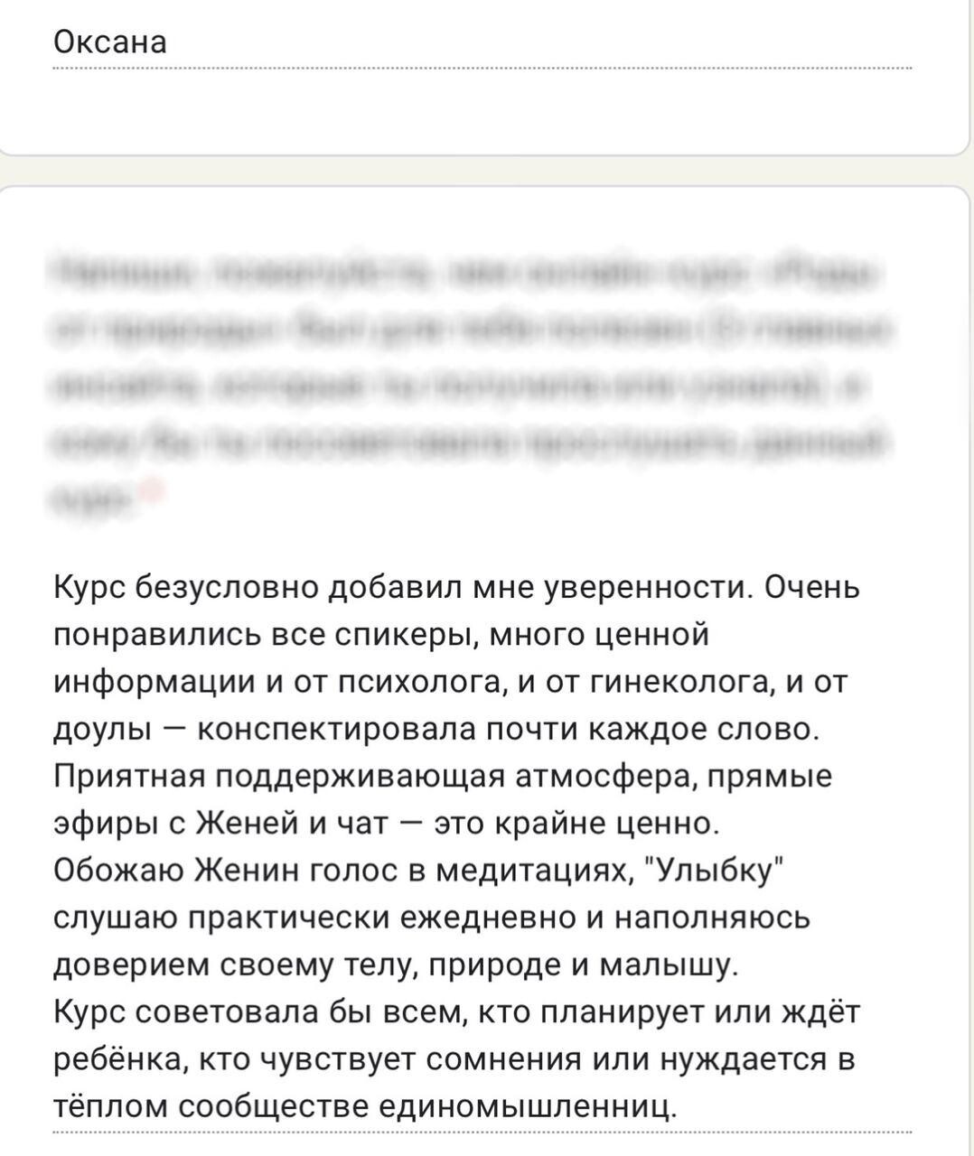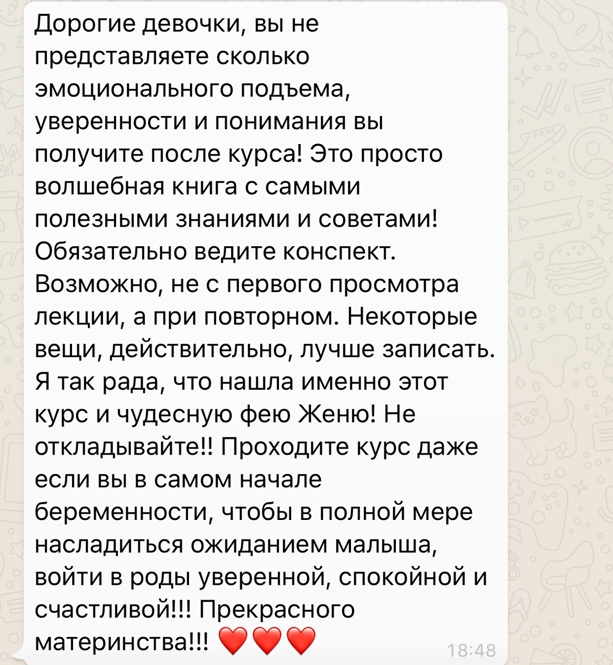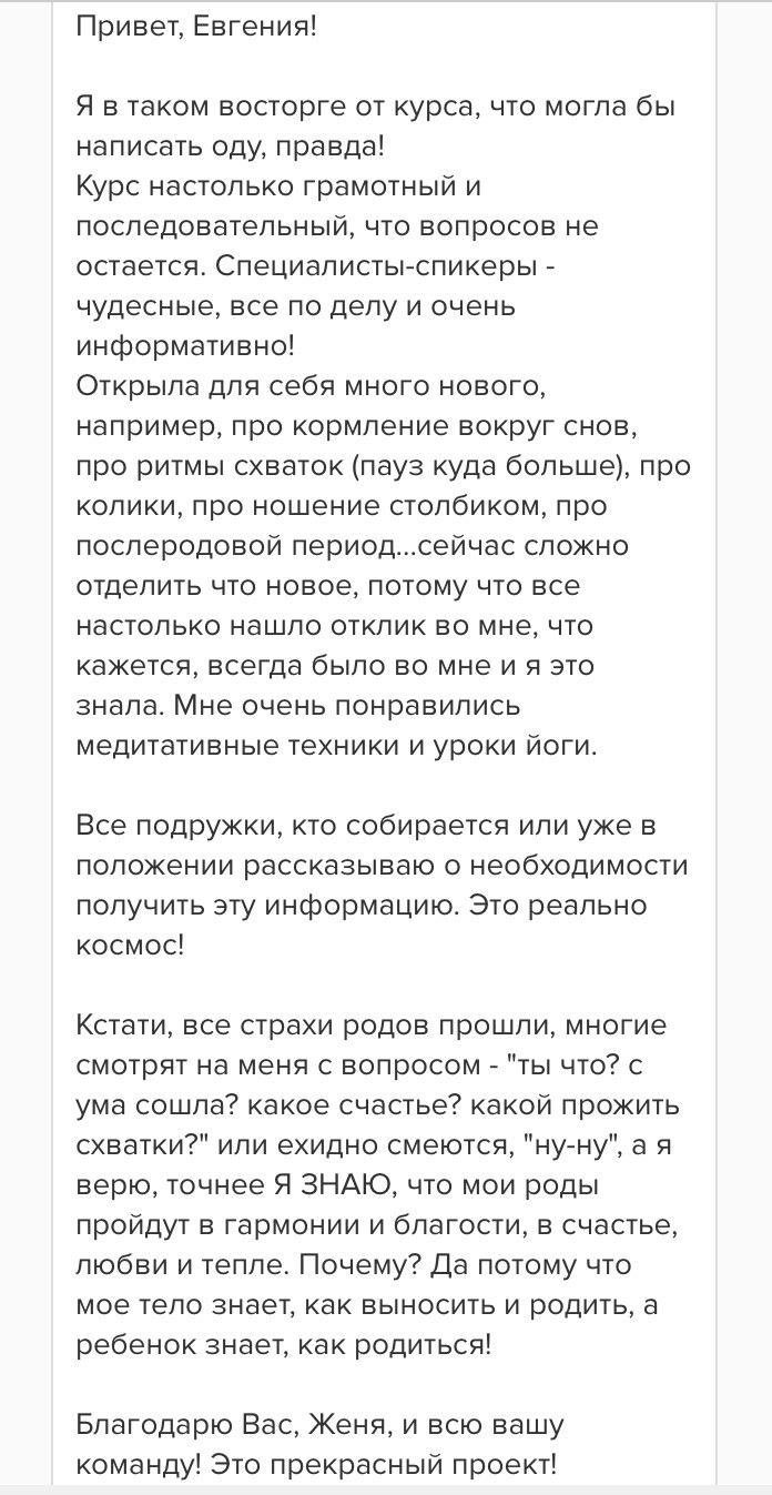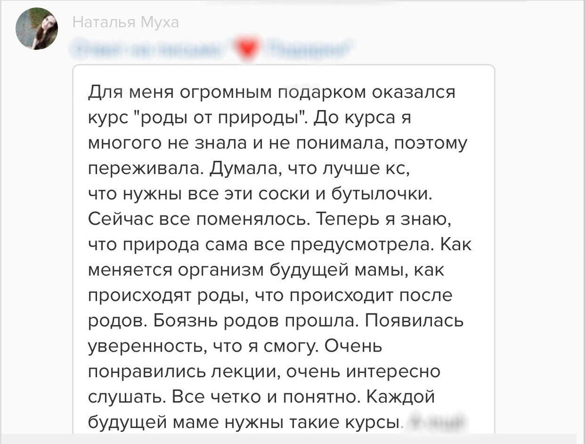 Шикарный курс и подача информации, очень подробные лекции с таааким количеством информации! Отдельная благодарность за прямые эфиры, ты просто заряжаешь уверенностью и спокойствием! Итоги у меня такие - реально ушел страх родов - что пойдет что то не так, попаду в не тот роддом, а как потом? Сейчас есть спокойствие, осознание того, что принимаю любое развитие ситуации, уверенность в себе и своих силах, и ещё не страх, а любопытство и интерес, и я готова к этому путешествию в Роды благодаря тебе и твоему курсу!