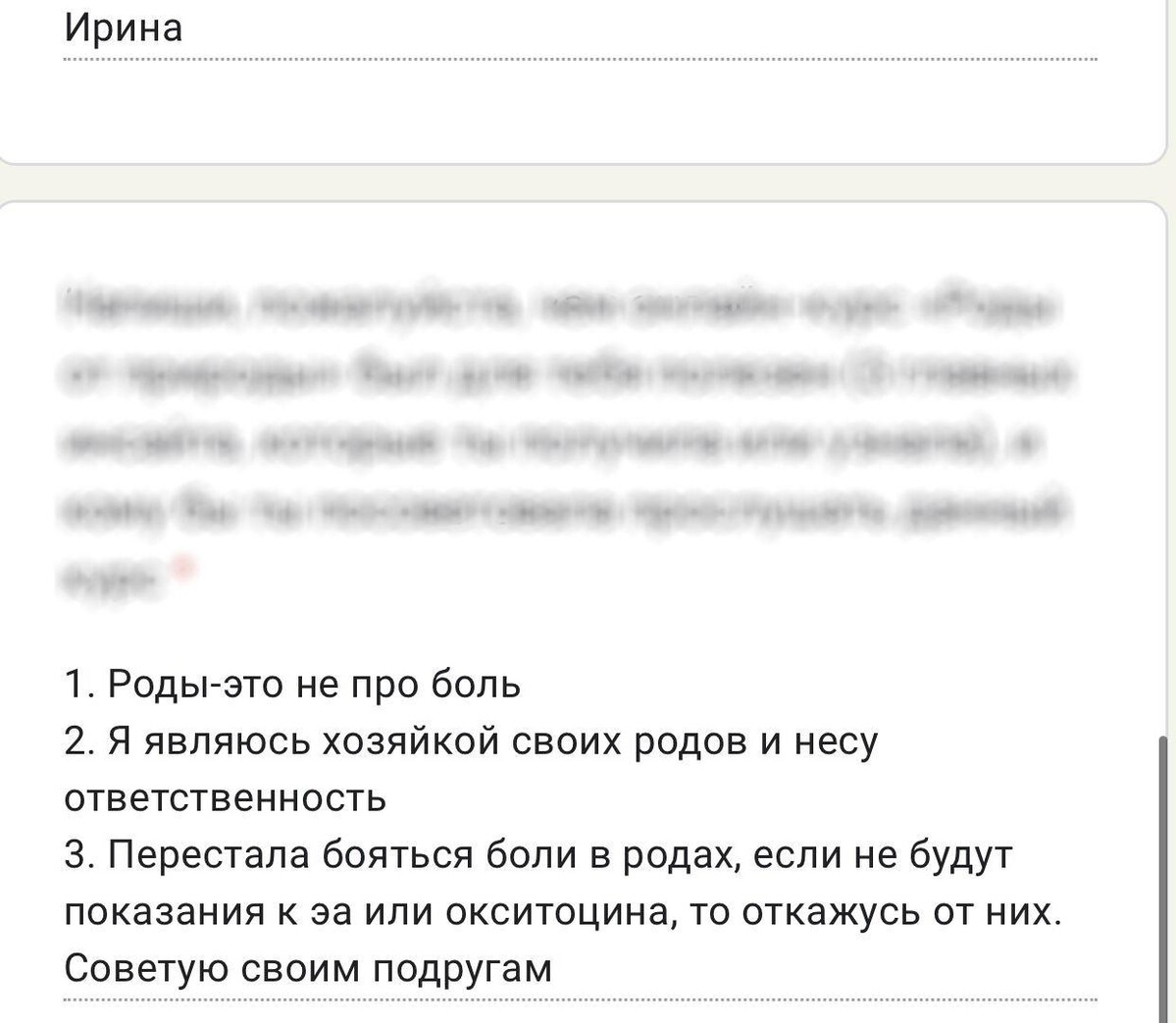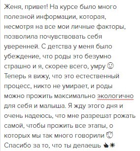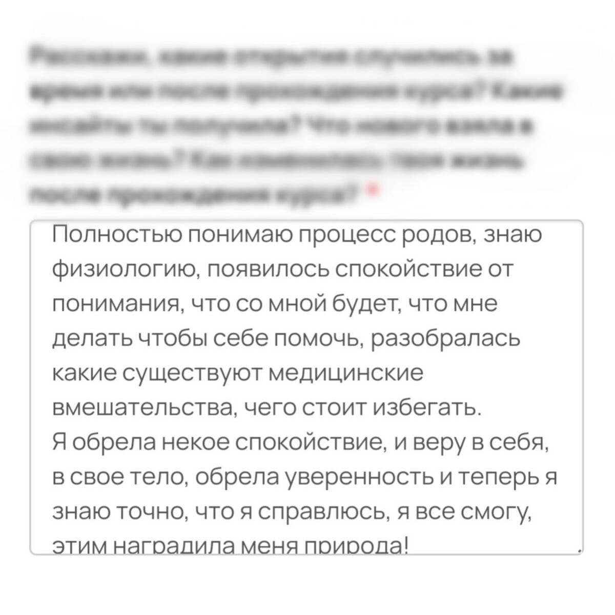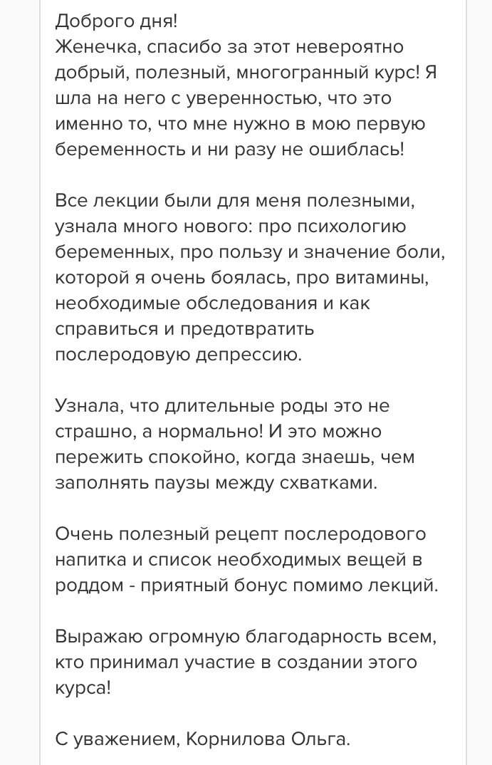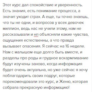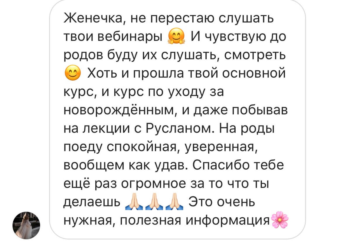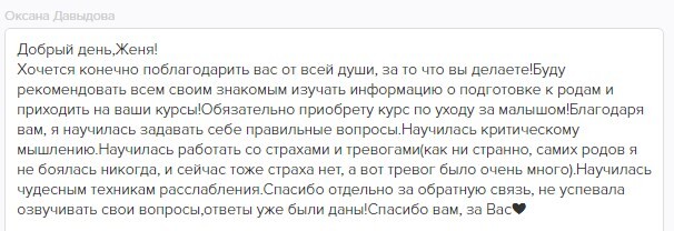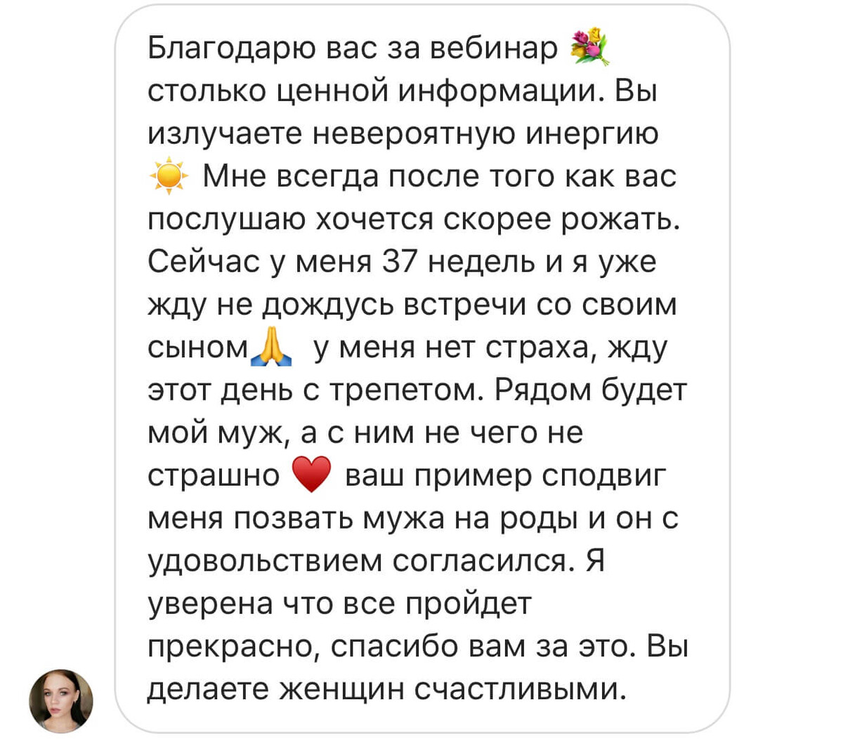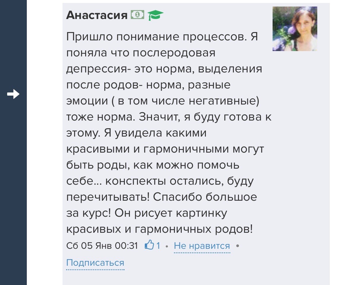 Шикарный курс и подача информации, очень подробные лекции с таааким количеством информации! Отдельная благодарность за прямые эфиры, ты просто заряжаешь уверенностью и спокойствием! Итоги у меня такие - реально ушел страх родов - что пойдет что то не так, попаду в не тот роддом, а как потом? Сейчас есть спокойствие, осознание того, что принимаю любое развитие ситуации, уверенность в себе и своих силах, и ещё не страх, а любопытство и интерес, и я готова к этому путешествию в Роды благодаря тебе и твоему курсу!
