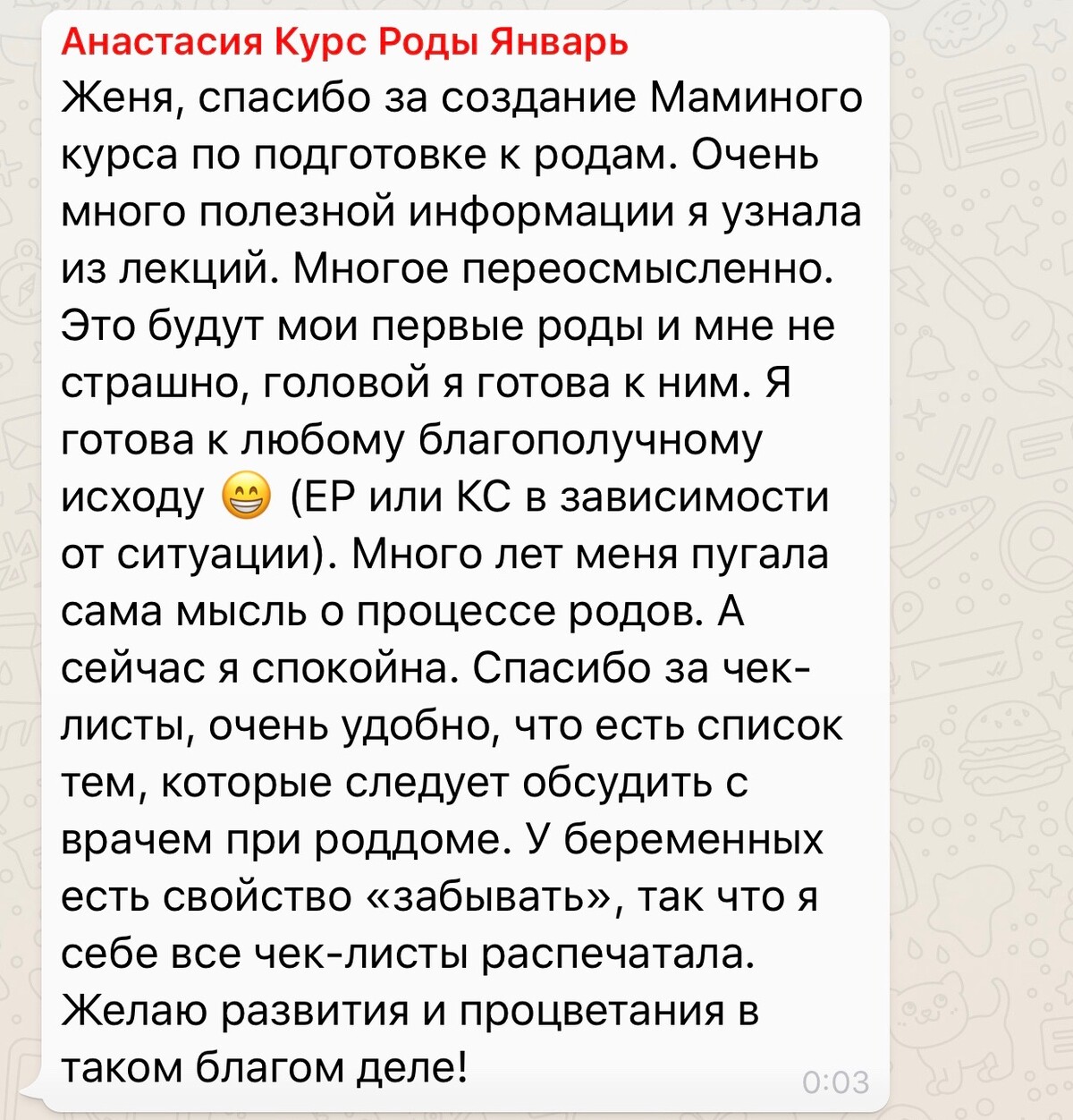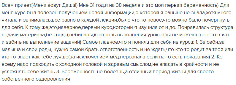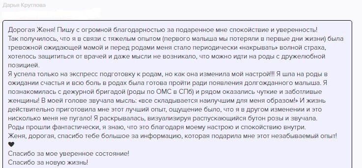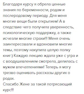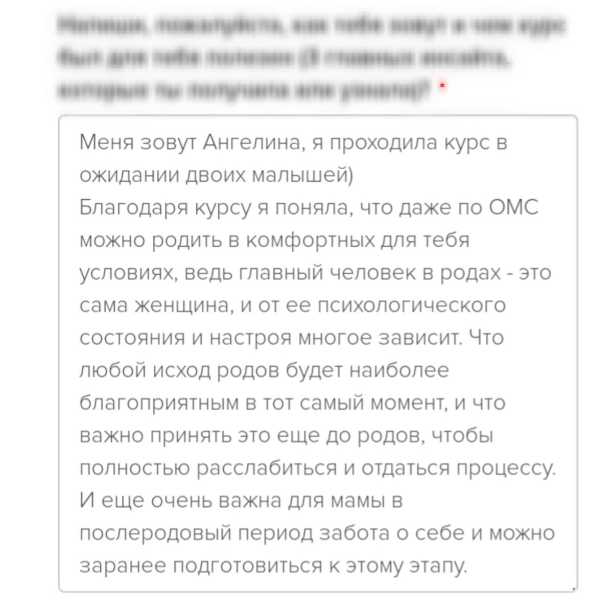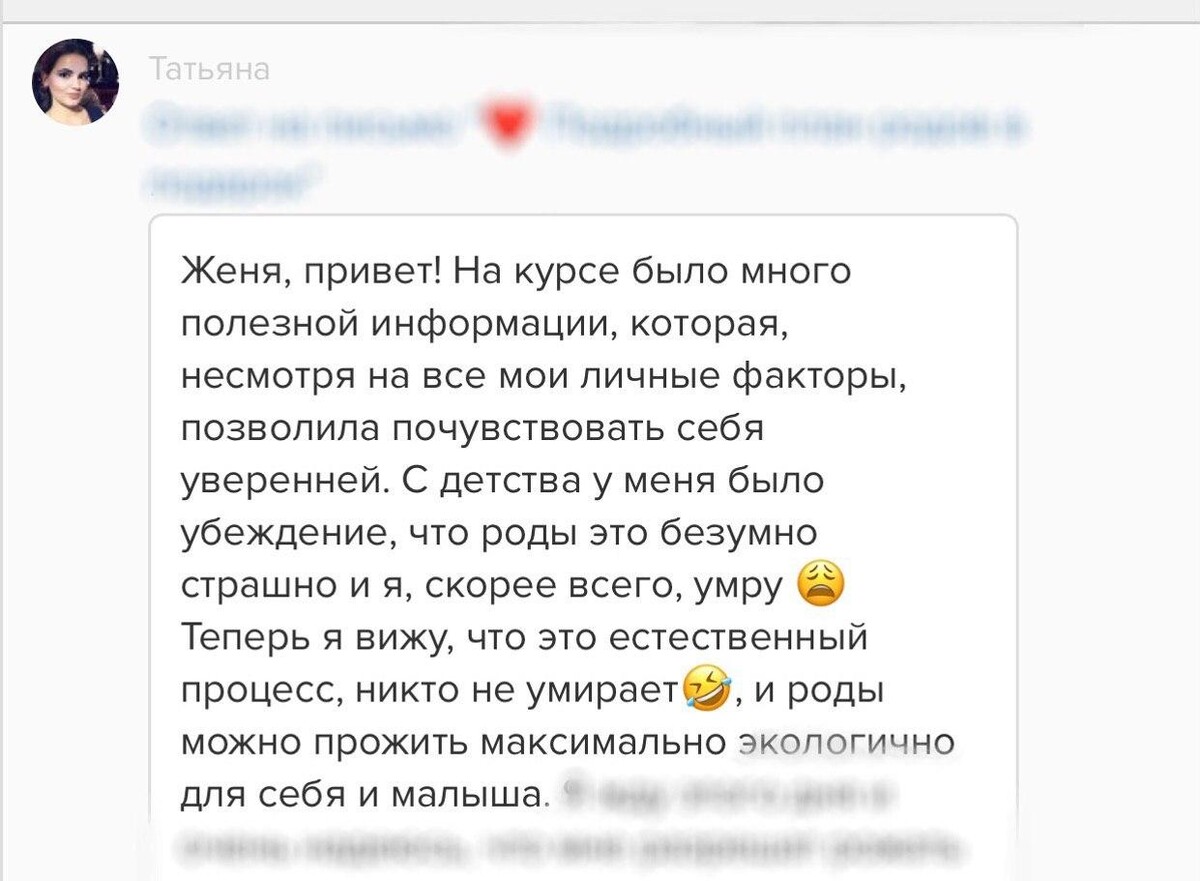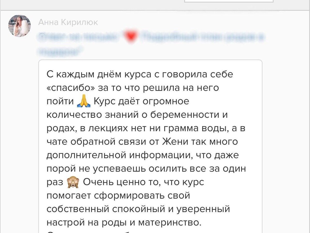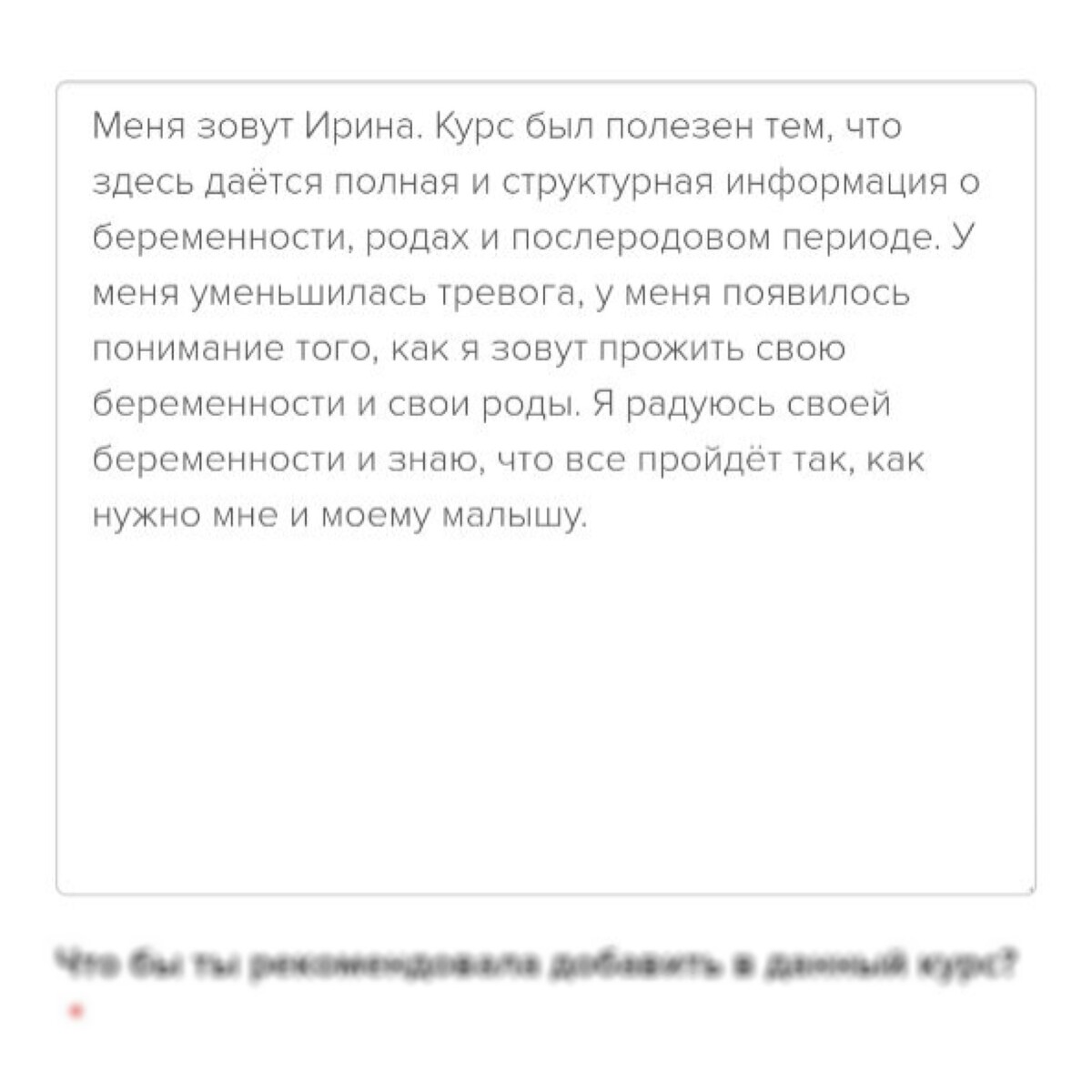 Шикарный курс и подача информации, очень подробные лекции с таааким количеством информации! Отдельная благодарность за прямые эфиры, ты просто заряжаешь уверенностью и спокойствием! Итоги у меня такие - реально ушел страх родов - что пойдет что то не так, попаду в не тот роддом, а как потом? Сейчас есть спокойствие, осознание того, что принимаю любое развитие ситуации, уверенность в себе и своих силах, и ещё не страх, а любопытство и интерес, и я готова к этому путешествию в Роды благодаря тебе и твоему курсу!
