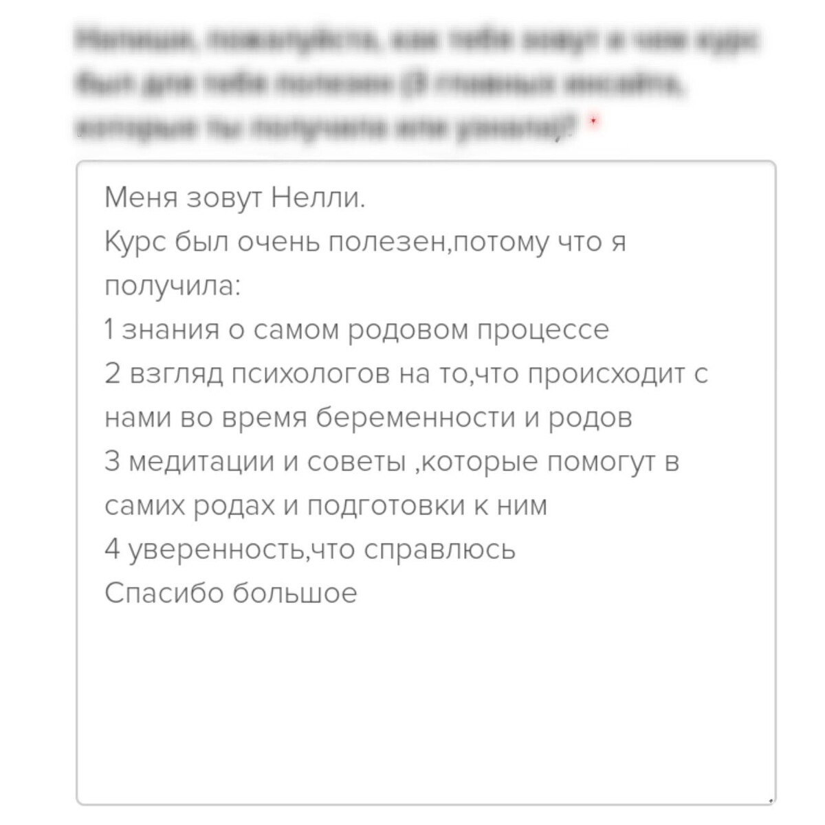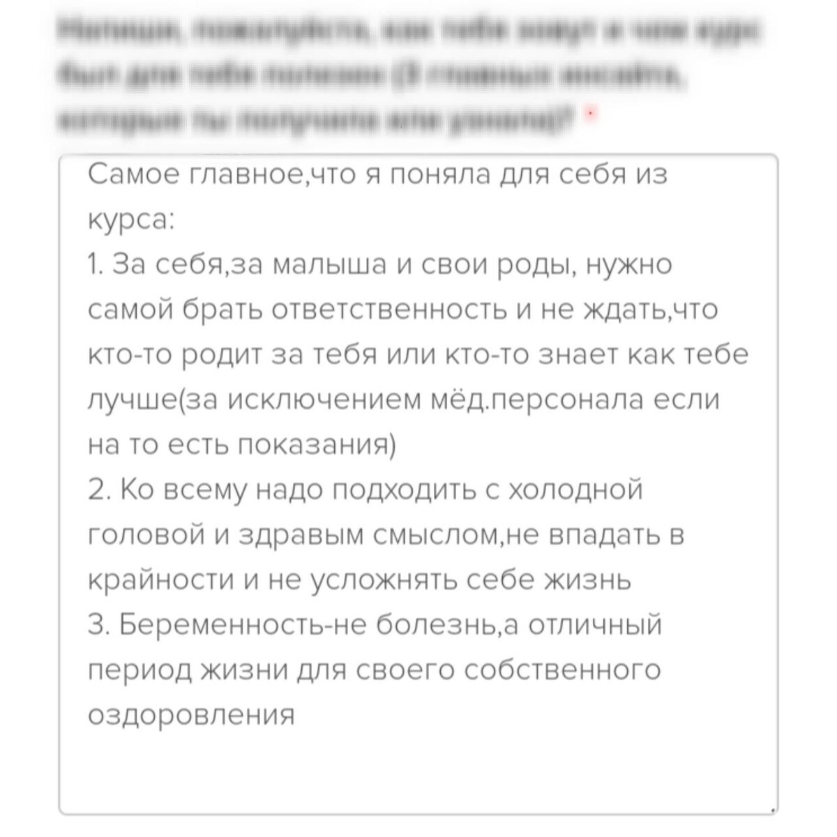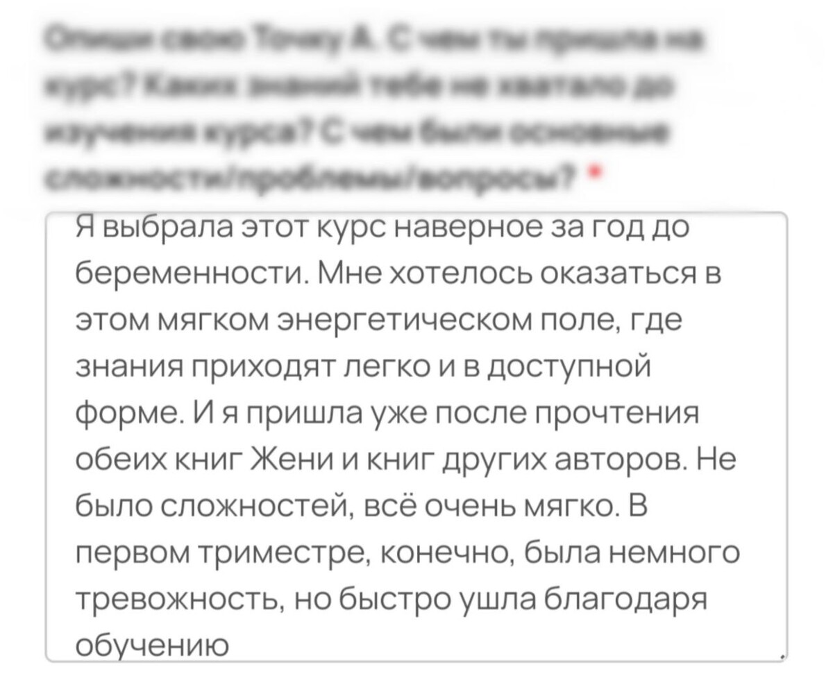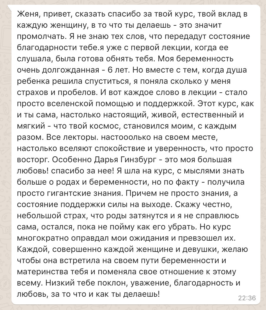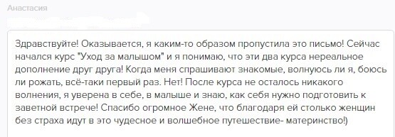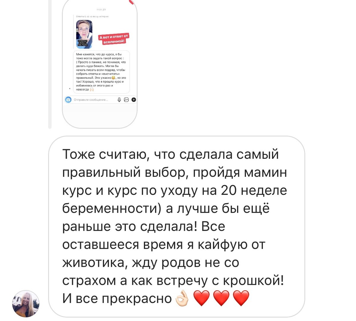 Шикарный курс и подача информации, очень подробные лекции с таааким количеством информации! Отдельная благодарность за прямые эфиры, ты просто заряжаешь уверенностью и спокойствием! Итоги у меня такие - реально ушел страх родов - что пойдет что то не так, попаду в не тот роддом, а как потом? Сейчас есть спокойствие, осознание того, что принимаю любое развитие ситуации, уверенность в себе и своих силах, и ещё не страх, а любопытство и интерес, и я готова к этому путешествию в Роды благодаря тебе и твоему курсу!