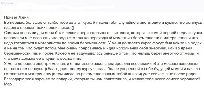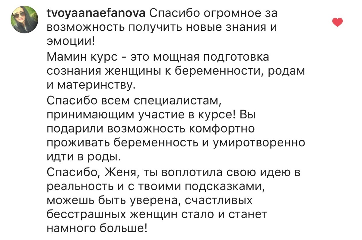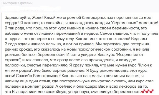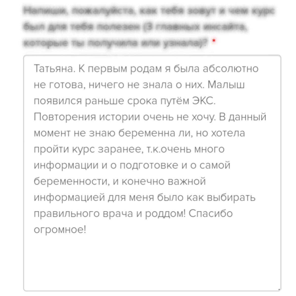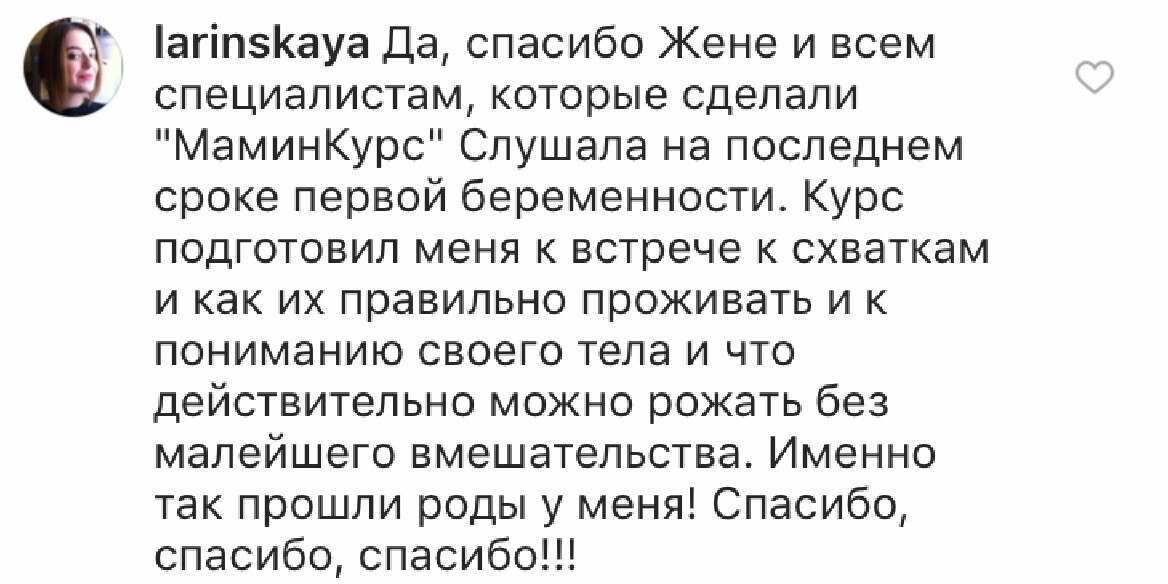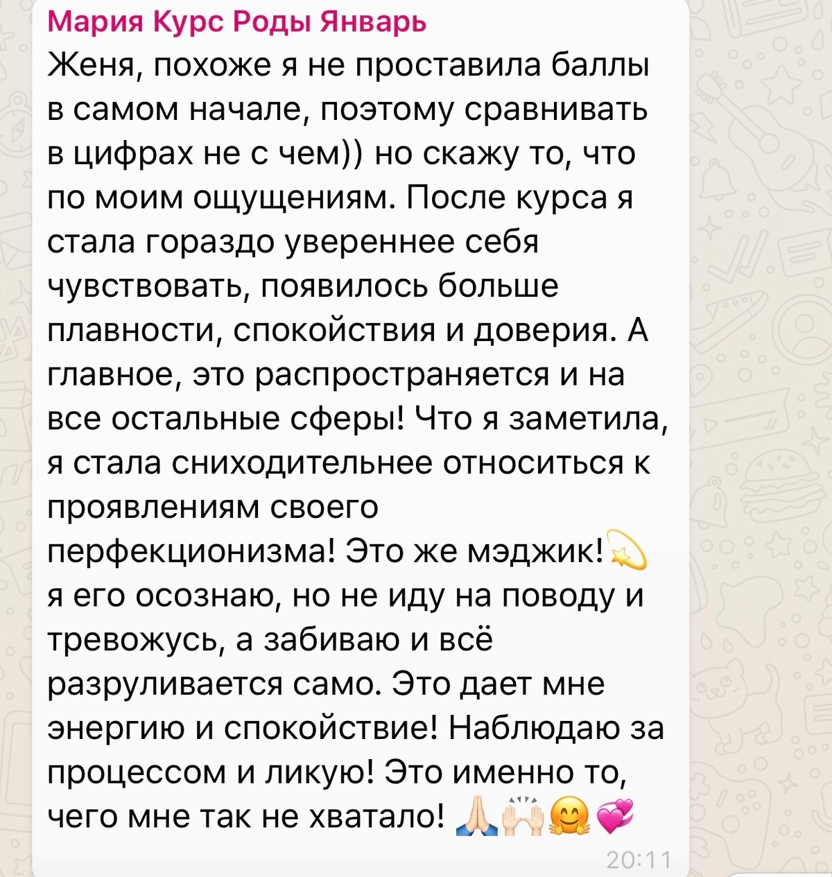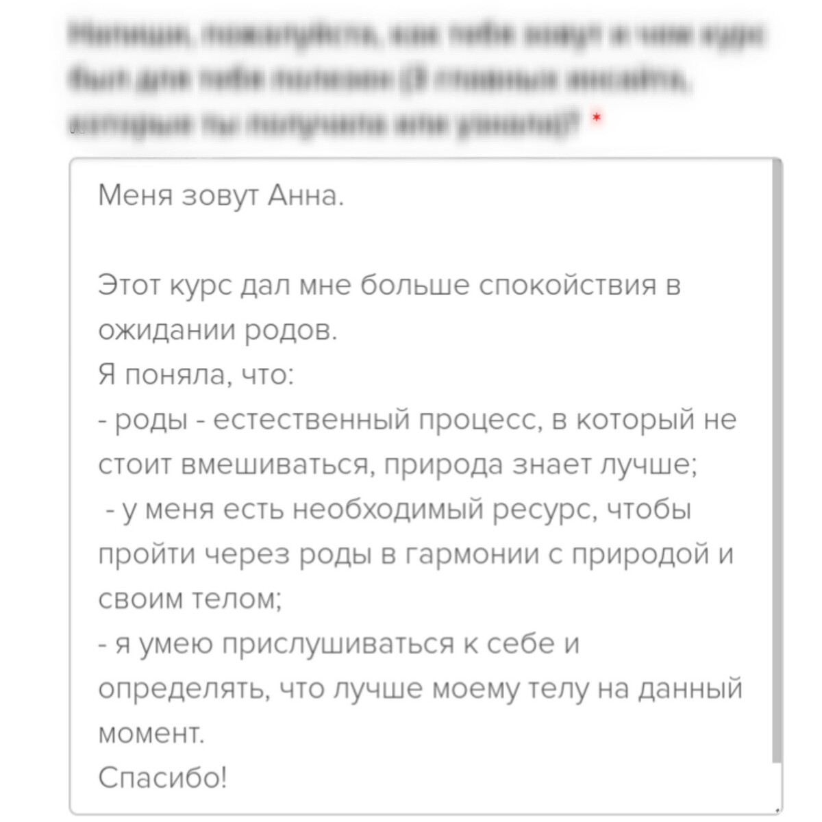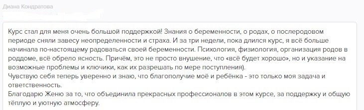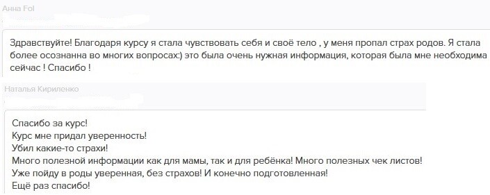 Шикарный курс и подача информации, очень подробные лекции с таааким количеством информации! Отдельная благодарность за прямые эфиры, ты просто заряжаешь уверенностью и спокойствием! Итоги у меня такие - реально ушел страх родов - что пойдет что то не так, попаду в не тот роддом, а как потом? Сейчас есть спокойствие, осознание того, что принимаю любое развитие ситуации, уверенность в себе и своих силах, и ещё не страх, а любопытство и интерес, и я готова к этому путешествию в Роды благодаря тебе и твоему курсу!