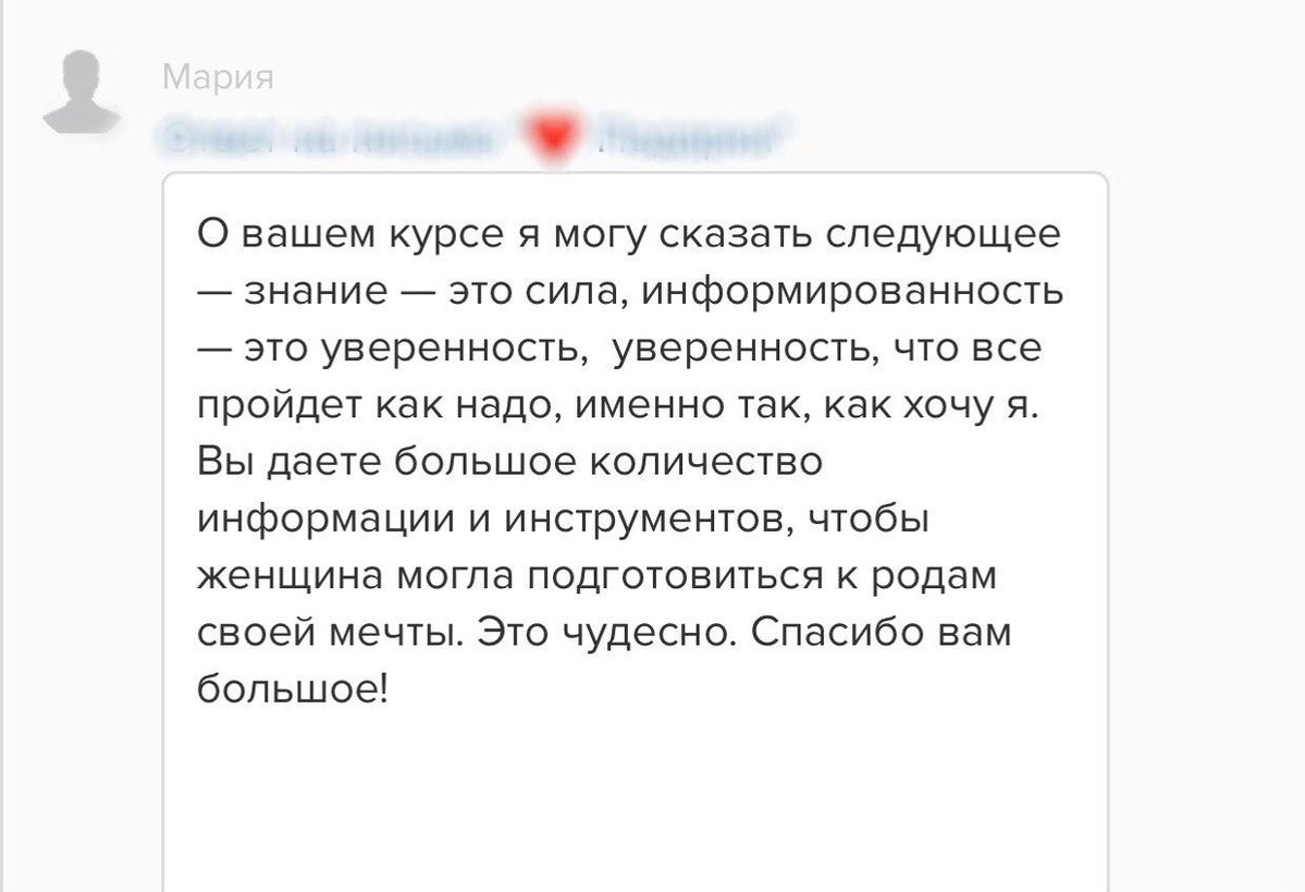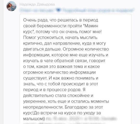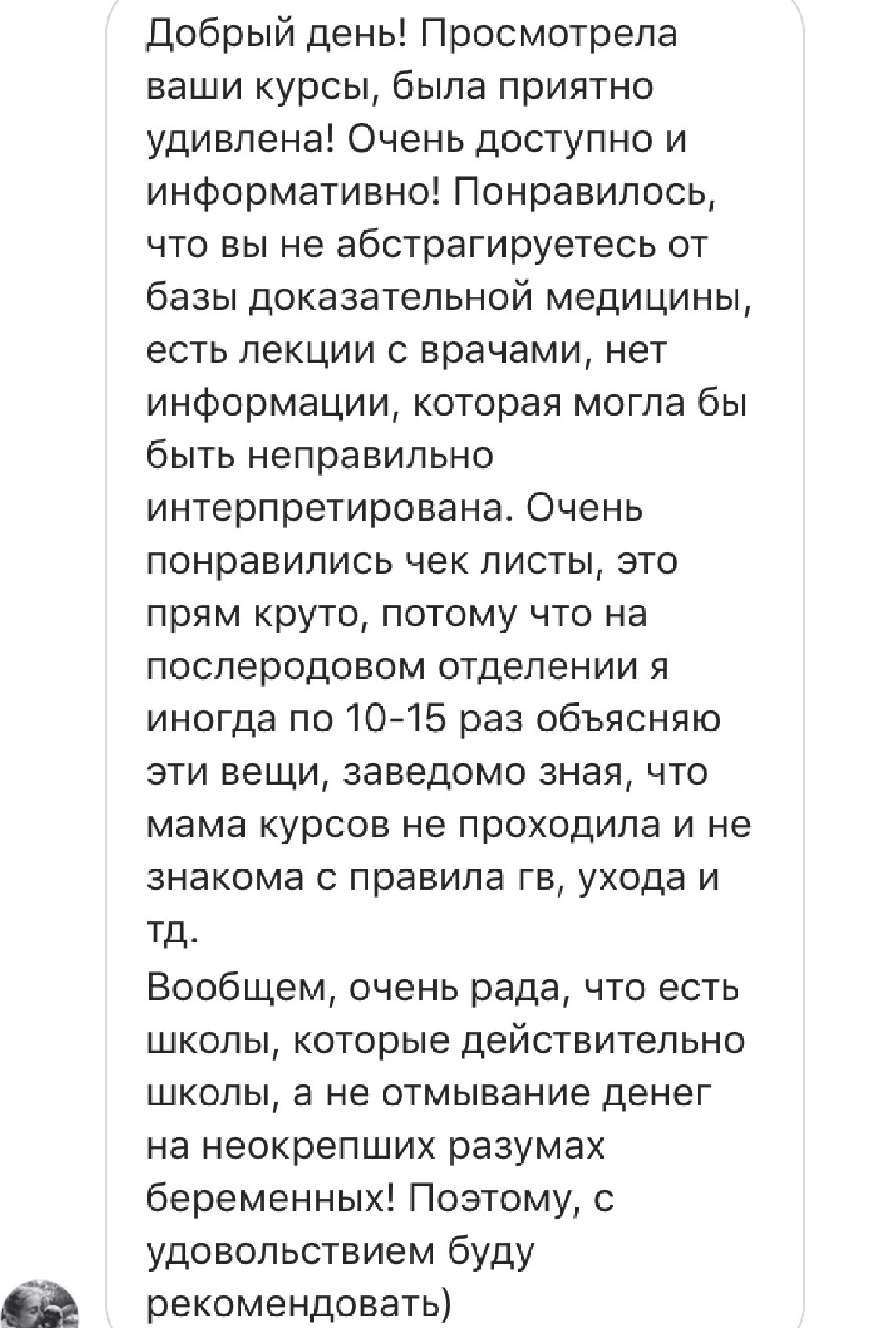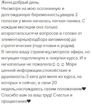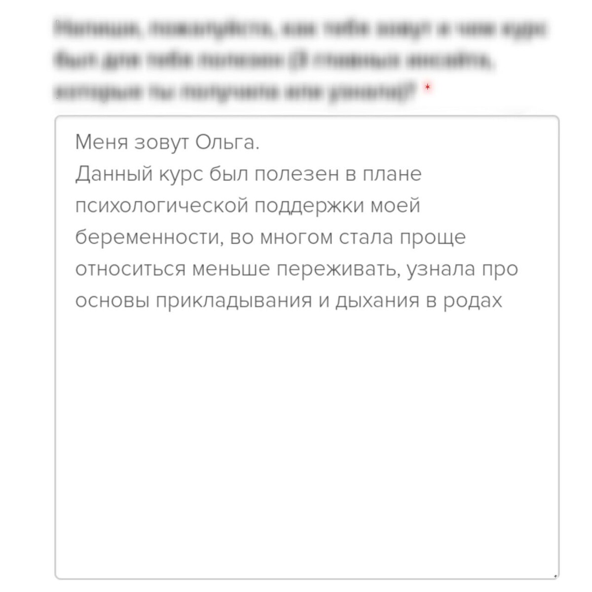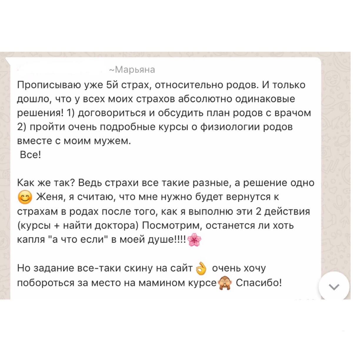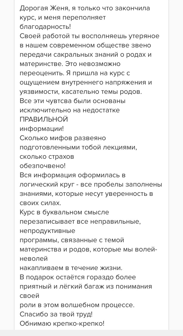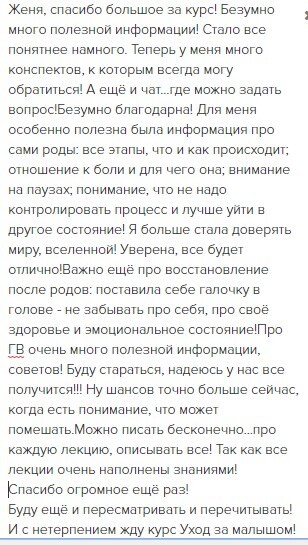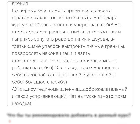 Шикарный курс и подача информации, очень подробные лекции с таааким количеством информации! Отдельная благодарность за прямые эфиры, ты просто заряжаешь уверенностью и спокойствием! Итоги у меня такие - реально ушел страх родов - что пойдет что то не так, попаду в не тот роддом, а как потом? Сейчас есть спокойствие, осознание того, что принимаю любое развитие ситуации, уверенность в себе и своих силах, и ещё не страх, а любопытство и интерес, и я готова к этому путешествию в Роды благодаря тебе и твоему курсу!