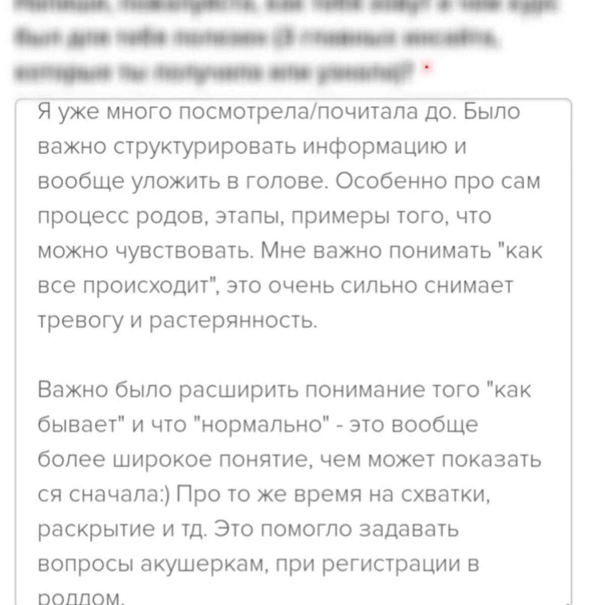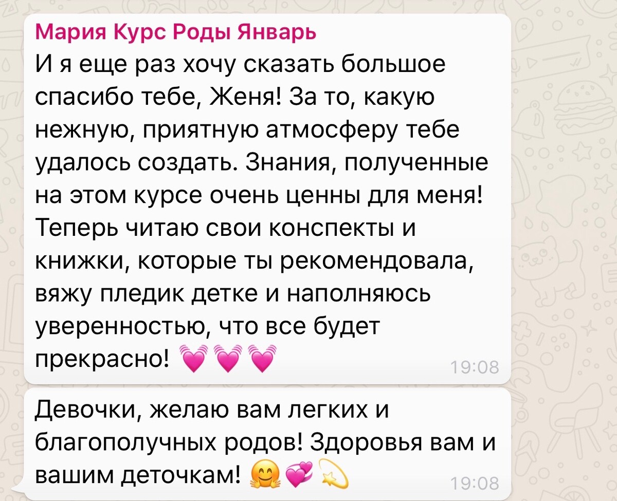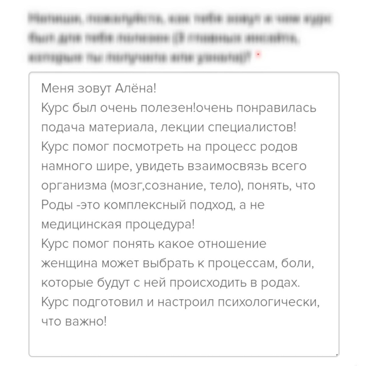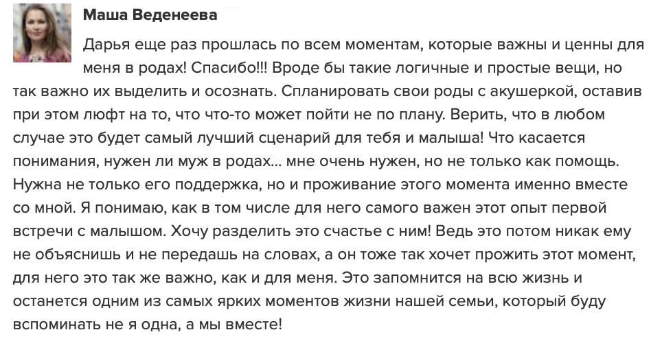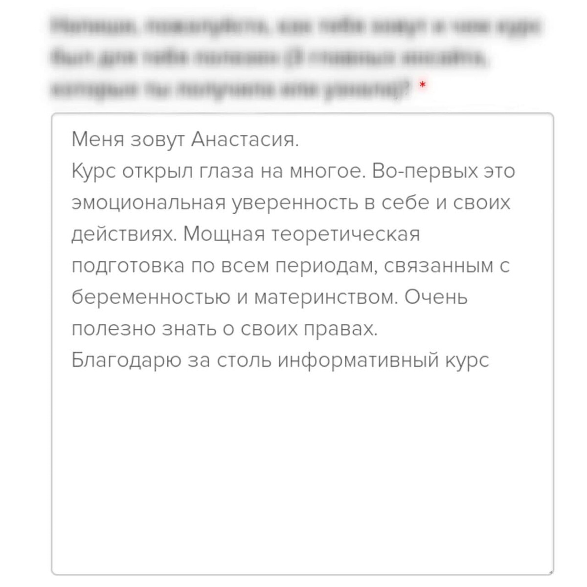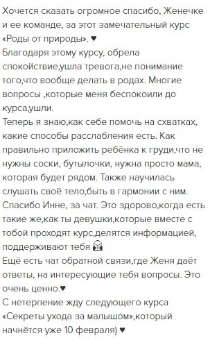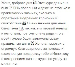 Шикарный курс и подача информации, очень подробные лекции с таааким количеством информации! Отдельная благодарность за прямые эфиры, ты просто заряжаешь уверенностью и спокойствием! Итоги у меня такие - реально ушел страх родов - что пойдет что то не так, попаду в не тот роддом, а как потом? Сейчас есть спокойствие, осознание того, что принимаю любое развитие ситуации, уверенность в себе и своих силах, и ещё не страх, а любопытство и интерес, и я готова к этому путешествию в Роды благодаря тебе и твоему курсу!