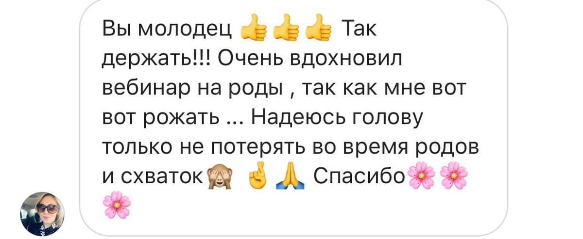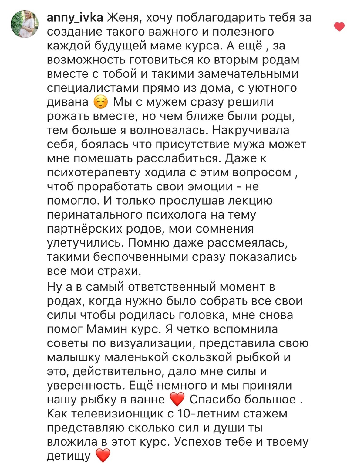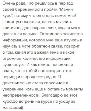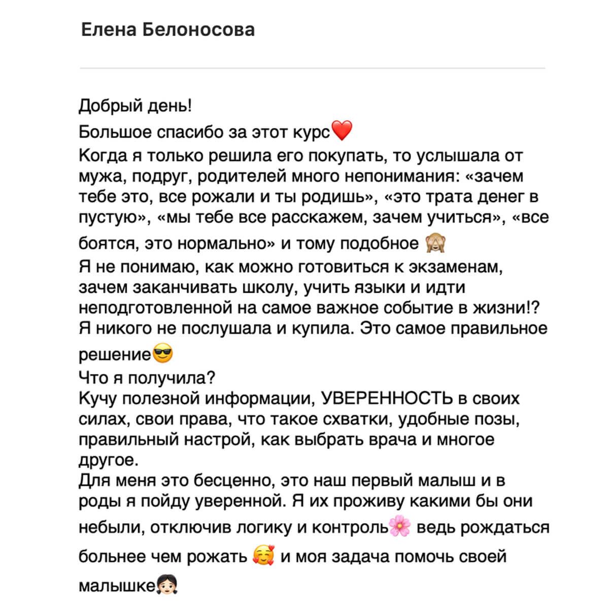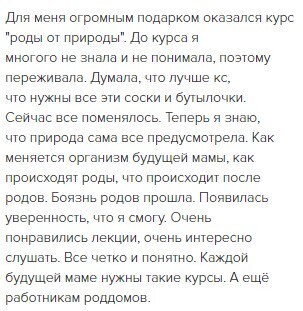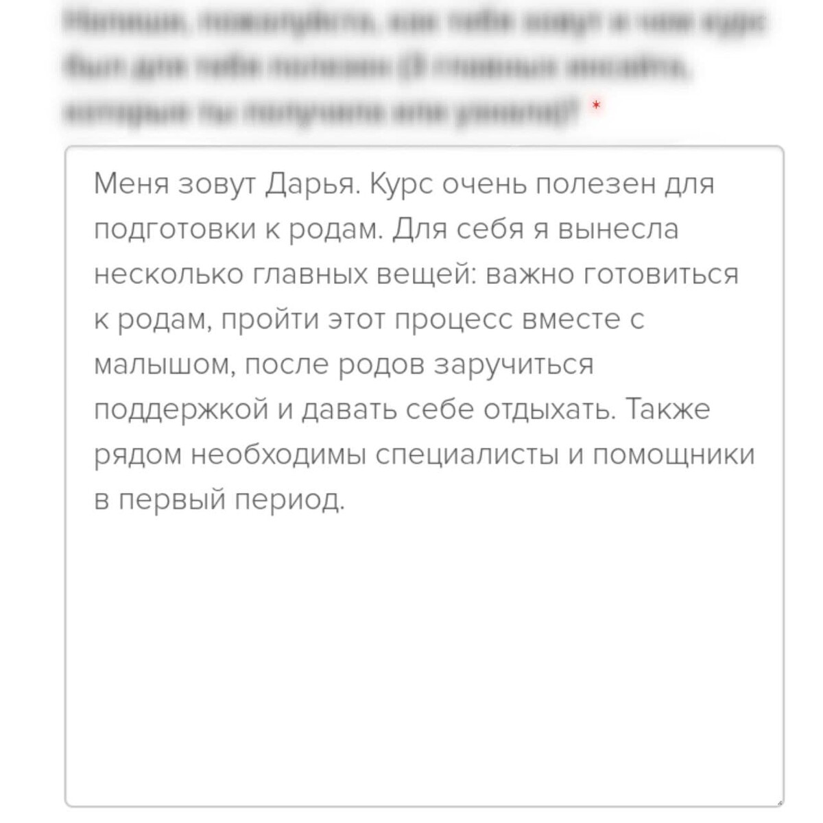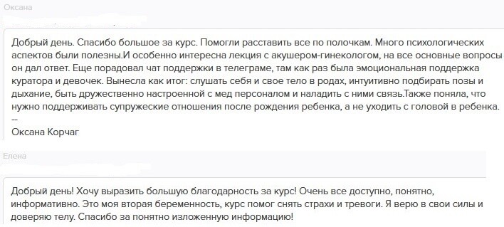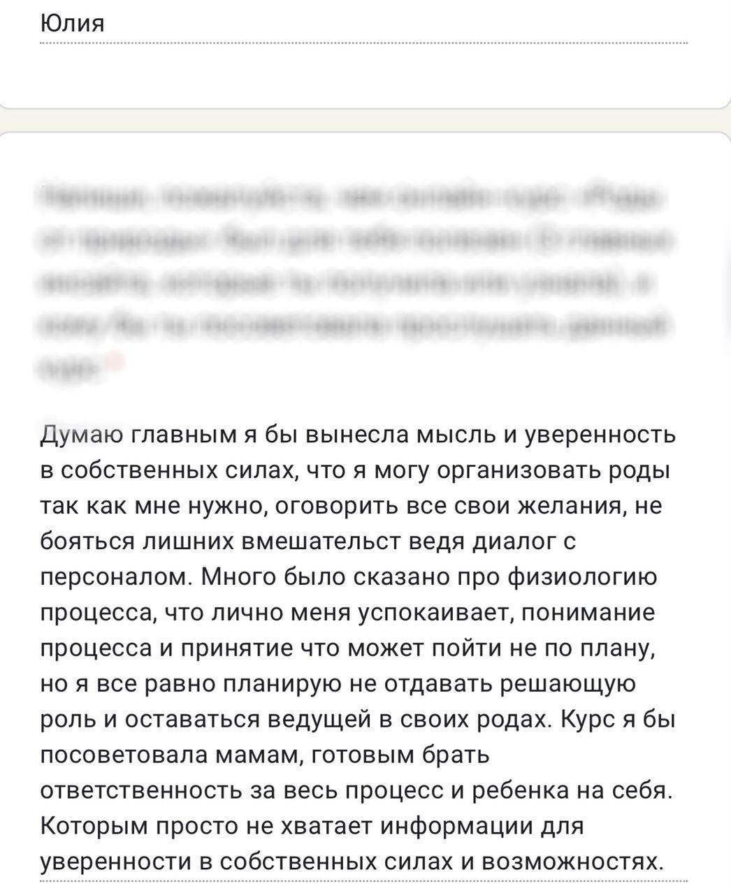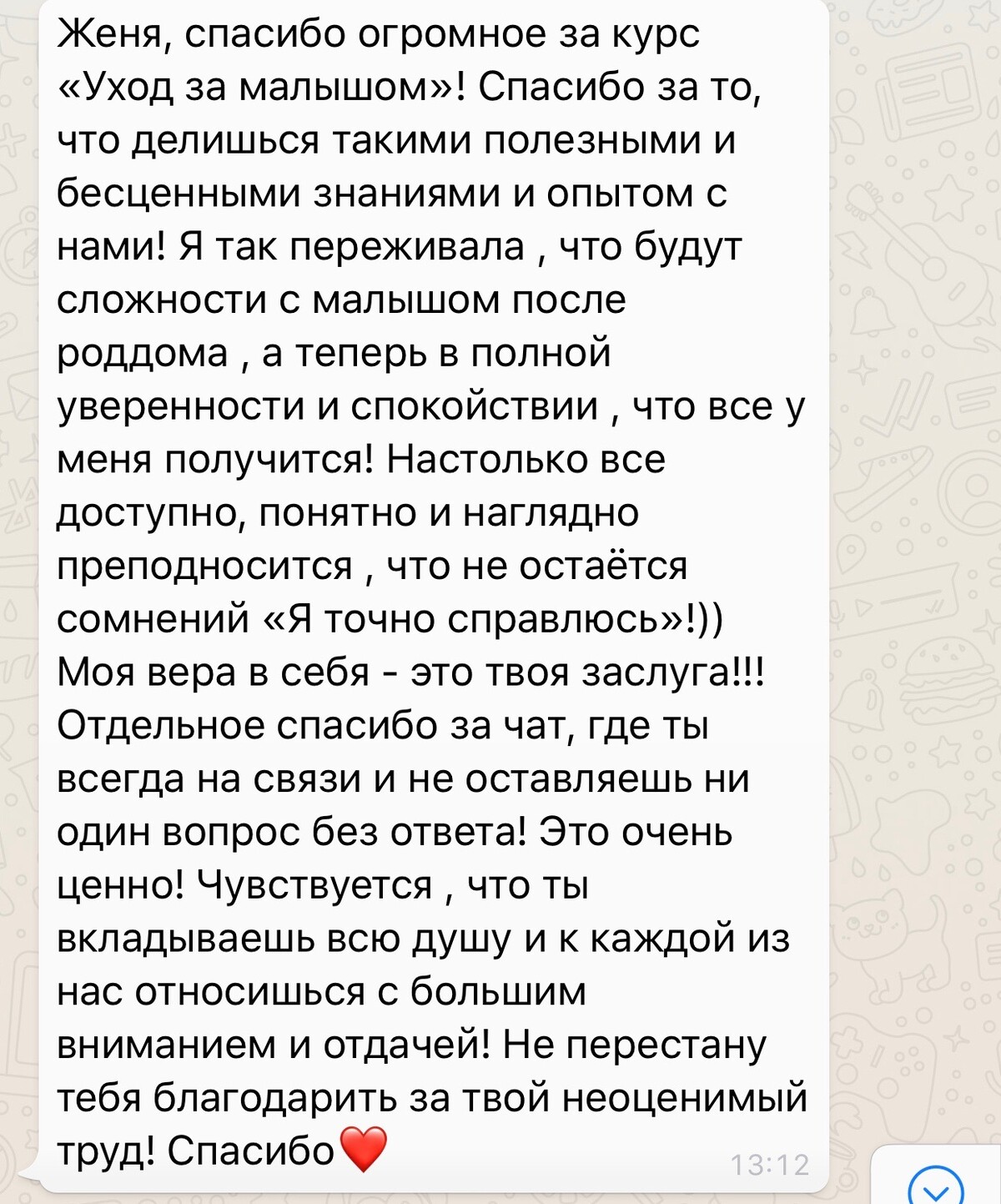 Шикарный курс и подача информации, очень подробные лекции с таааким количеством информации! Отдельная благодарность за прямые эфиры, ты просто заряжаешь уверенностью и спокойствием! Итоги у меня такие - реально ушел страх родов - что пойдет что то не так, попаду в не тот роддом, а как потом? Сейчас есть спокойствие, осознание того, что принимаю любое развитие ситуации, уверенность в себе и своих силах, и ещё не страх, а любопытство и интерес, и я готова к этому путешествию в Роды благодаря тебе и твоему курсу!