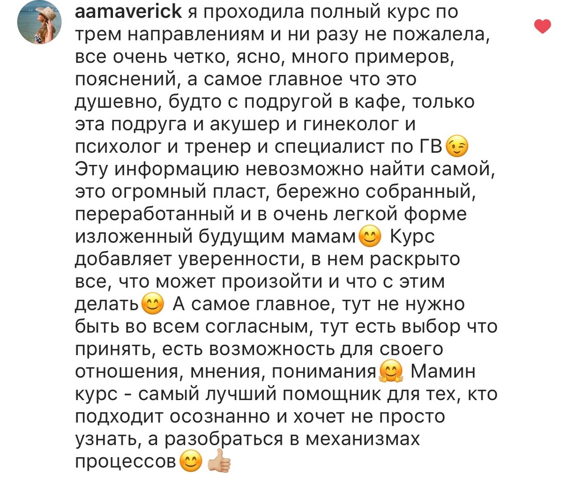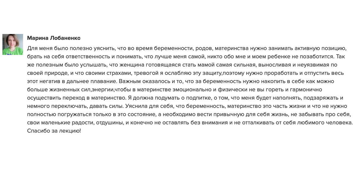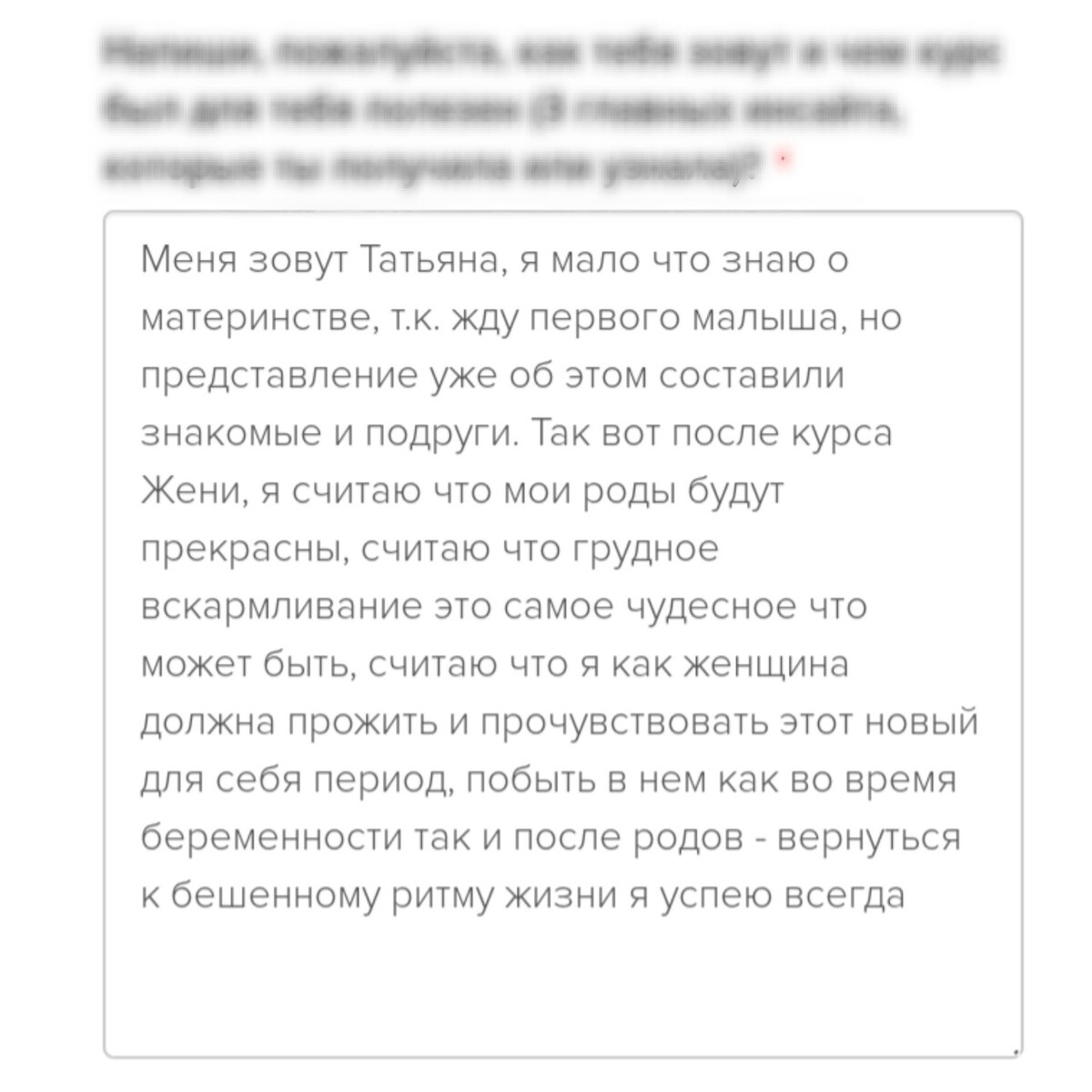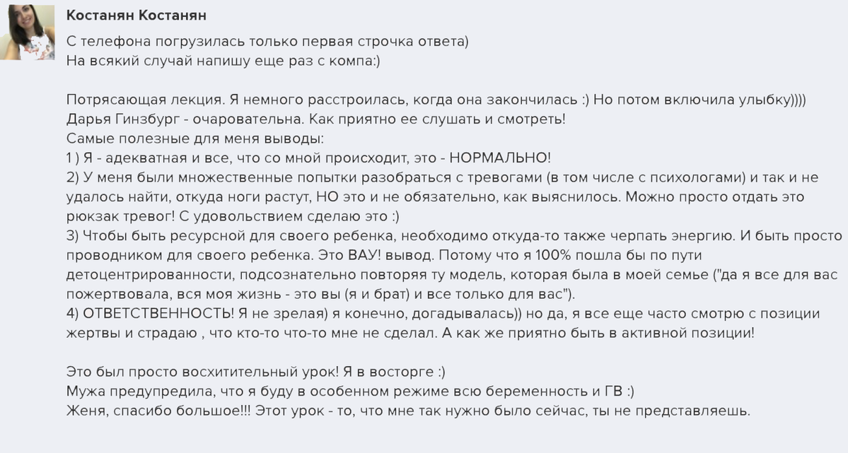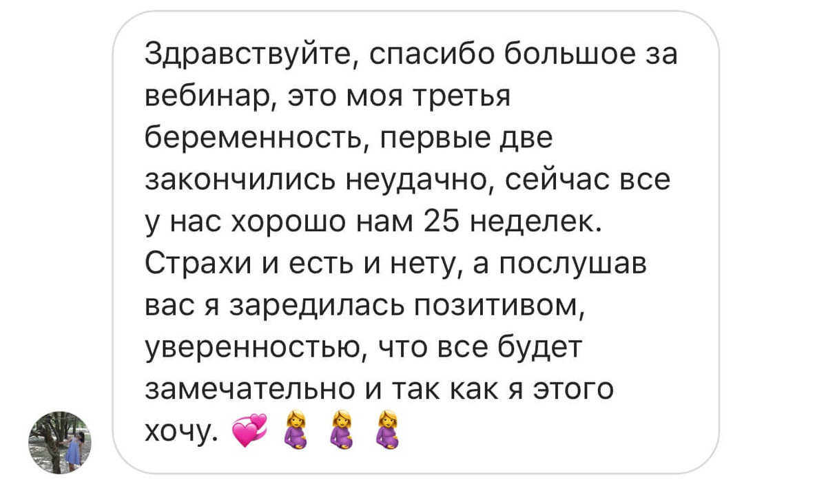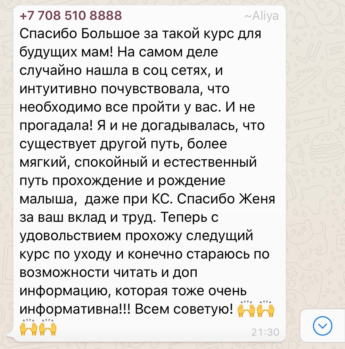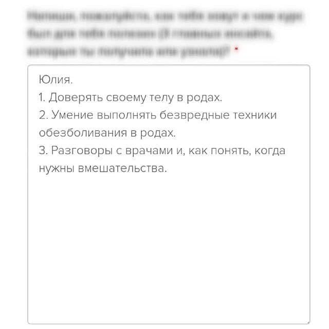 Шикарный курс и подача информации, очень подробные лекции с таааким количеством информации! Отдельная благодарность за прямые эфиры, ты просто заряжаешь уверенностью и спокойствием! Итоги у меня такие - реально ушел страх родов - что пойдет что то не так, попаду в не тот роддом, а как потом? Сейчас есть спокойствие, осознание того, что принимаю любое развитие ситуации, уверенность в себе и своих силах, и ещё не страх, а любопытство и интерес, и я готова к этому путешествию в Роды благодаря тебе и твоему курсу!