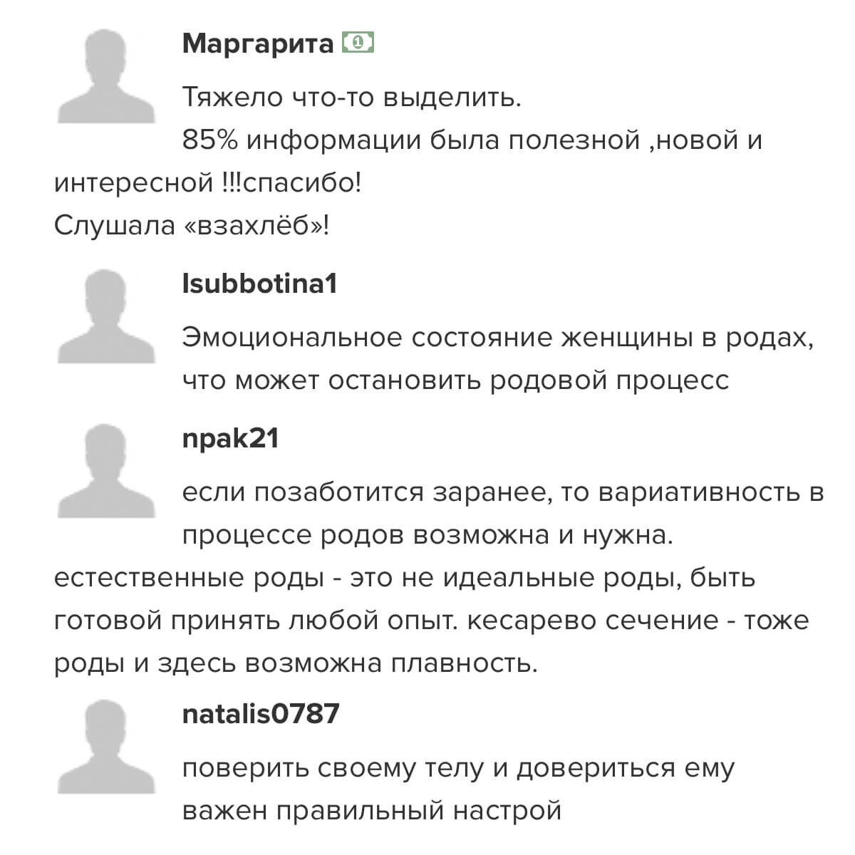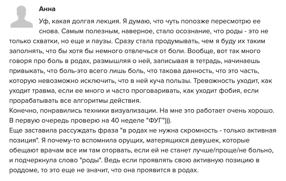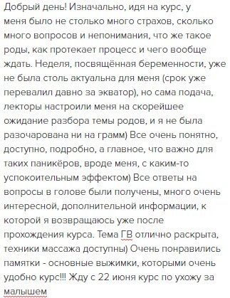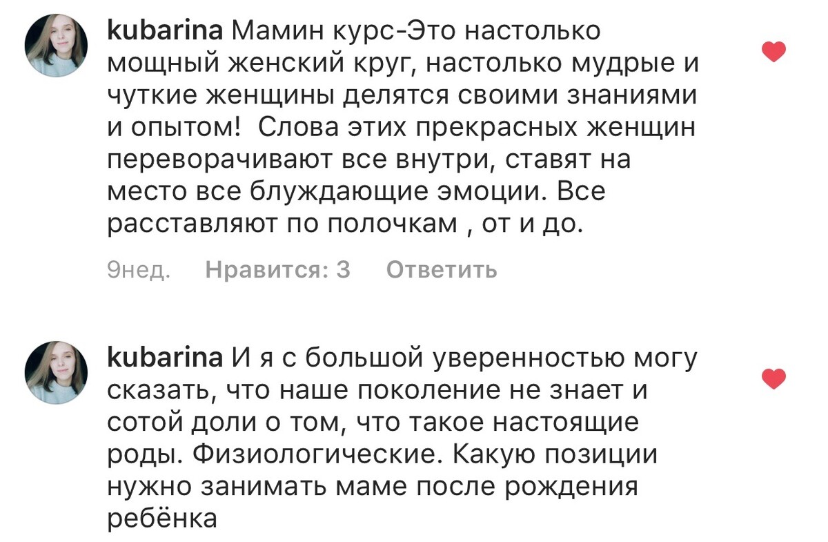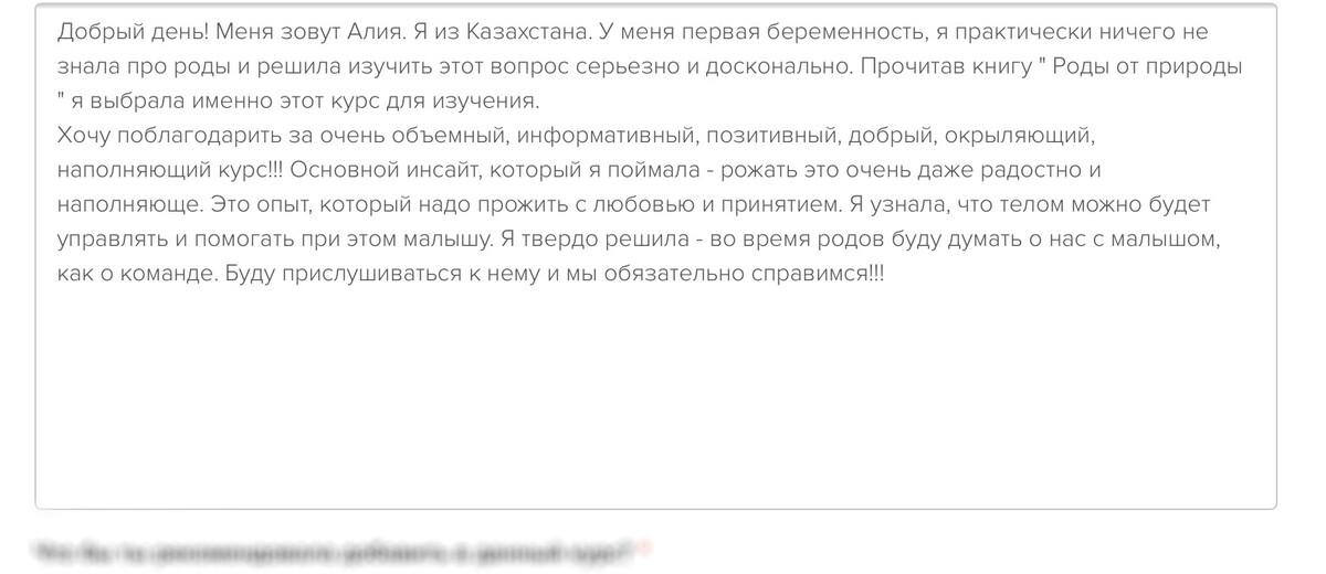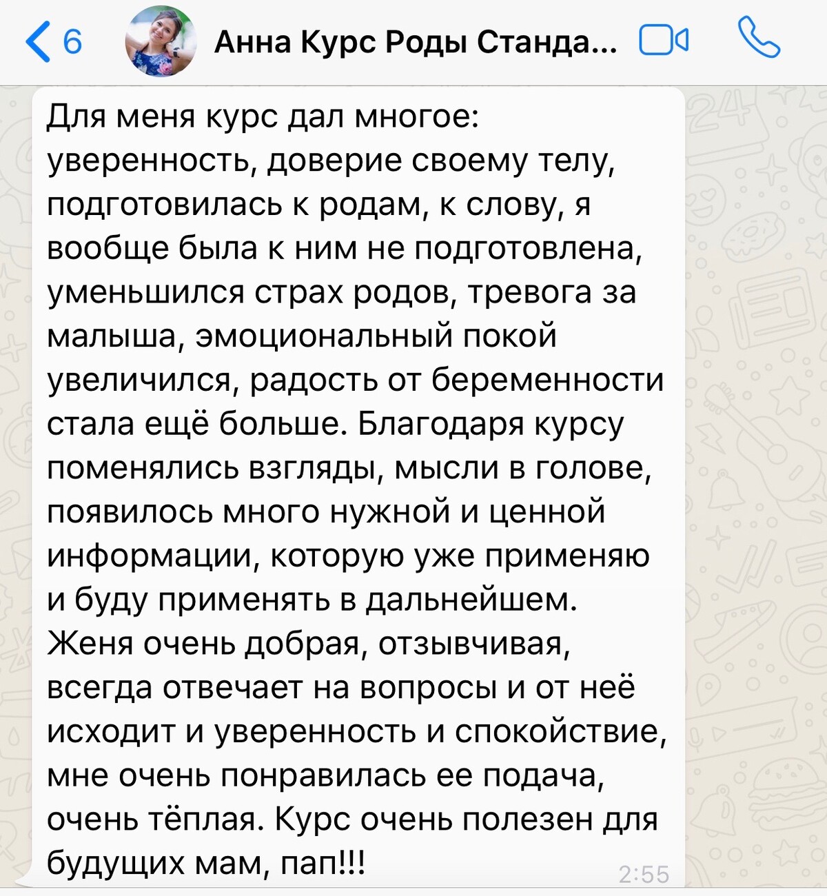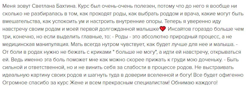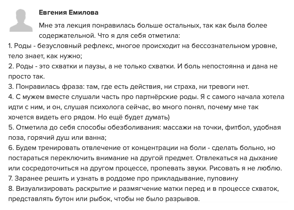Шикарный курс и подача информации, очень подробные лекции с таааким количеством информации! Отдельная благодарность за прямые эфиры, ты просто заряжаешь уверенностью и спокойствием! Итоги у меня такие - реально ушел страх родов - что пойдет что то не так, попаду в не тот роддом, а как потом? Сейчас есть спокойствие, осознание того, что принимаю любое развитие ситуации, уверенность в себе и своих силах, и ещё не страх, а любопытство и интерес, и я готова к этому путешествию в Роды благодаря тебе и твоему курсу!
