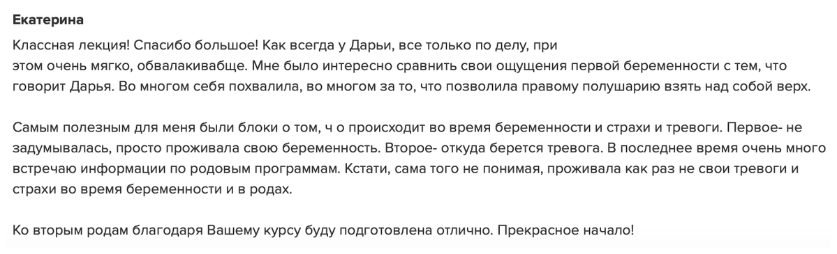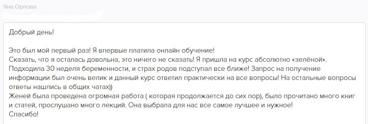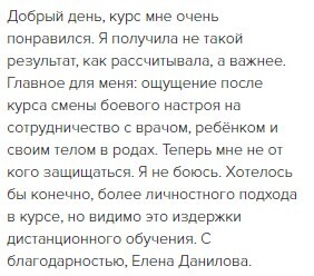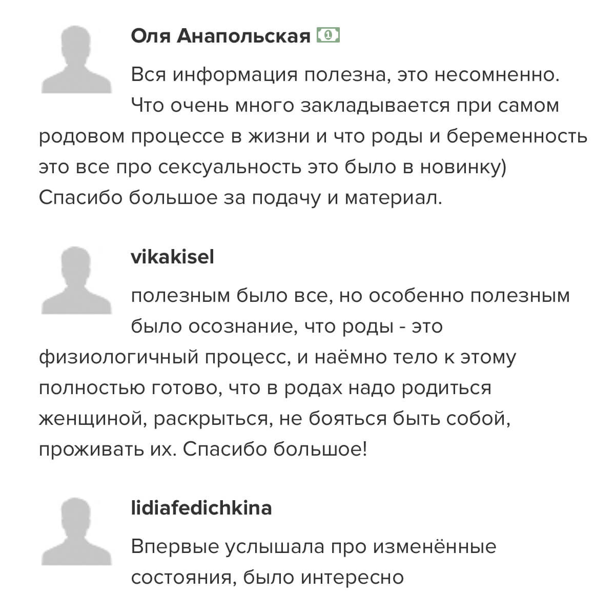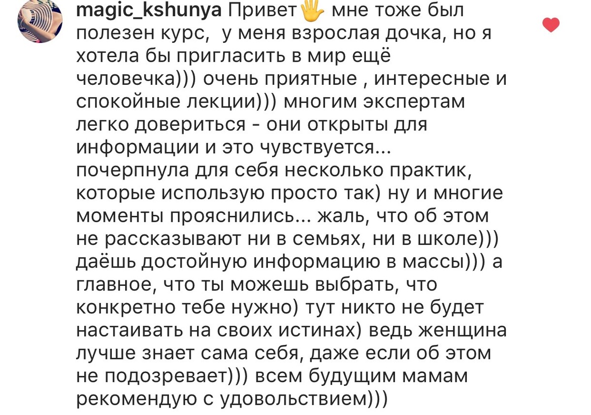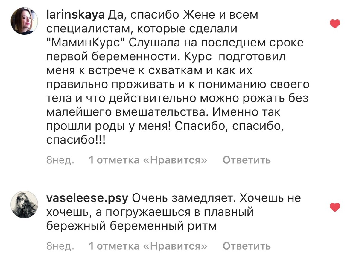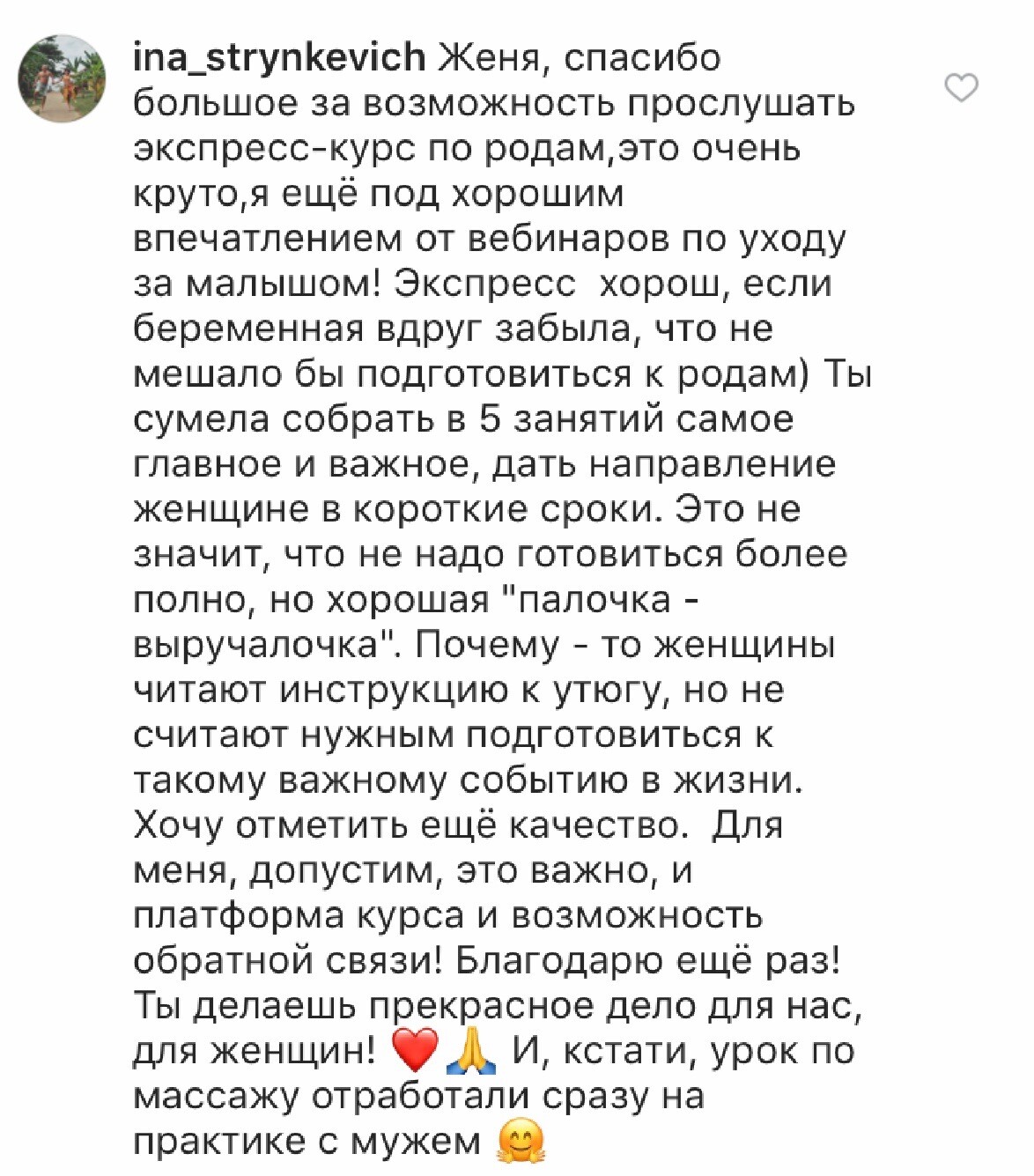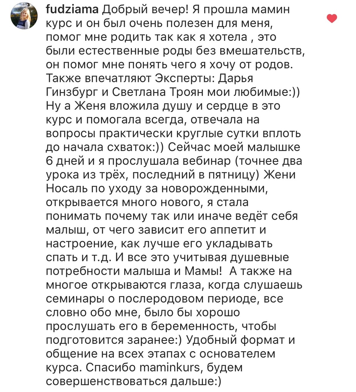Шикарный курс и подача информации, очень подробные лекции с таааким количеством информации! Отдельная благодарность за прямые эфиры, ты просто заряжаешь уверенностью и спокойствием! Итоги у меня такие - реально ушел страх родов - что пойдет что то не так, попаду в не тот роддом, а как потом? Сейчас есть спокойствие, осознание того, что принимаю любое развитие ситуации, уверенность в себе и своих силах, и ещё не страх, а любопытство и интерес, и я готова к этому путешествию в Роды благодаря тебе и твоему курсу!