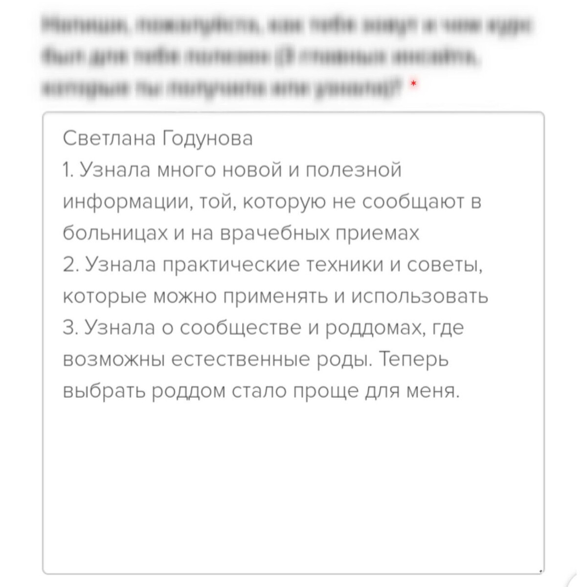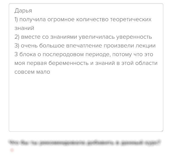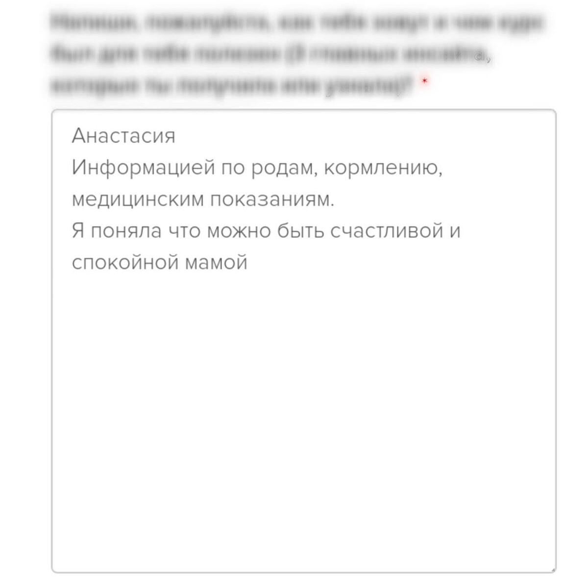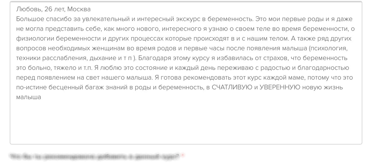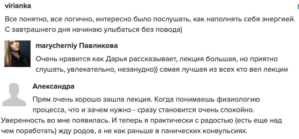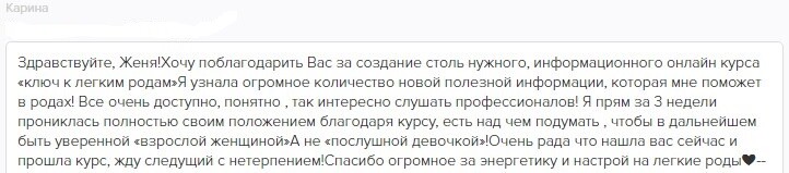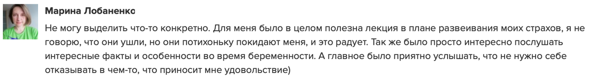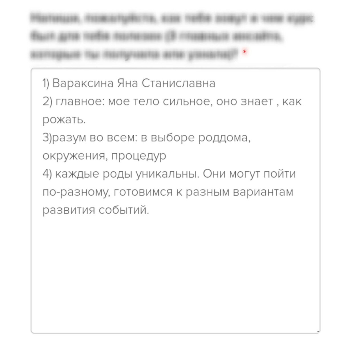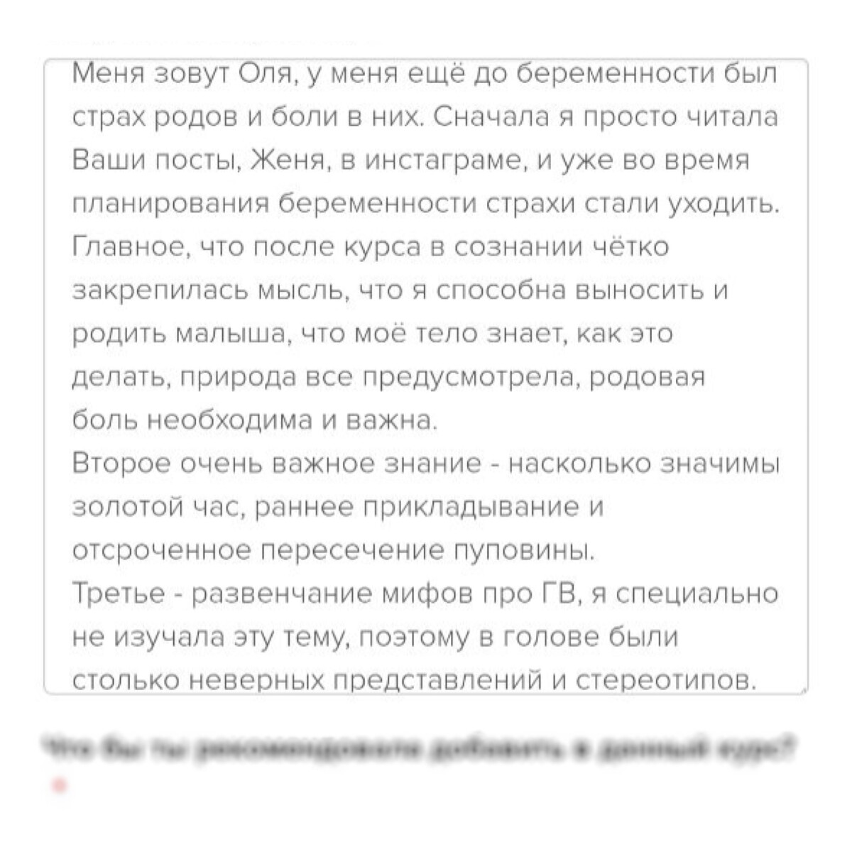 Шикарный курс и подача информации, очень подробные лекции с таааким количеством информации! Отдельная благодарность за прямые эфиры, ты просто заряжаешь уверенностью и спокойствием! Итоги у меня такие - реально ушел страх родов - что пойдет что то не так, попаду в не тот роддом, а как потом? Сейчас есть спокойствие, осознание того, что принимаю любое развитие ситуации, уверенность в себе и своих силах, и ещё не страх, а любопытство и интерес, и я готова к этому путешествию в Роды благодаря тебе и твоему курсу!