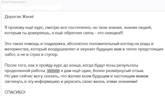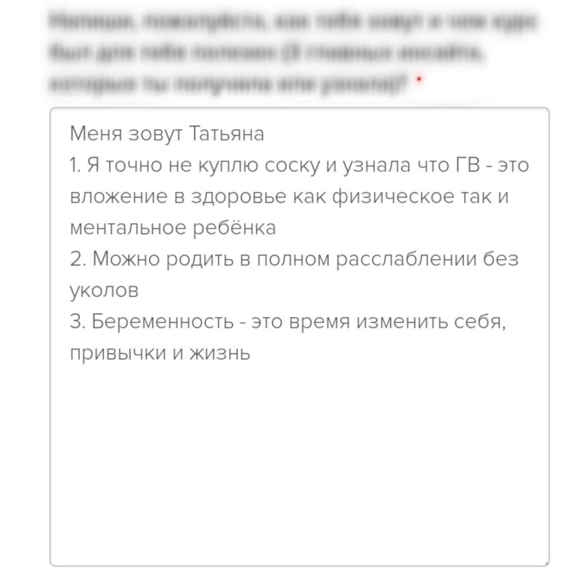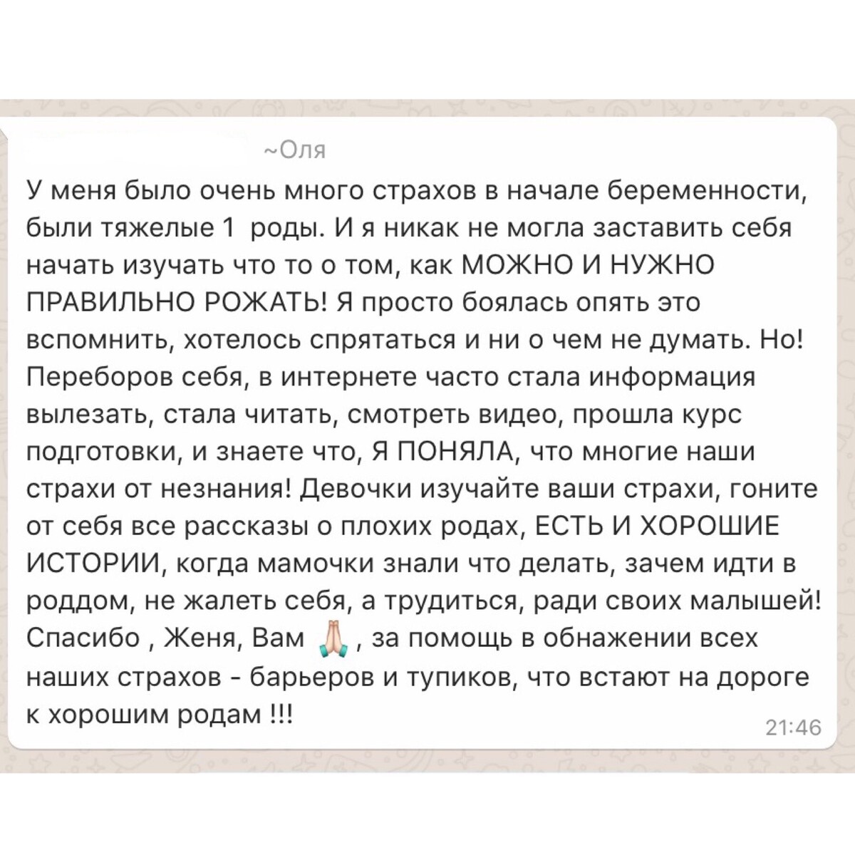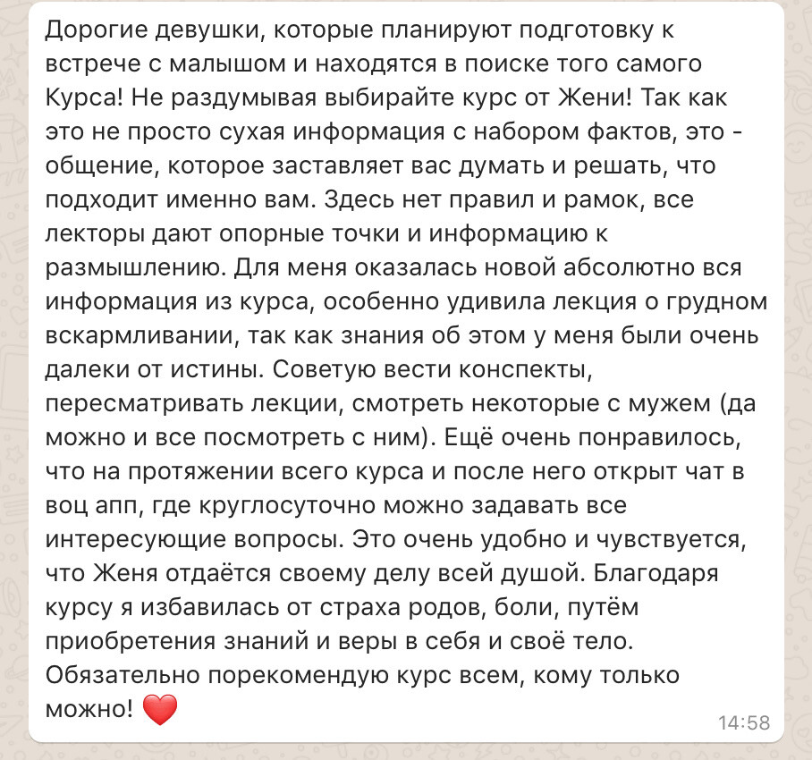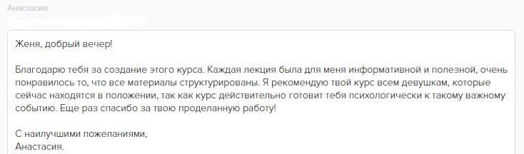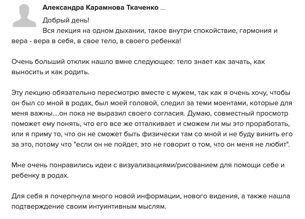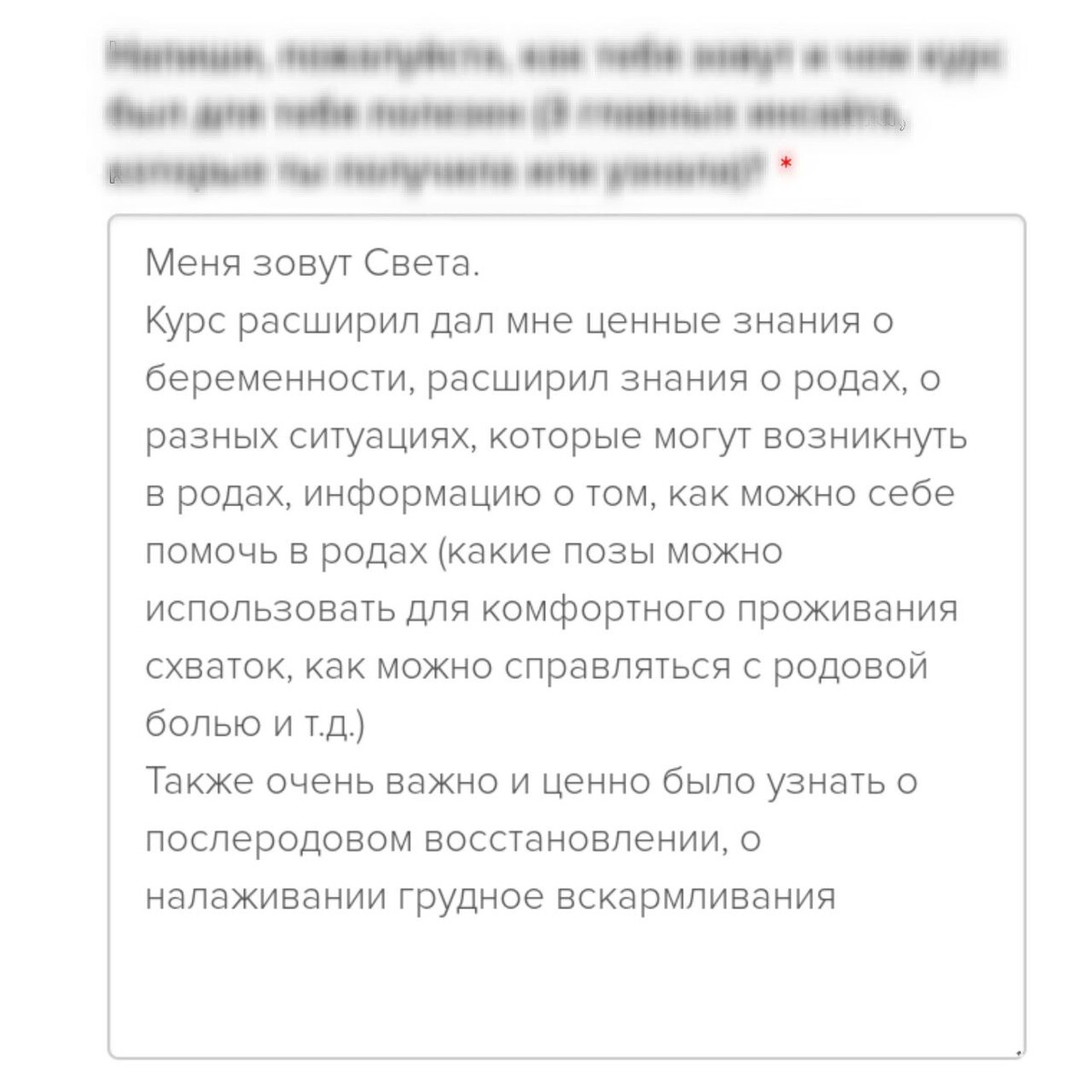Шикарный курс и подача информации, очень подробные лекции с таааким количеством информации! Отдельная благодарность за прямые эфиры, ты просто заряжаешь уверенностью и спокойствием! Итоги у меня такие - реально ушел страх родов - что пойдет что то не так, попаду в не тот роддом, а как потом? Сейчас есть спокойствие, осознание того, что принимаю любое развитие ситуации, уверенность в себе и своих силах, и ещё не страх, а любопытство и интерес, и я готова к этому путешествию в Роды благодаря тебе и твоему курсу!