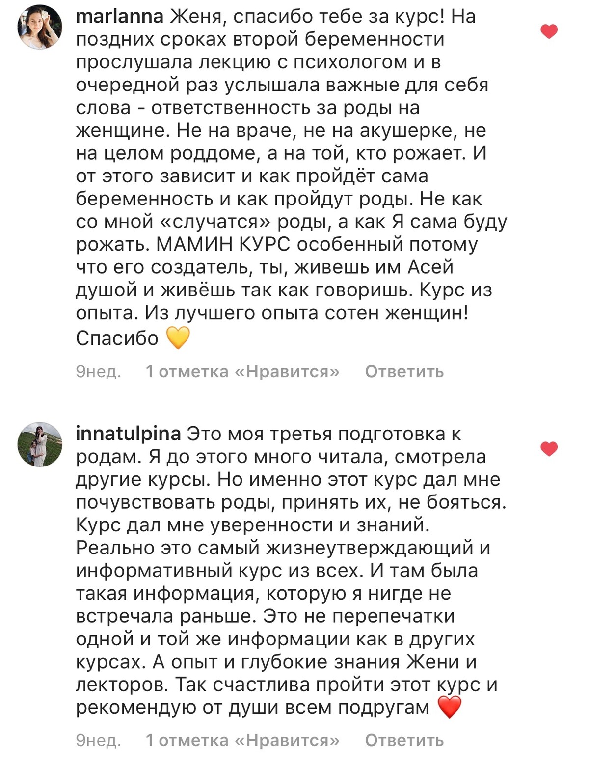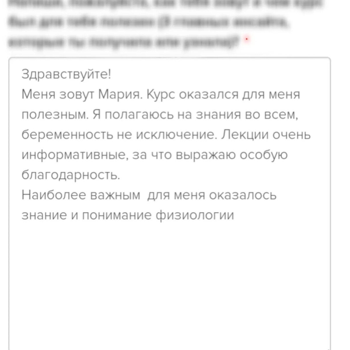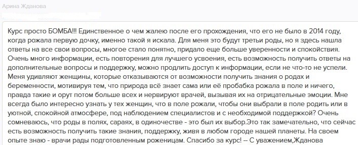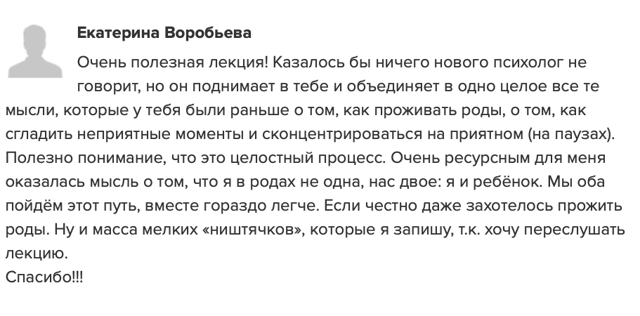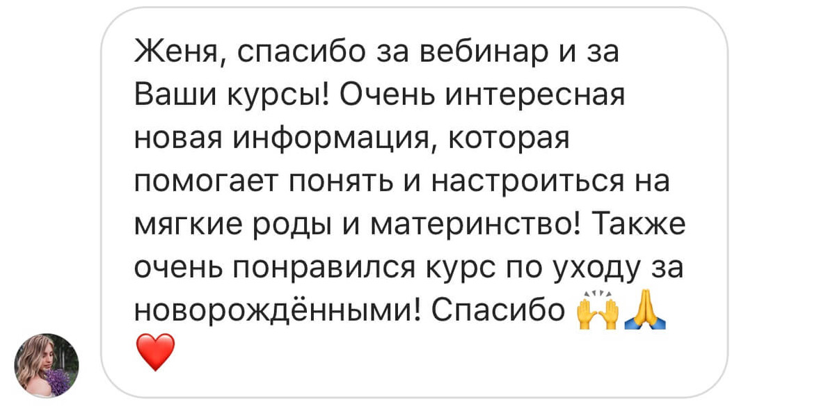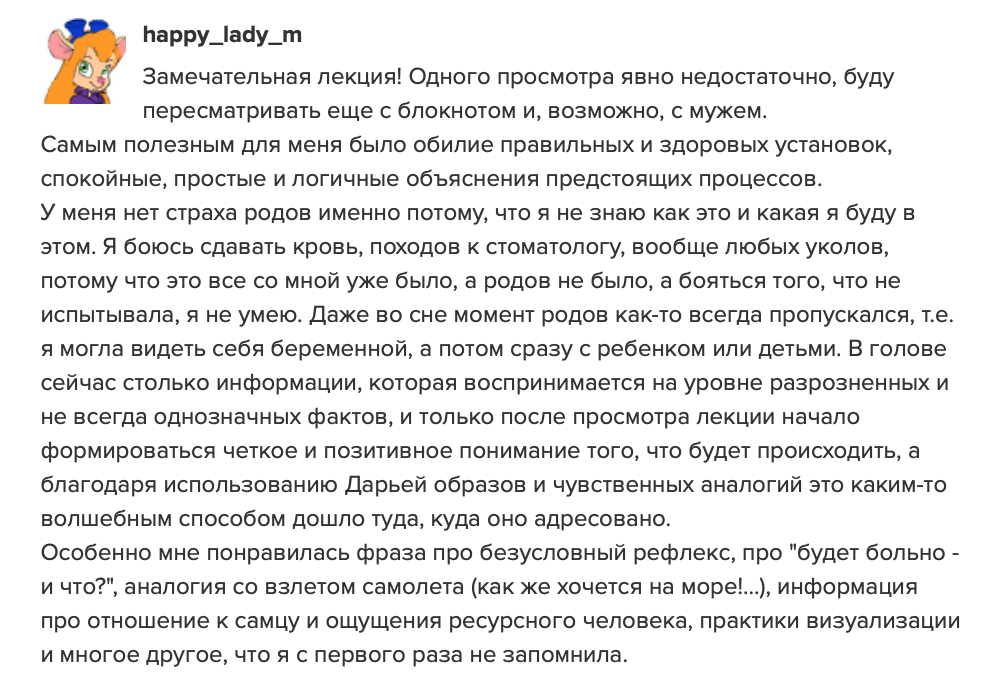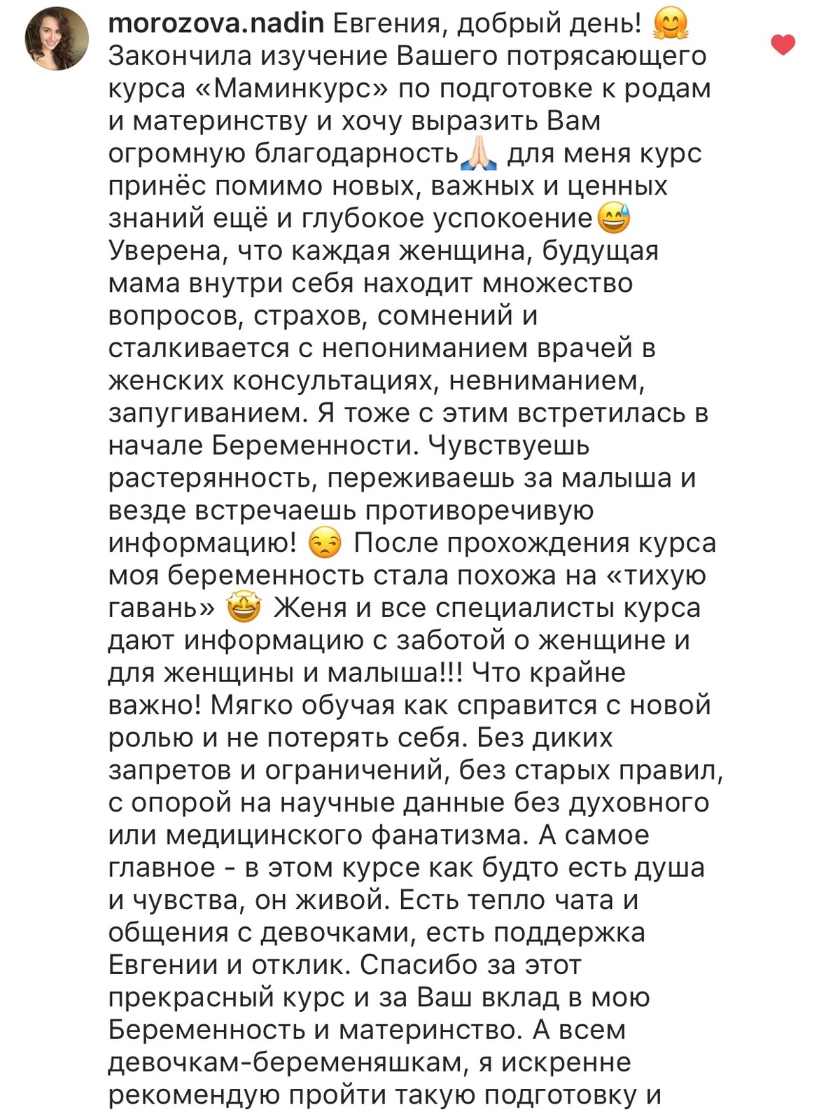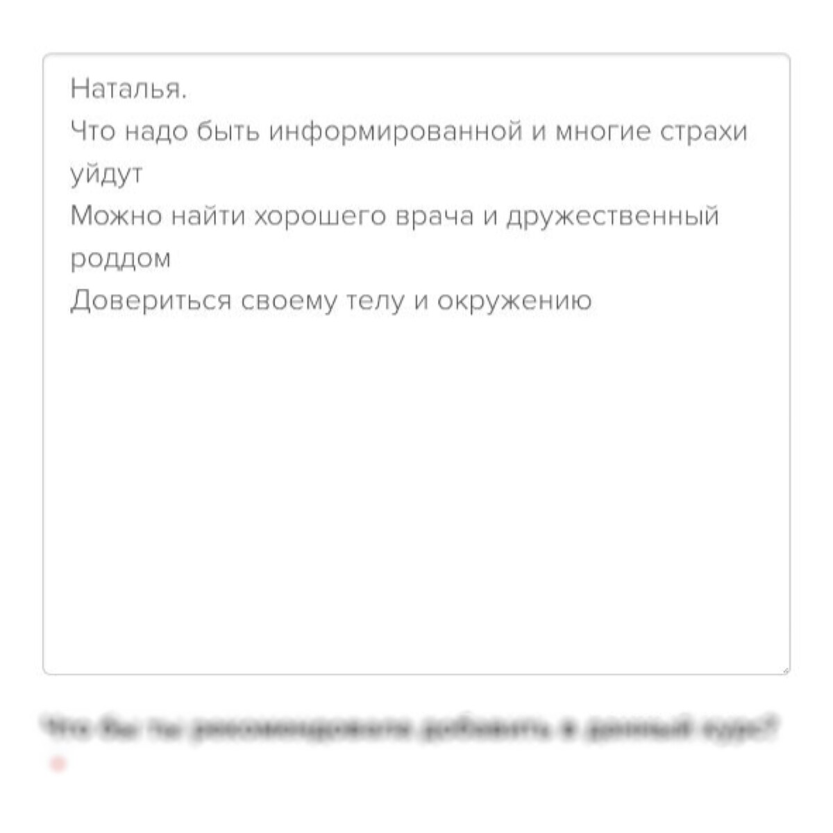 Шикарный курс и подача информации, очень подробные лекции с таааким количеством информации! Отдельная благодарность за прямые эфиры, ты просто заряжаешь уверенностью и спокойствием! Итоги у меня такие - реально ушел страх родов - что пойдет что то не так, попаду в не тот роддом, а как потом? Сейчас есть спокойствие, осознание того, что принимаю любое развитие ситуации, уверенность в себе и своих силах, и ещё не страх, а любопытство и интерес, и я готова к этому путешествию в Роды благодаря тебе и твоему курсу!