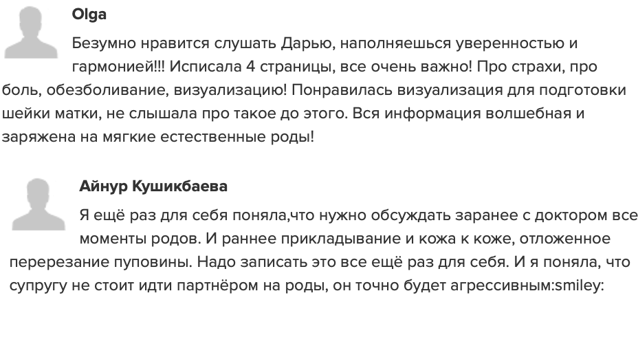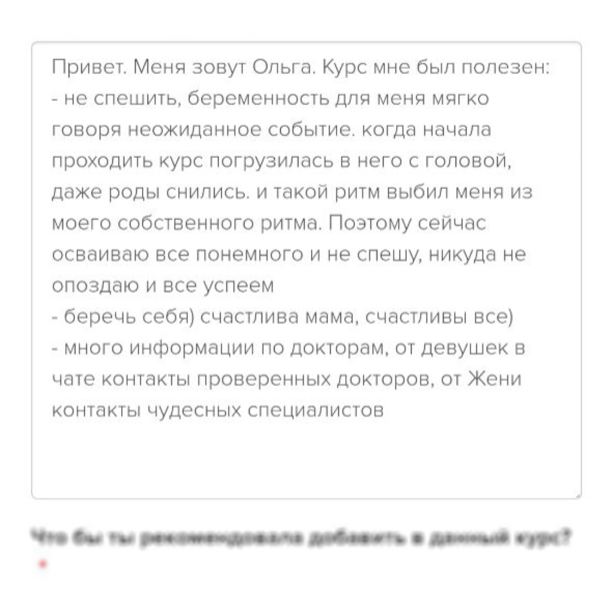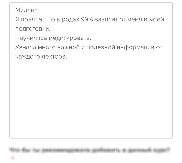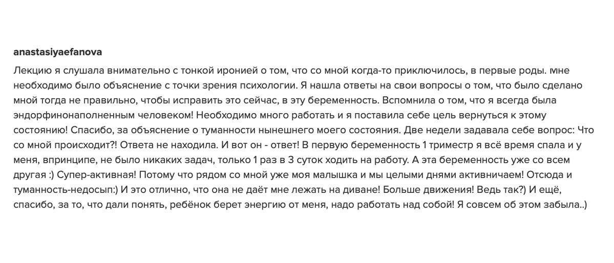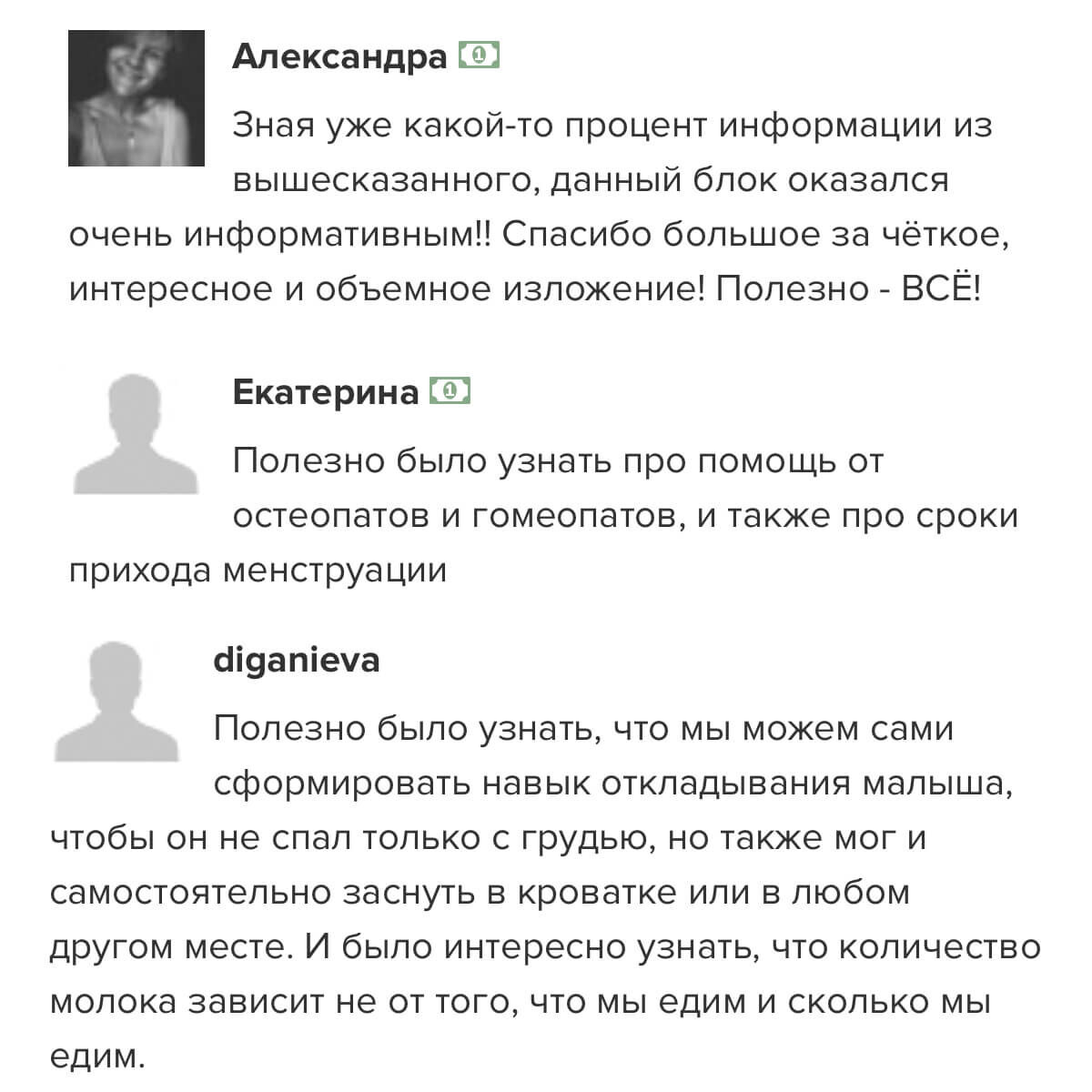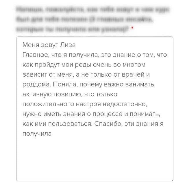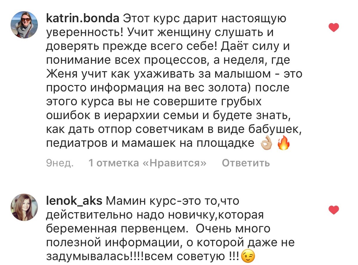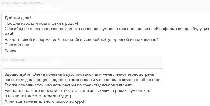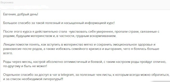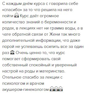 Шикарный курс и подача информации, очень подробные лекции с таааким количеством информации! Отдельная благодарность за прямые эфиры, ты просто заряжаешь уверенностью и спокойствием! Итоги у меня такие - реально ушел страх родов - что пойдет что то не так, попаду в не тот роддом, а как потом? Сейчас есть спокойствие, осознание того, что принимаю любое развитие ситуации, уверенность в себе и своих силах, и ещё не страх, а любопытство и интерес, и я готова к этому путешествию в Роды благодаря тебе и твоему курсу!