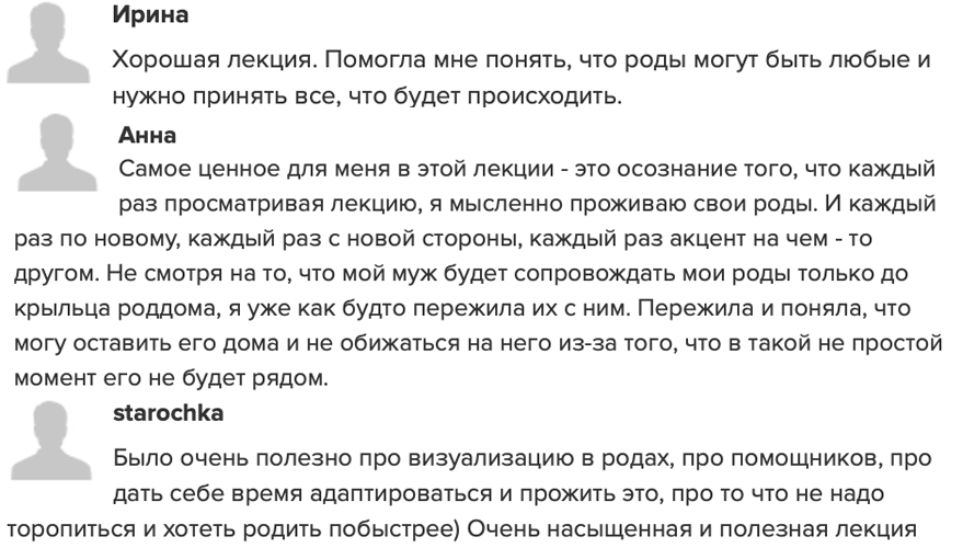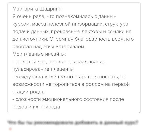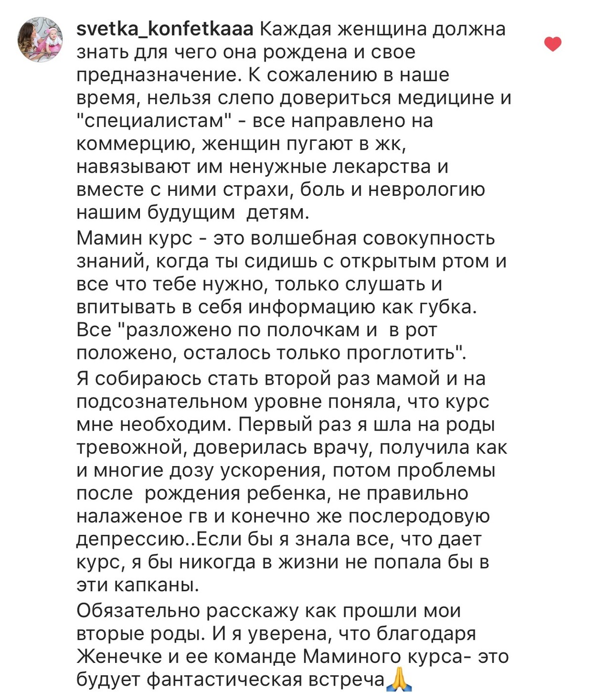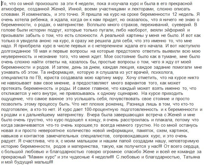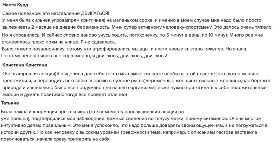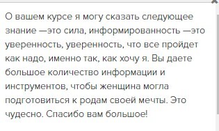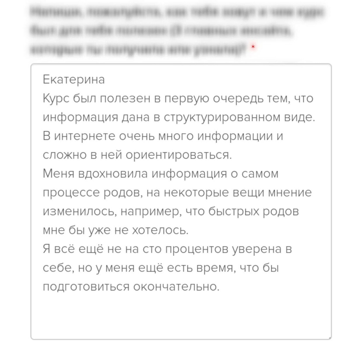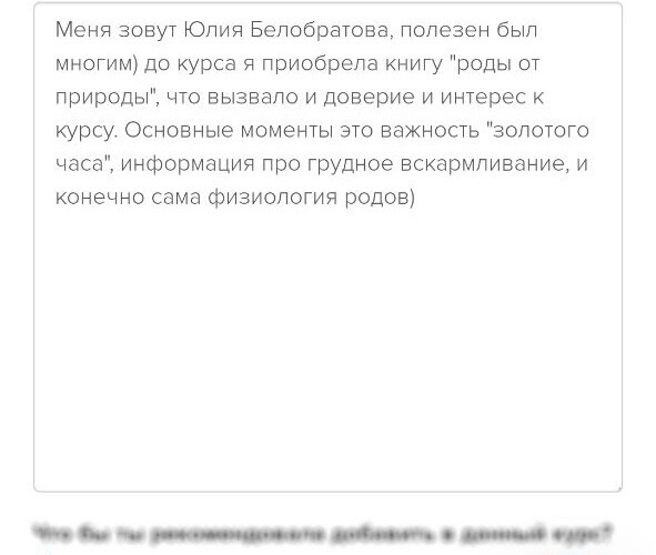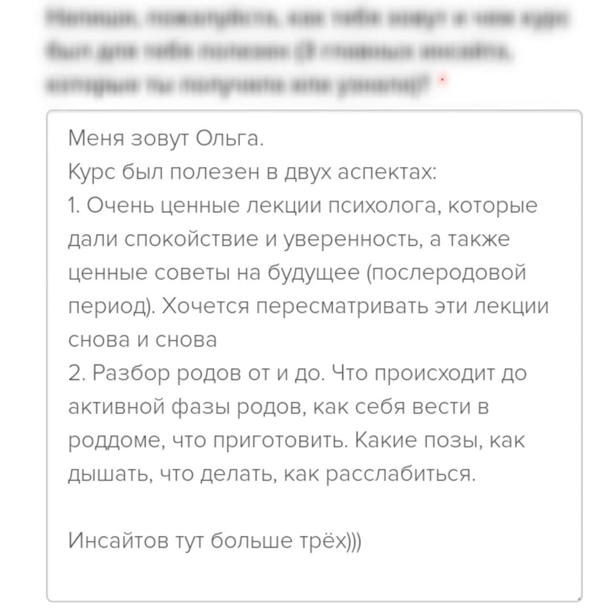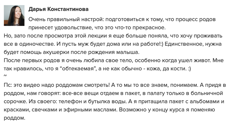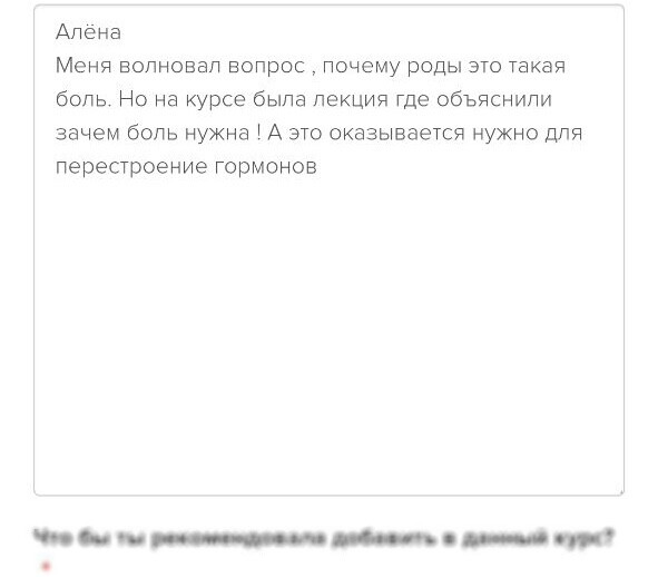 Шикарный курс и подача информации, очень подробные лекции с таааким количеством информации! Отдельная благодарность за прямые эфиры, ты просто заряжаешь уверенностью и спокойствием! Итоги у меня такие - реально ушел страх родов - что пойдет что то не так, попаду в не тот роддом, а как потом? Сейчас есть спокойствие, осознание того, что принимаю любое развитие ситуации, уверенность в себе и своих силах, и ещё не страх, а любопытство и интерес, и я готова к этому путешествию в Роды благодаря тебе и твоему курсу!