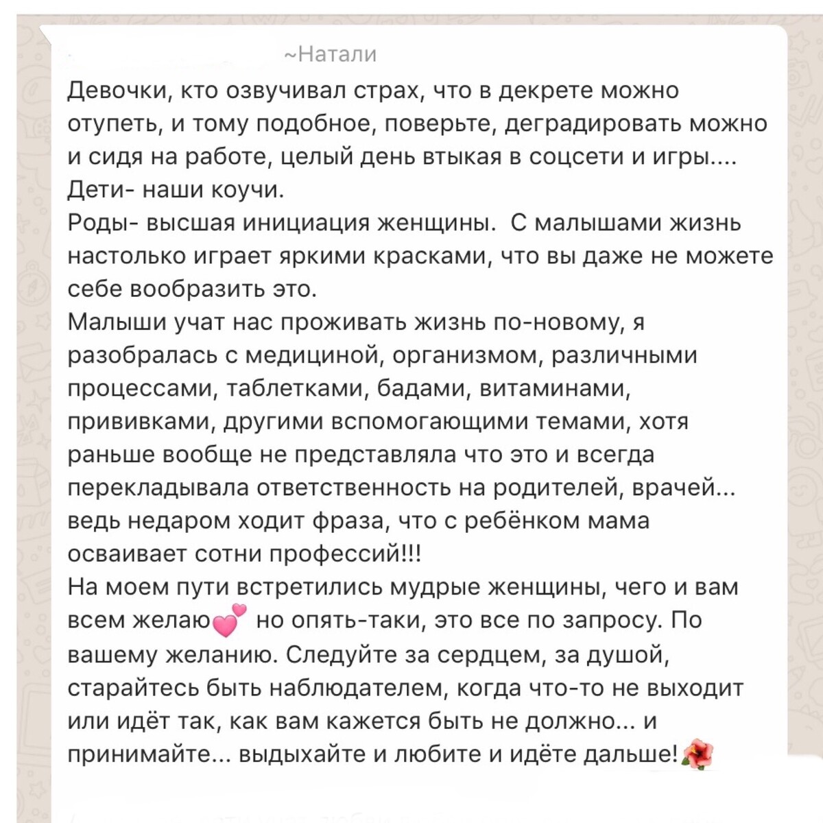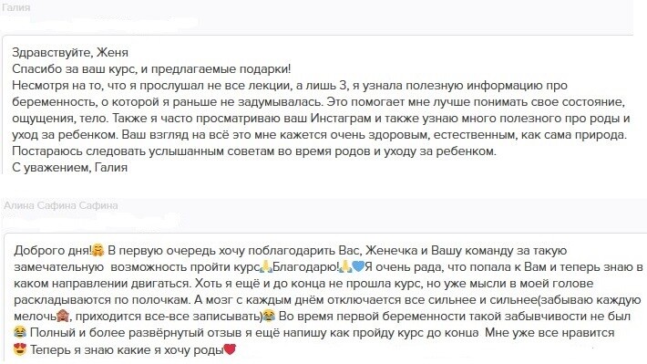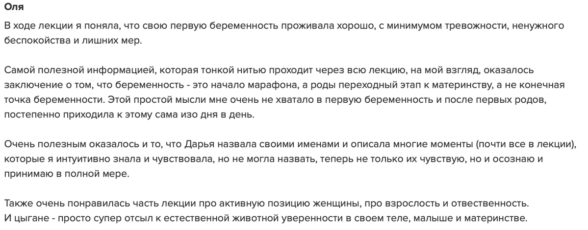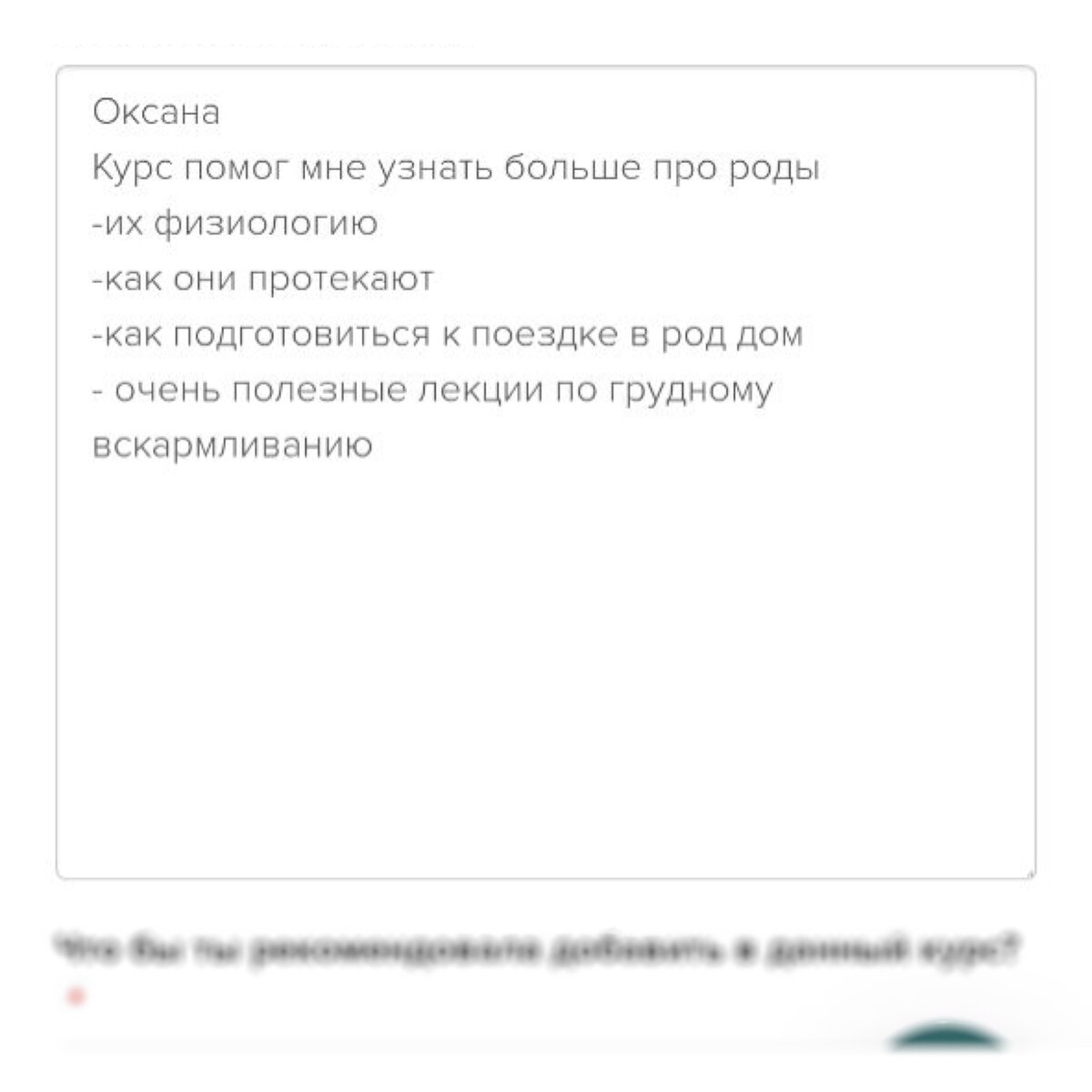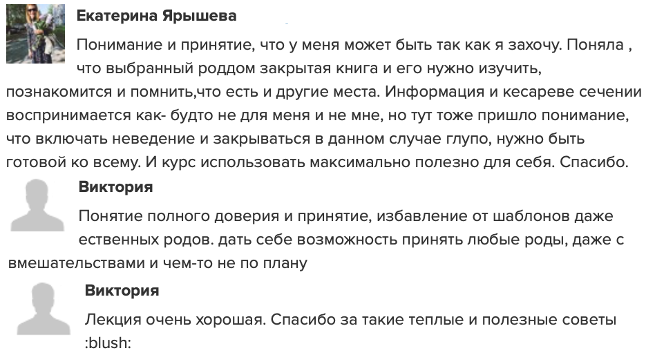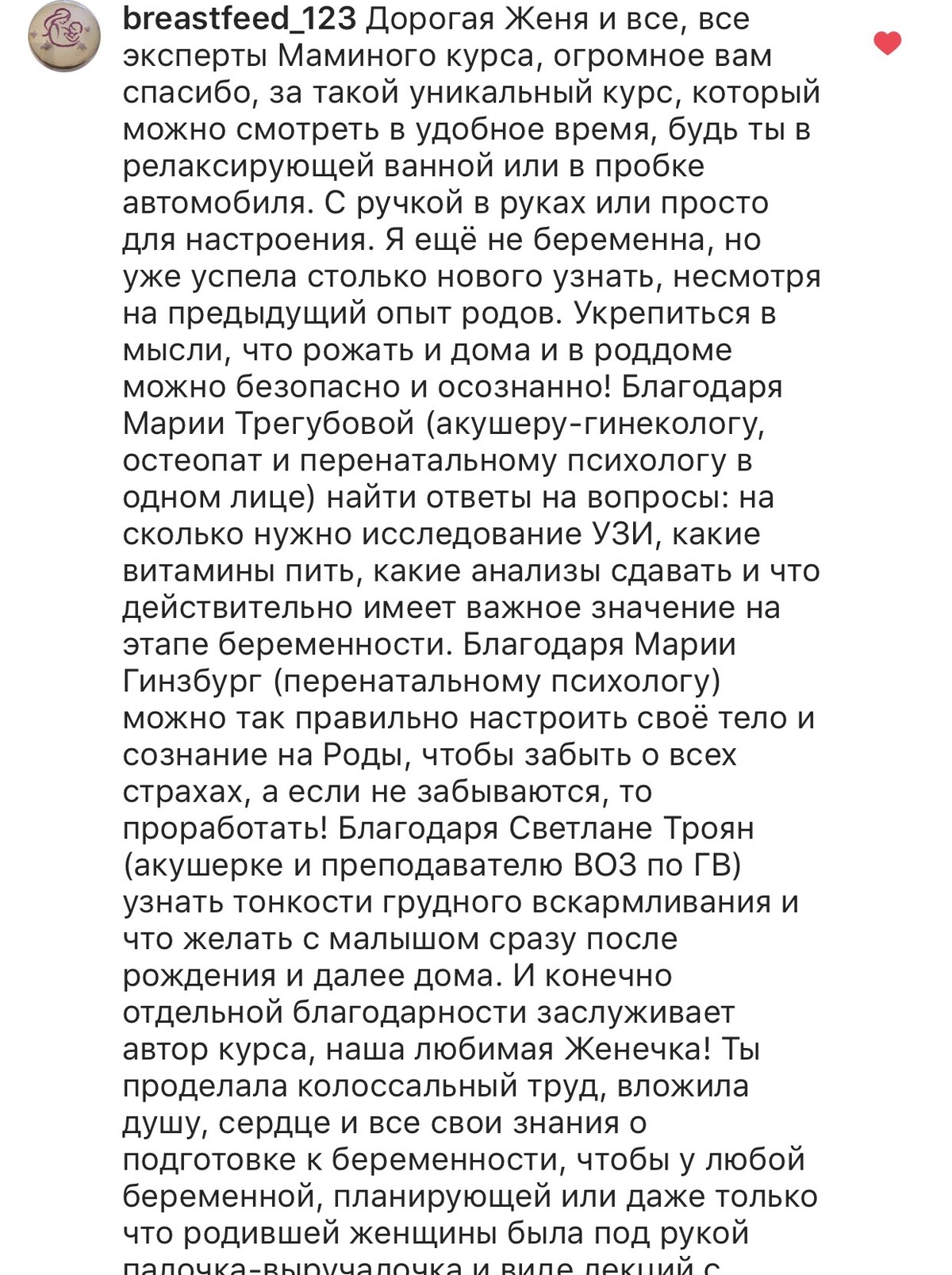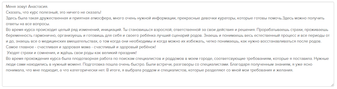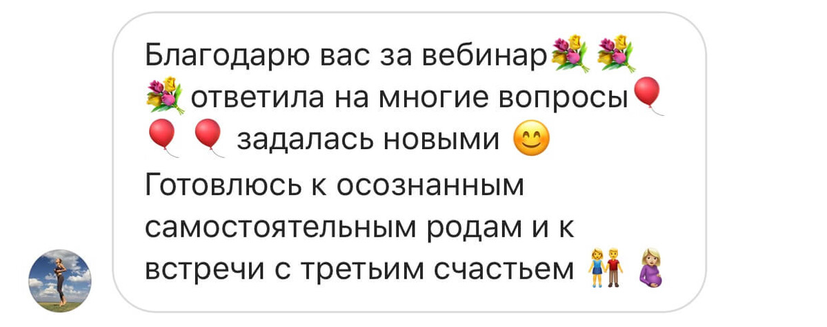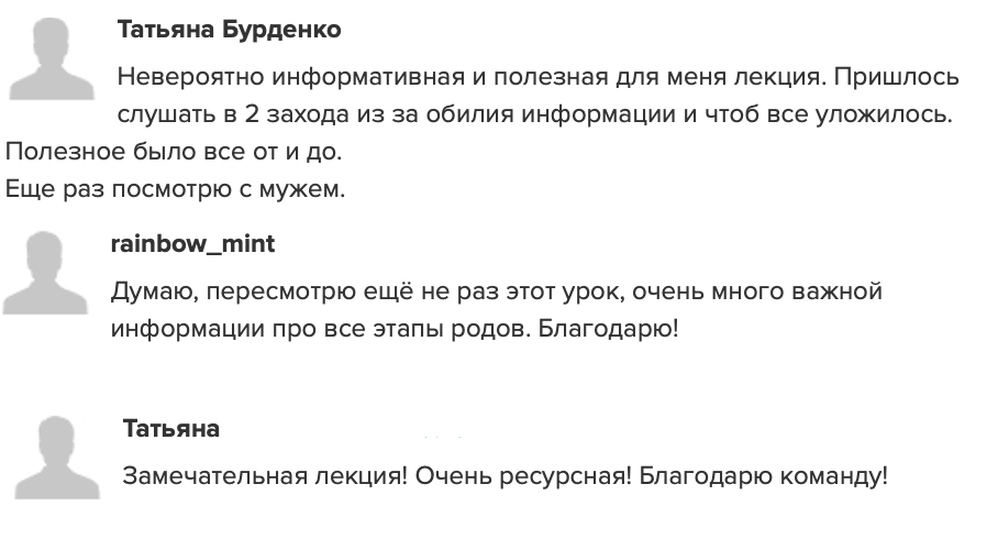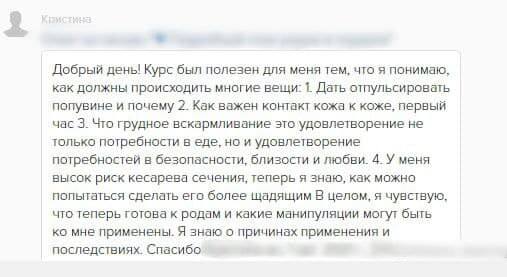 Шикарный курс и подача информации, очень подробные лекции с таааким количеством информации! Отдельная благодарность за прямые эфиры, ты просто заряжаешь уверенностью и спокойствием! Итоги у меня такие - реально ушел страх родов - что пойдет что то не так, попаду в не тот роддом, а как потом? Сейчас есть спокойствие, осознание того, что принимаю любое развитие ситуации, уверенность в себе и своих силах, и ещё не страх, а любопытство и интерес, и я готова к этому путешествию в Роды благодаря тебе и твоему курсу!