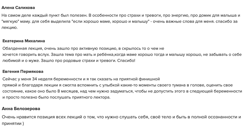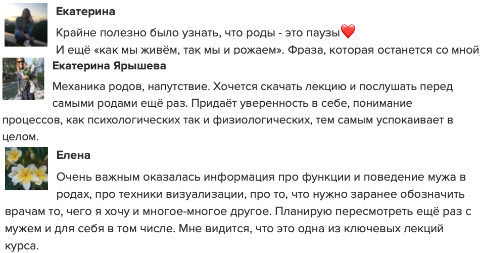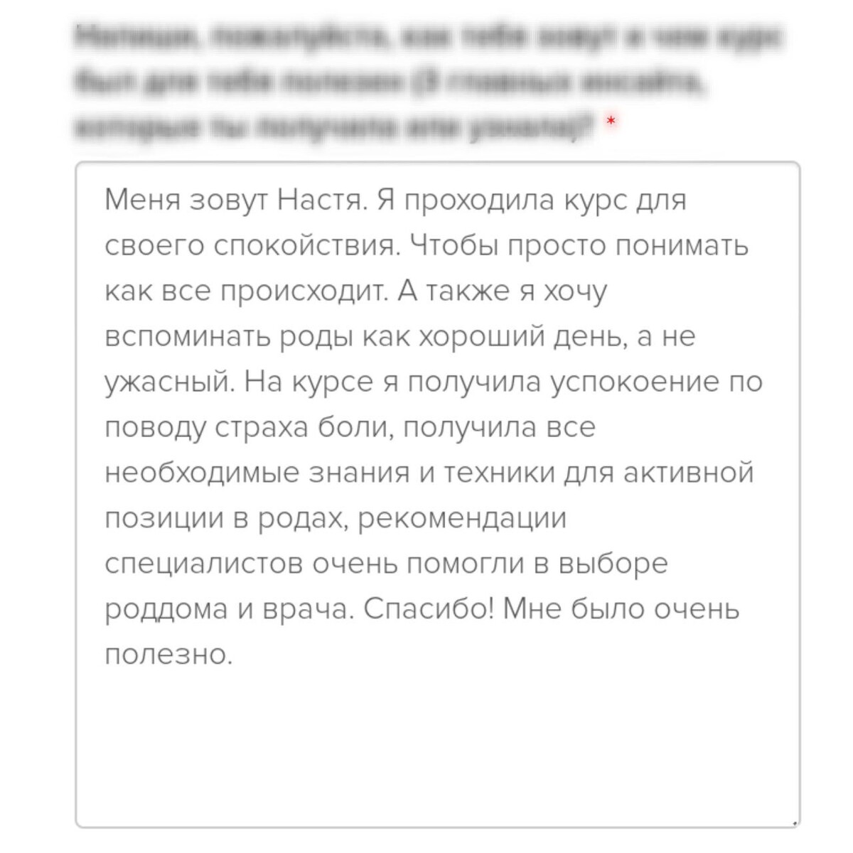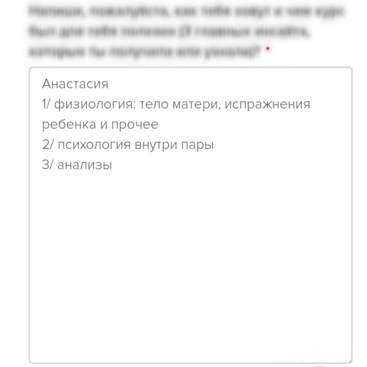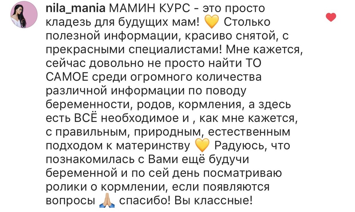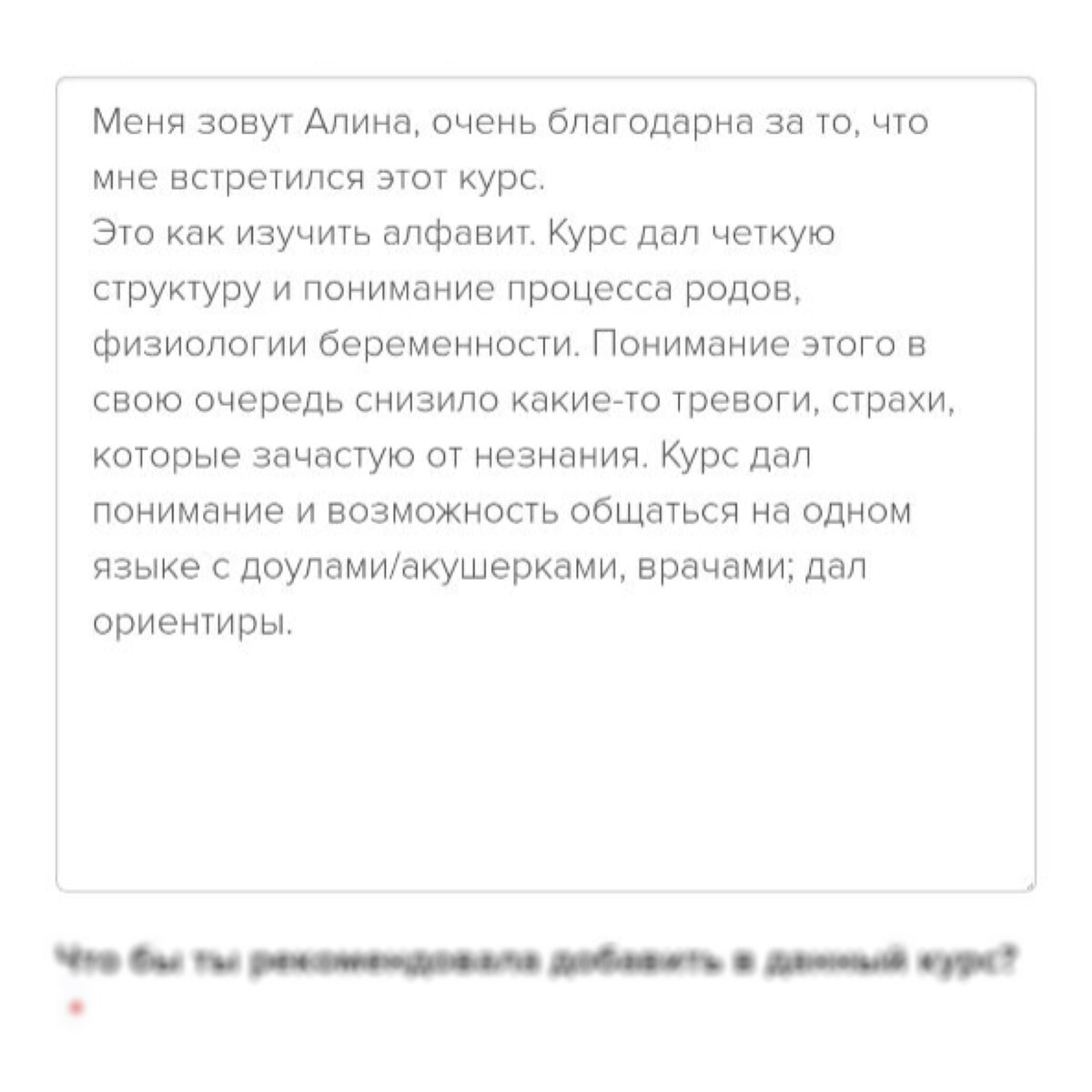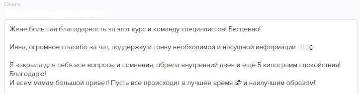 Шикарный курс и подача информации, очень подробные лекции с таааким количеством информации! Отдельная благодарность за прямые эфиры, ты просто заряжаешь уверенностью и спокойствием! Итоги у меня такие - реально ушел страх родов - что пойдет что то не так, попаду в не тот роддом, а как потом? Сейчас есть спокойствие, осознание того, что принимаю любое развитие ситуации, уверенность в себе и своих силах, и ещё не страх, а любопытство и интерес, и я готова к этому путешествию в Роды благодаря тебе и твоему курсу!