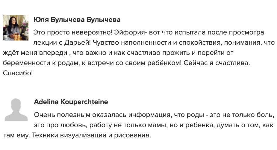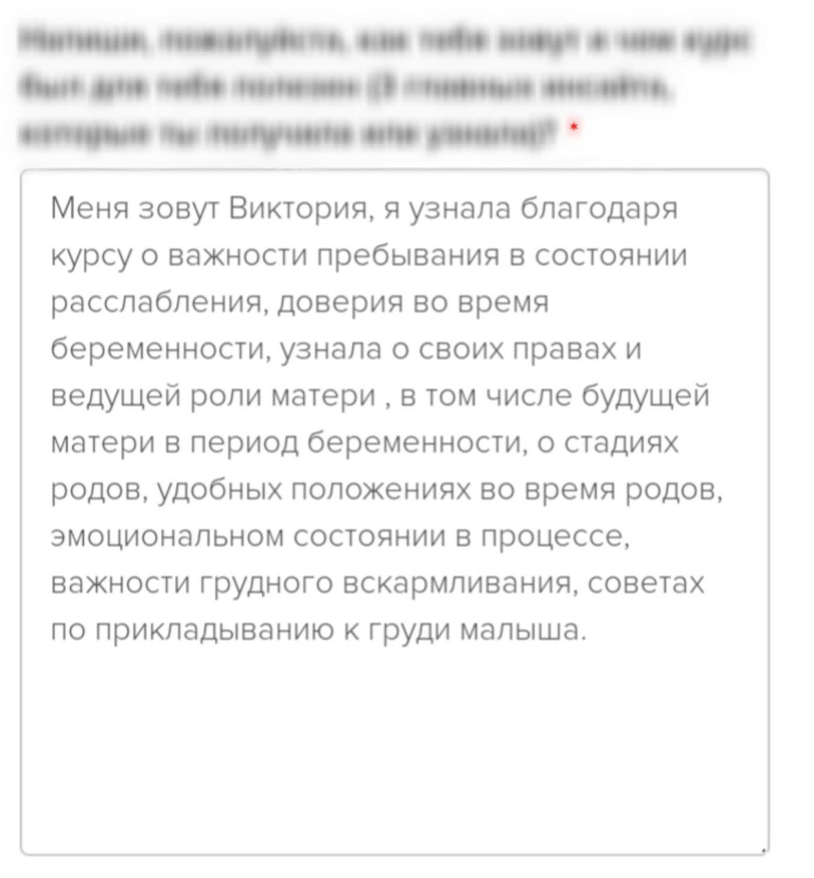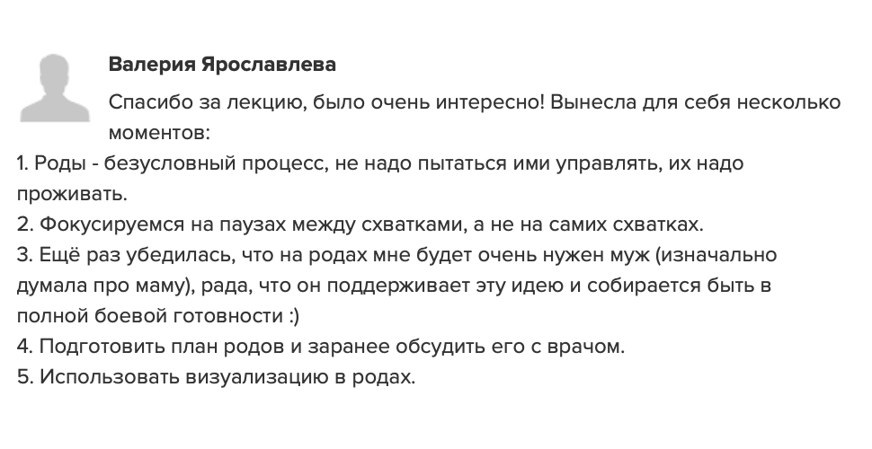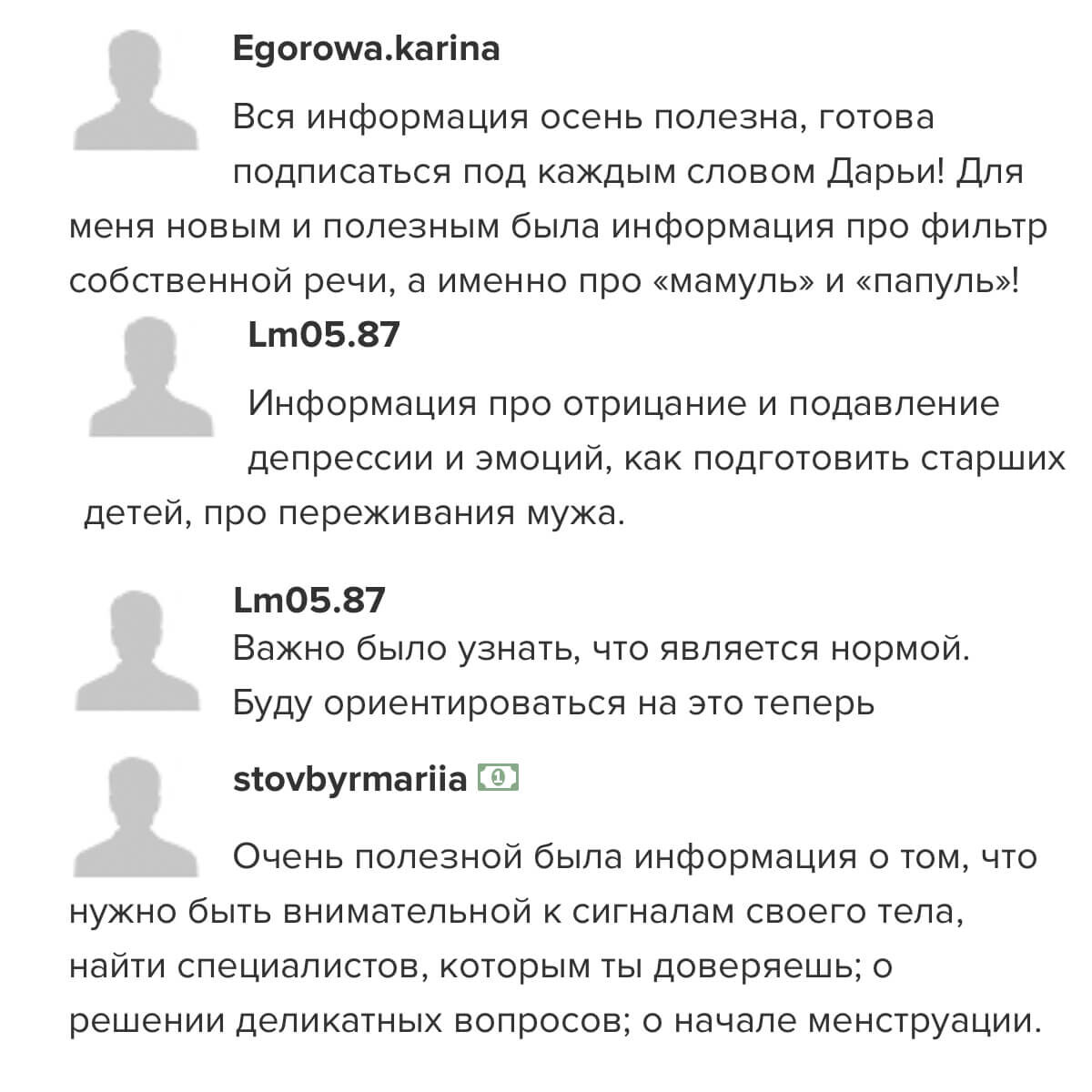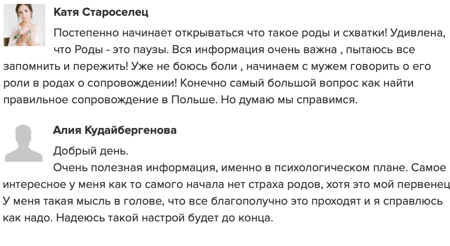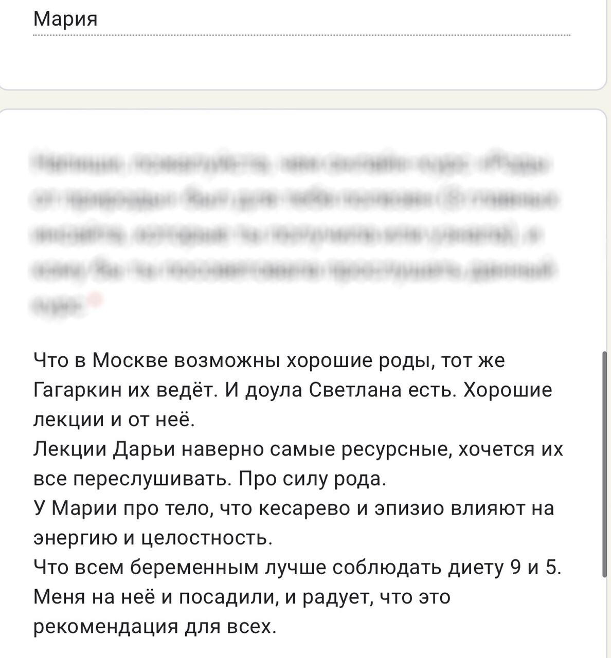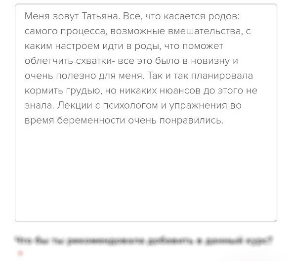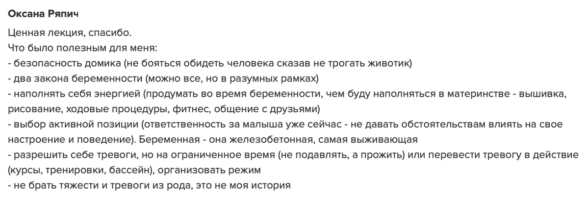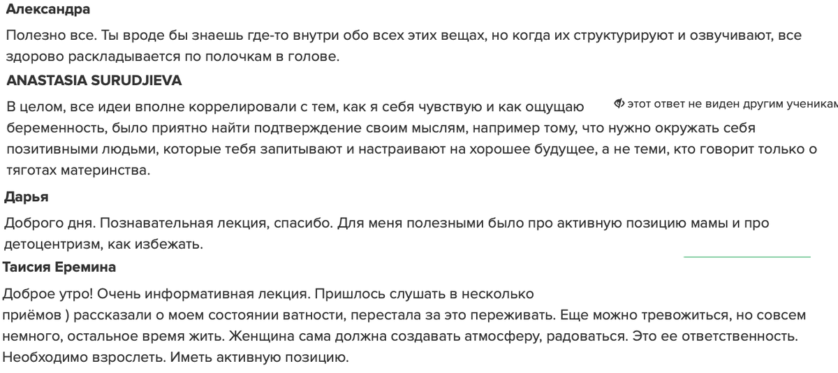 Шикарный курс и подача информации, очень подробные лекции с таааким количеством информации! Отдельная благодарность за прямые эфиры, ты просто заряжаешь уверенностью и спокойствием! Итоги у меня такие - реально ушел страх родов - что пойдет что то не так, попаду в не тот роддом, а как потом? Сейчас есть спокойствие, осознание того, что принимаю любое развитие ситуации, уверенность в себе и своих силах, и ещё не страх, а любопытство и интерес, и я готова к этому путешествию в Роды благодаря тебе и твоему курсу!