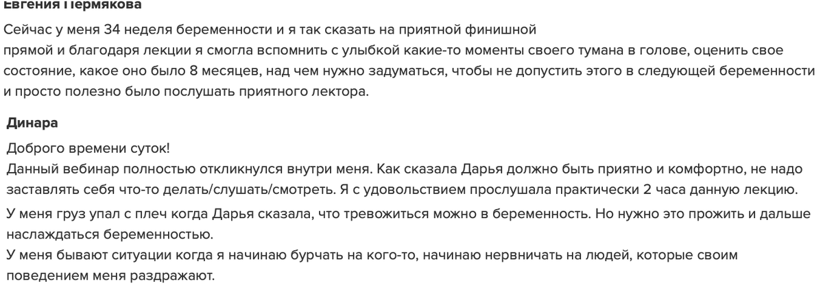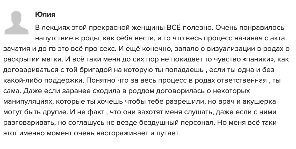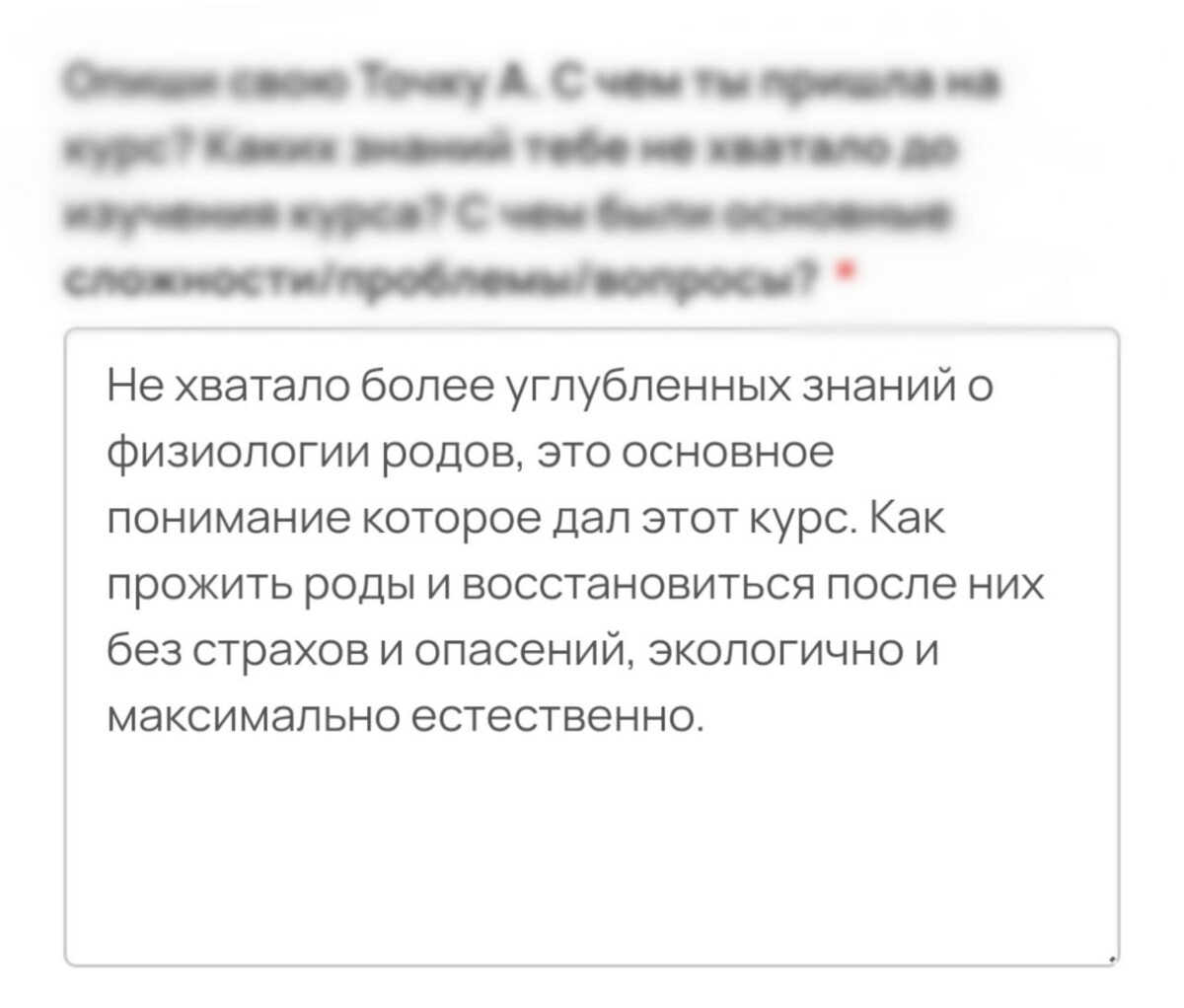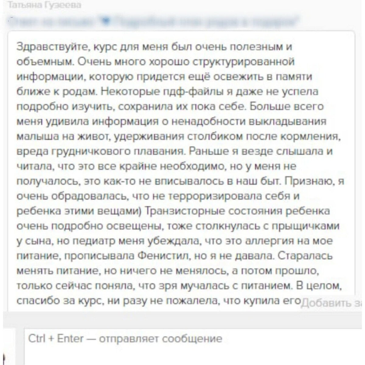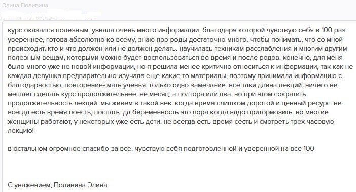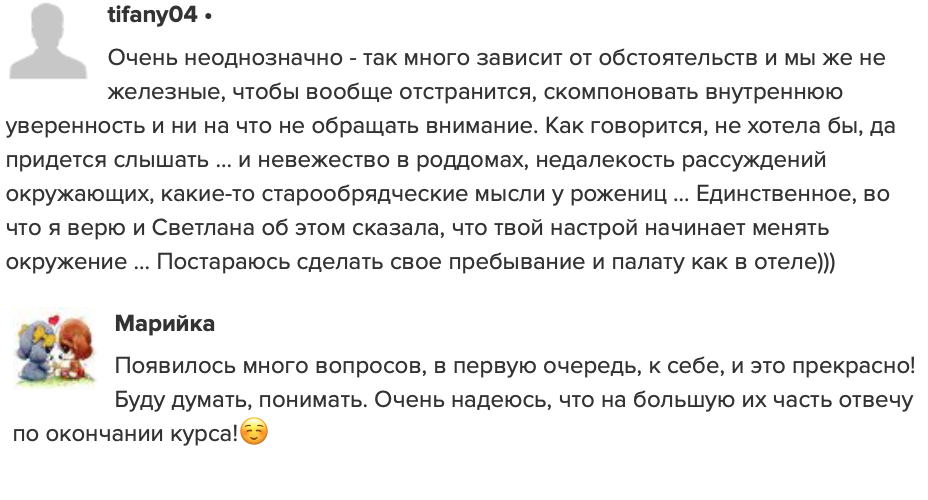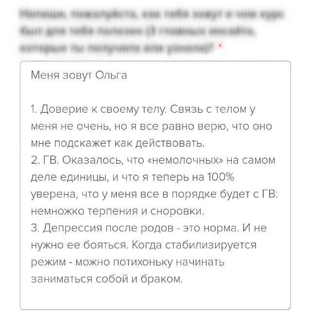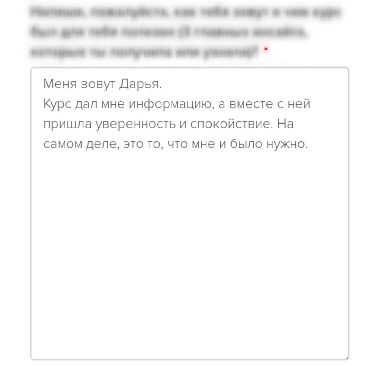 Шикарный курс и подача информации, очень подробные лекции с таааким количеством информации! Отдельная благодарность за прямые эфиры, ты просто заряжаешь уверенностью и спокойствием! Итоги у меня такие - реально ушел страх родов - что пойдет что то не так, попаду в не тот роддом, а как потом? Сейчас есть спокойствие, осознание того, что принимаю любое развитие ситуации, уверенность в себе и своих силах, и ещё не страх, а любопытство и интерес, и я готова к этому путешествию в Роды благодаря тебе и твоему курсу!