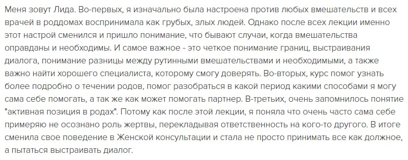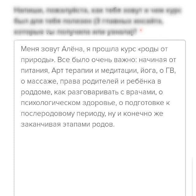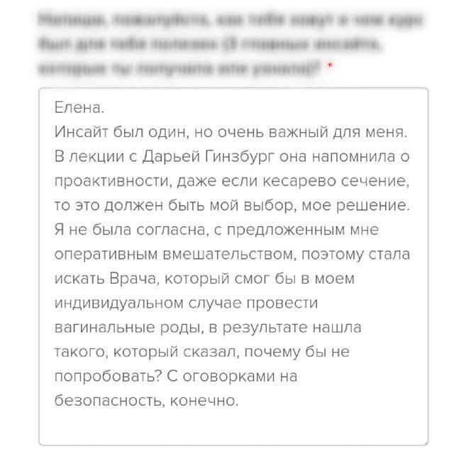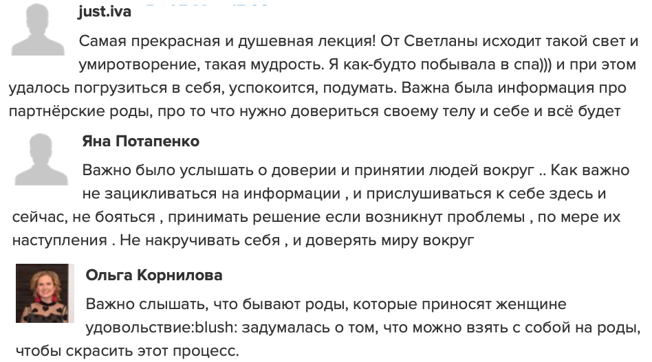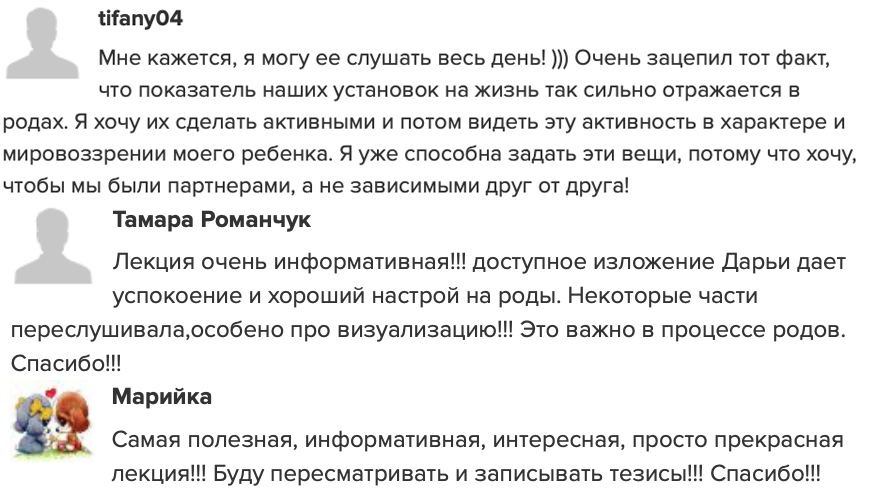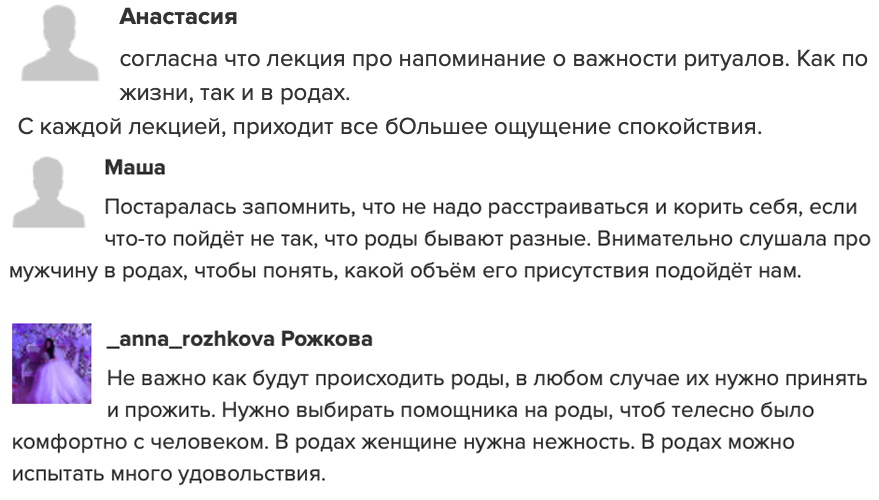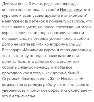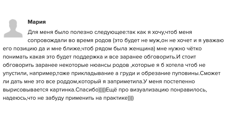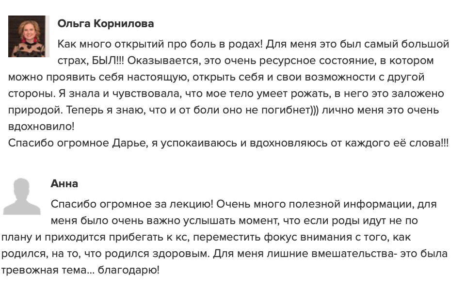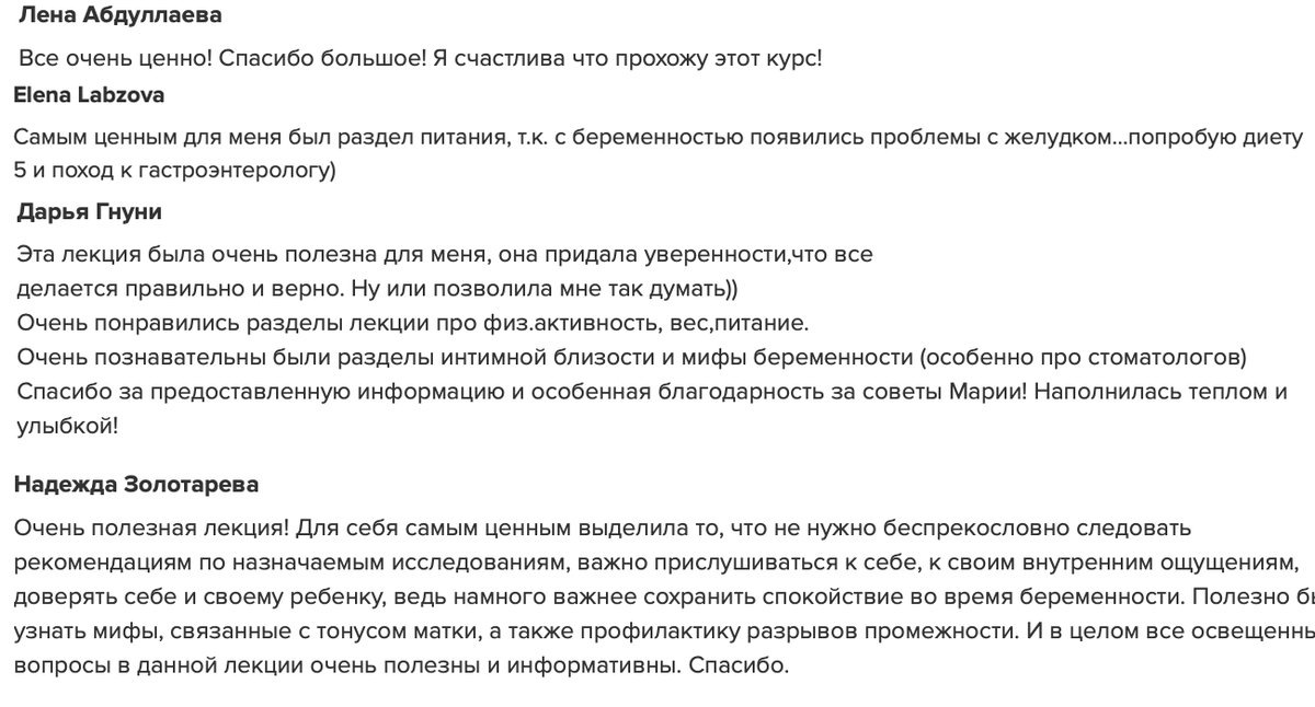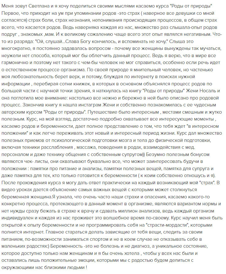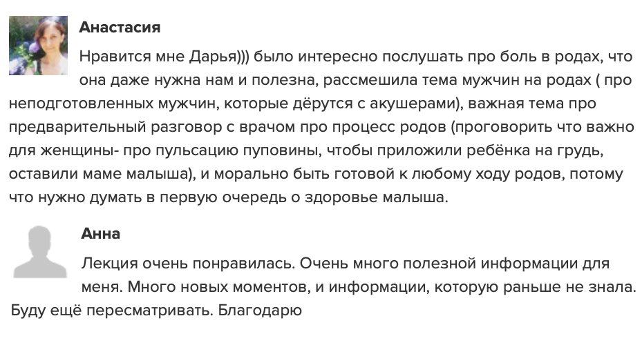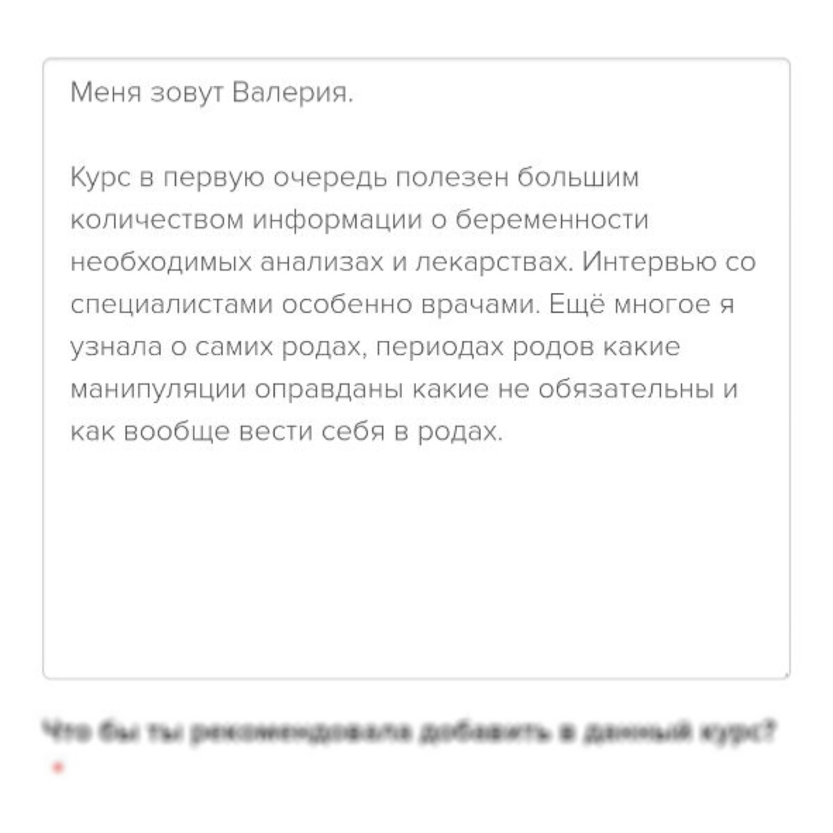 Шикарный курс и подача информации, очень подробные лекции с таааким количеством информации! Отдельная благодарность за прямые эфиры, ты просто заряжаешь уверенностью и спокойствием! Итоги у меня такие - реально ушел страх родов - что пойдет что то не так, попаду в не тот роддом, а как потом? Сейчас есть спокойствие, осознание того, что принимаю любое развитие ситуации, уверенность в себе и своих силах, и ещё не страх, а любопытство и интерес, и я готова к этому путешествию в Роды благодаря тебе и твоему курсу!