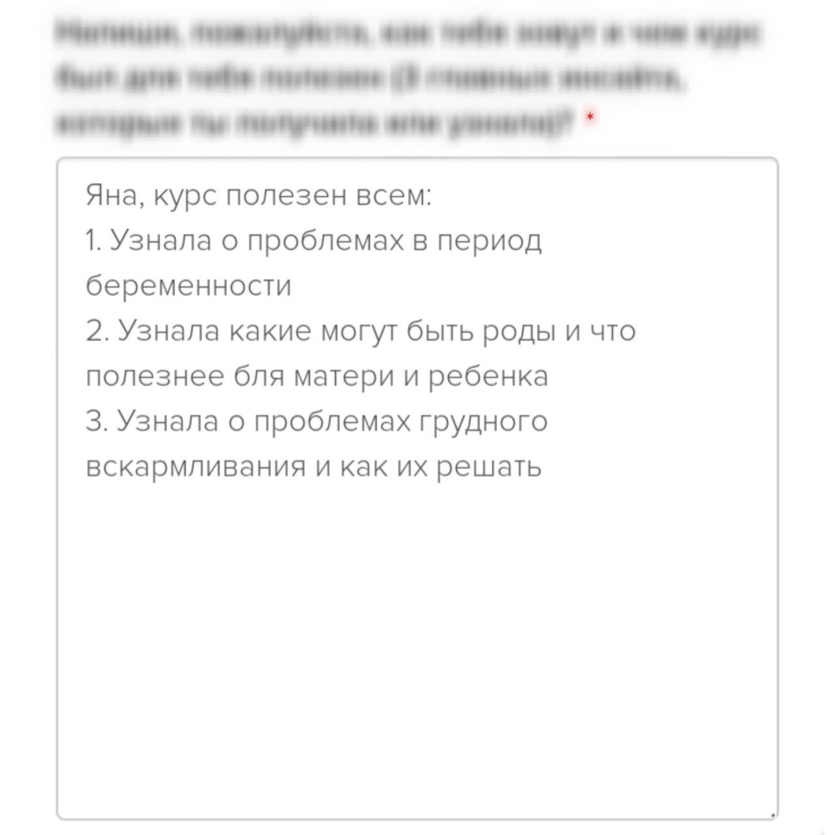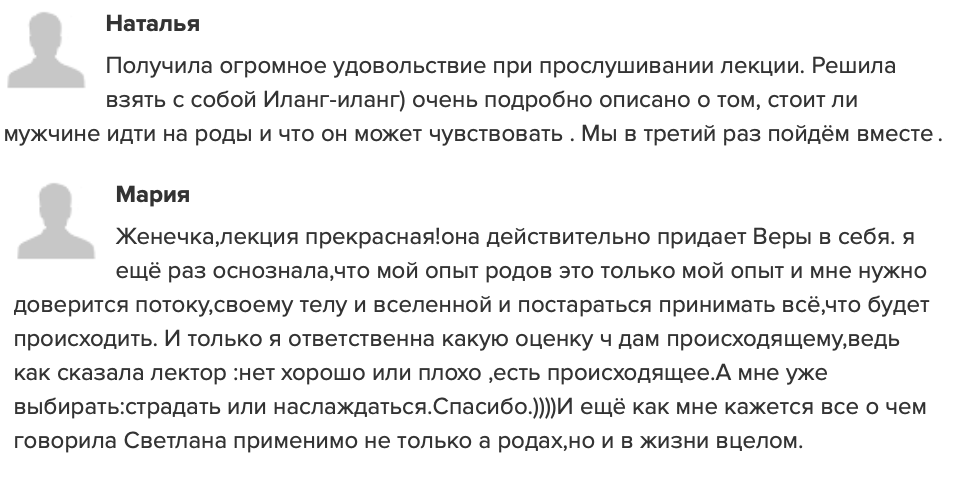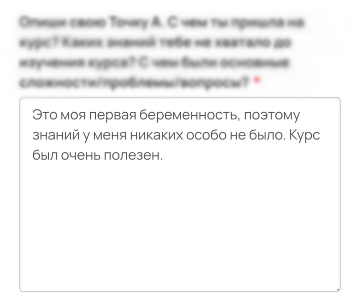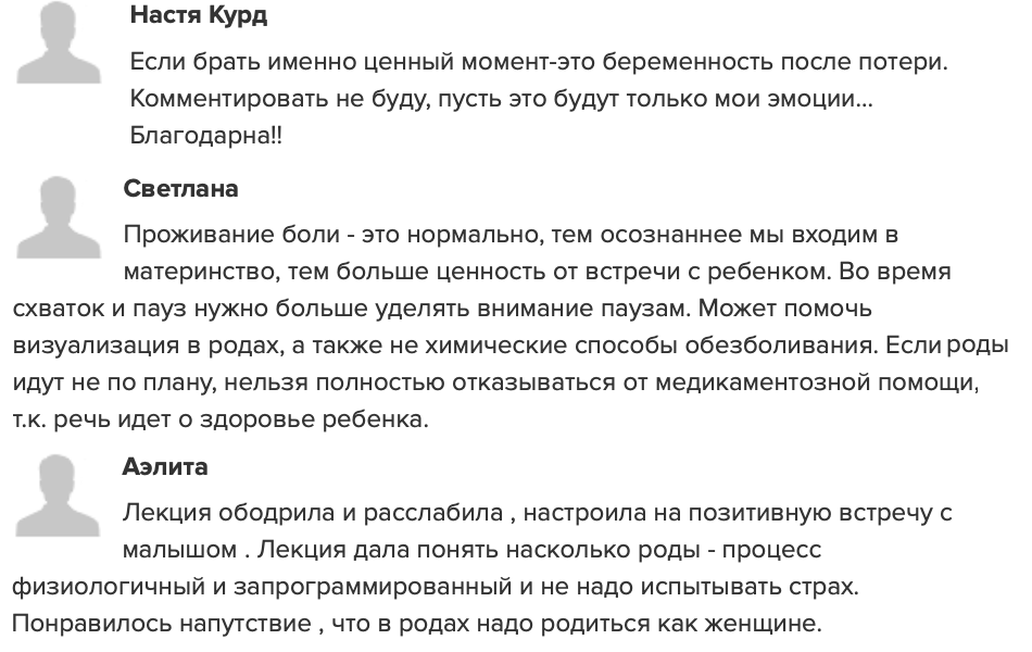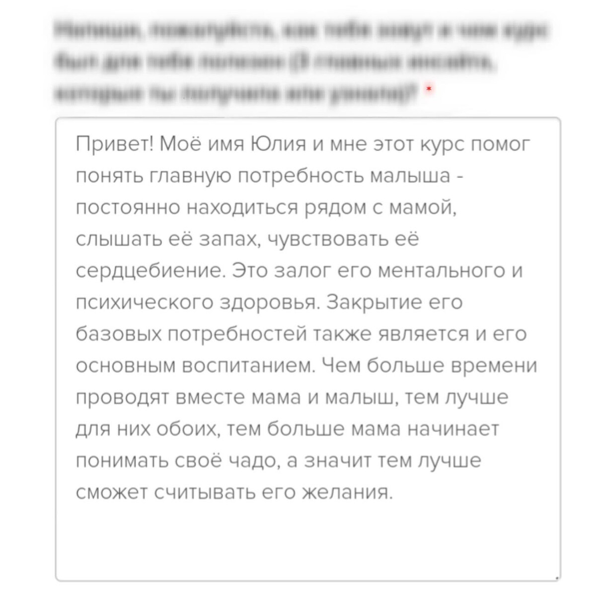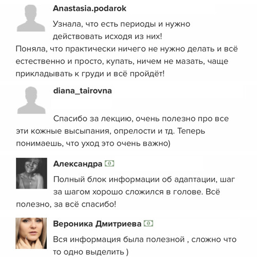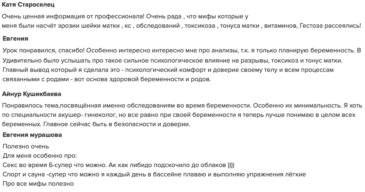Шикарный курс и подача информации, очень подробные лекции с таааким количеством информации! Отдельная благодарность за прямые эфиры, ты просто заряжаешь уверенностью и спокойствием! Итоги у меня такие - реально ушел страх родов - что пойдет что то не так, попаду в не тот роддом, а как потом? Сейчас есть спокойствие, осознание того, что принимаю любое развитие ситуации, уверенность в себе и своих силах, и ещё не страх, а любопытство и интерес, и я готова к этому путешествию в Роды благодаря тебе и твоему курсу!