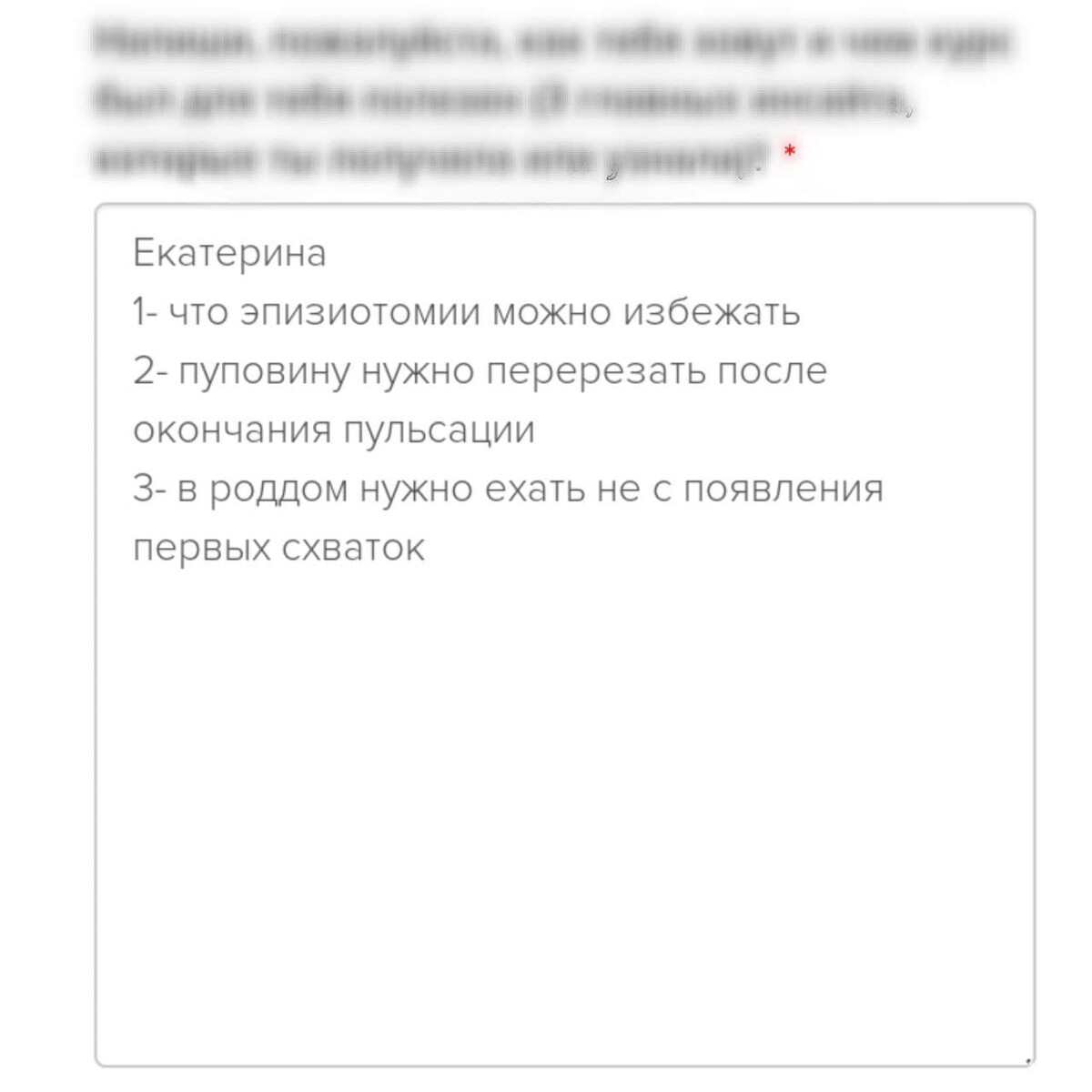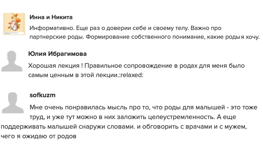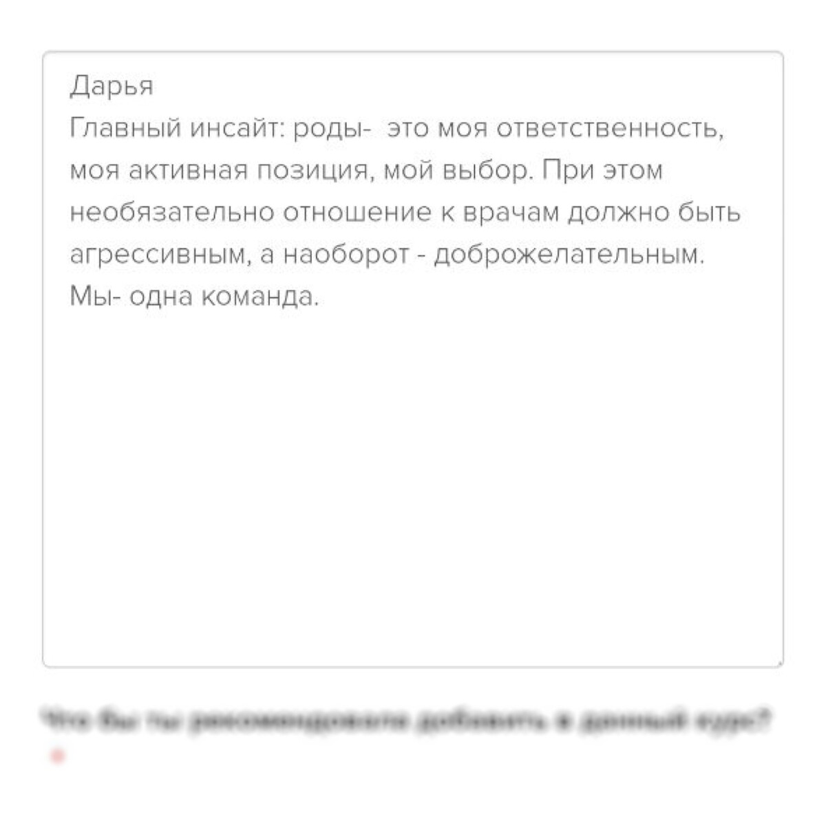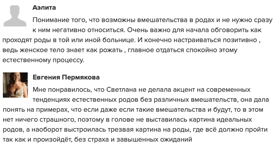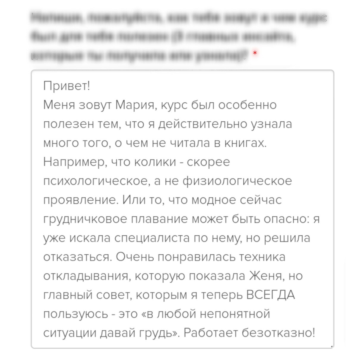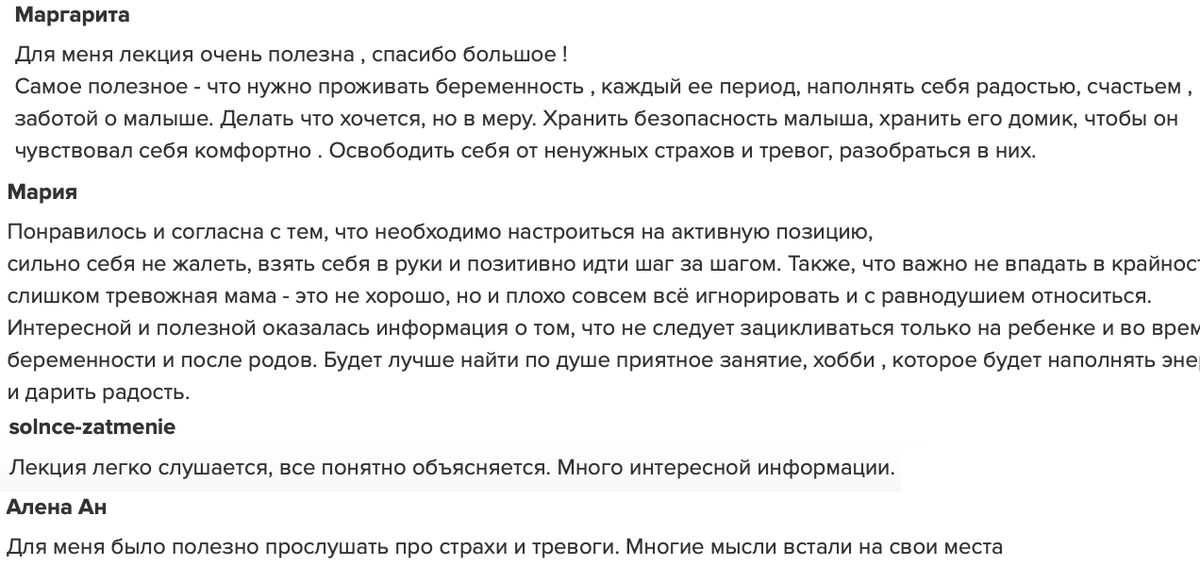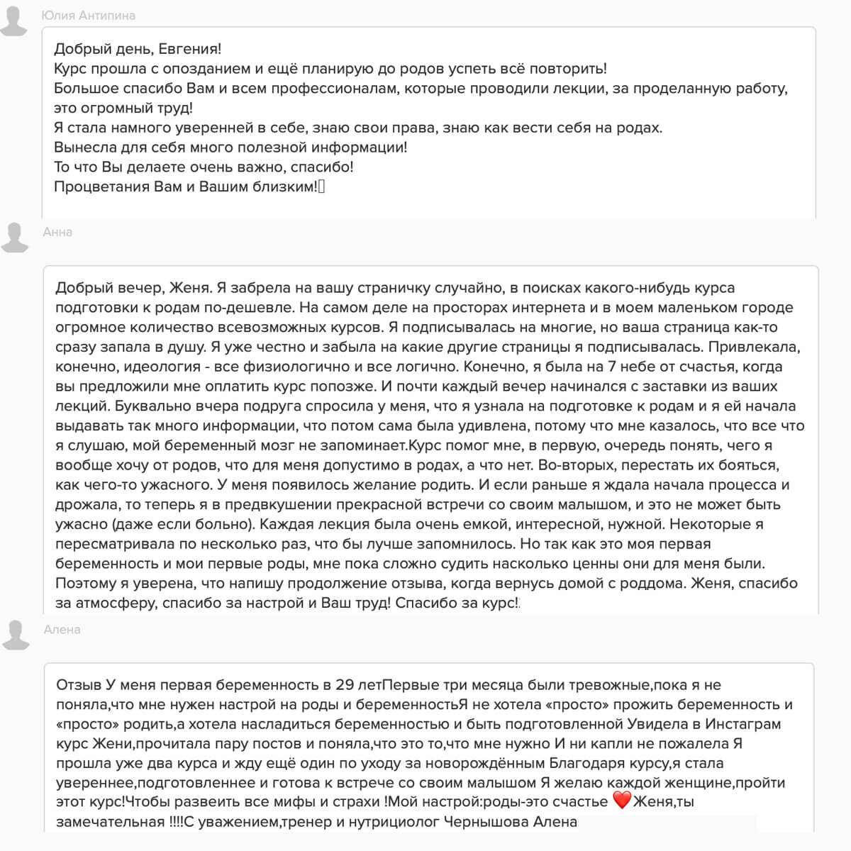 Шикарный курс и подача информации, очень подробные лекции с таааким количеством информации! Отдельная благодарность за прямые эфиры, ты просто заряжаешь уверенностью и спокойствием! Итоги у меня такие - реально ушел страх родов - что пойдет что то не так, попаду в не тот роддом, а как потом? Сейчас есть спокойствие, осознание того, что принимаю любое развитие ситуации, уверенность в себе и своих силах, и ещё не страх, а любопытство и интерес, и я готова к этому путешествию в Роды благодаря тебе и твоему курсу!