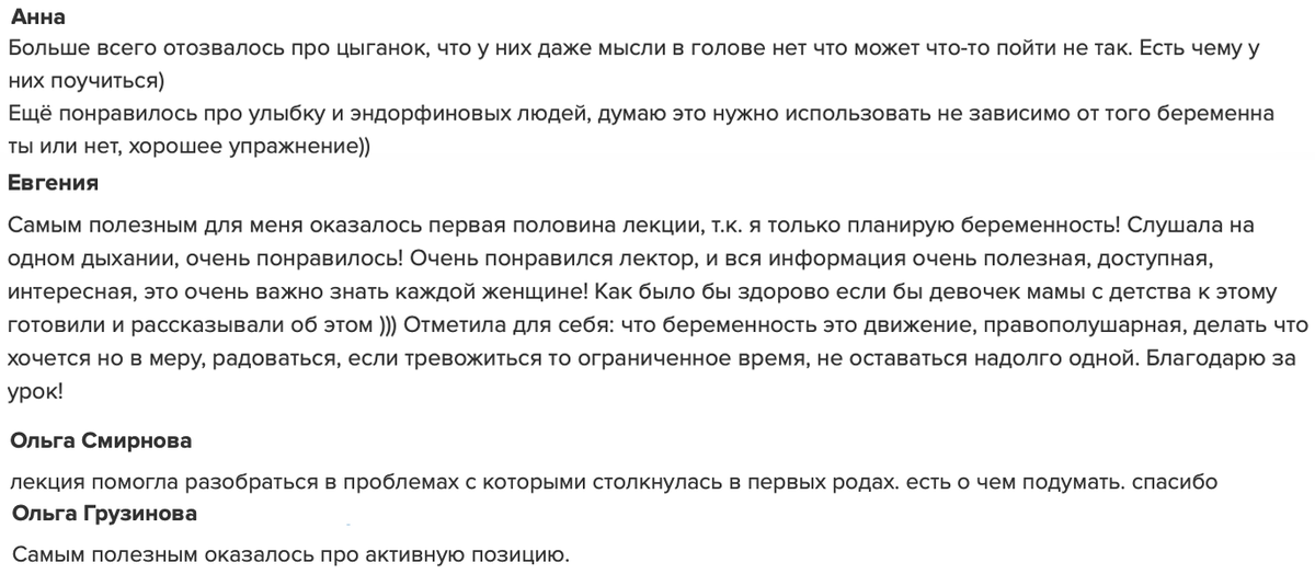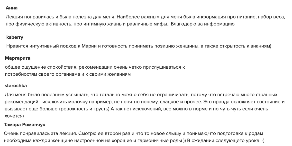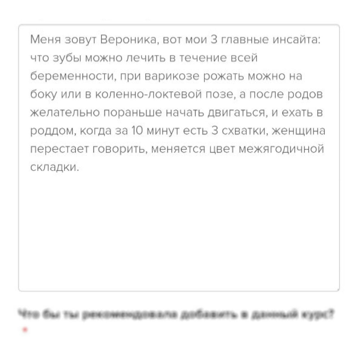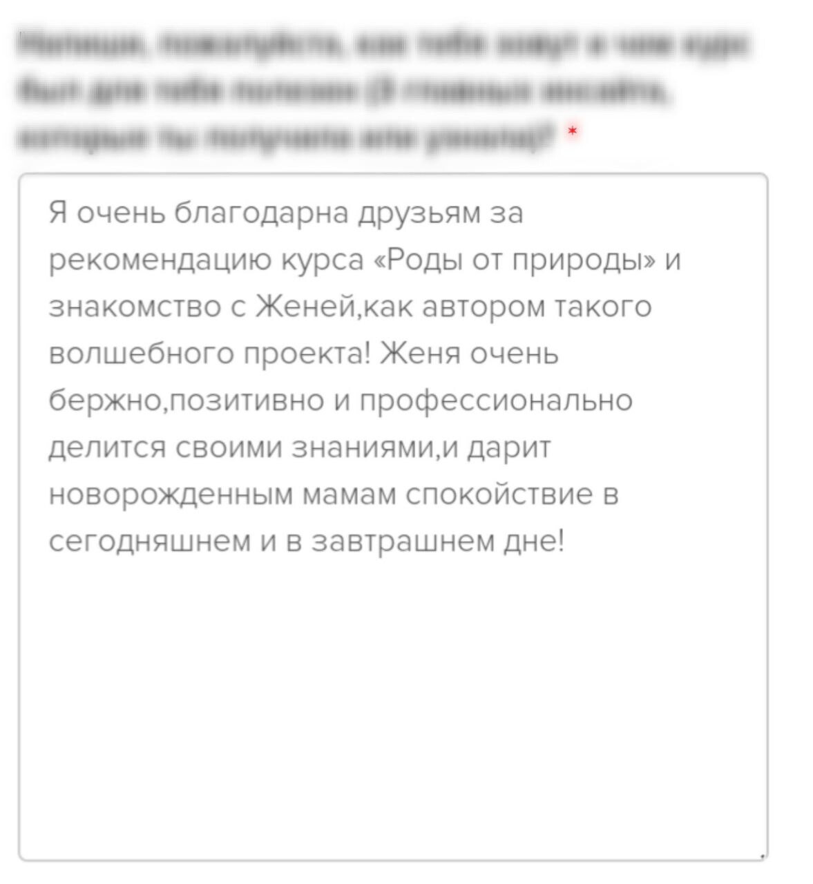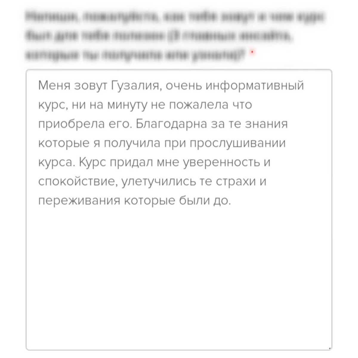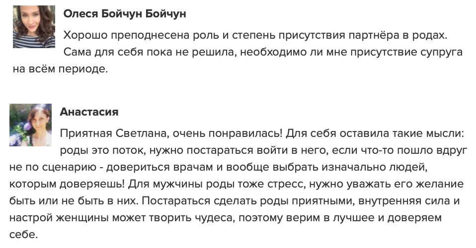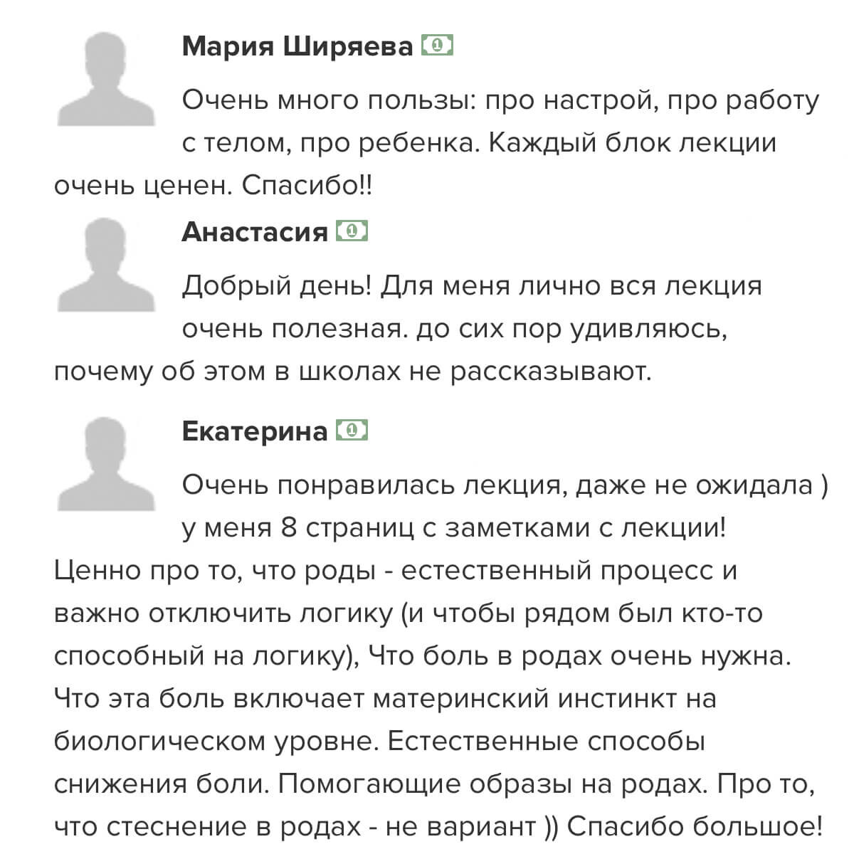 Шикарный курс и подача информации, очень подробные лекции с таааким количеством информации! Отдельная благодарность за прямые эфиры, ты просто заряжаешь уверенностью и спокойствием! Итоги у меня такие - реально ушел страх родов - что пойдет что то не так, попаду в не тот роддом, а как потом? Сейчас есть спокойствие, осознание того, что принимаю любое развитие ситуации, уверенность в себе и своих силах, и ещё не страх, а любопытство и интерес, и я готова к этому путешествию в Роды благодаря тебе и твоему курсу!