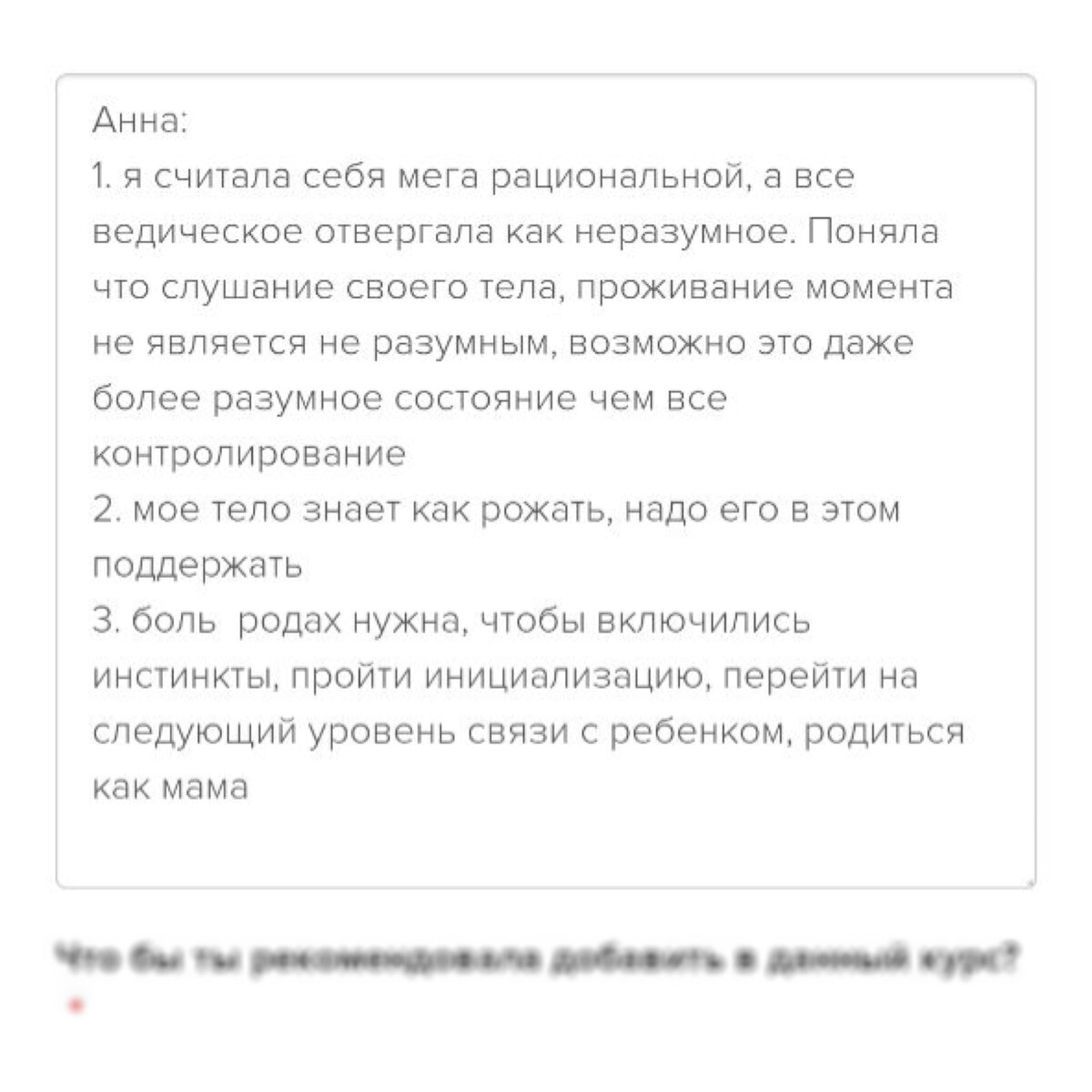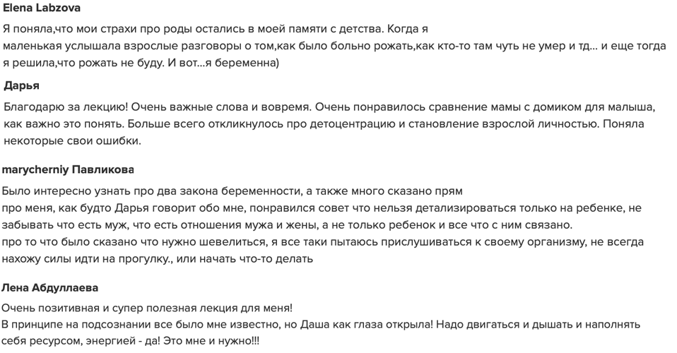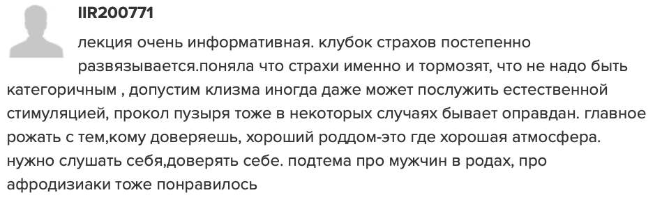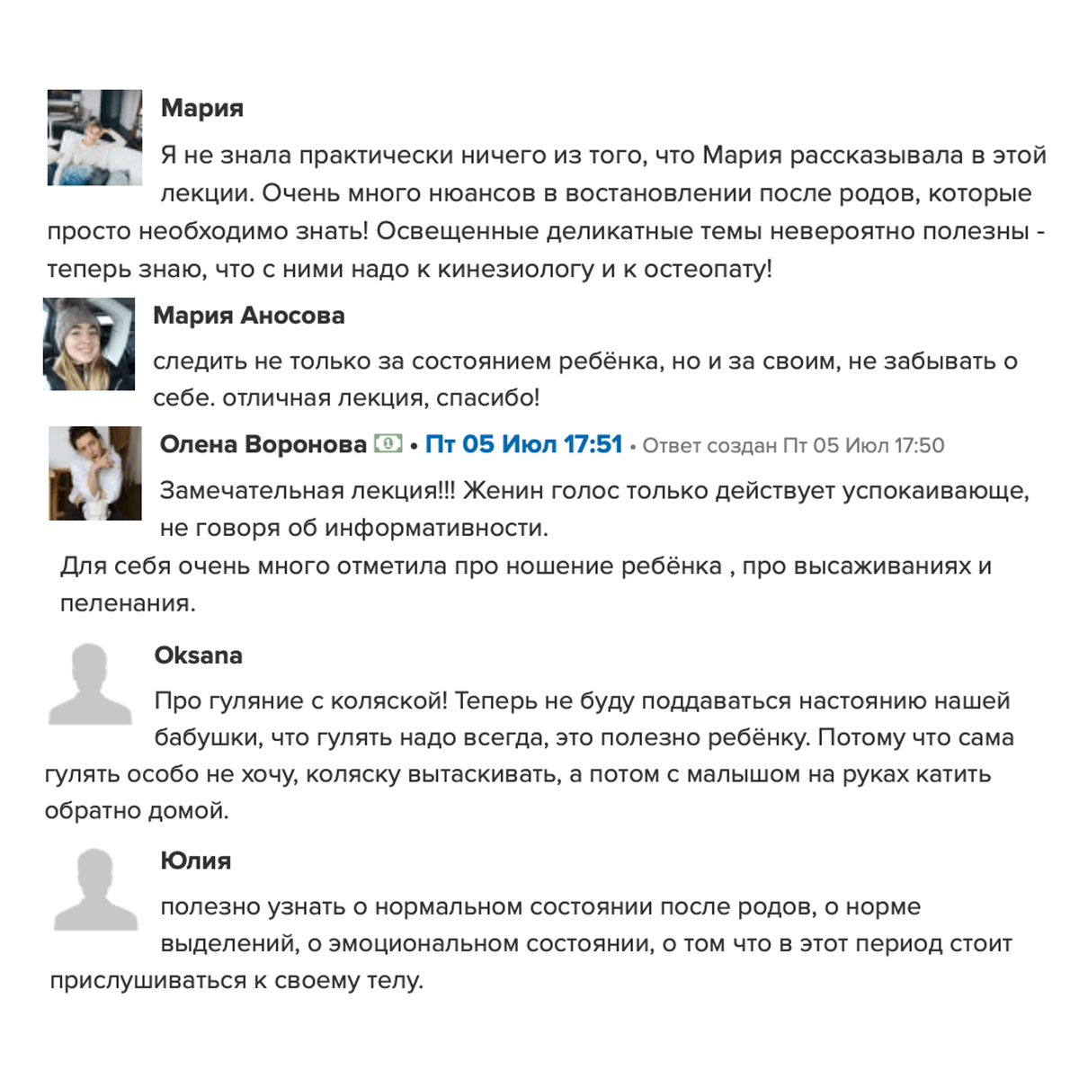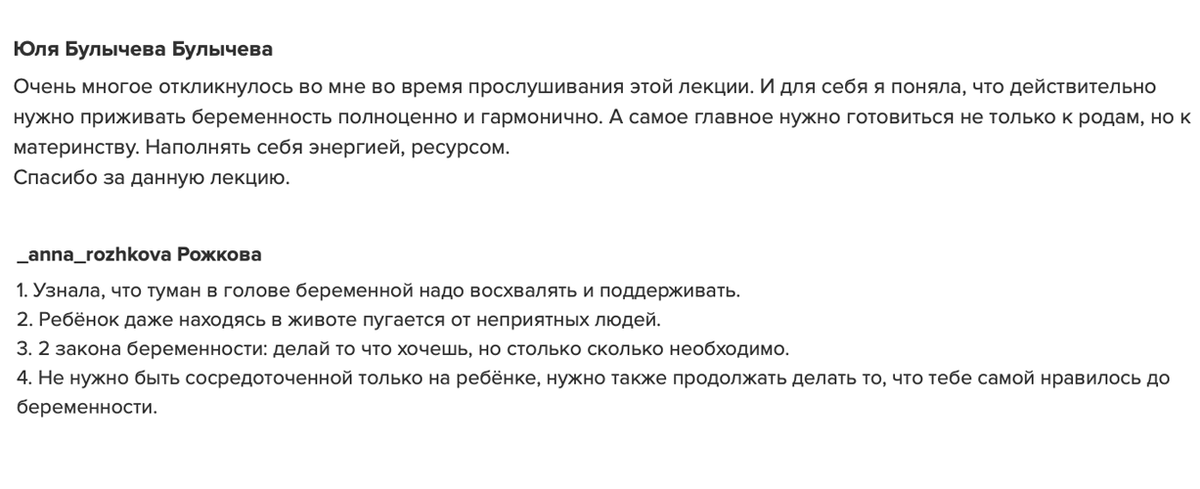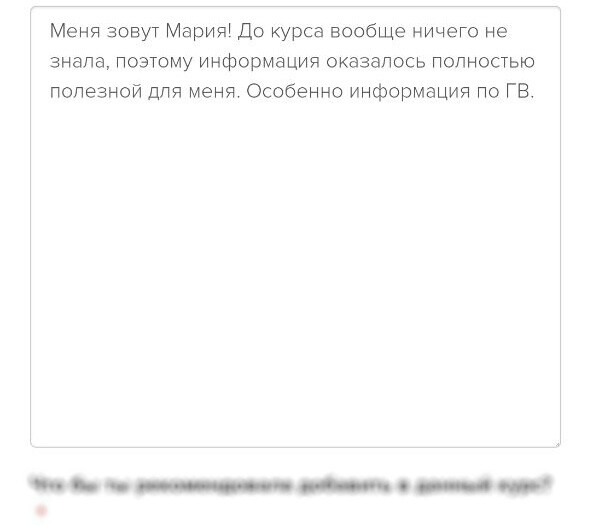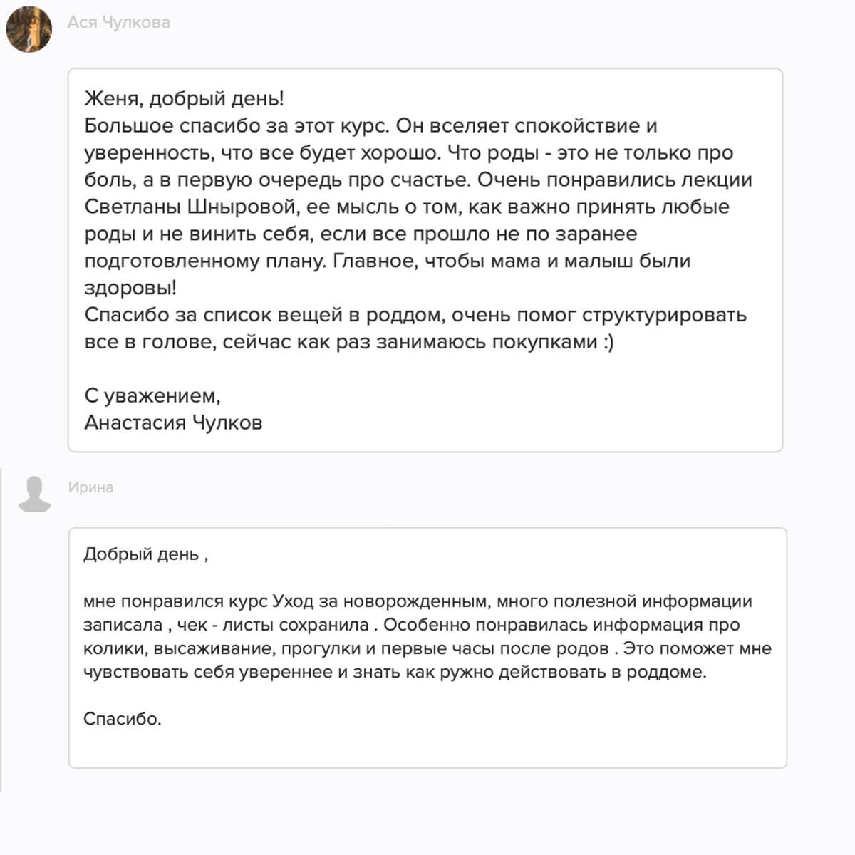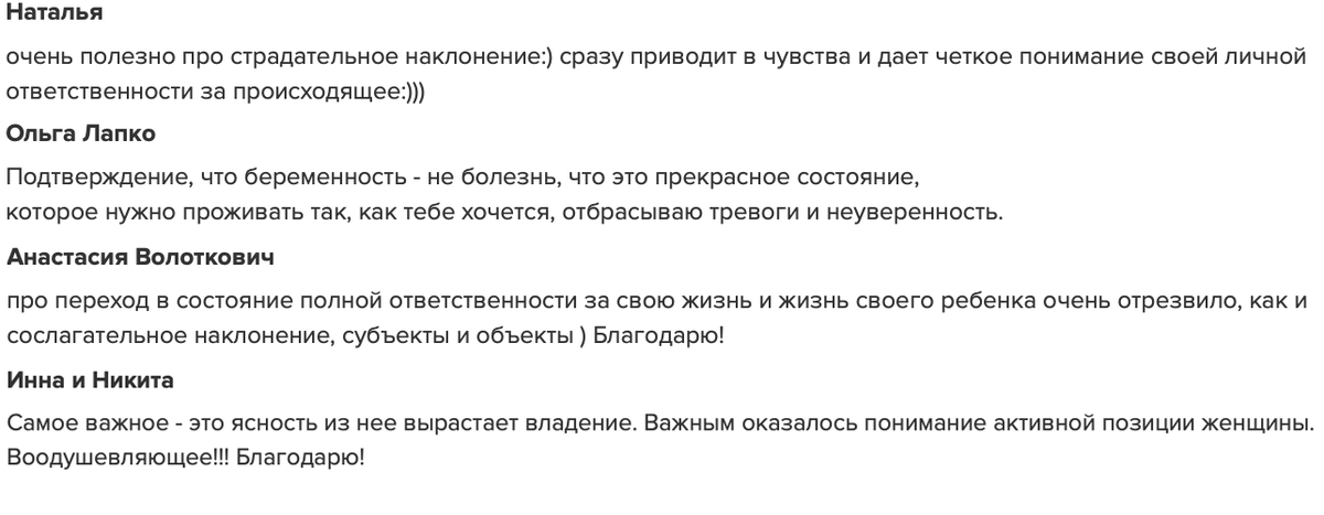 Шикарный курс и подача информации, очень подробные лекции с таааким количеством информации! Отдельная благодарность за прямые эфиры, ты просто заряжаешь уверенностью и спокойствием! Итоги у меня такие - реально ушел страх родов - что пойдет что то не так, попаду в не тот роддом, а как потом? Сейчас есть спокойствие, осознание того, что принимаю любое развитие ситуации, уверенность в себе и своих силах, и ещё не страх, а любопытство и интерес, и я готова к этому путешествию в Роды благодаря тебе и твоему курсу!