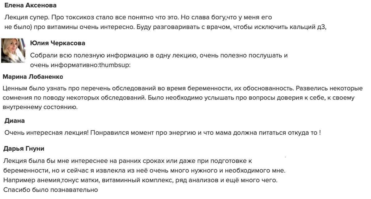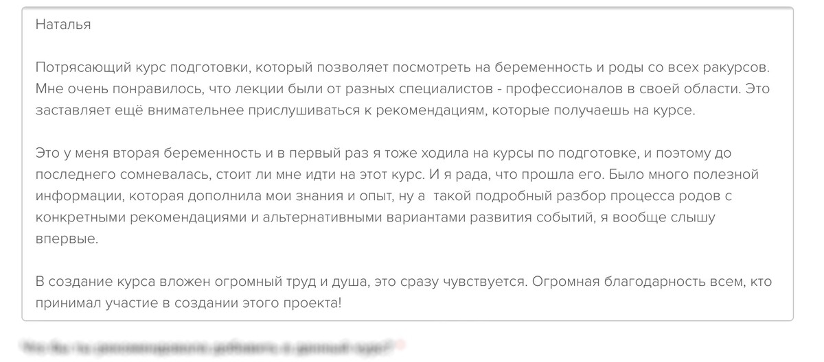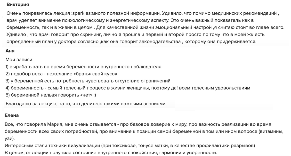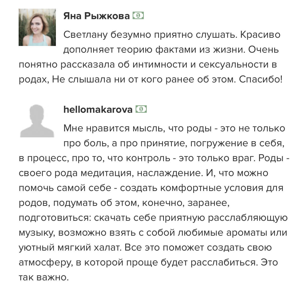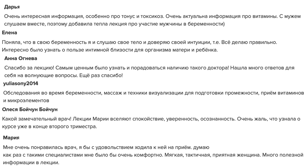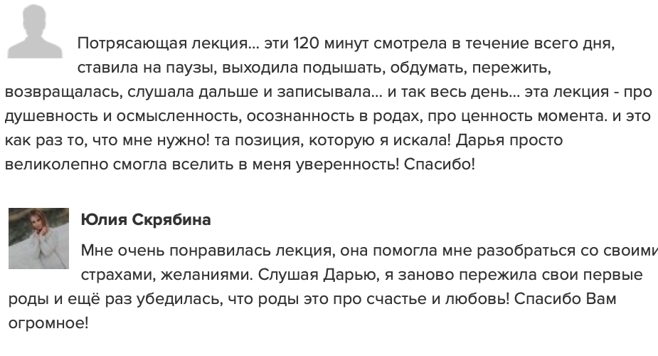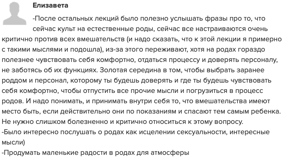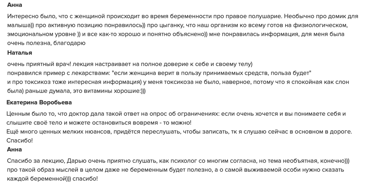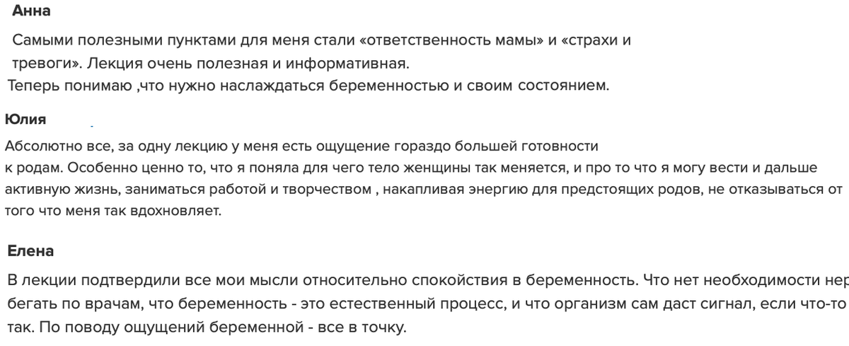 Шикарный курс и подача информации, очень подробные лекции с таааким количеством информации! Отдельная благодарность за прямые эфиры, ты просто заряжаешь уверенностью и спокойствием! Итоги у меня такие - реально ушел страх родов - что пойдет что то не так, попаду в не тот роддом, а как потом? Сейчас есть спокойствие, осознание того, что принимаю любое развитие ситуации, уверенность в себе и своих силах, и ещё не страх, а любопытство и интерес, и я готова к этому путешествию в Роды благодаря тебе и твоему курсу!