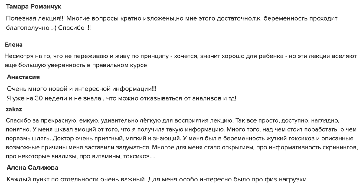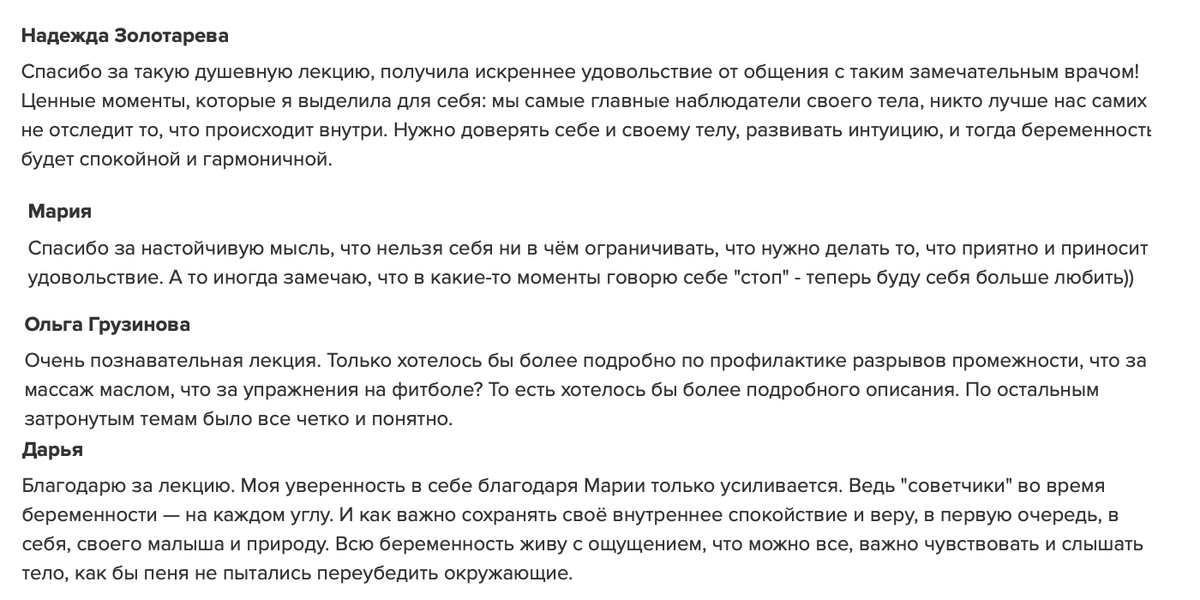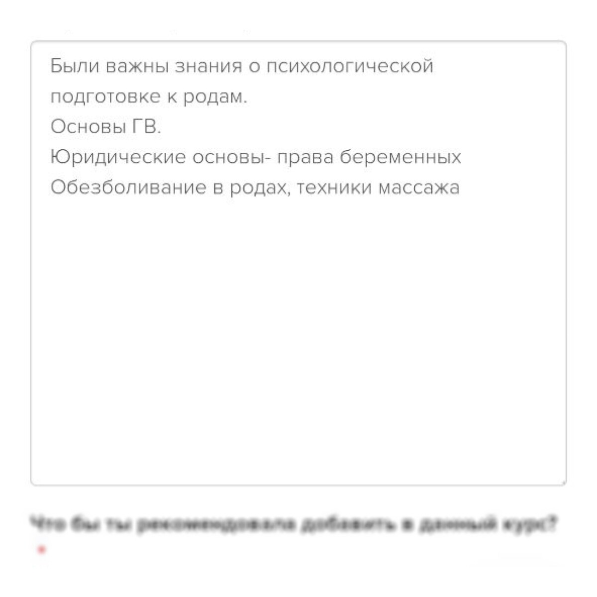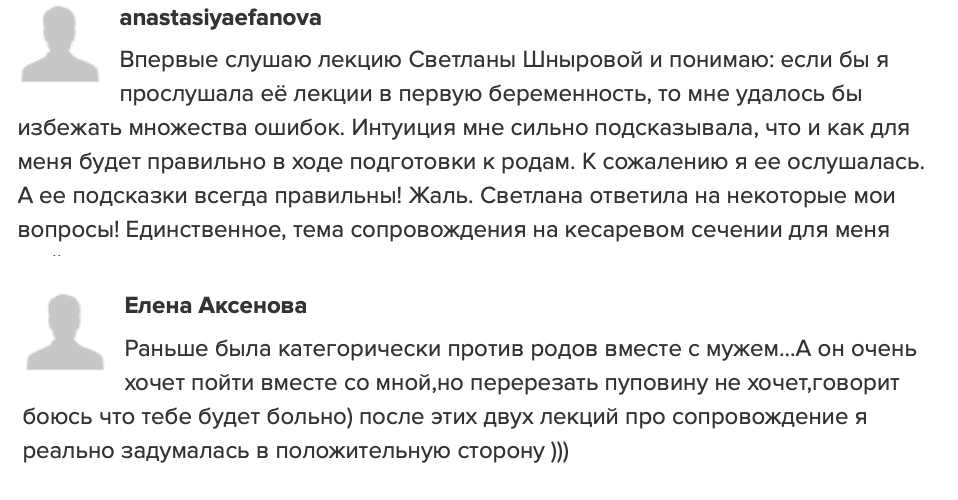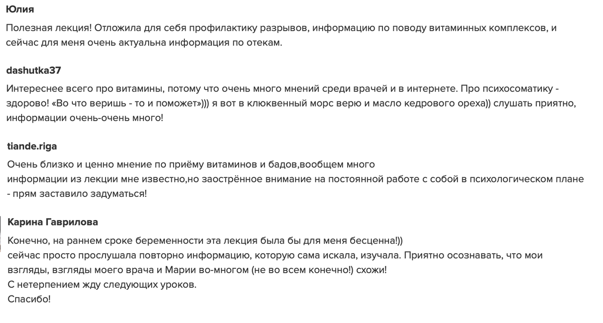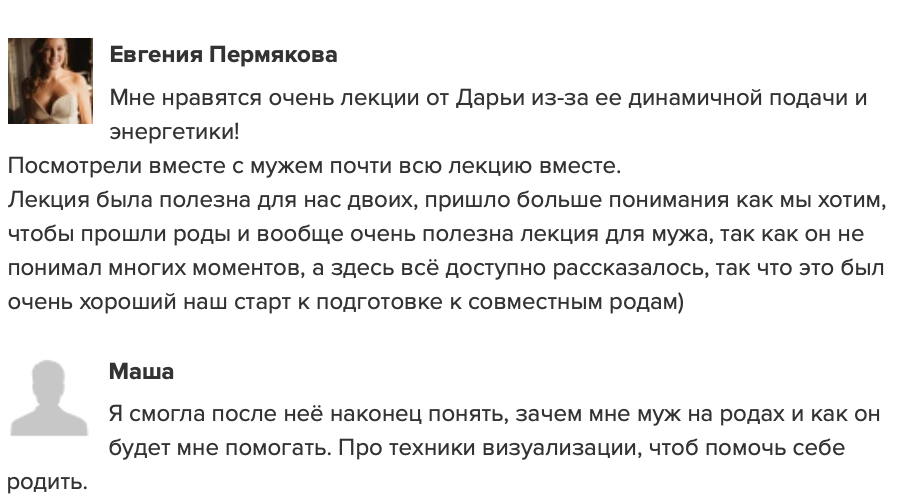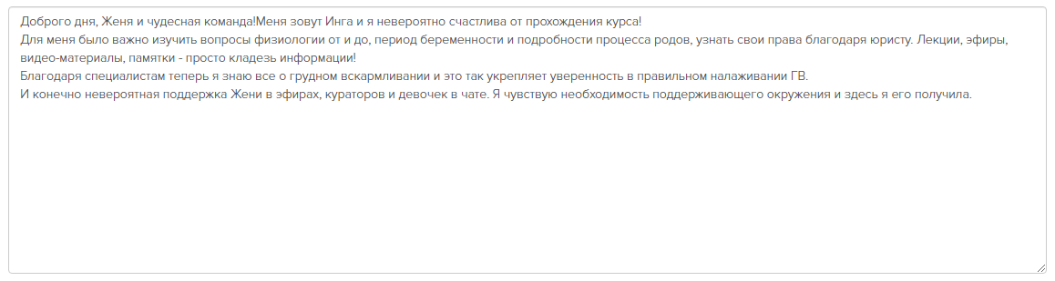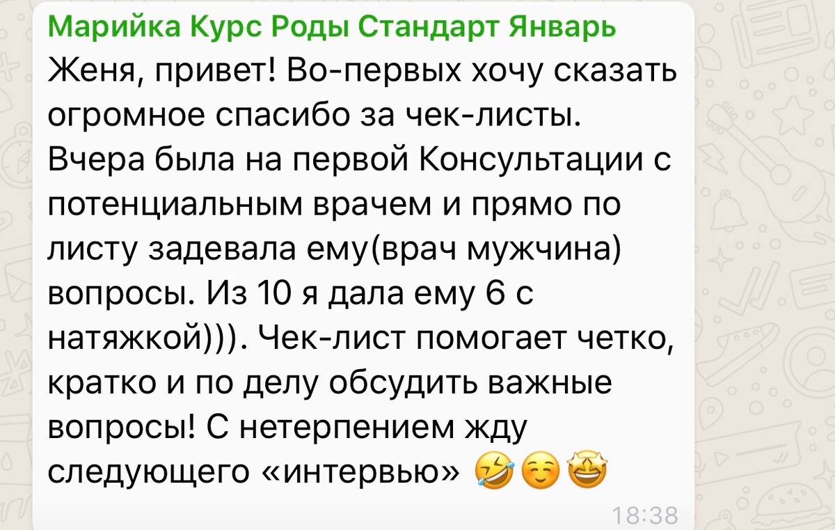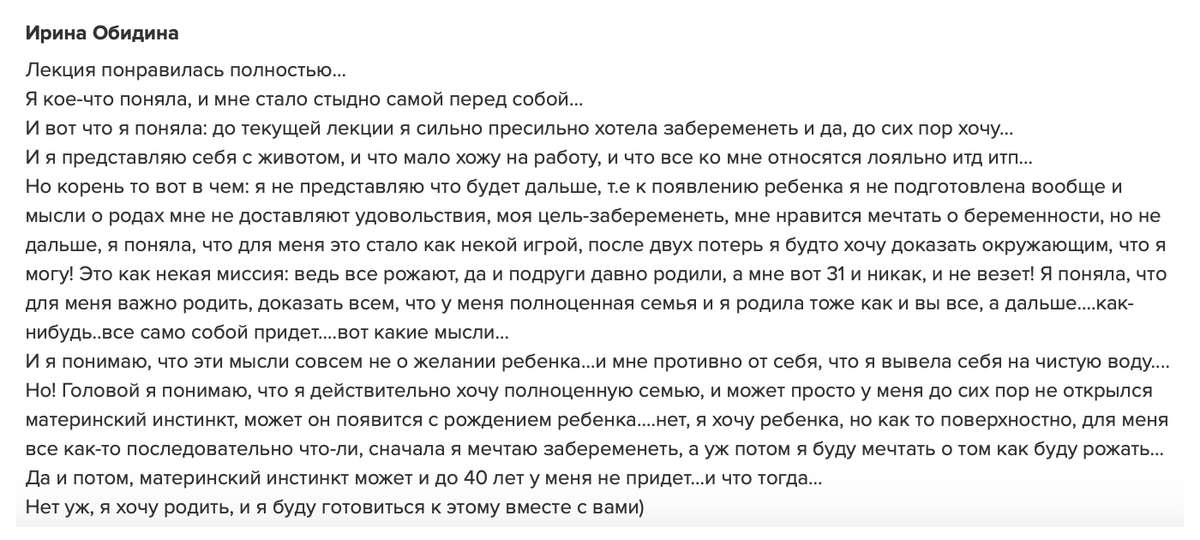 Шикарный курс и подача информации, очень подробные лекции с таааким количеством информации! Отдельная благодарность за прямые эфиры, ты просто заряжаешь уверенностью и спокойствием! Итоги у меня такие - реально ушел страх родов - что пойдет что то не так, попаду в не тот роддом, а как потом? Сейчас есть спокойствие, осознание того, что принимаю любое развитие ситуации, уверенность в себе и своих силах, и ещё не страх, а любопытство и интерес, и я готова к этому путешествию в Роды благодаря тебе и твоему курсу!