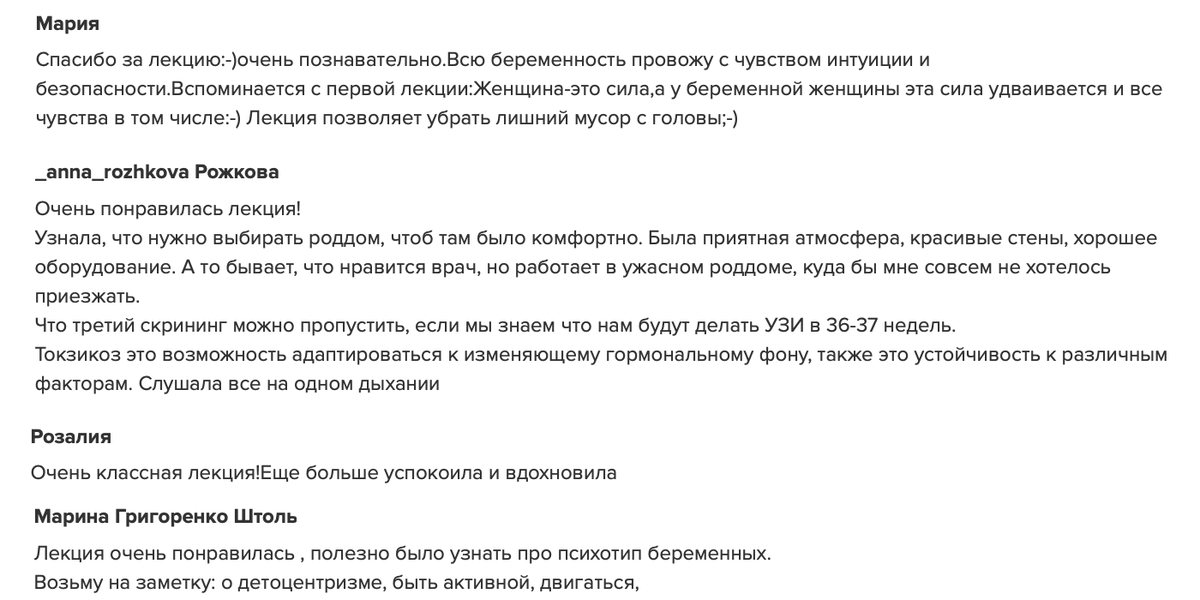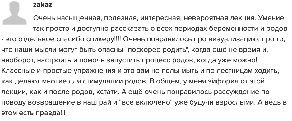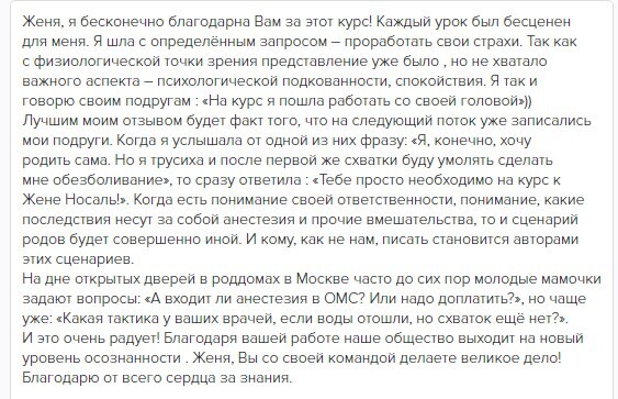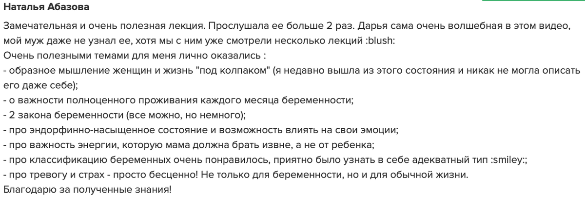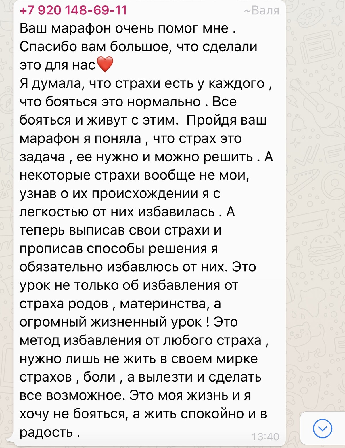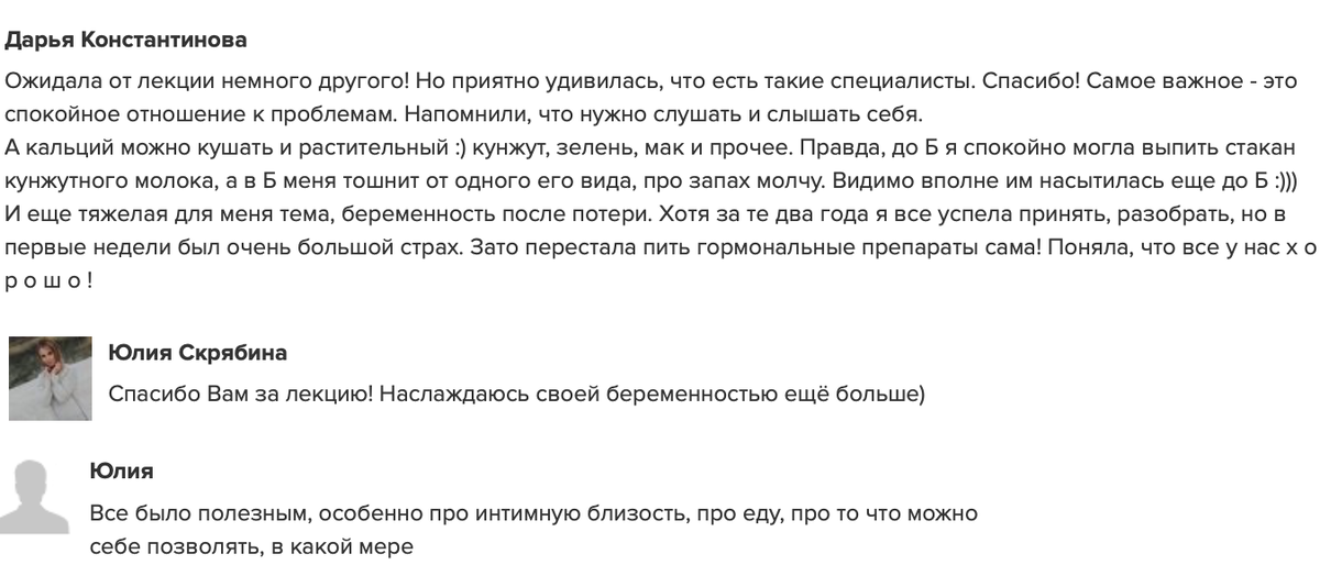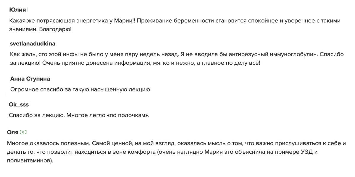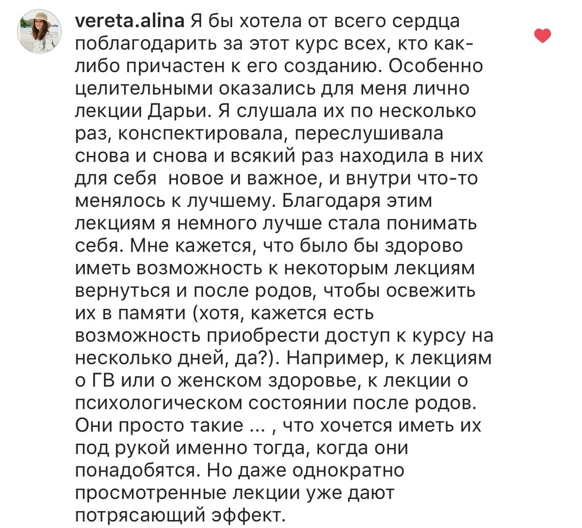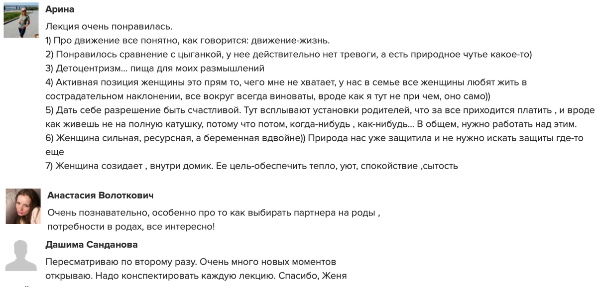 Шикарный курс и подача информации, очень подробные лекции с таааким количеством информации! Отдельная благодарность за прямые эфиры, ты просто заряжаешь уверенностью и спокойствием! Итоги у меня такие - реально ушел страх родов - что пойдет что то не так, попаду в не тот роддом, а как потом? Сейчас есть спокойствие, осознание того, что принимаю любое развитие ситуации, уверенность в себе и своих силах, и ещё не страх, а любопытство и интерес, и я готова к этому путешествию в Роды благодаря тебе и твоему курсу!