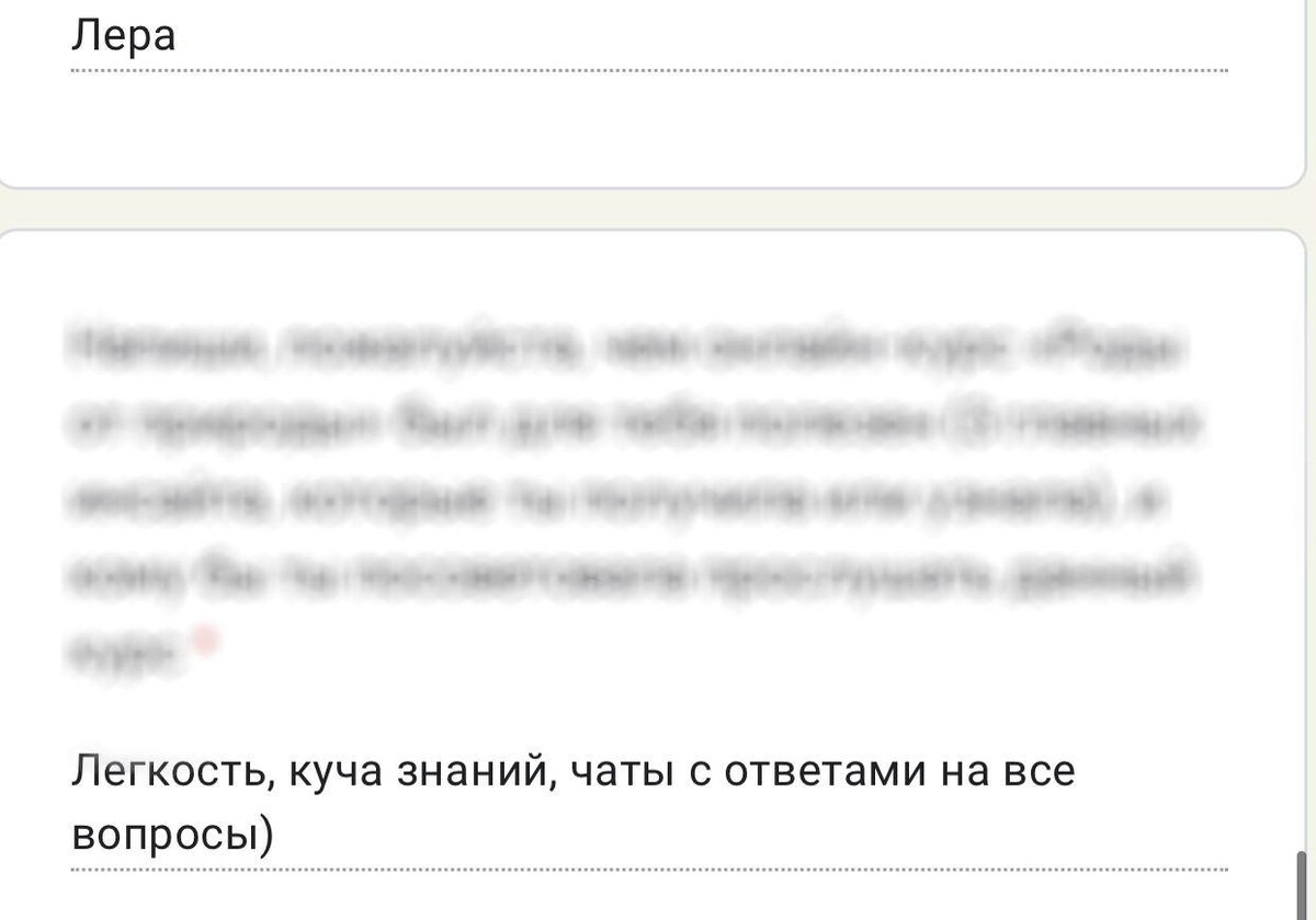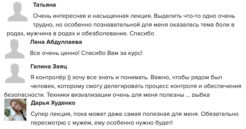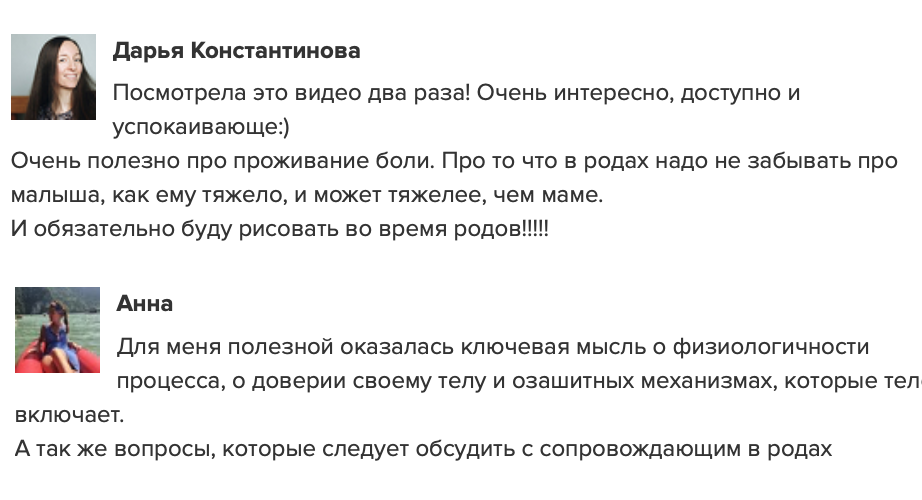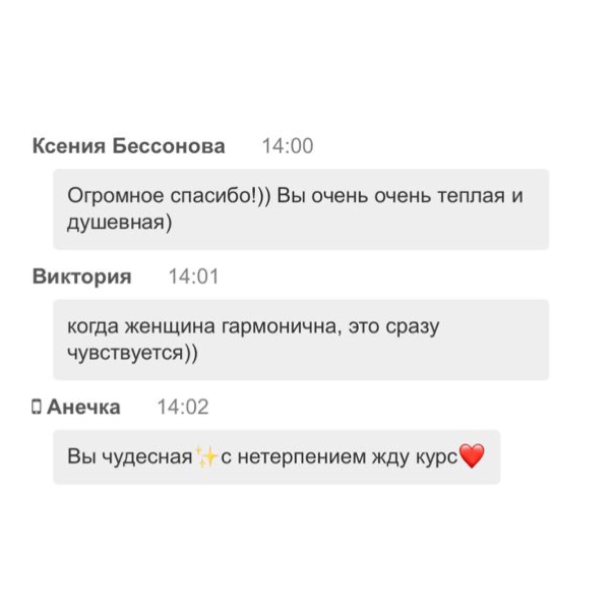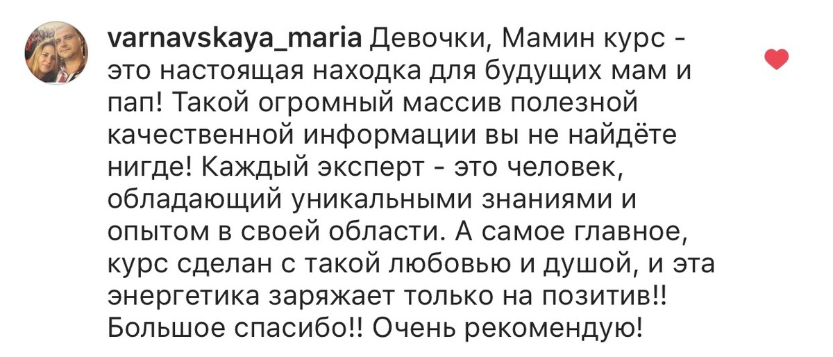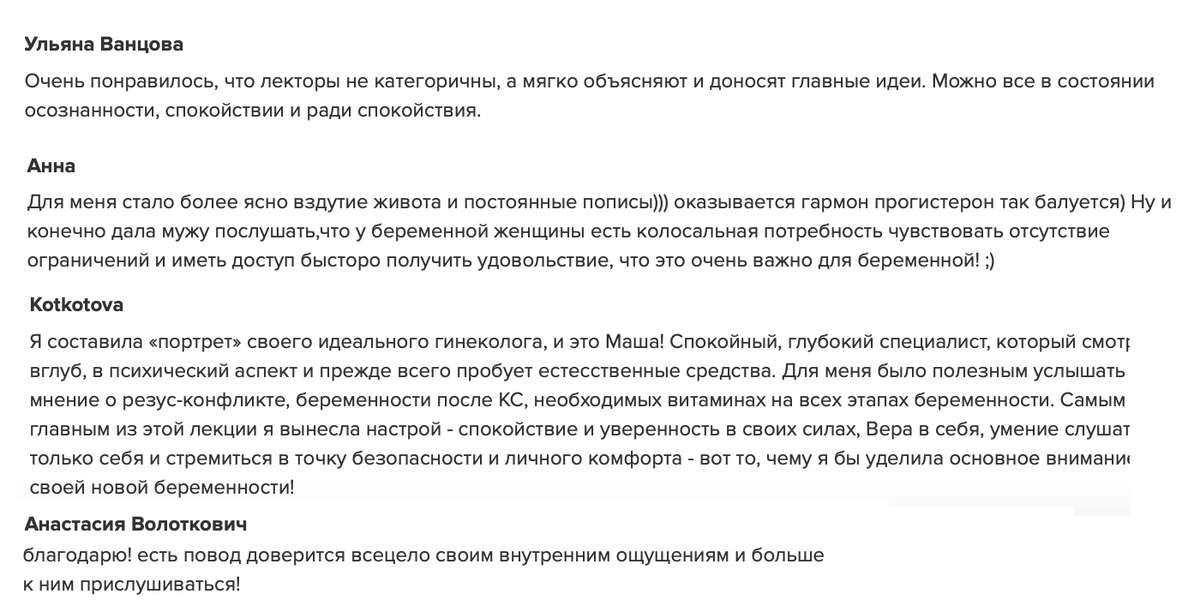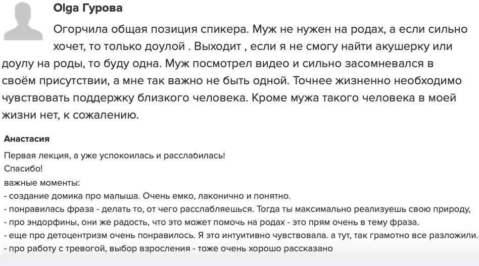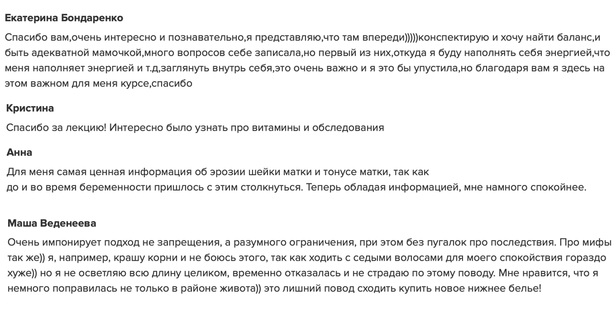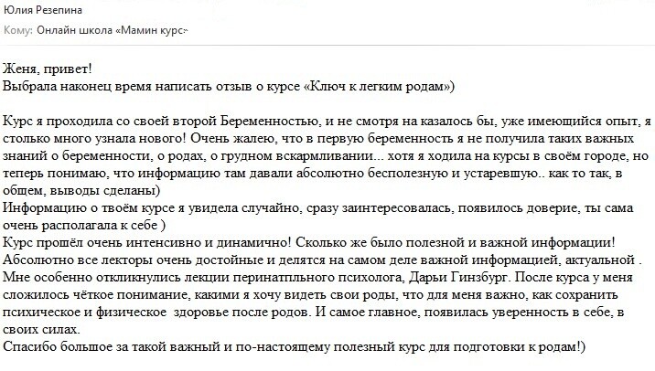 Шикарный курс и подача информации, очень подробные лекции с таааким количеством информации! Отдельная благодарность за прямые эфиры, ты просто заряжаешь уверенностью и спокойствием! Итоги у меня такие - реально ушел страх родов - что пойдет что то не так, попаду в не тот роддом, а как потом? Сейчас есть спокойствие, осознание того, что принимаю любое развитие ситуации, уверенность в себе и своих силах, и ещё не страх, а любопытство и интерес, и я готова к этому путешествию в Роды благодаря тебе и твоему курсу!