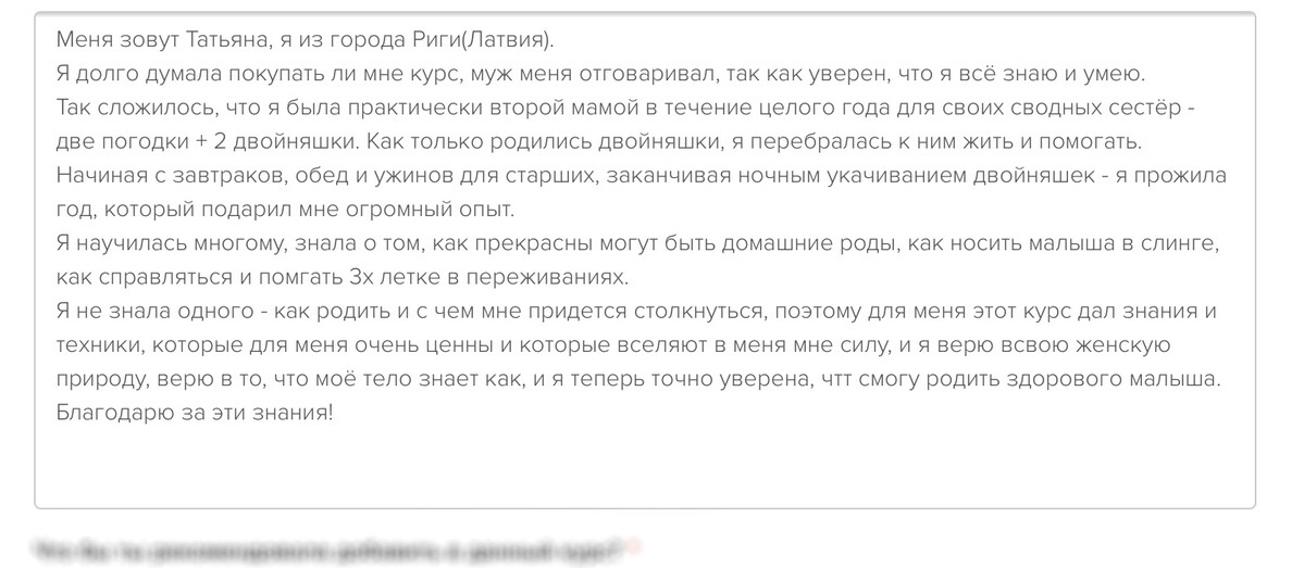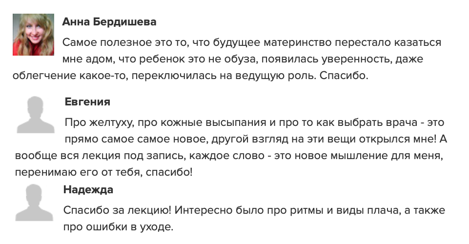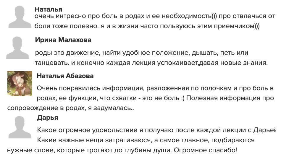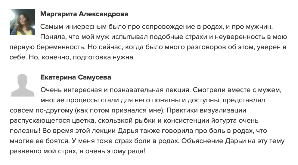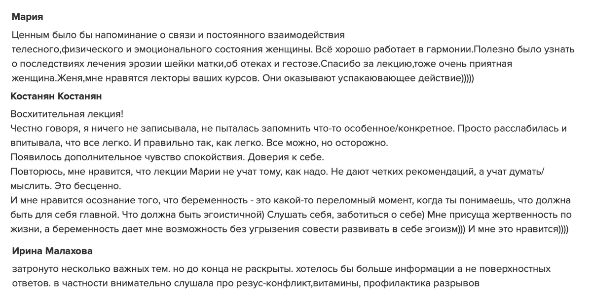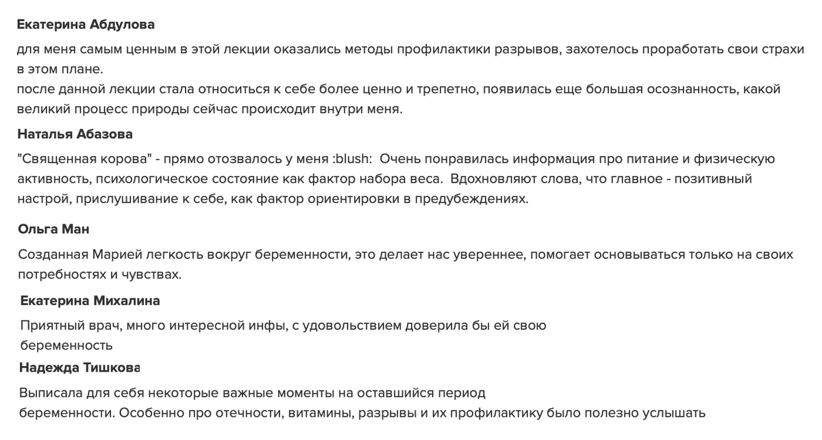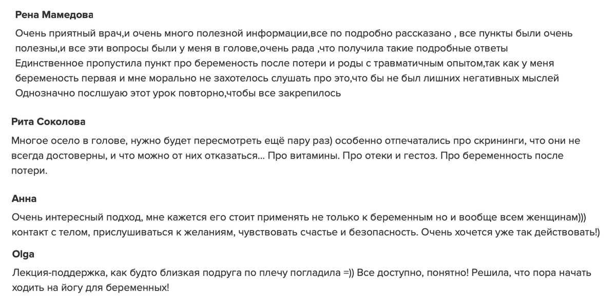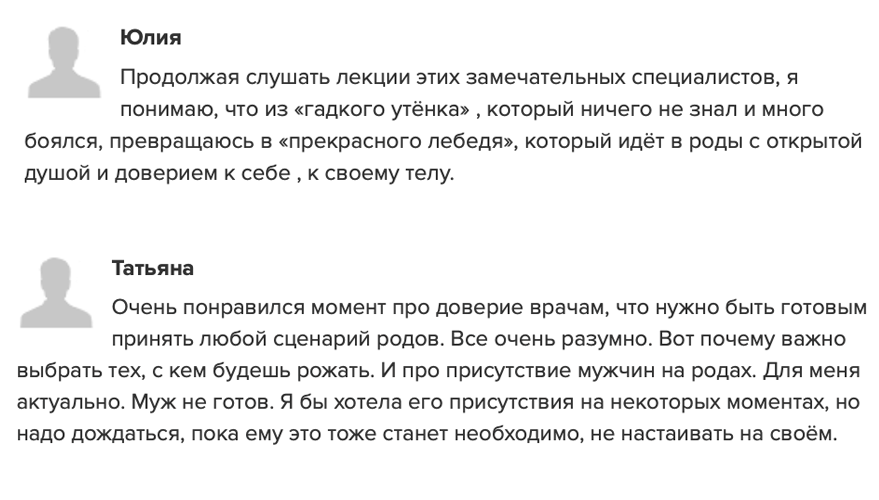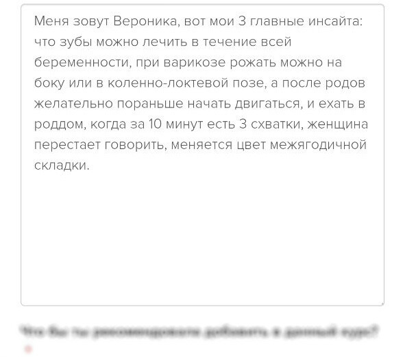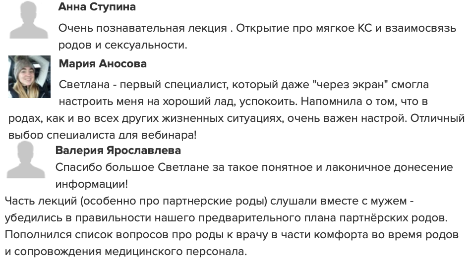 Шикарный курс и подача информации, очень подробные лекции с таааким количеством информации! Отдельная благодарность за прямые эфиры, ты просто заряжаешь уверенностью и спокойствием! Итоги у меня такие - реально ушел страх родов - что пойдет что то не так, попаду в не тот роддом, а как потом? Сейчас есть спокойствие, осознание того, что принимаю любое развитие ситуации, уверенность в себе и своих силах, и ещё не страх, а любопытство и интерес, и я готова к этому путешествию в Роды благодаря тебе и твоему курсу!