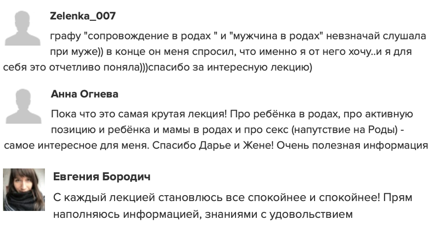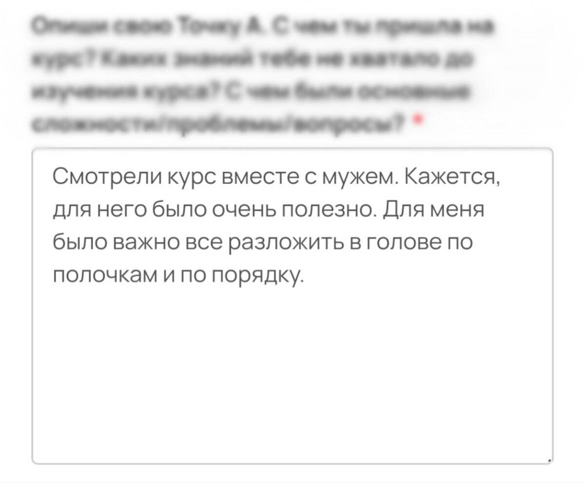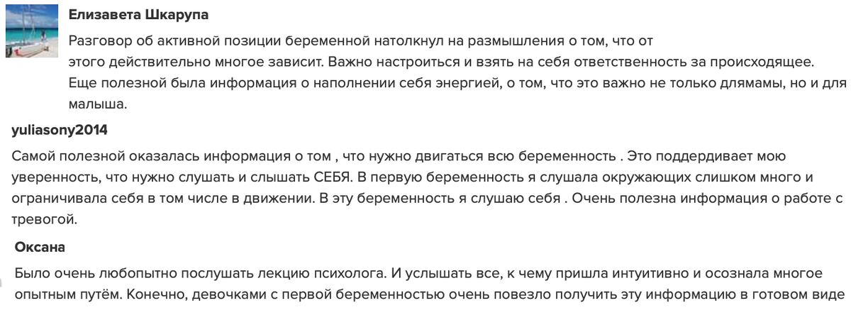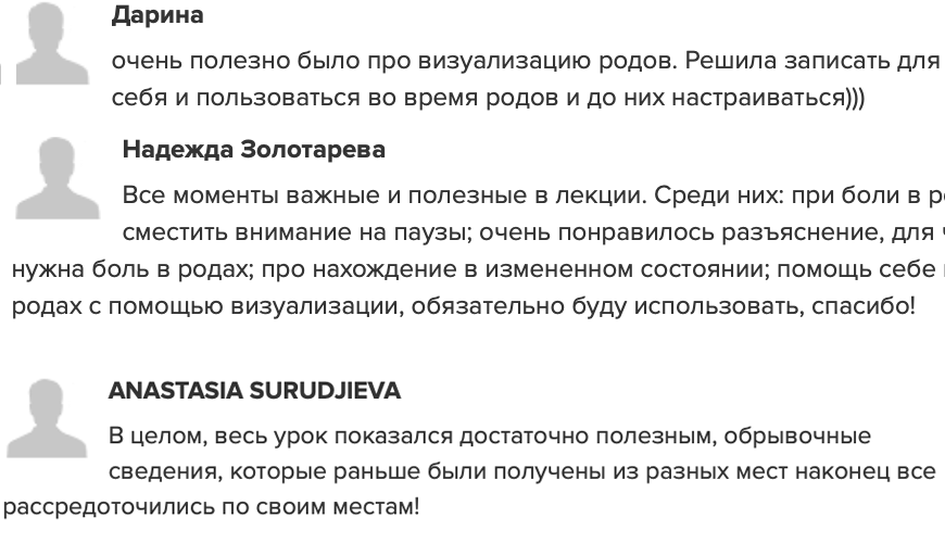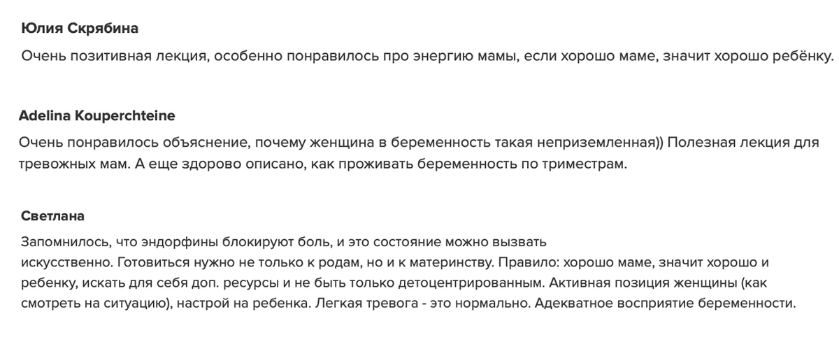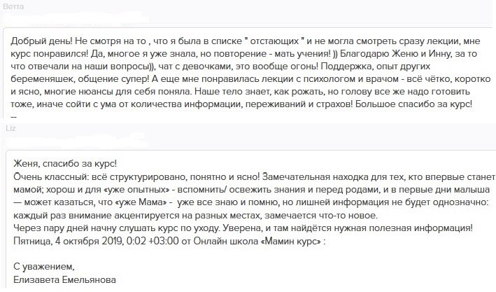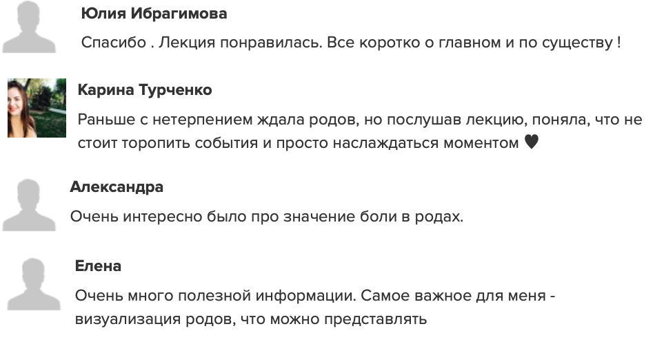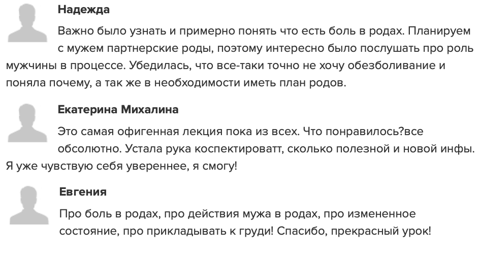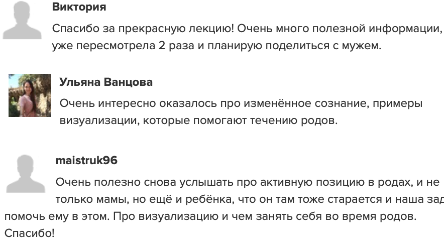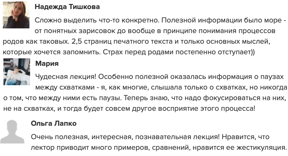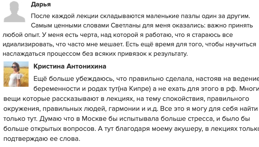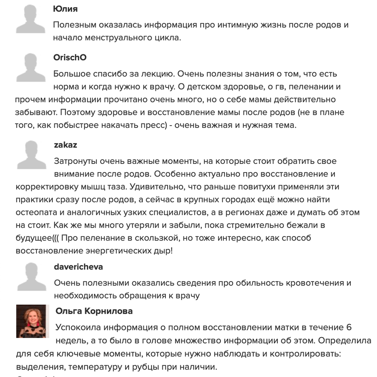 Шикарный курс и подача информации, очень подробные лекции с таааким количеством информации! Отдельная благодарность за прямые эфиры, ты просто заряжаешь уверенностью и спокойствием! Итоги у меня такие - реально ушел страх родов - что пойдет что то не так, попаду в не тот роддом, а как потом? Сейчас есть спокойствие, осознание того, что принимаю любое развитие ситуации, уверенность в себе и своих силах, и ещё не страх, а любопытство и интерес, и я готова к этому путешествию в Роды благодаря тебе и твоему курсу!