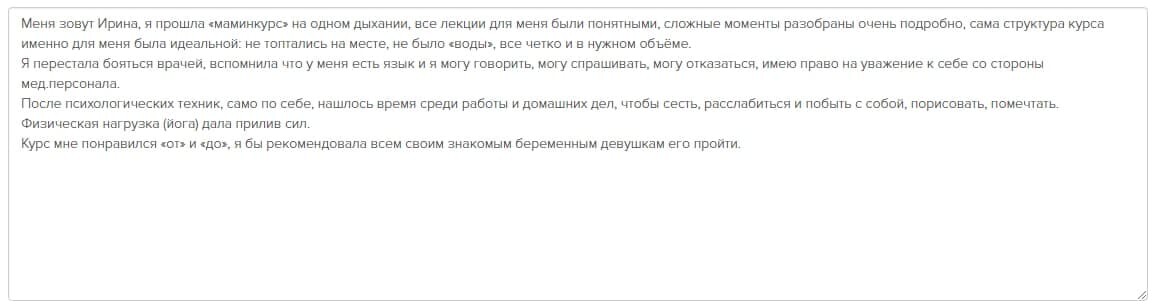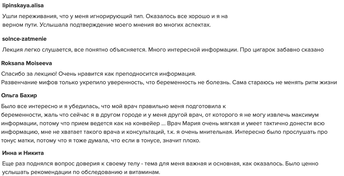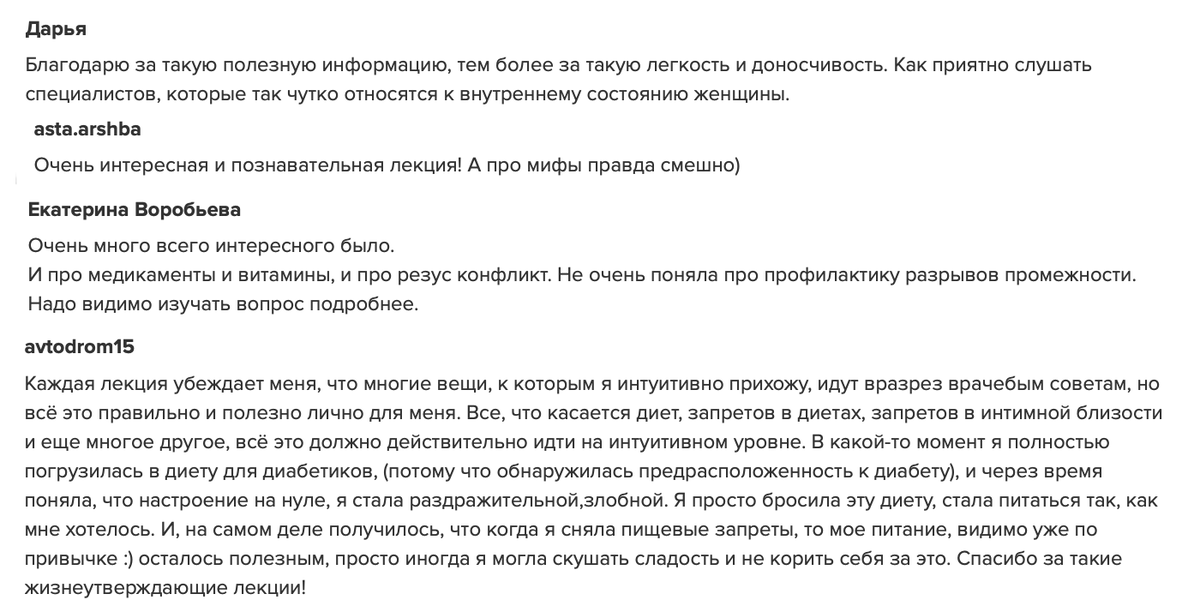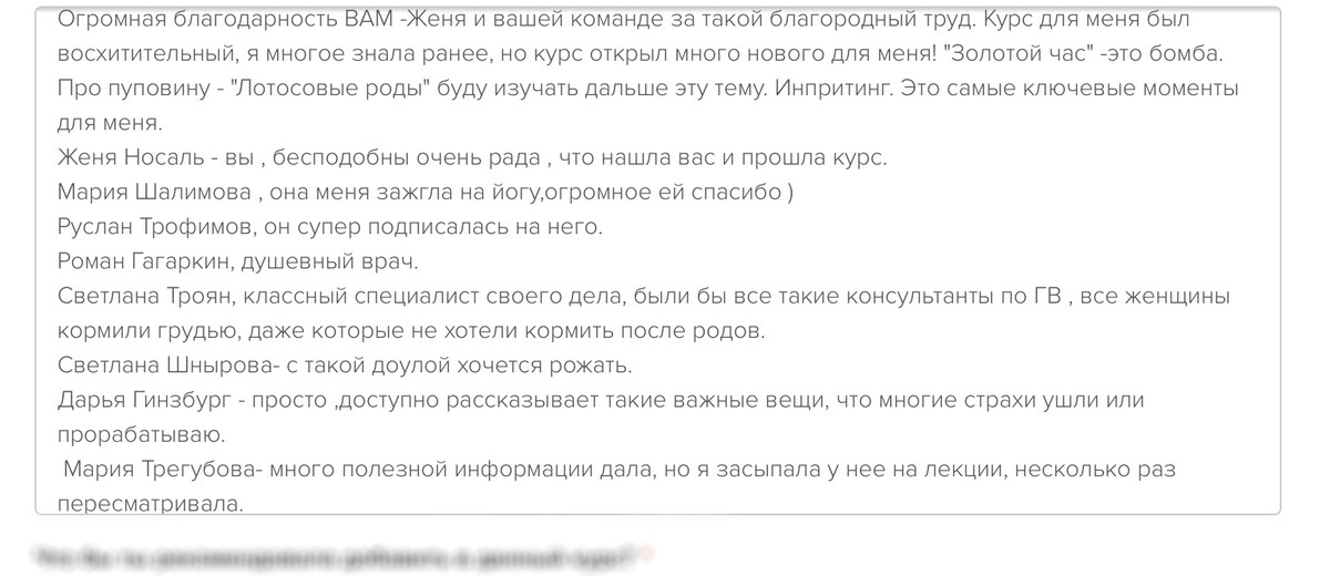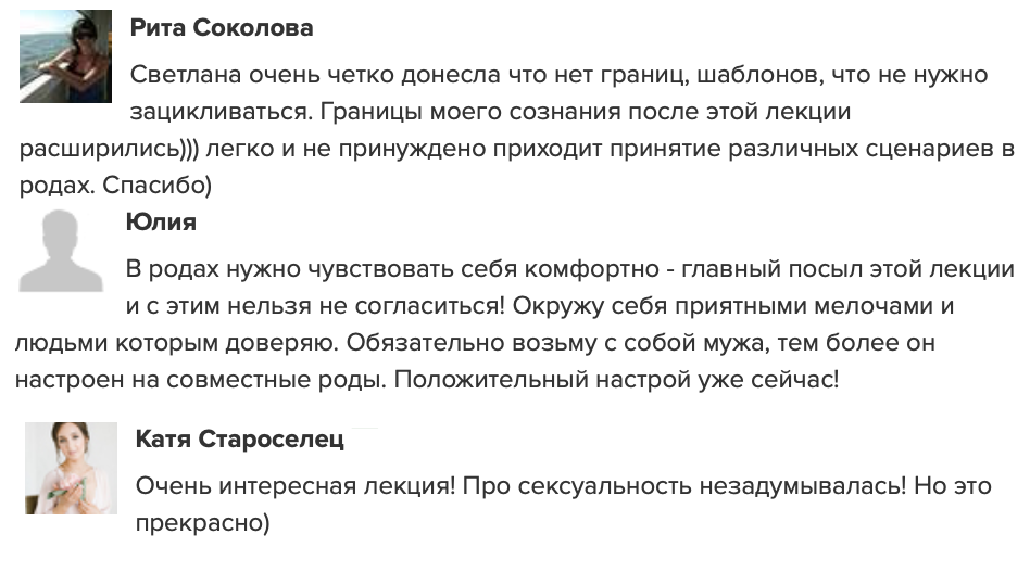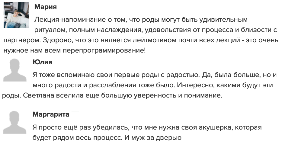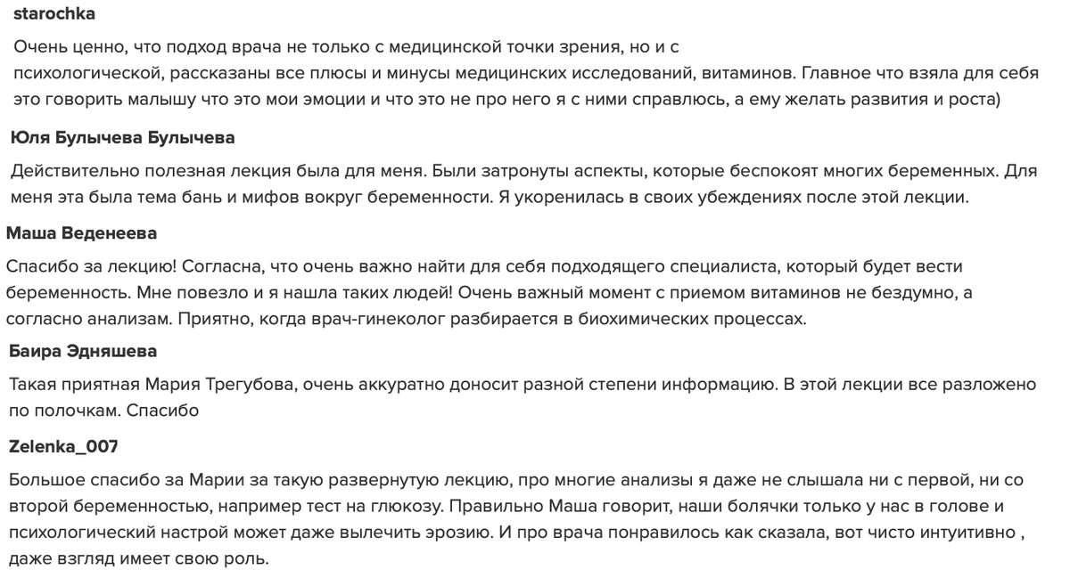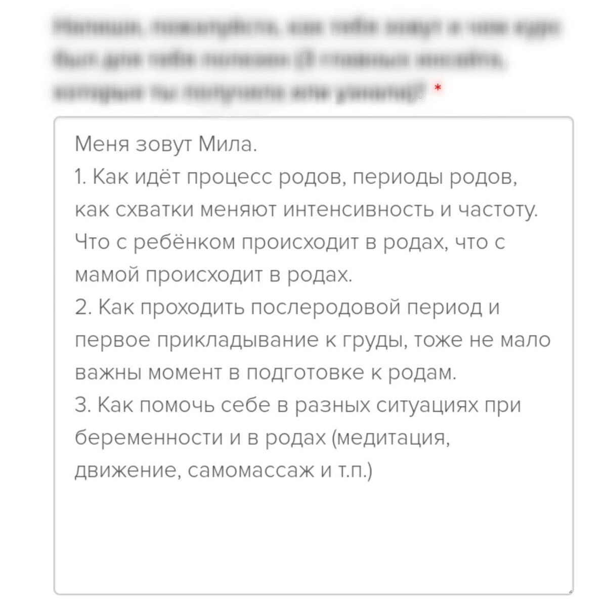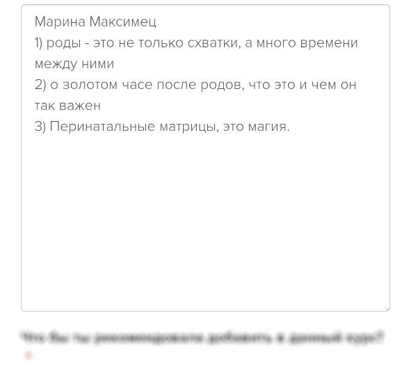 Шикарный курс и подача информации, очень подробные лекции с таааким количеством информации! Отдельная благодарность за прямые эфиры, ты просто заряжаешь уверенностью и спокойствием! Итоги у меня такие - реально ушел страх родов - что пойдет что то не так, попаду в не тот роддом, а как потом? Сейчас есть спокойствие, осознание того, что принимаю любое развитие ситуации, уверенность в себе и своих силах, и ещё не страх, а любопытство и интерес, и я готова к этому путешествию в Роды благодаря тебе и твоему курсу!