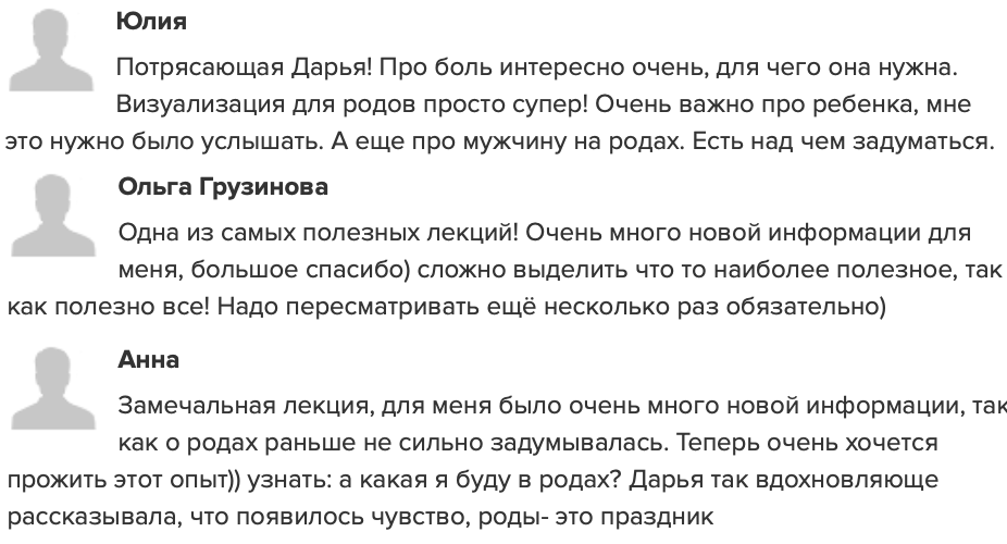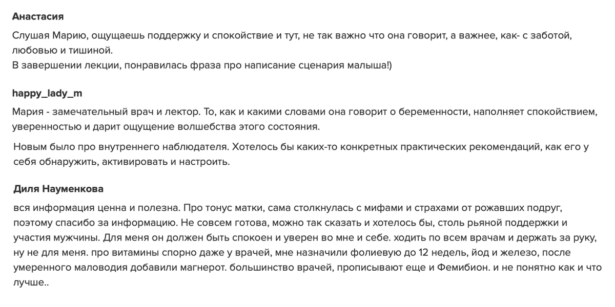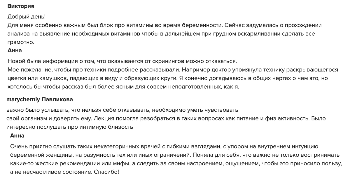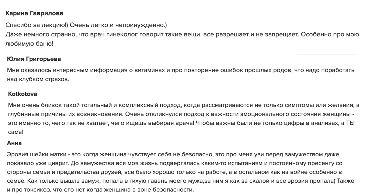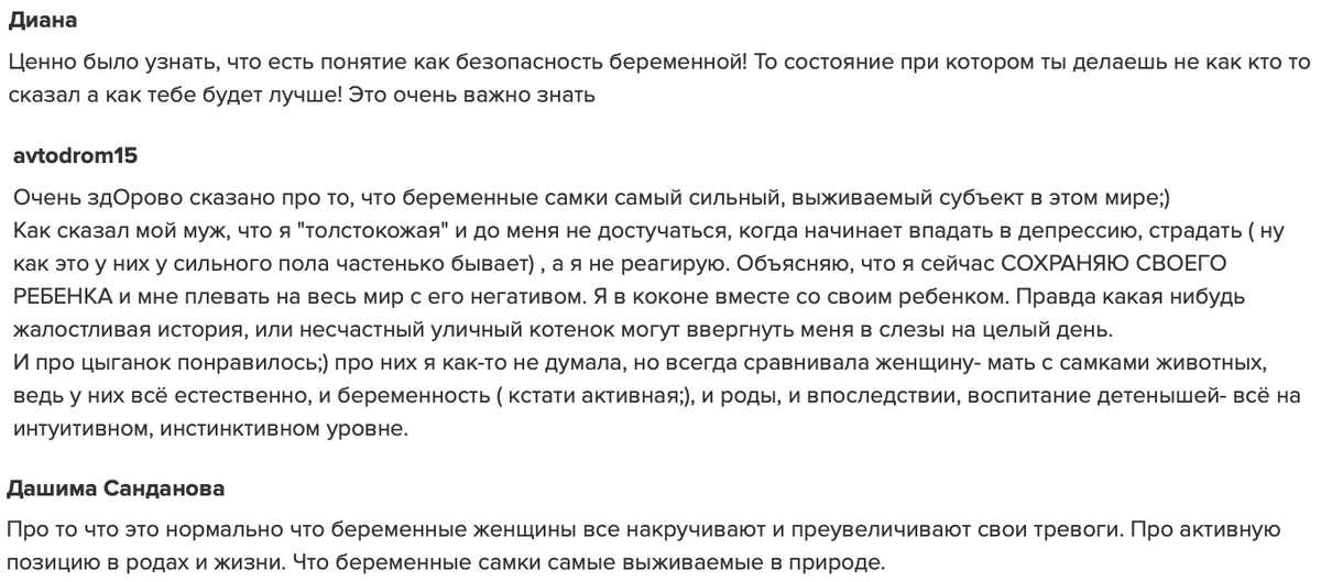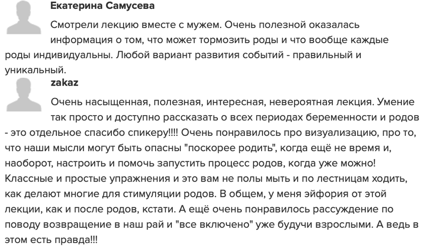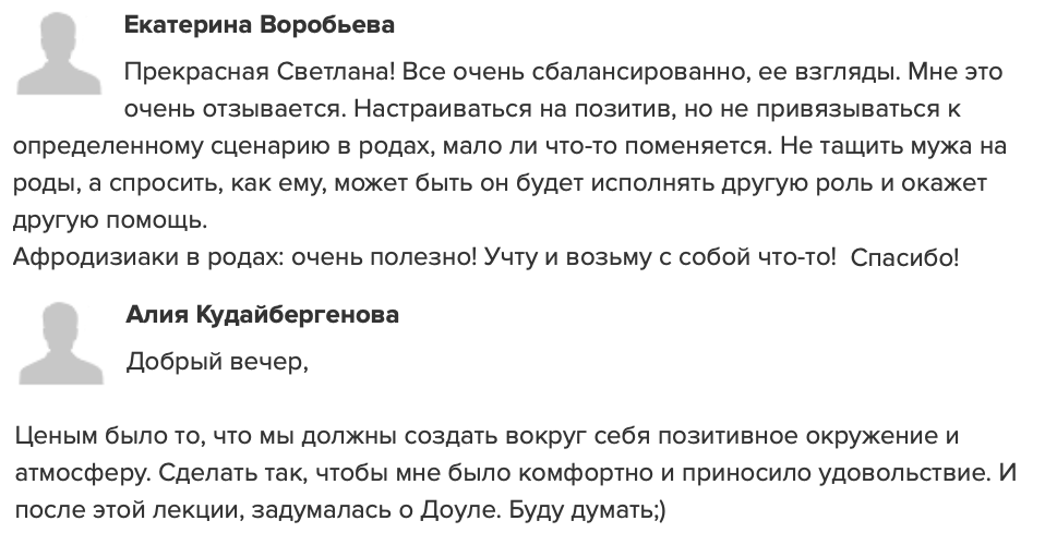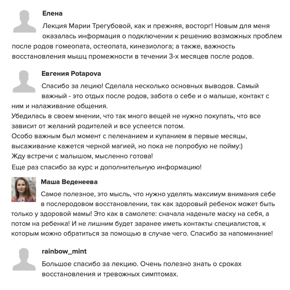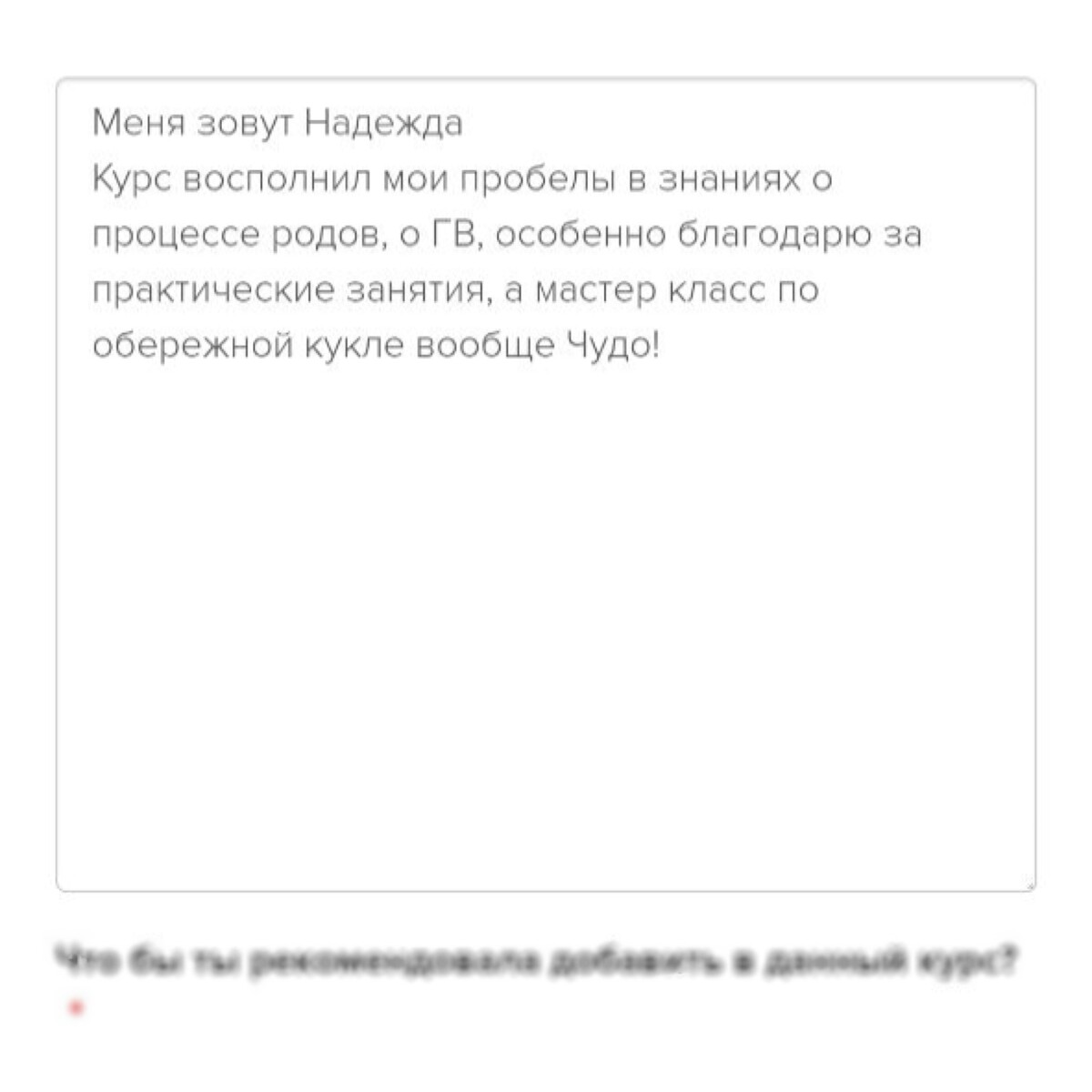 Шикарный курс и подача информации, очень подробные лекции с таааким количеством информации! Отдельная благодарность за прямые эфиры, ты просто заряжаешь уверенностью и спокойствием! Итоги у меня такие - реально ушел страх родов - что пойдет что то не так, попаду в не тот роддом, а как потом? Сейчас есть спокойствие, осознание того, что принимаю любое развитие ситуации, уверенность в себе и своих силах, и ещё не страх, а любопытство и интерес, и я готова к этому путешествию в Роды благодаря тебе и твоему курсу!