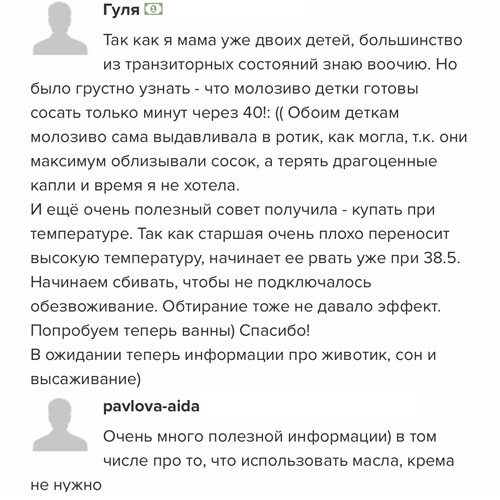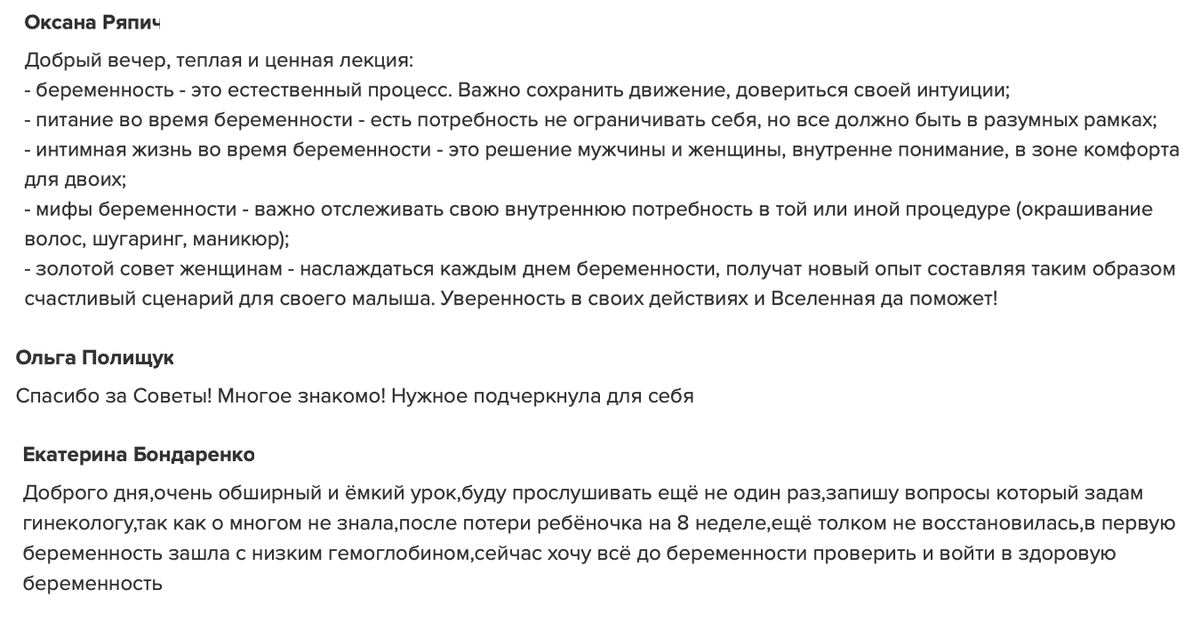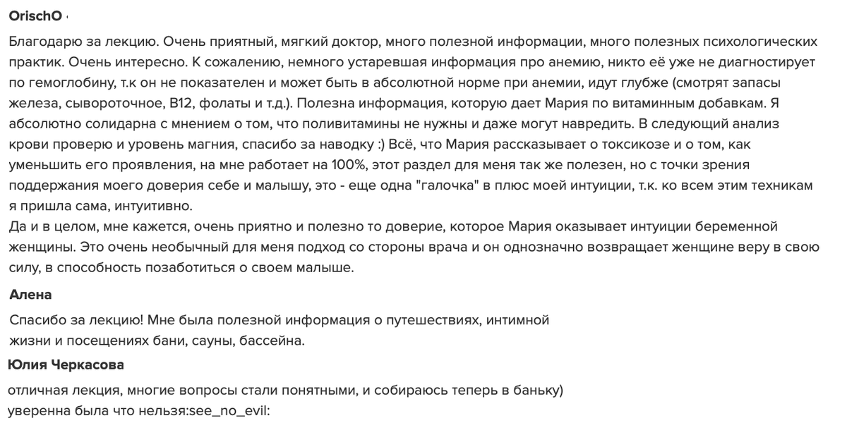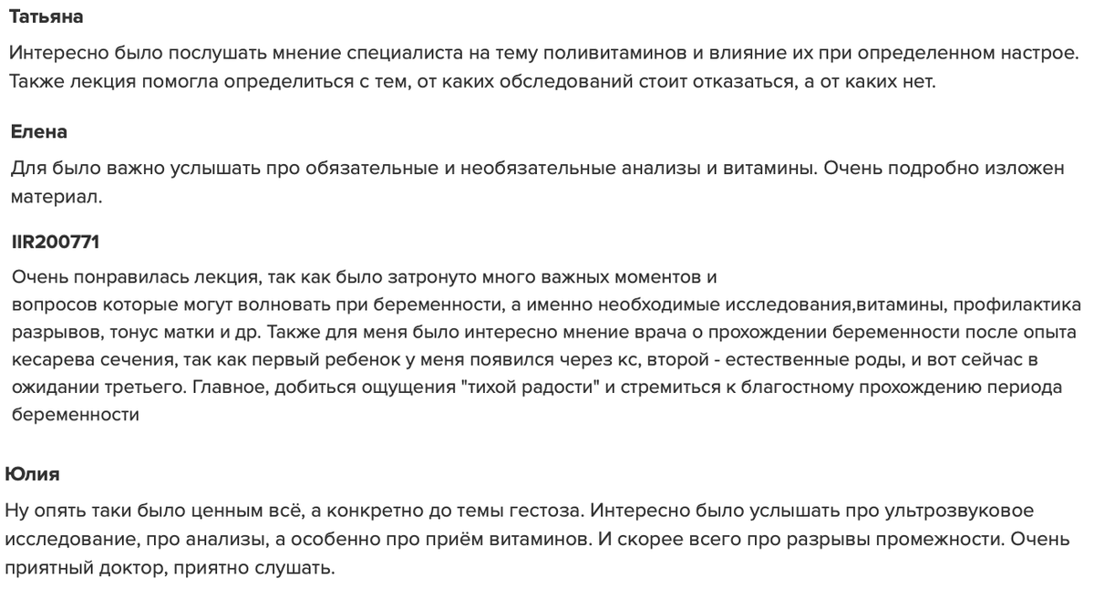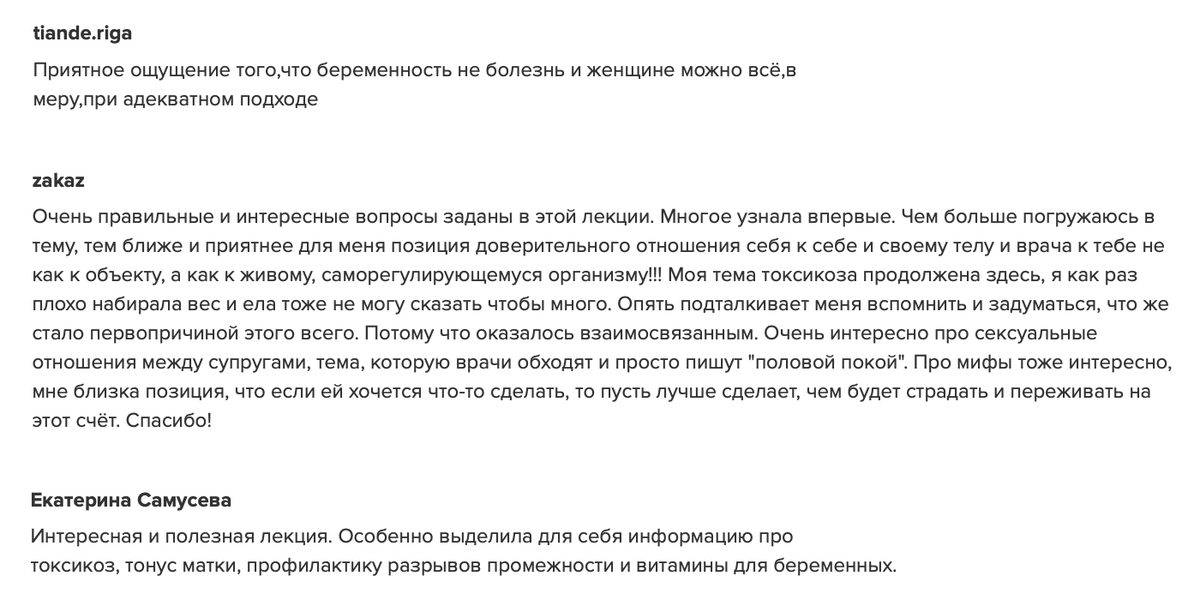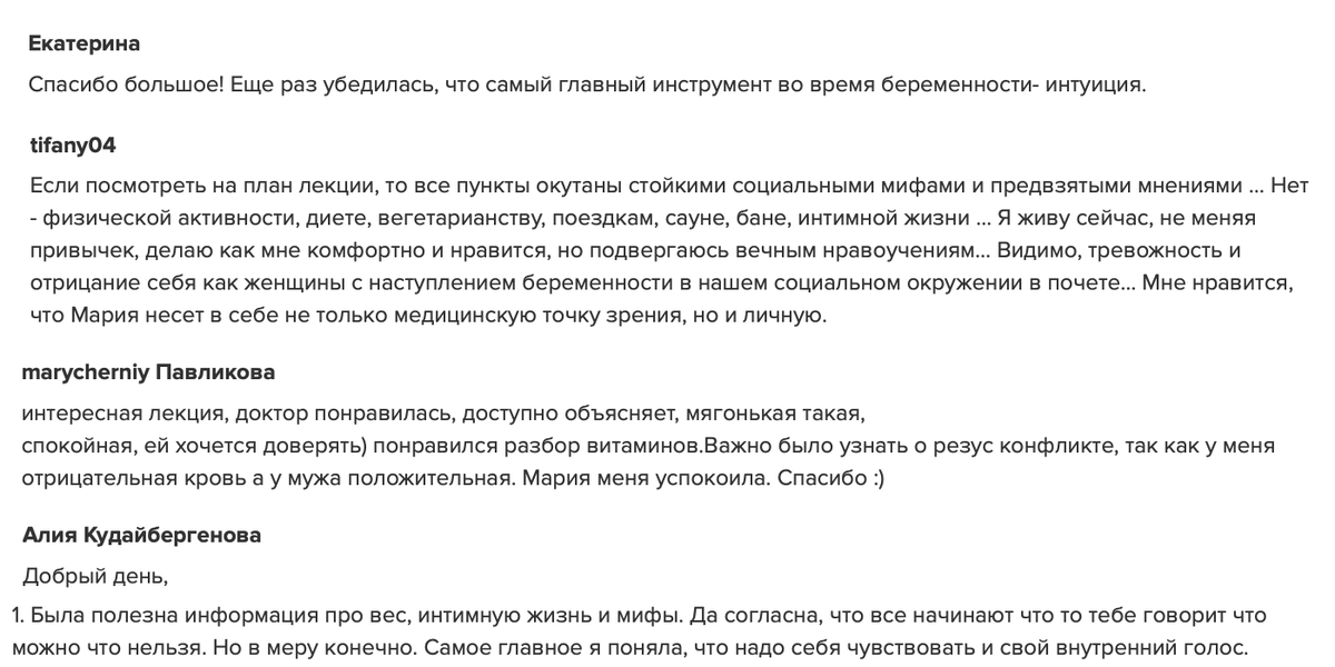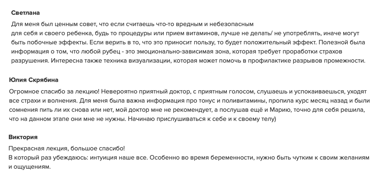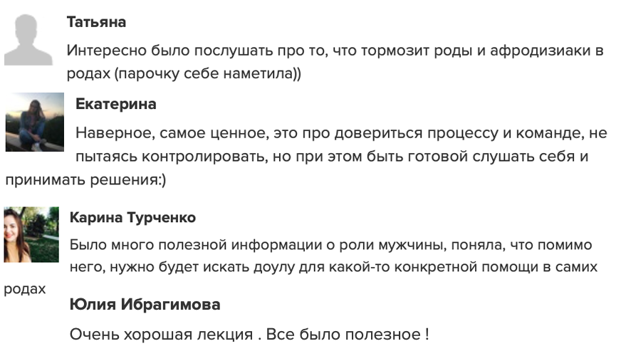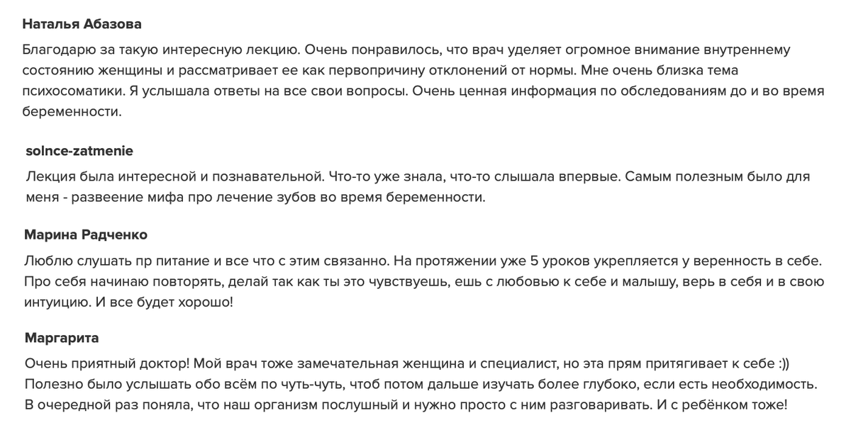 Шикарный курс и подача информации, очень подробные лекции с таааким количеством информации! Отдельная благодарность за прямые эфиры, ты просто заряжаешь уверенностью и спокойствием! Итоги у меня такие - реально ушел страх родов - что пойдет что то не так, попаду в не тот роддом, а как потом? Сейчас есть спокойствие, осознание того, что принимаю любое развитие ситуации, уверенность в себе и своих силах, и ещё не страх, а любопытство и интерес, и я готова к этому путешествию в Роды благодаря тебе и твоему курсу!