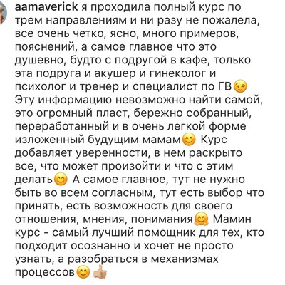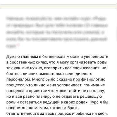 Самый главный итог курса — превращение из беспокойной мамы в маму осознанную. Я научилась слушать себя, своё тело, доверять ему, доверять своему малышу. Этот навык подарил мне небывалое спокойствие и сменил тревогу на радость в ожидании встречи с малышом. Также важно понимание, что роды — это не зловещее медицинское окружение, это только о нас с малышом. Этот процесс полностью зависит от меня, моего подхода и поведения, я могу сама влиять на ситуацию и поворачивать ее в благоприятное русло. Кроме того, особенность курса в ненавязывании. Участникам предлагается огромный объём информации, но ни одной инструкции к действию, никакого давления. Чтобы принять решение, необходимо пропустить полученную информацию через призму собственных установок, мировоззрения и убеждений. Это о критическом мышлении, которое важно в любых аспектах жизни. И последнее, самое уютное и тёплое, — окружение, которое приобретаешь после курса. Это и поддержка Жени, других участниц, и огромное сообщество мамочек-выпускниц, которые с радостью поделятся опытом и окажут поддержку. Думаю, не каждой удавалось найти такую масштабную поддержку на протяжении всей жизни.