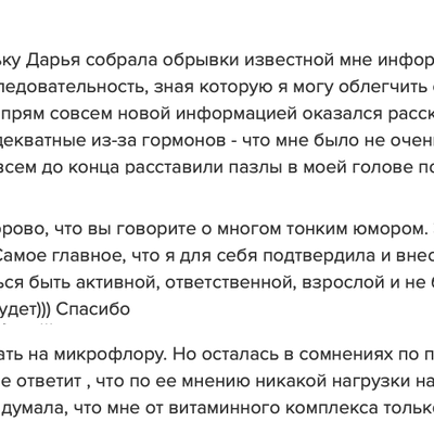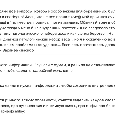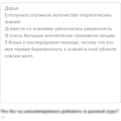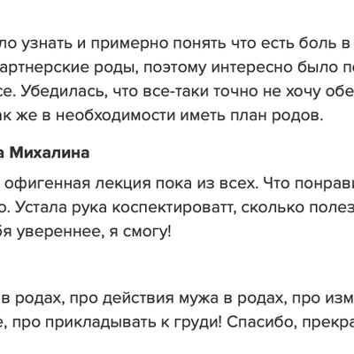 Шикарный курс и подача информации, очень подробные лекции с таааким количеством информации! Отдельная благодарность за прямые эфиры, ты просто заряжаешь уверенностью и спокойствием! Итоги у меня такие - реально ушел страх родов - что пойдет что то не так, попаду в не тот роддом, а как потом? Сейчас есть спокойствие, осознание того, что принимаю любое развитие ситуации, уверенность в себе и своих силах, и ещё не страх, а любопытство и интерес, и я готова к этому путешествию в Роды благодаря тебе и твоему курсу!
